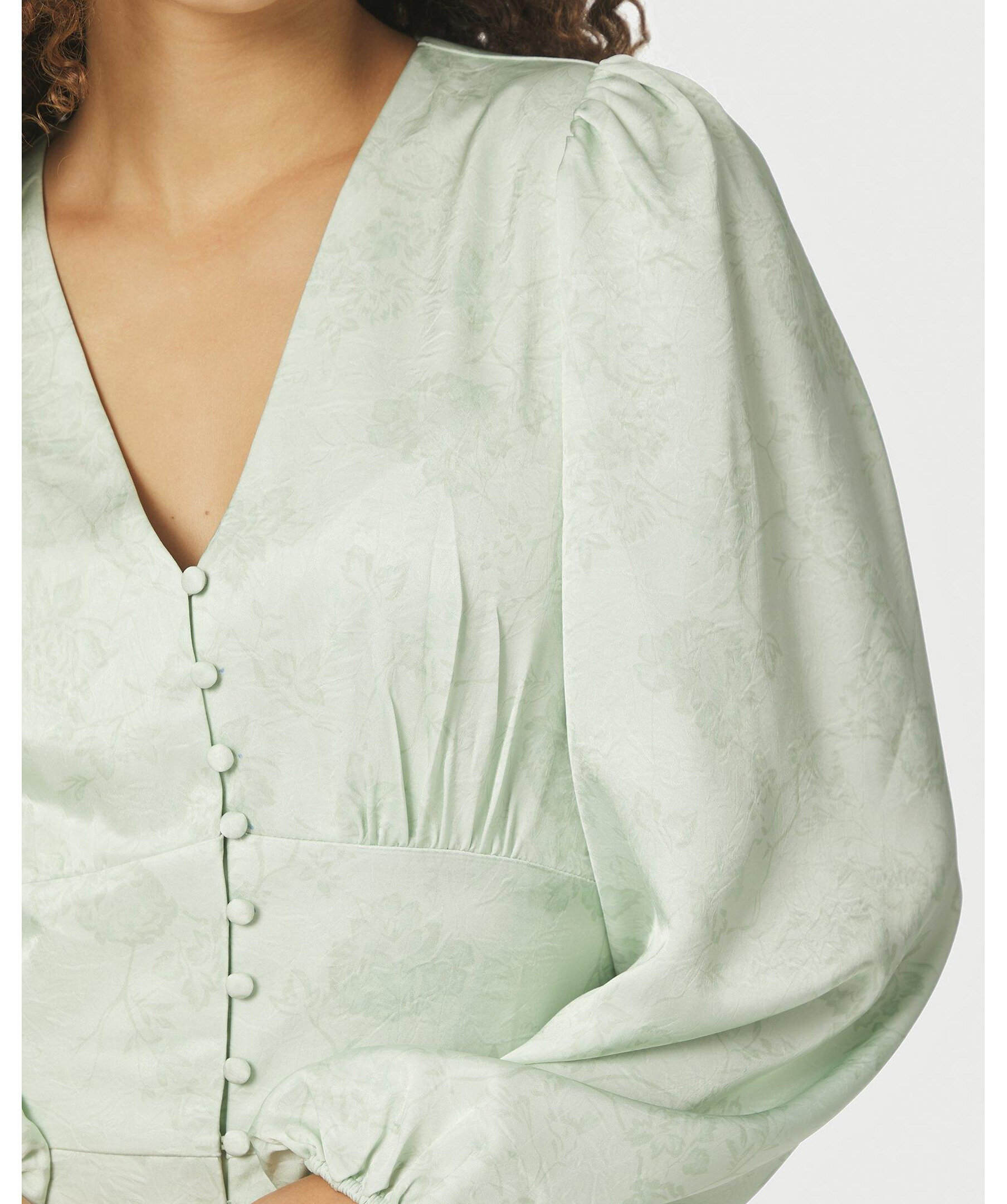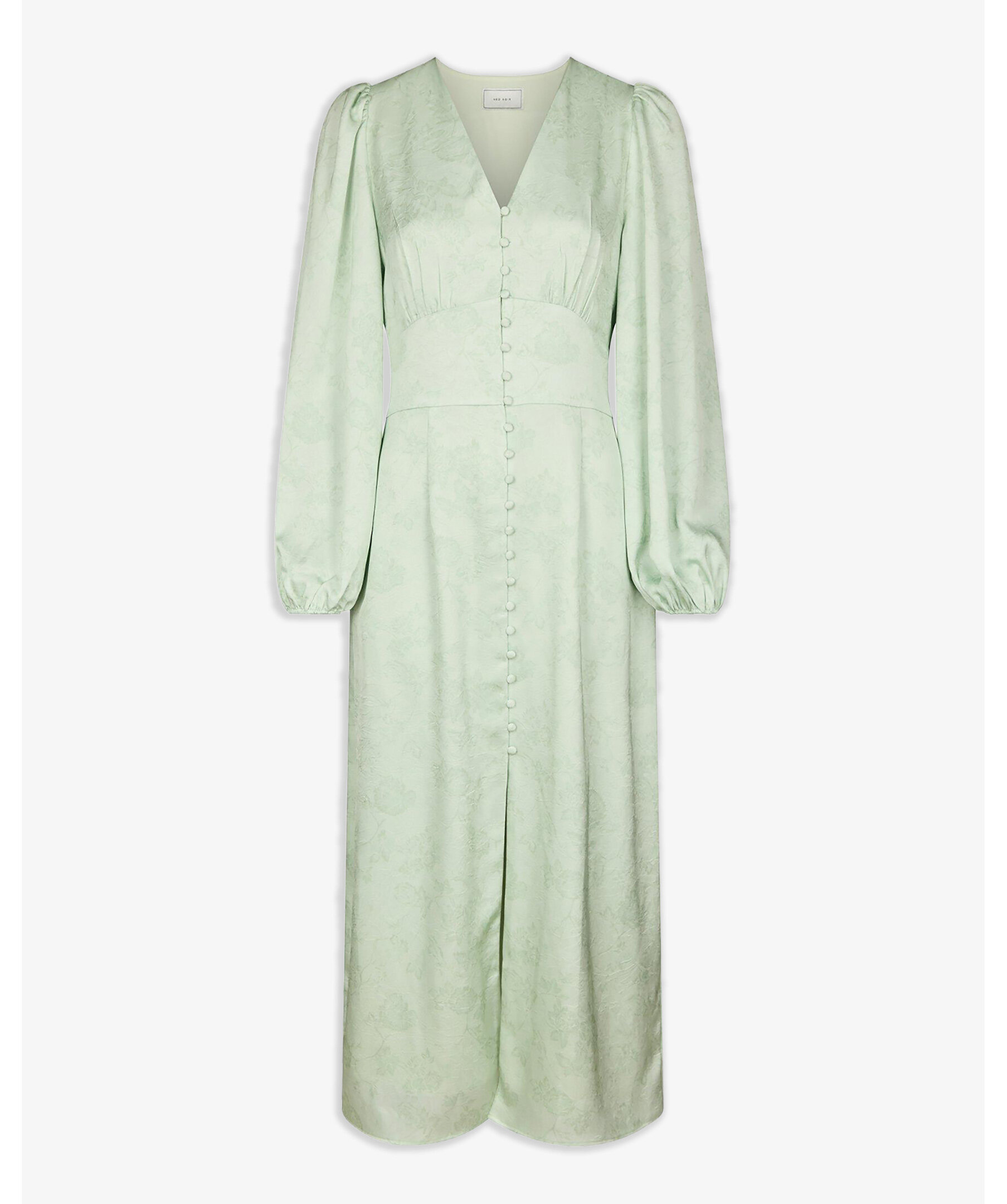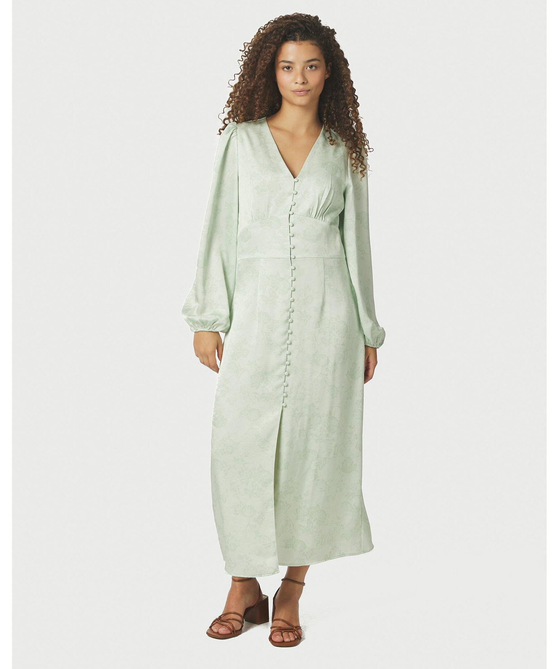 Ljusgrön klänning i en fin polyesterkvalitet. Klänningen har v-ringning, långa lösa ärmar och knappar längs framsidan. Modellen är 176 cm lång och bär storlek 36.