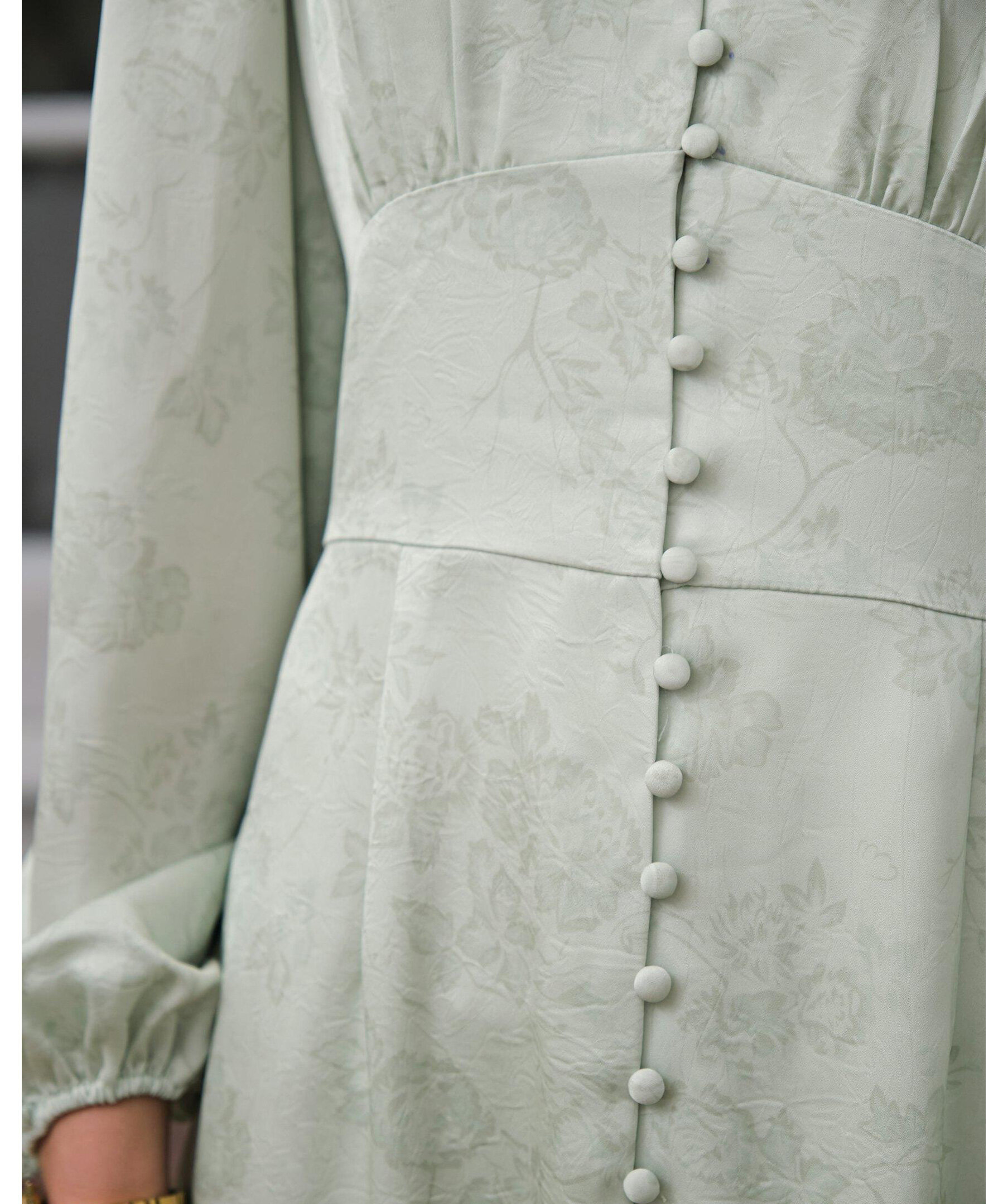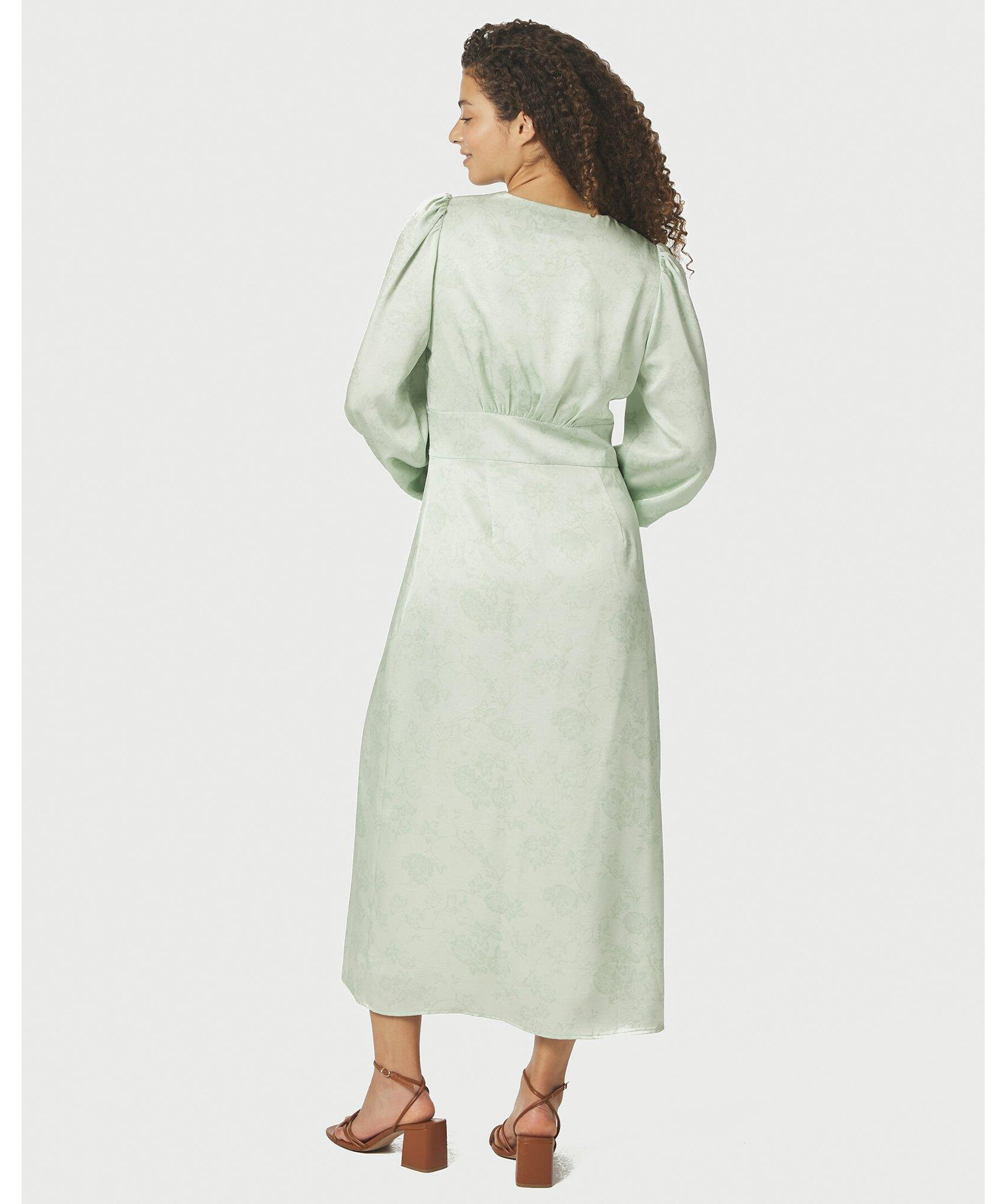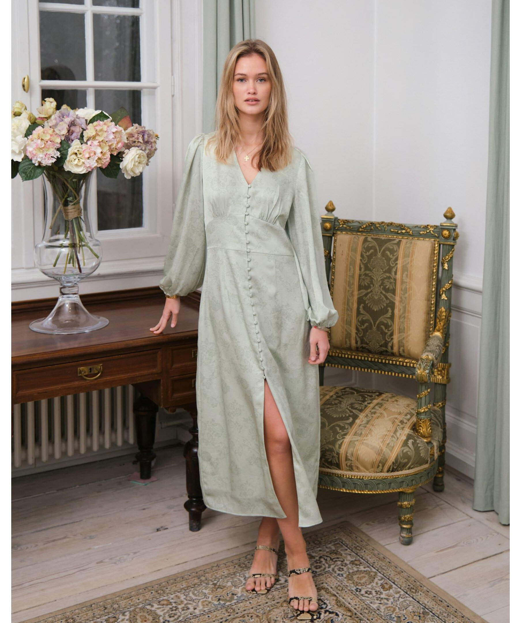Ljusgrön klänning i en fin polyesterkvalitet. Klänningen har v-ringning, långa lösa ärmar och knappar längs framsidan. Modellen är 176 cm lång och bär storlek 36.