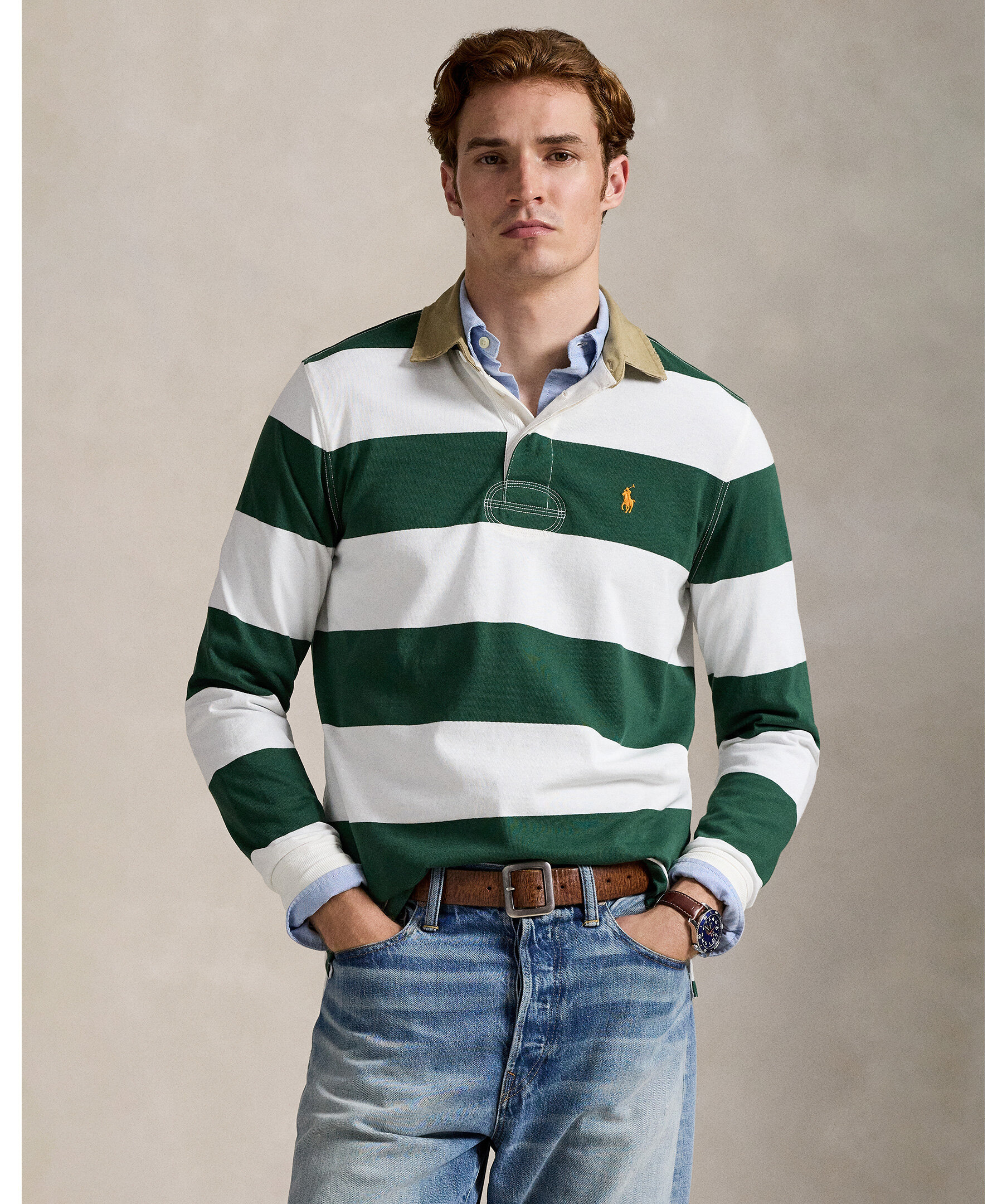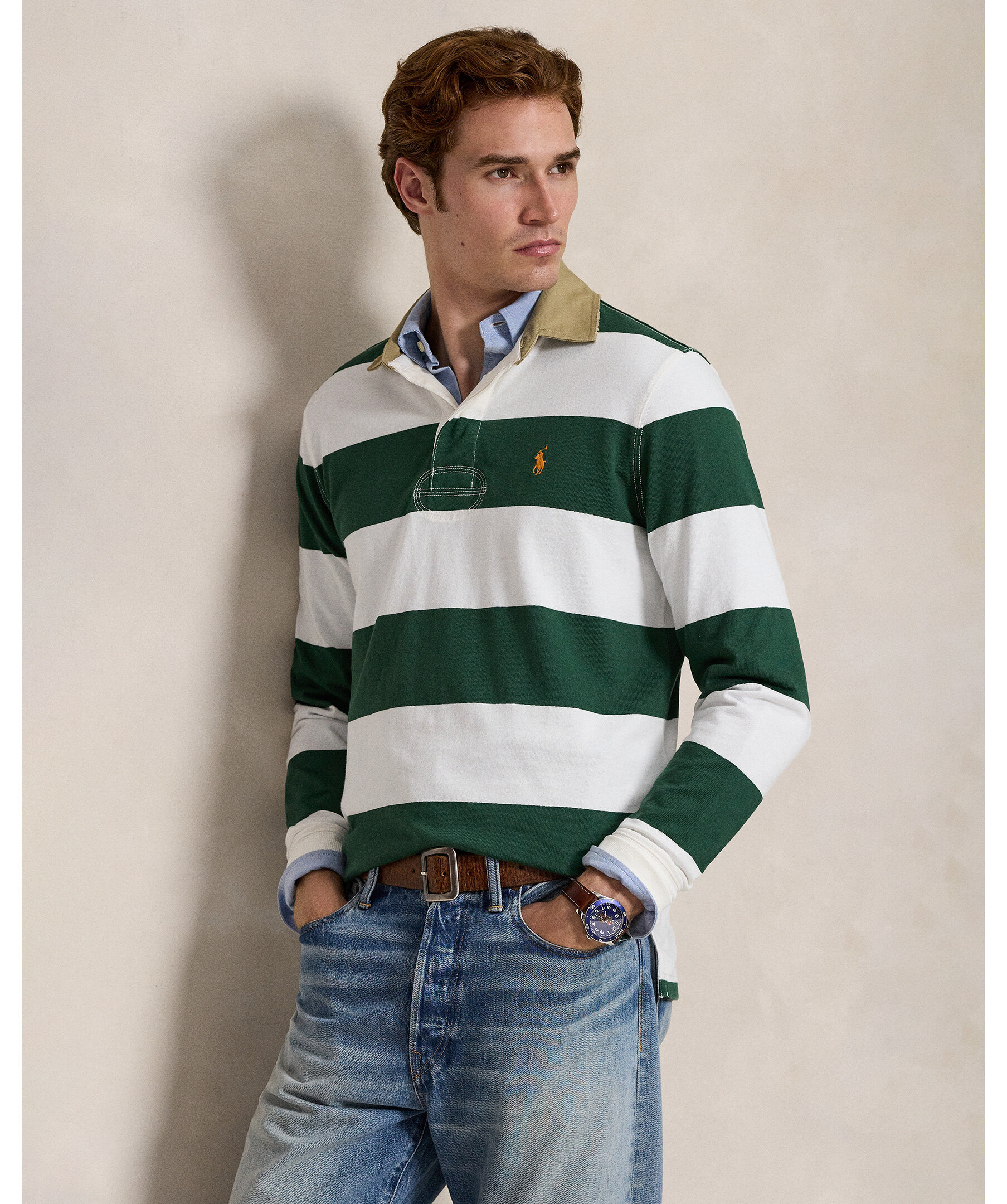 Rugby‑inspirerad långärmad tröja från Polo Ralph Lauren med klassisk khaki‑krage och randigt mönster i Grass Green/Trophy Cream. Tröjan har en regular fit och är tillverkad i mjuk bomullsjersey — ett stilrent och avslappnat basplagg för vardag och preppy looks.