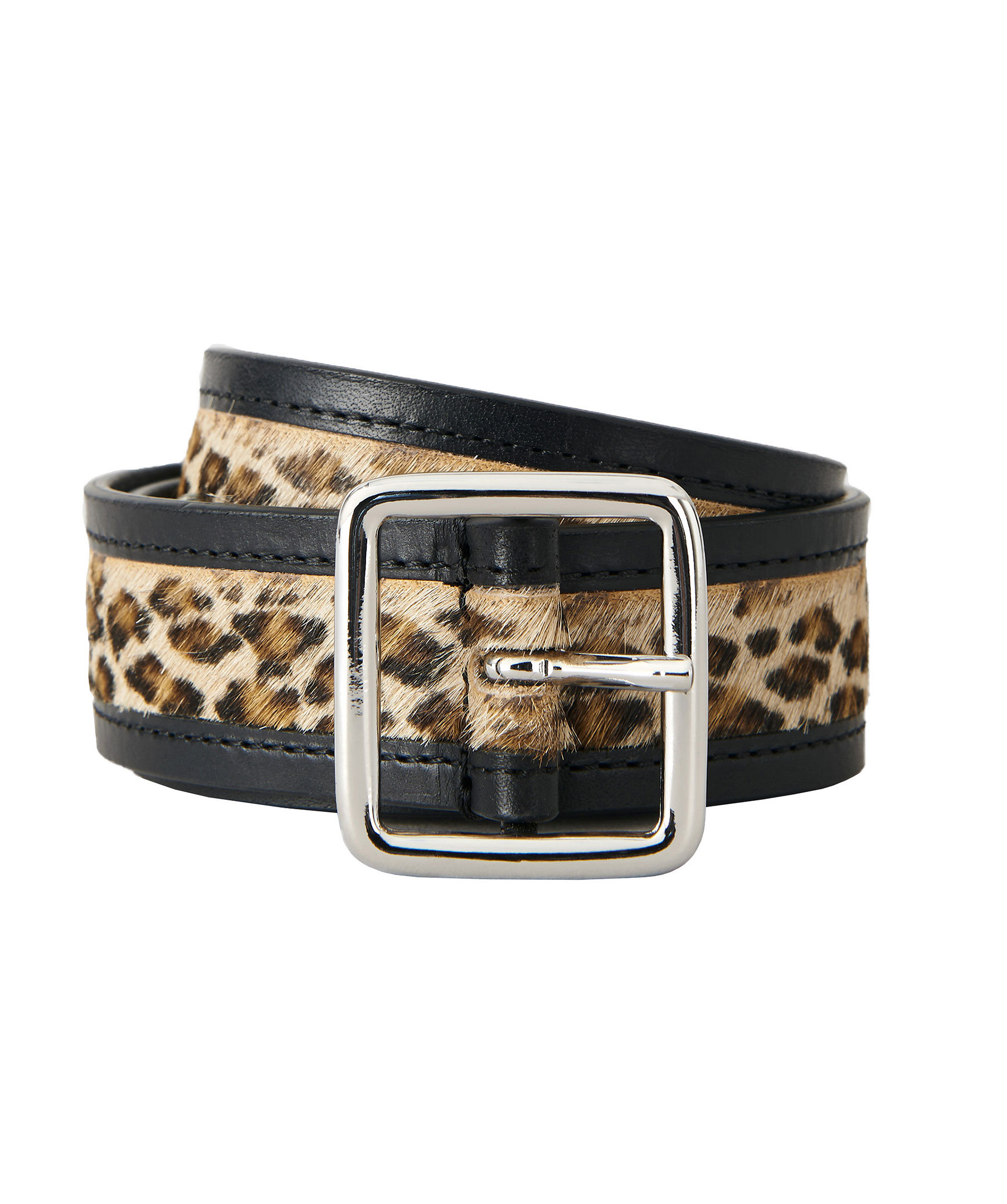 Svart bälte med en leopardmönstrad rand i mitten från Tiger of Sweden. Guldfärgade ögglor som gör att bältet kan justeras samt guldfärgat spänne. Tillverkad i läder.