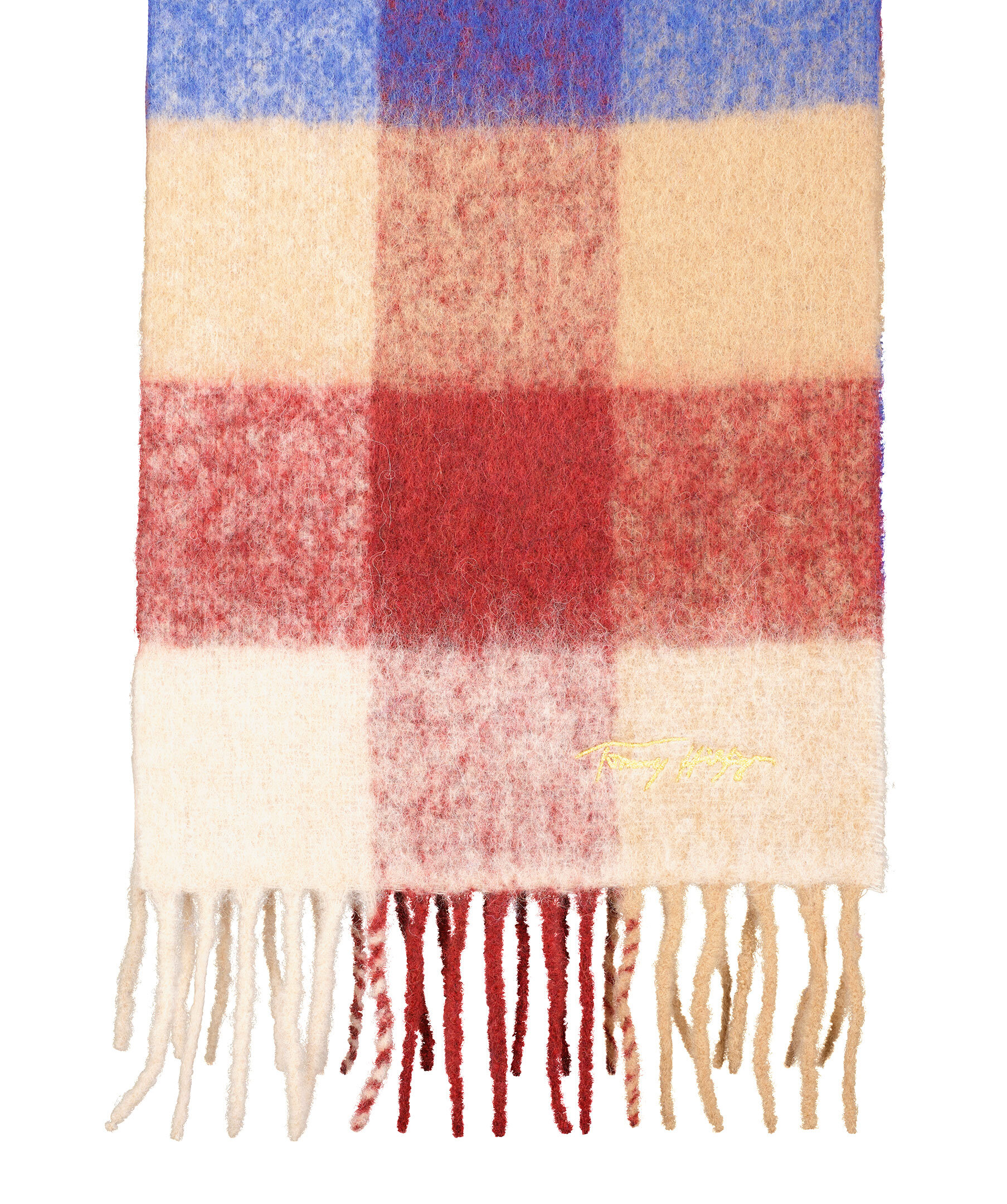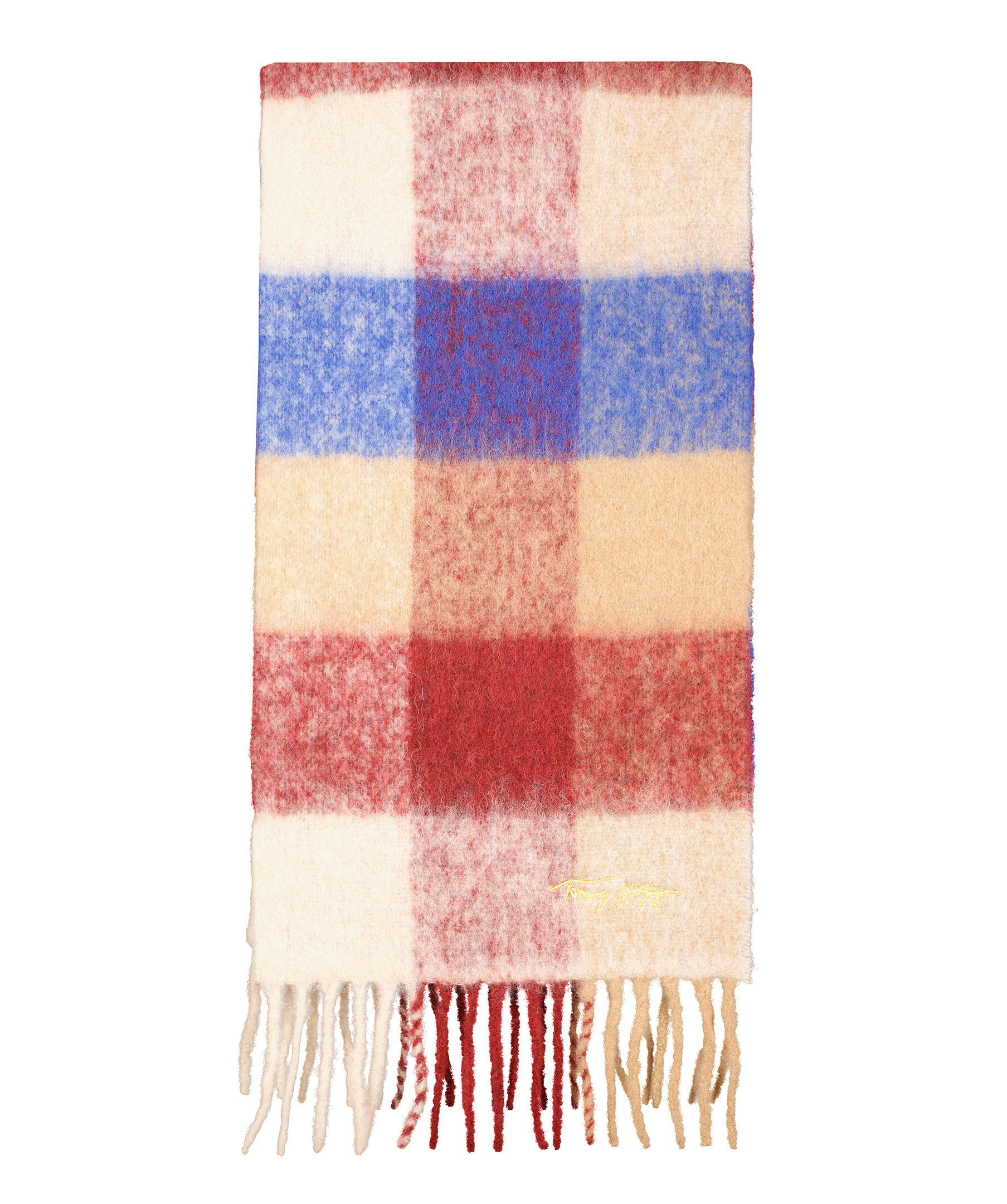 Flerfärgad och rutmönstrad halsduk från Tommy Hilfiger. Fransar i kanterna, logotyp broderad med guldtråd. Tillverkad i alpacamix. 40 x 192 cm lång.