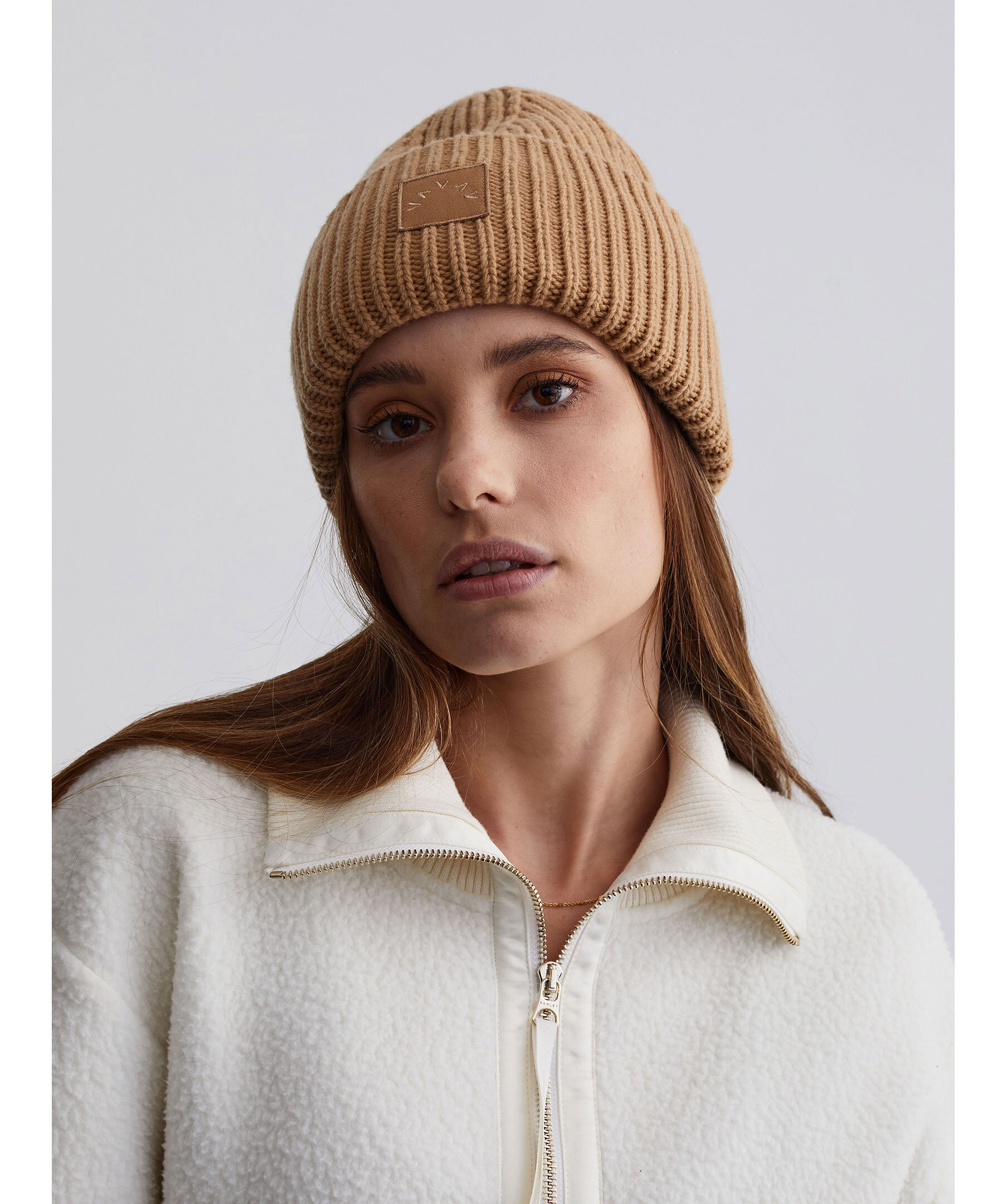 Kamelfärgad, mysig mössa från Varley. Spunnen i en lyxigt, mjuk merinoullblandning och har en patch med logotyp fram. Uppvikt, bred kant och ribbad stickning.