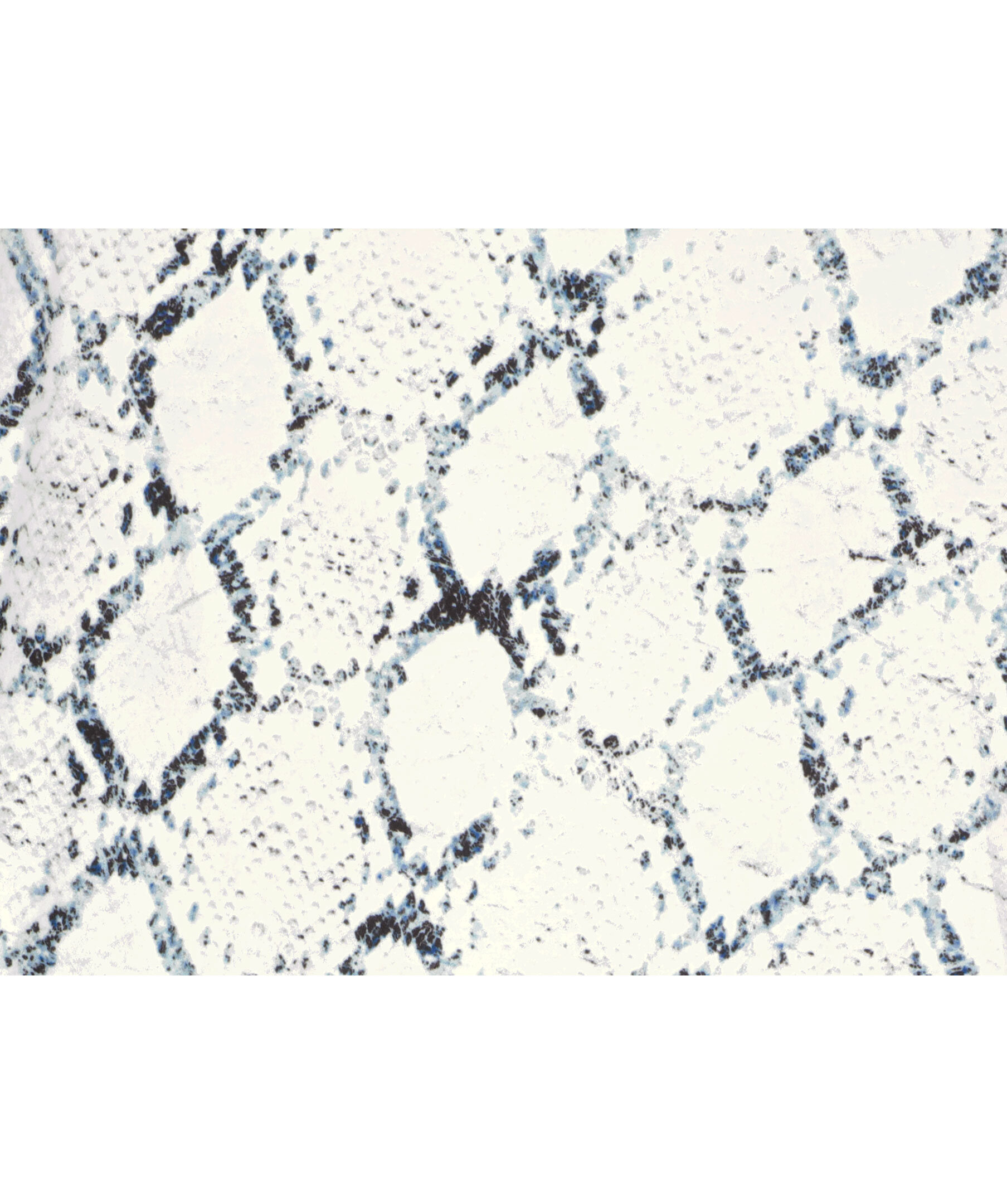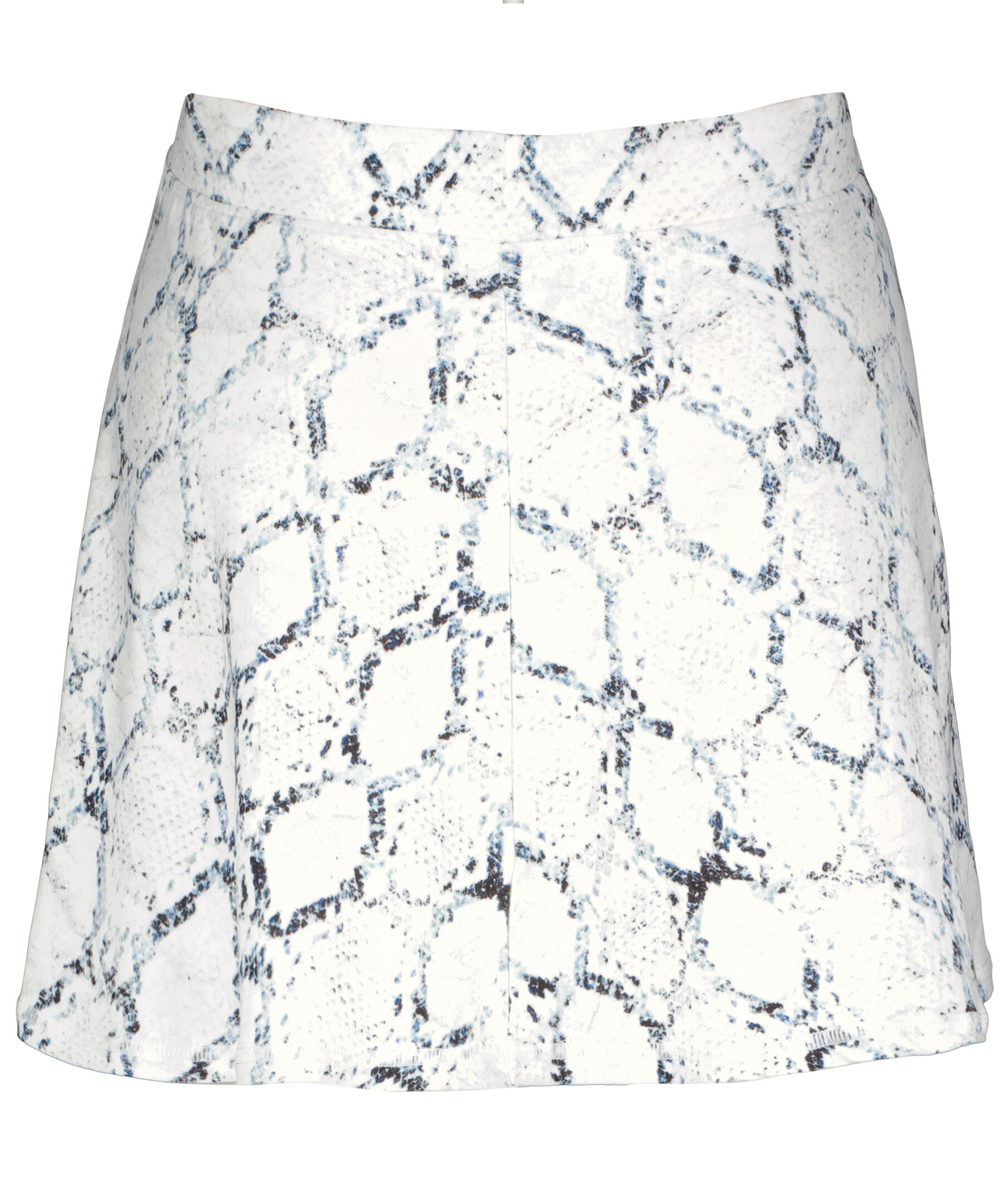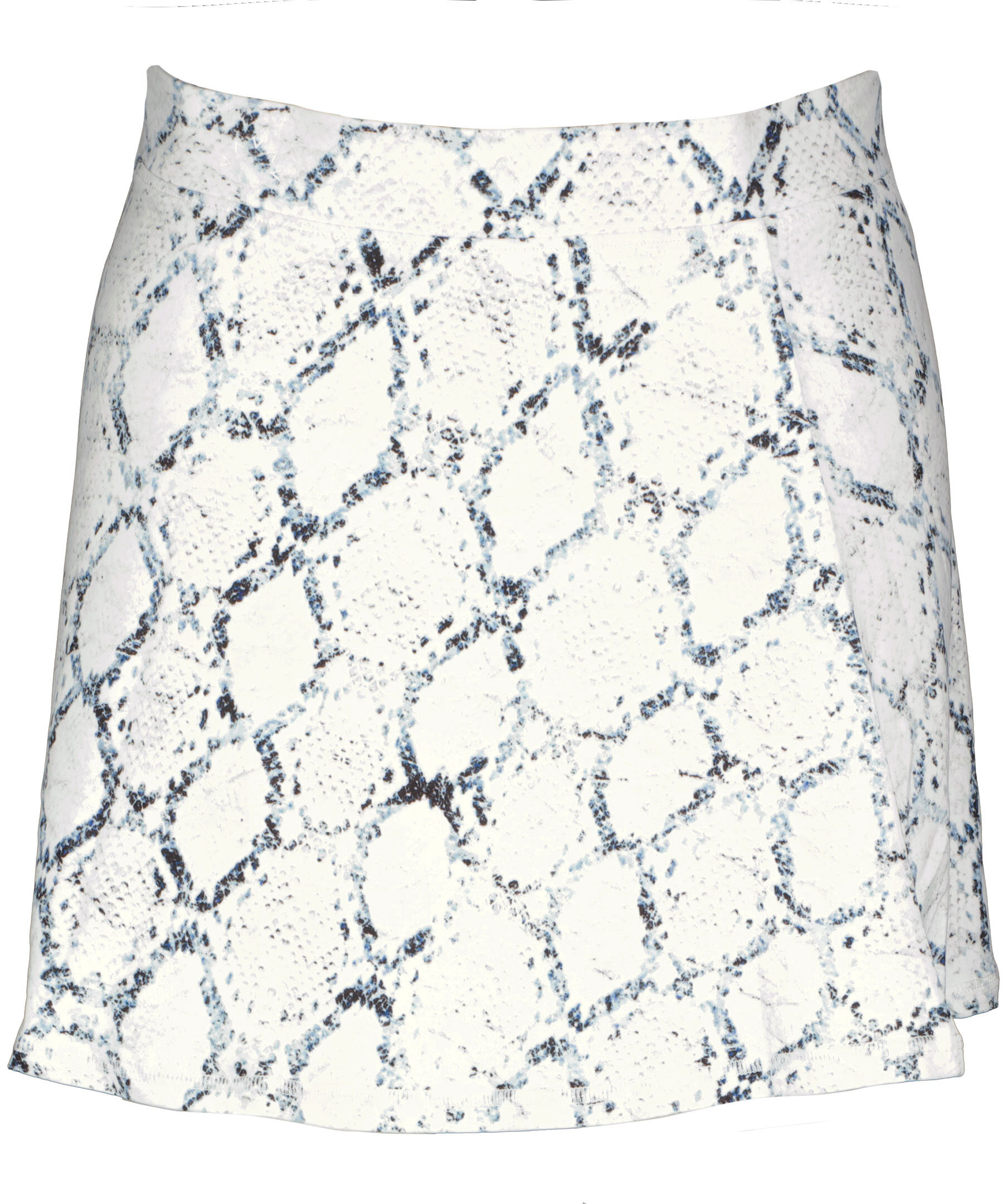 Ljusblå, blå och vit ormskinnsmönstrad tenniskjol från Varley. Högmidjad och kort kjol. Bred resår i midjan.