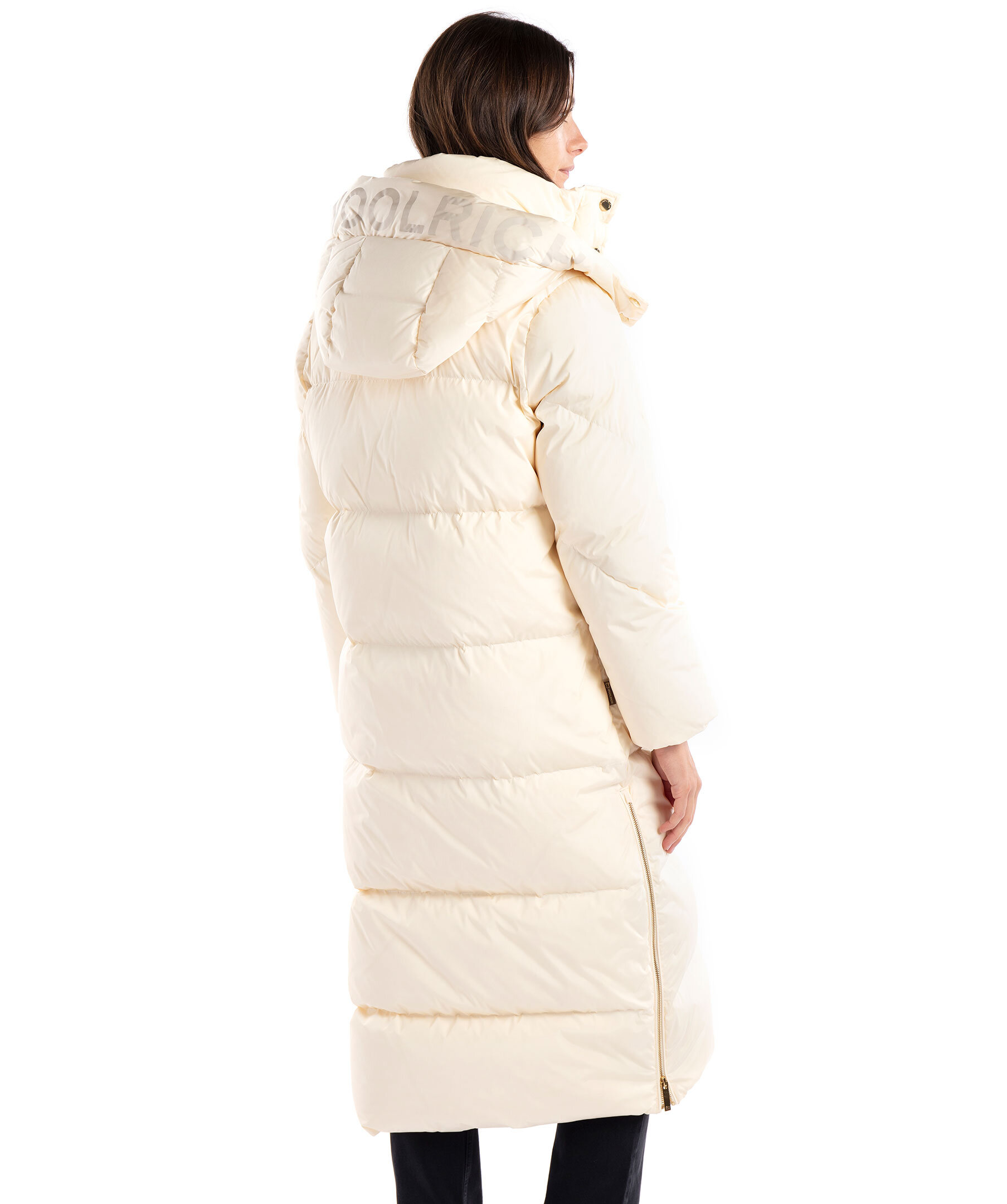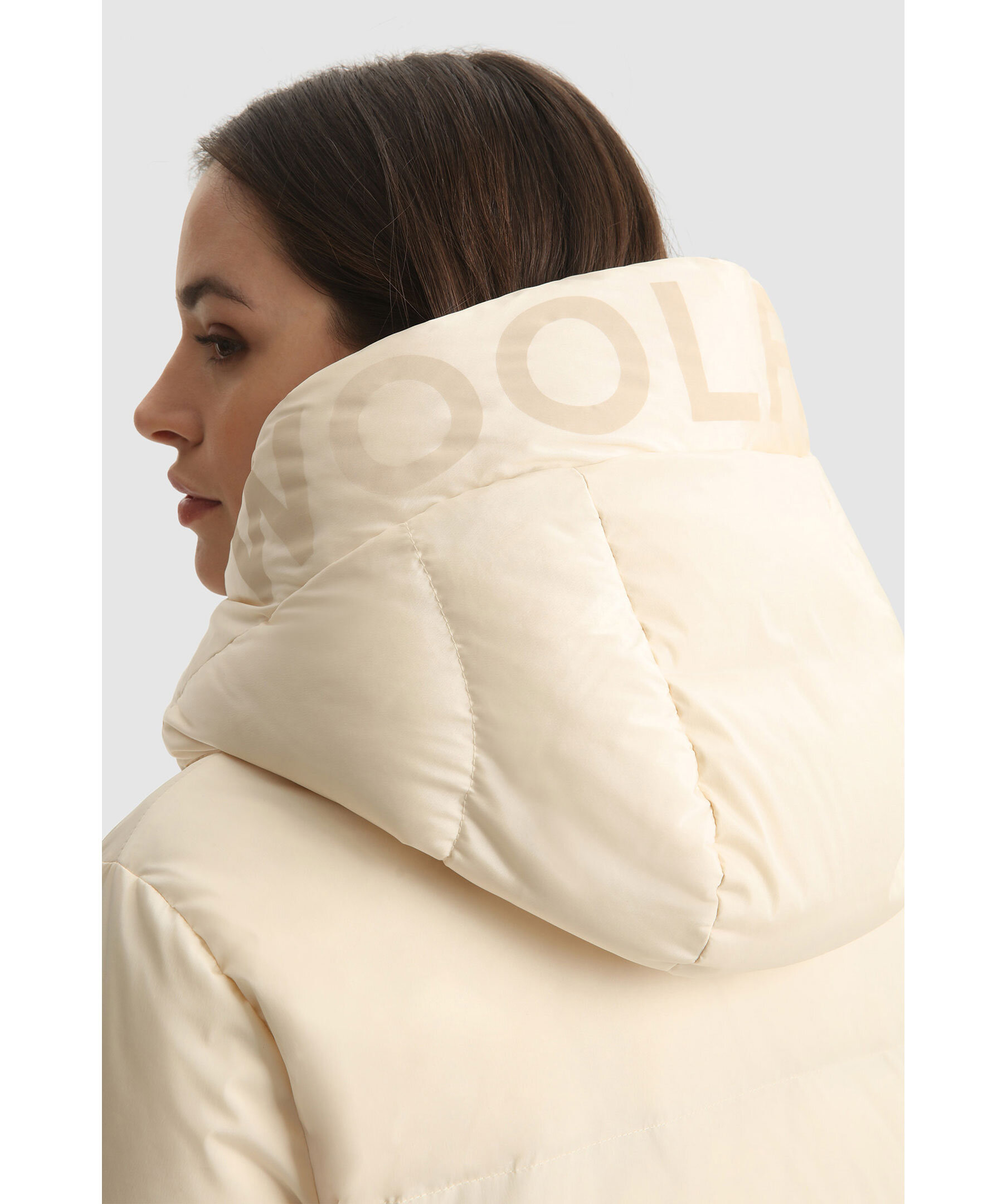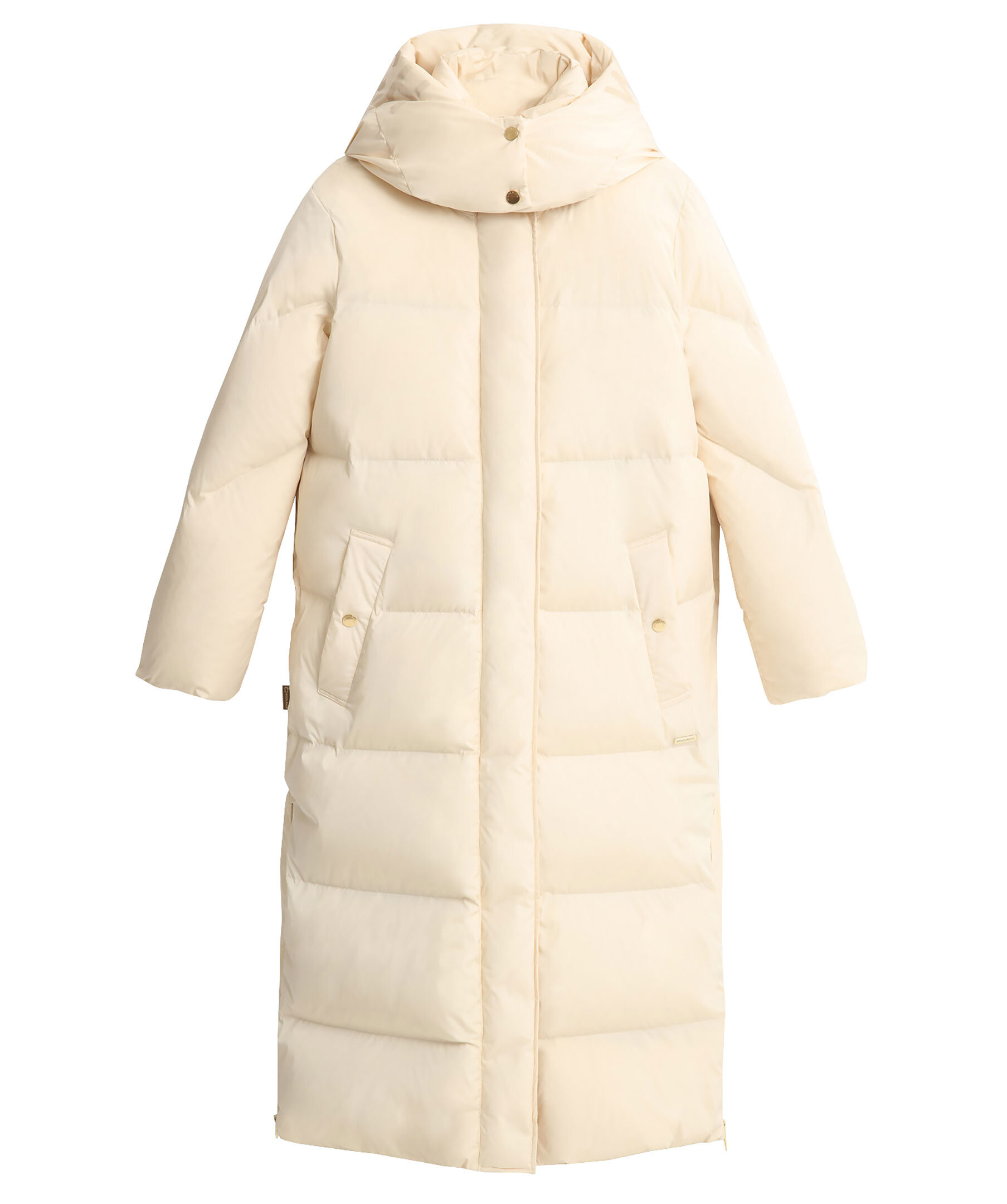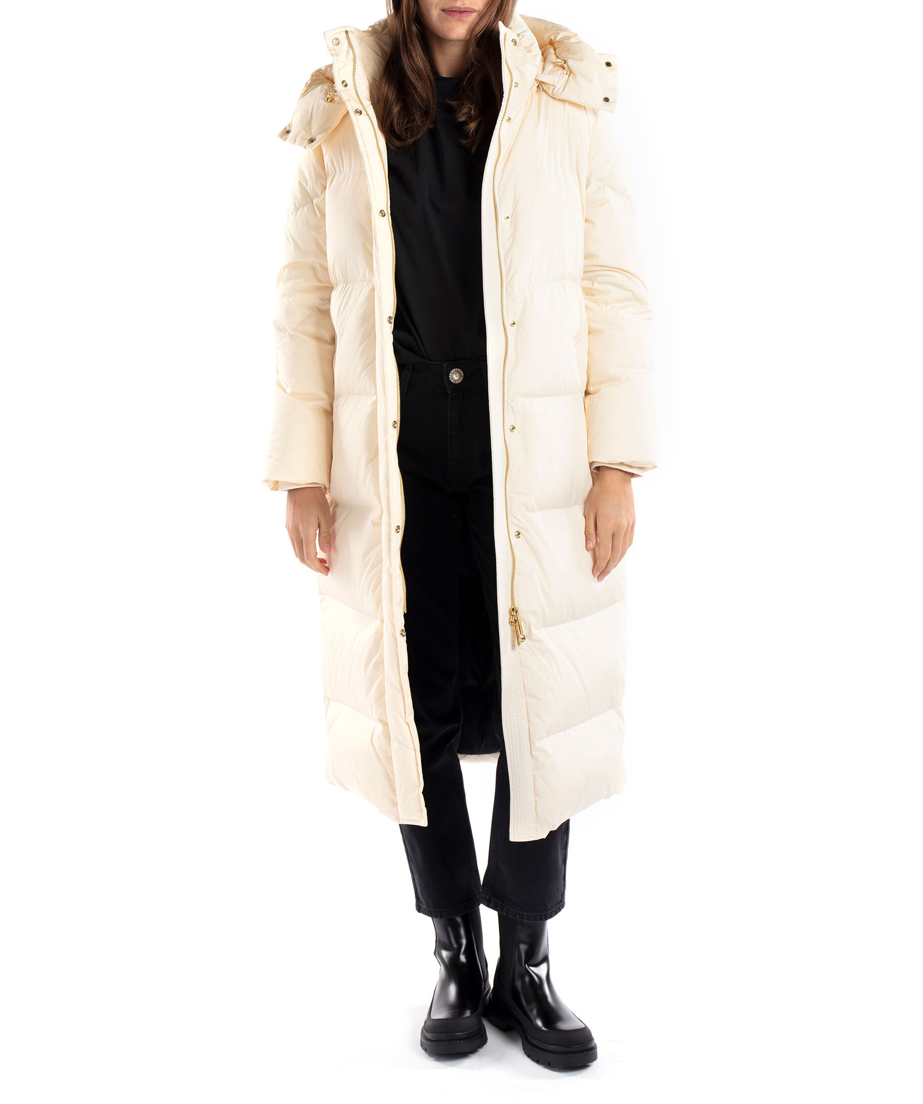 Benvit quiltad dunkappa från Woolrich. Jackan har en oversized fit med utrymme för att bära lager på lager under, för en mer slim passform beställ en storlek mindre än vanligt. Avtagbar luva med dragsko och stor logotyp. Jackan stängs framtill med dold dragkedja. Tillverkad i ett vatten och vindavvisande material. Fickor i sidan som stängs med tryckknapp. Slits med dragkedja i jackslut för vädring och ökad rörlighet. Guldfärgade detaljer. Modellen är 178cm lång och har på sig storlek S.