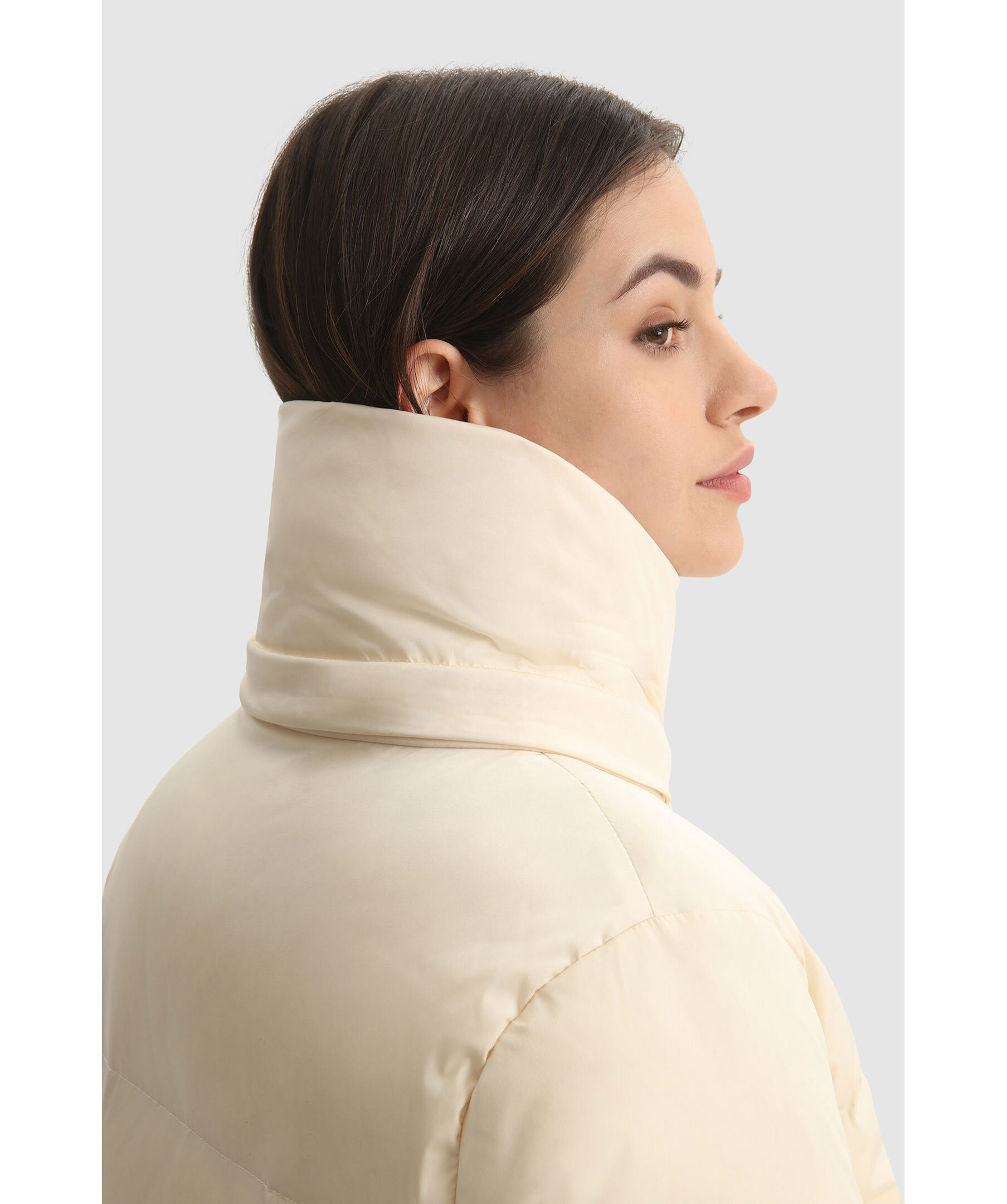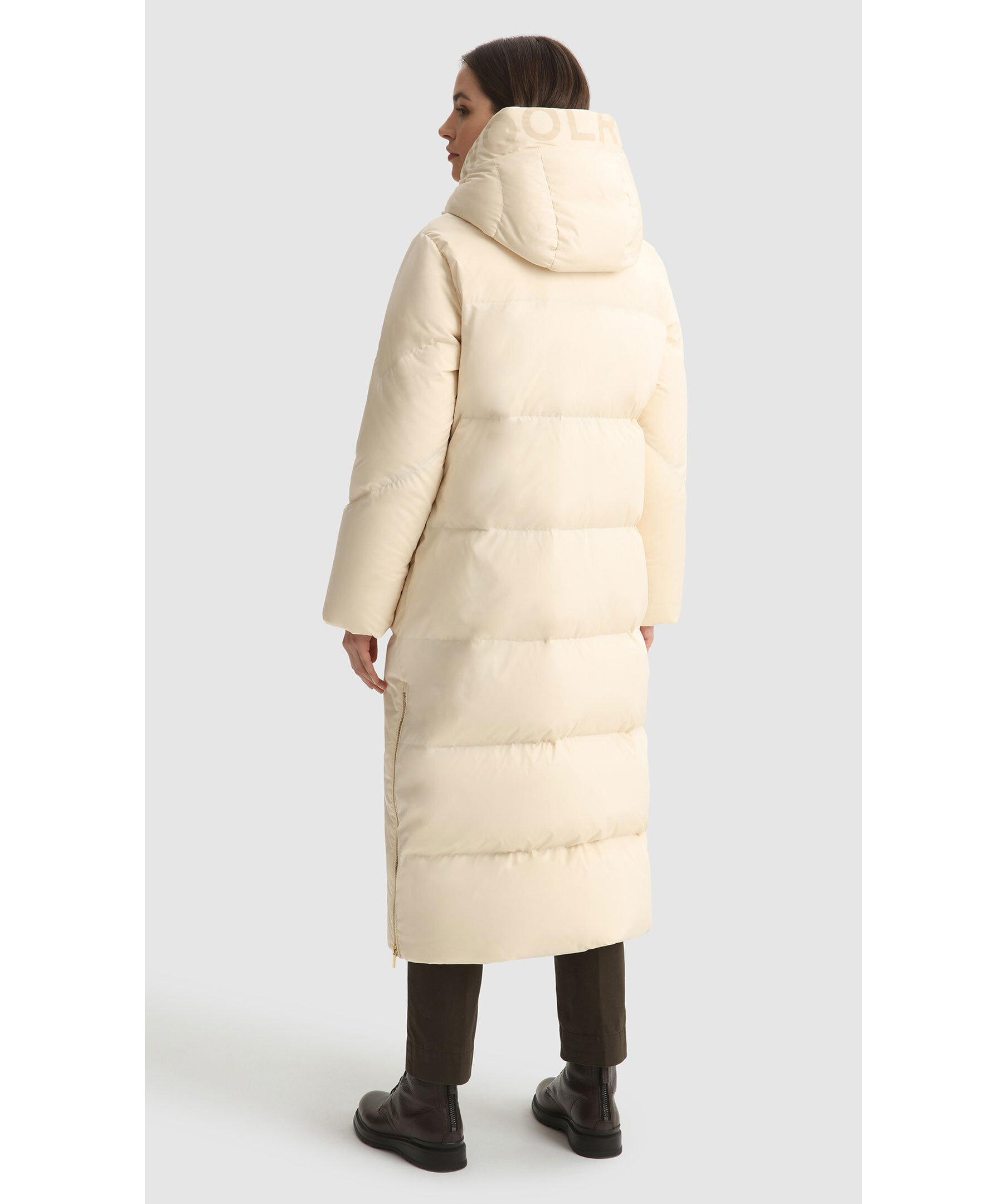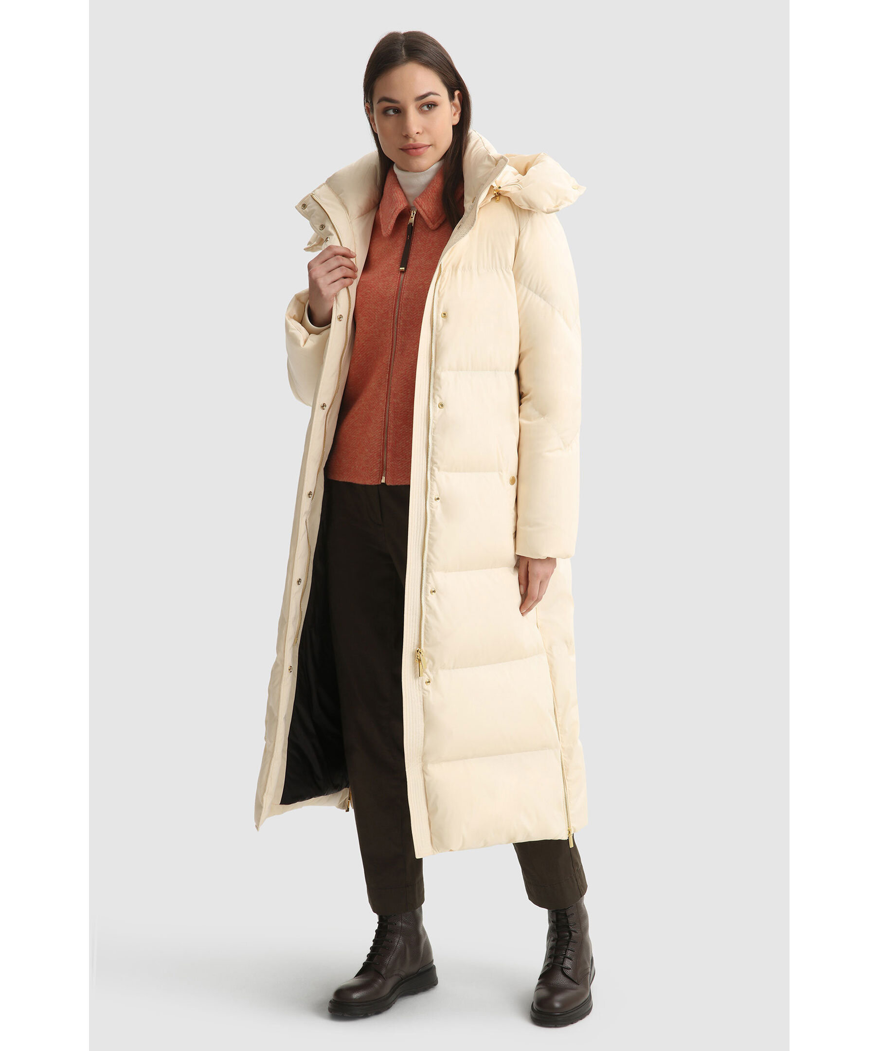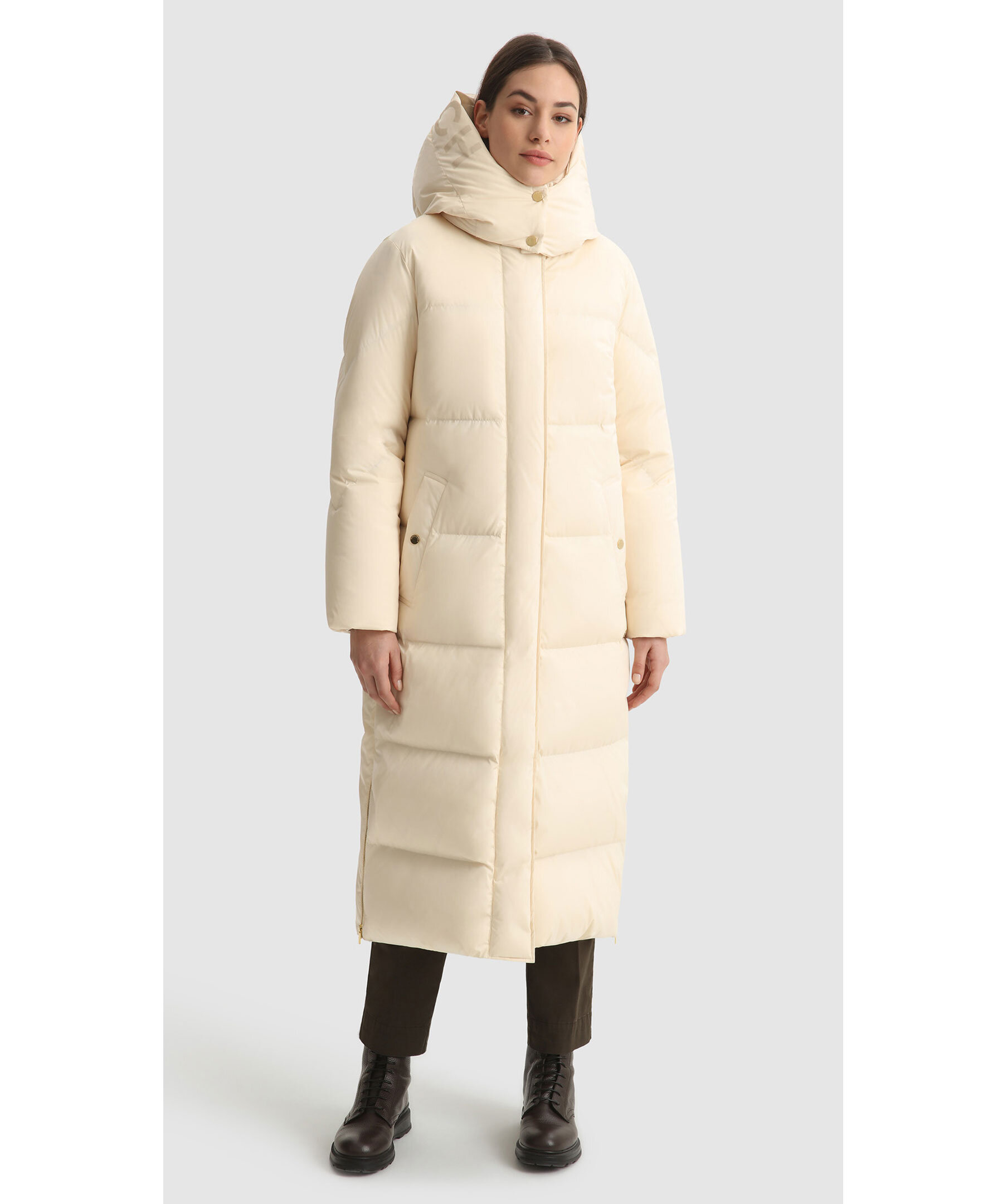 Benvit quiltad dunkappa från Woolrich. Jackan har en oversized fit med utrymme för att bära lager på lager under, för en mer slim passform beställ en storlek mindre än vanligt. Avtagbar luva med dragsko och stor logotyp. Jackan stängs framtill med dold dragkedja. Tillverkad i ett vatten och vindavvisande material. Fickor i sidan som stängs med tryckknapp. Slits med dragkedja i jackslut för vädring och ökad rörlighet. Guldfärgade detaljer. Modellen är 178cm lång och har på sig storlek S.