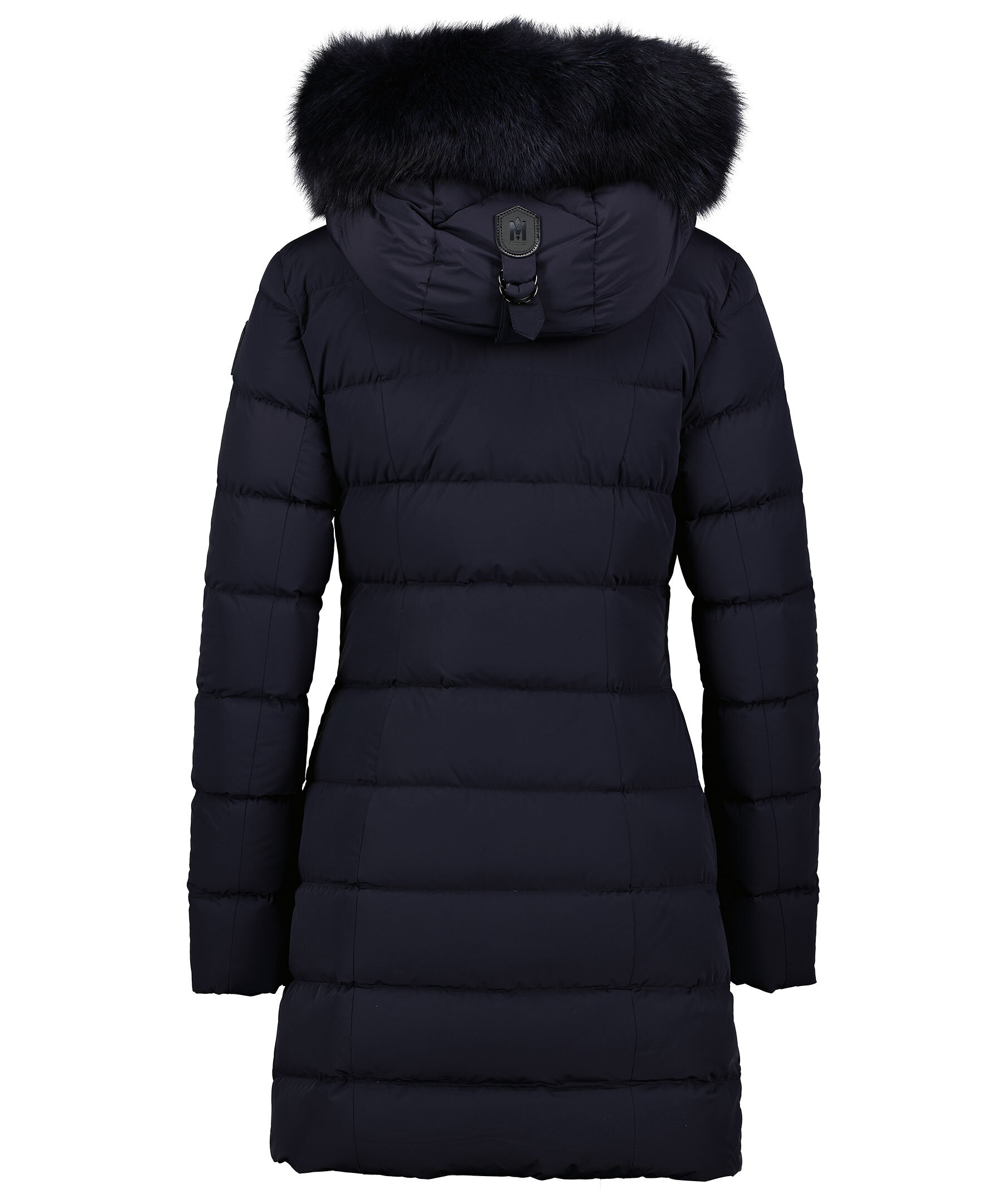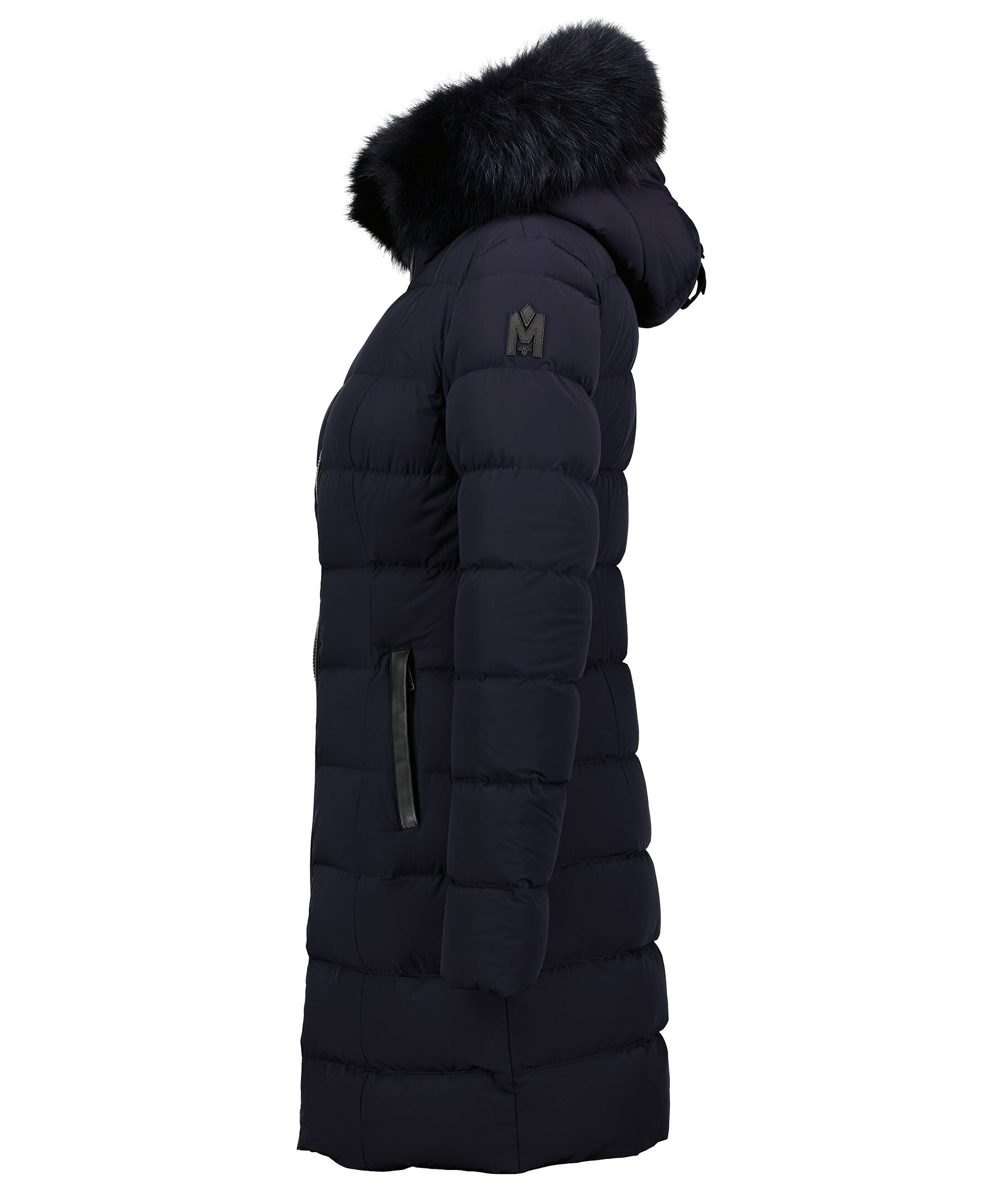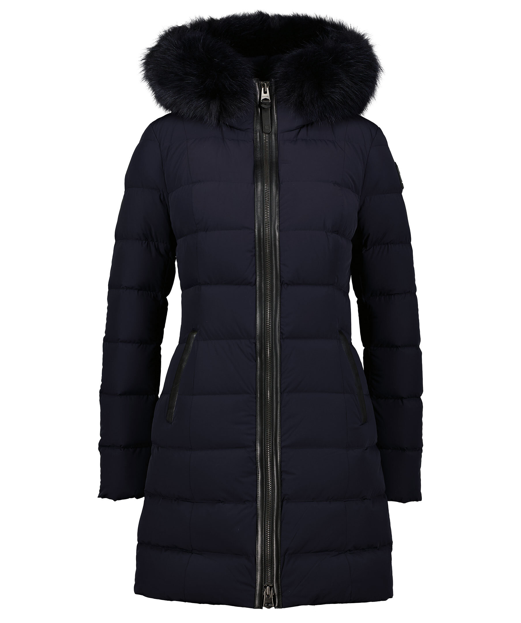 Marinblå quiltad dunkappa från Mackage med svart avtagbar naturpäls. Stängs med tvåvägsdragkedja. Två fickor i midjehöjd som stängs med dragkedja. Läder detaljer vid dragkedjor. Logotyp i läder på vänster arm samt på luvan.