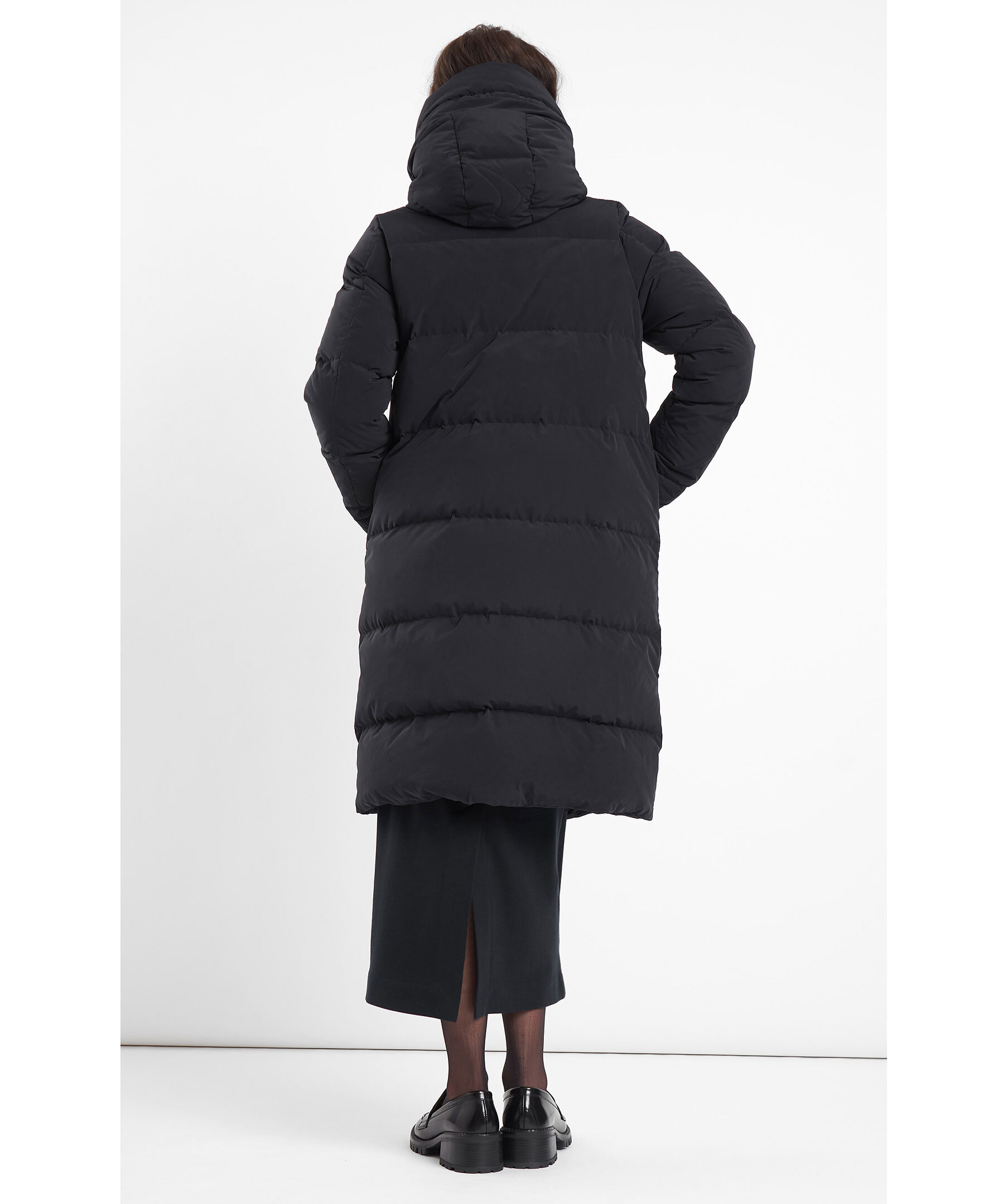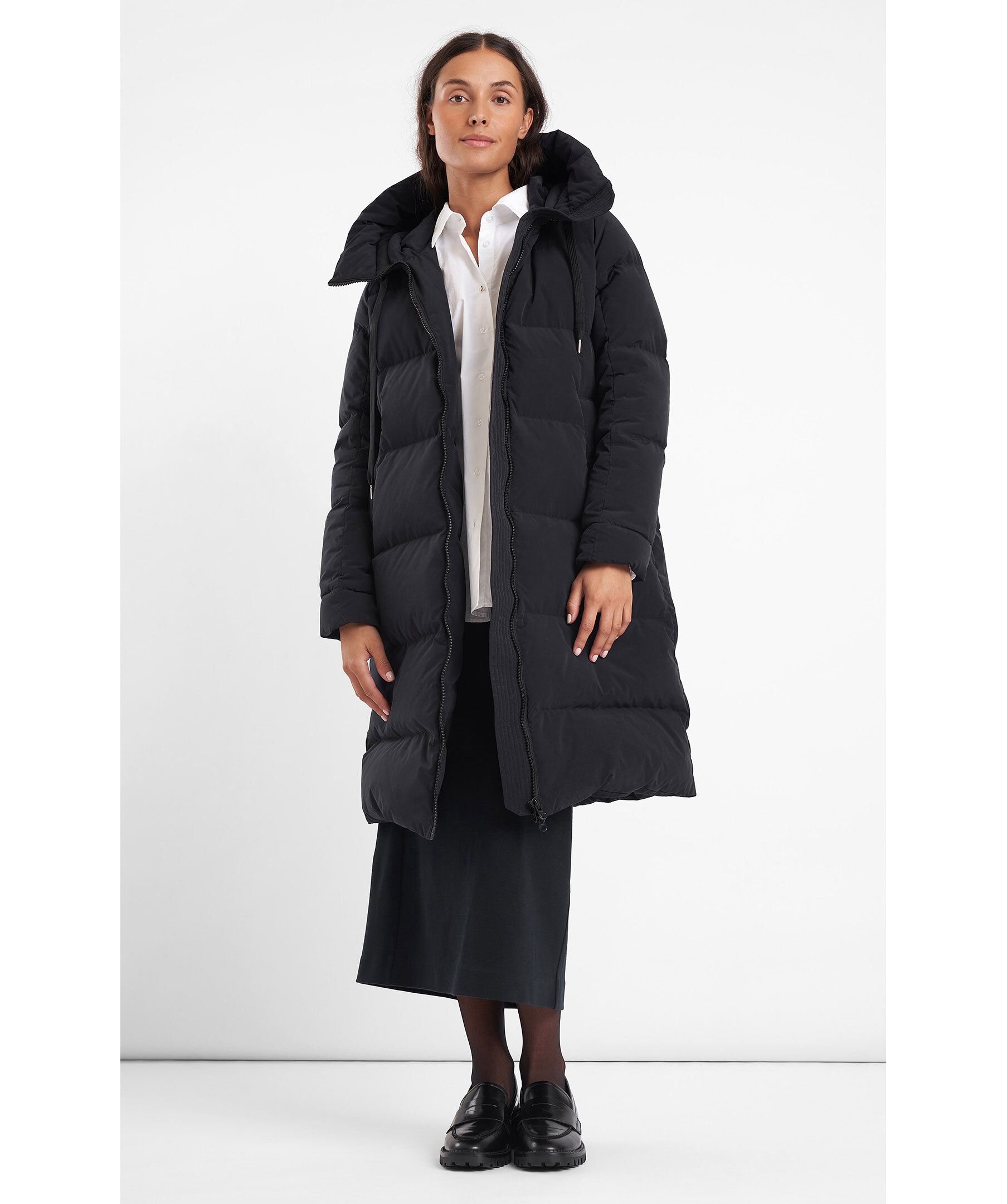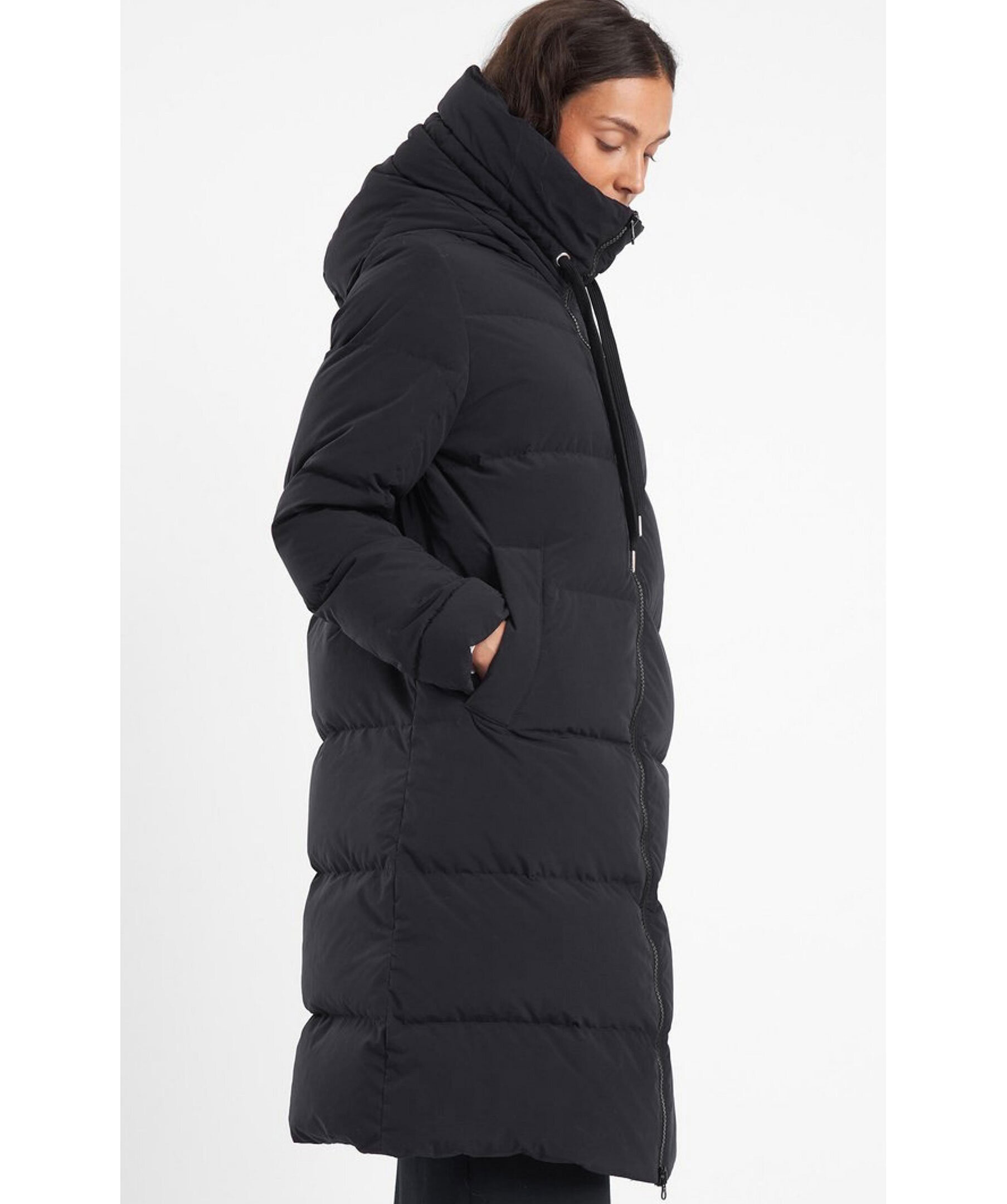 Svart lång dunjacka med stor mysig huva. Fodrad med RDS certifierat dun. Yttertyg med vattenavstötande yta. Tvåvägs-blixtlås för bekvämlighet. Två sköna fickor fodrade med fleecefoder. En klassisk jacka som håller dig varm i vinter.