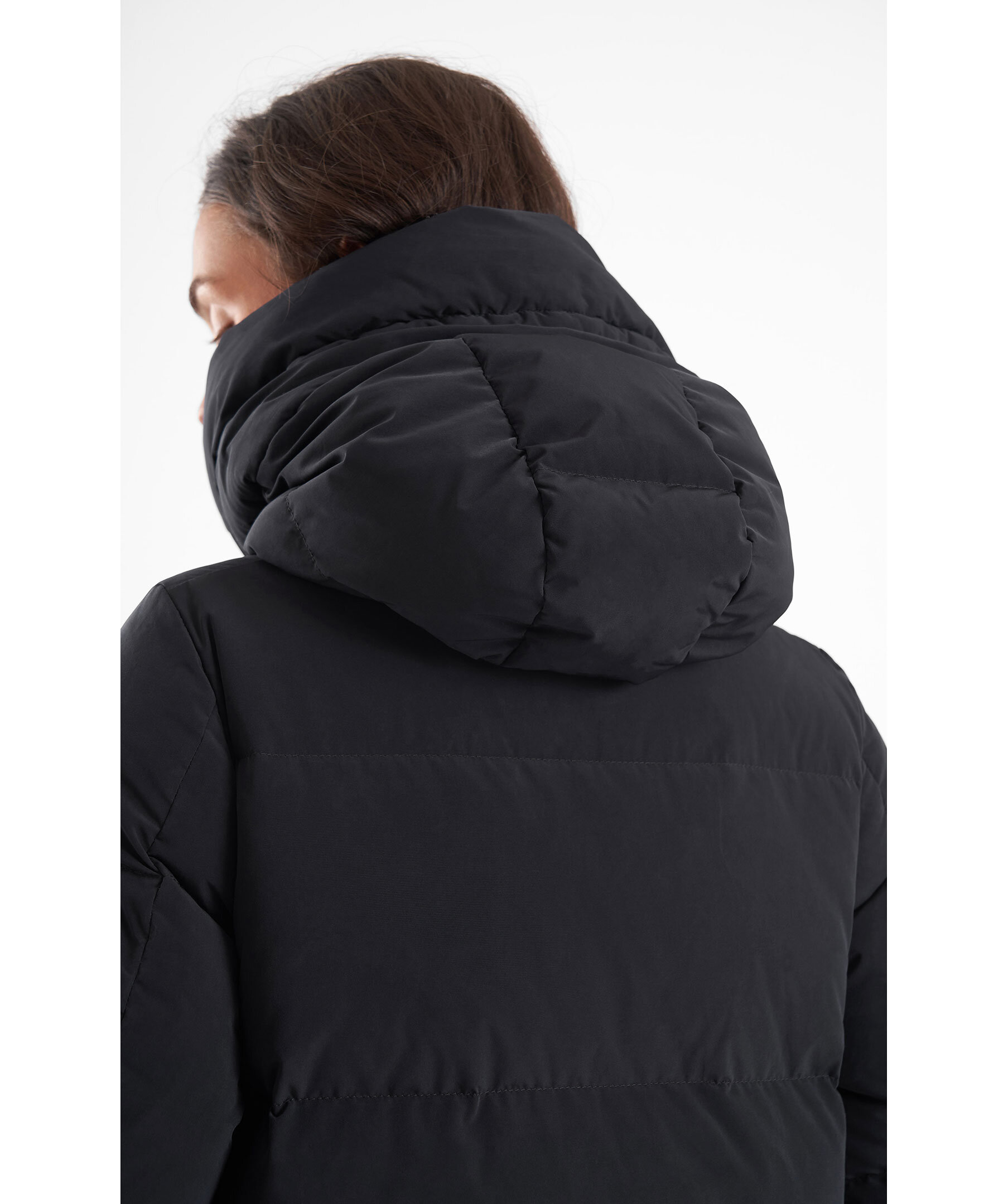 Det är dunets fantastiska isolerande egenskaper som gör jackan så varm, behaglig och lätt. Fjädrarna hjälper till att hålla ihop dunet och bidrar till att transportera ut fukten. Modellen är 172 cm lång och bär storlek S.
