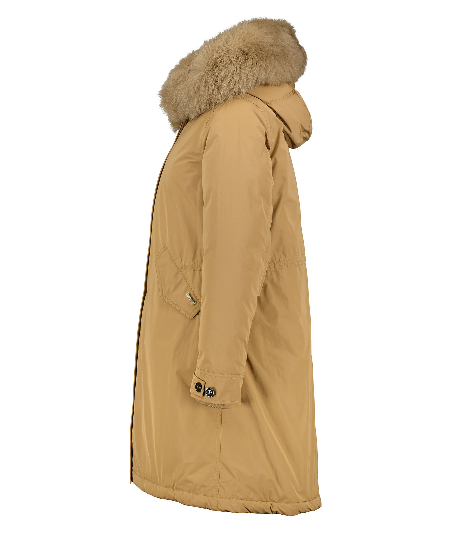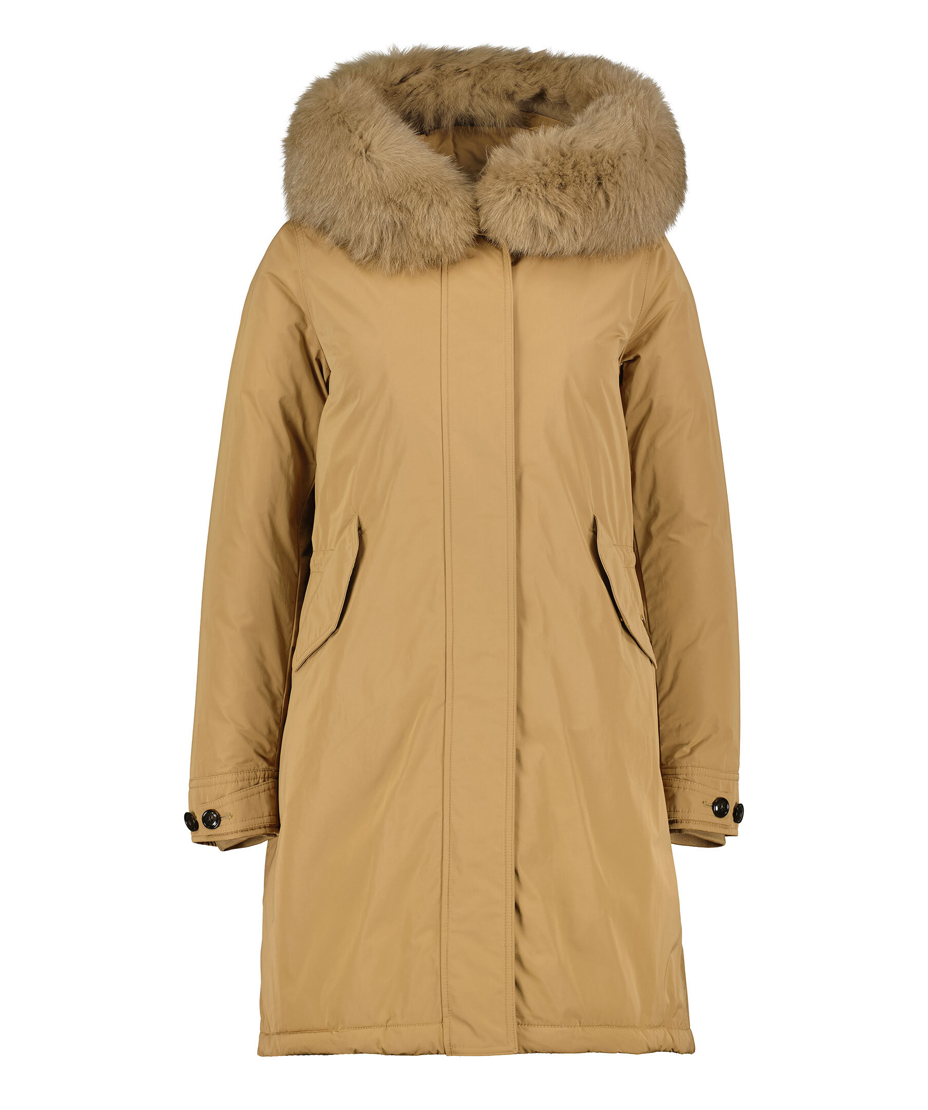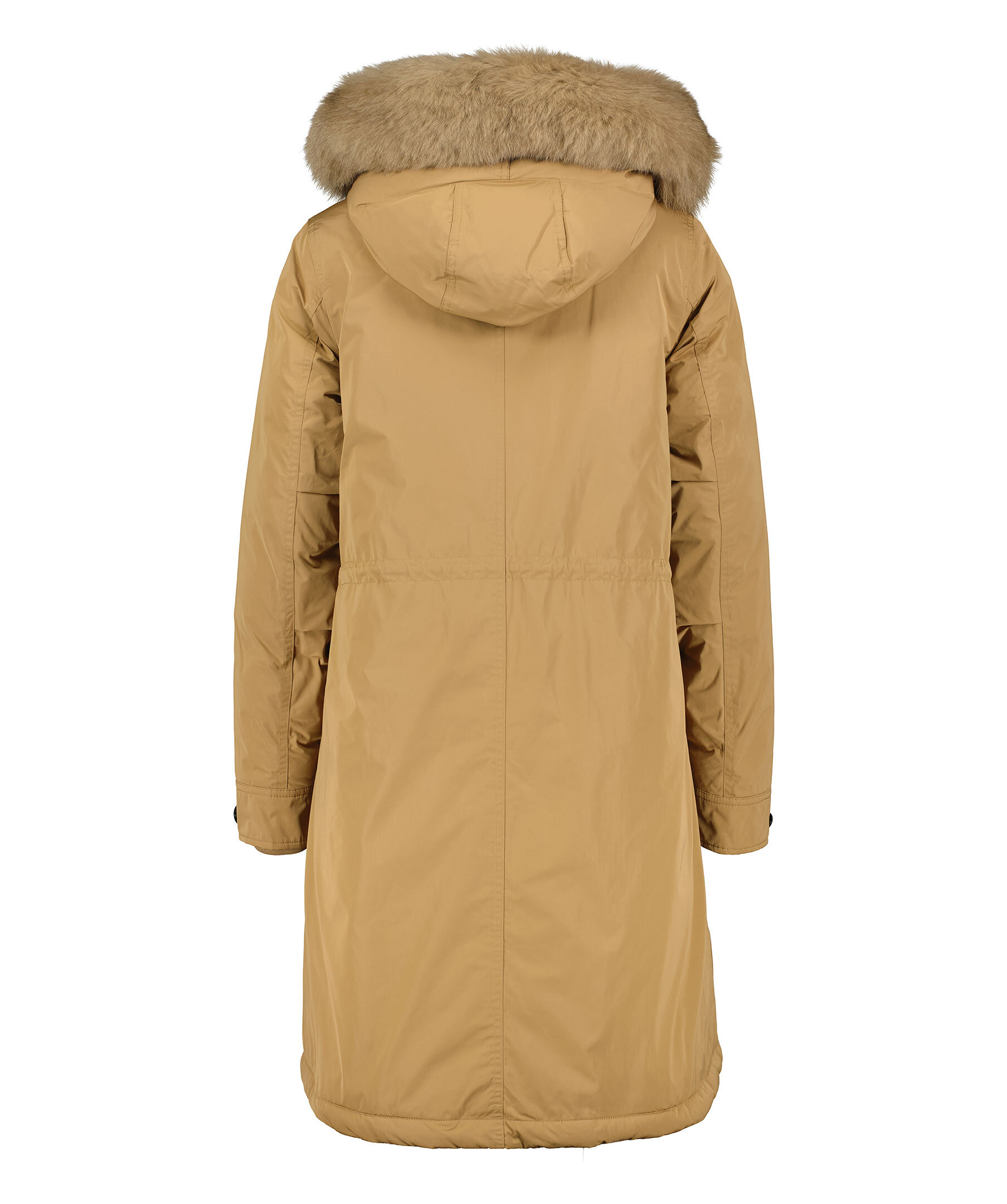 Kamelfärgad dunparkas från Woolrich. Stängs framtill med dragkedja och tryckknappar. Två fickor framtill som stängs med ficklock och tryckknapp, två innerfickor. Dragsko i midjan och jackslut. Luva med dragsko och avtagbar pälskrage. Justerbara ärmslut, ribbstickade muddar. Modellen är 178cm lång och har storlek S på sig.