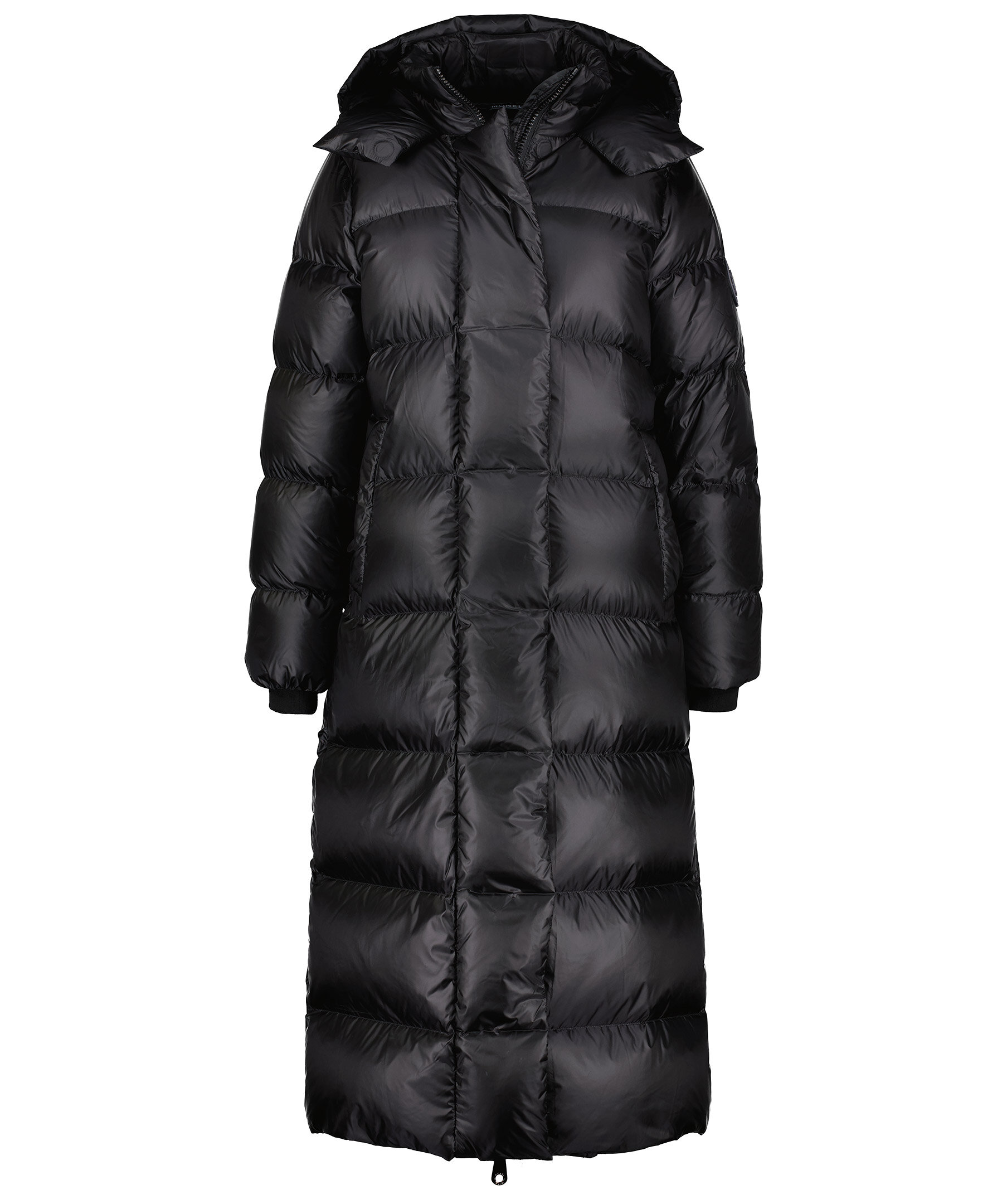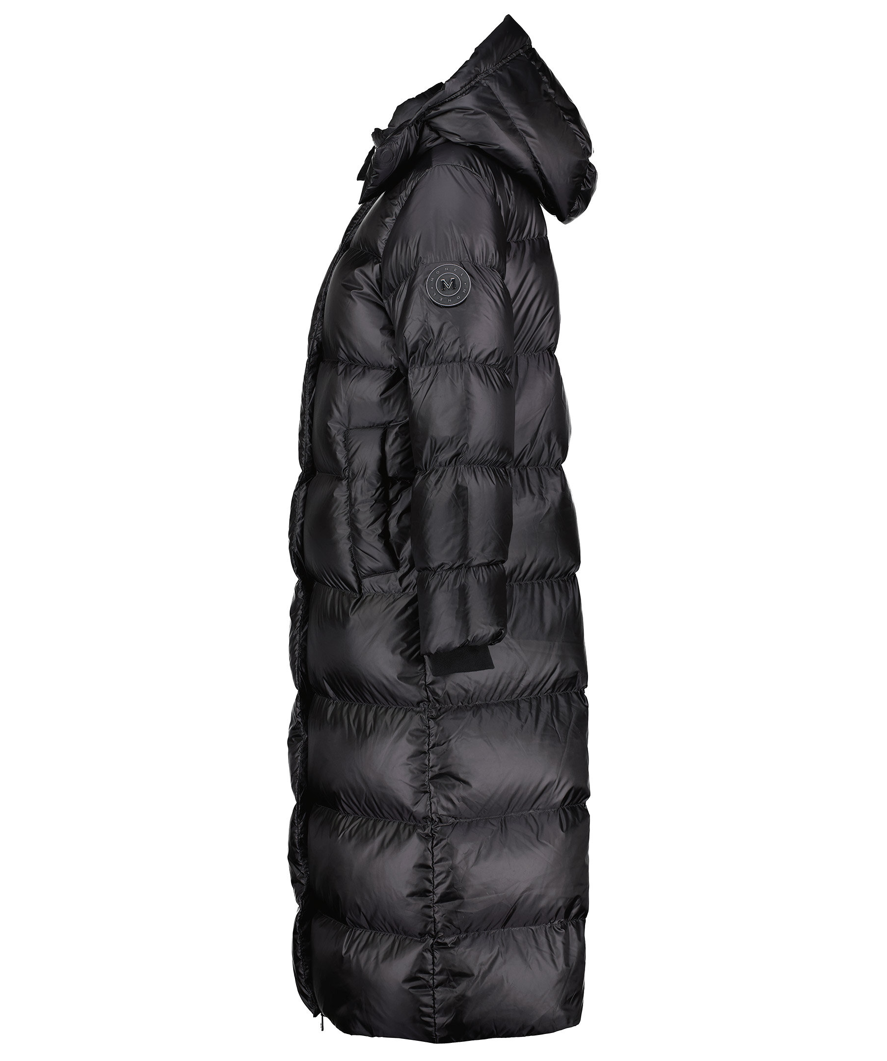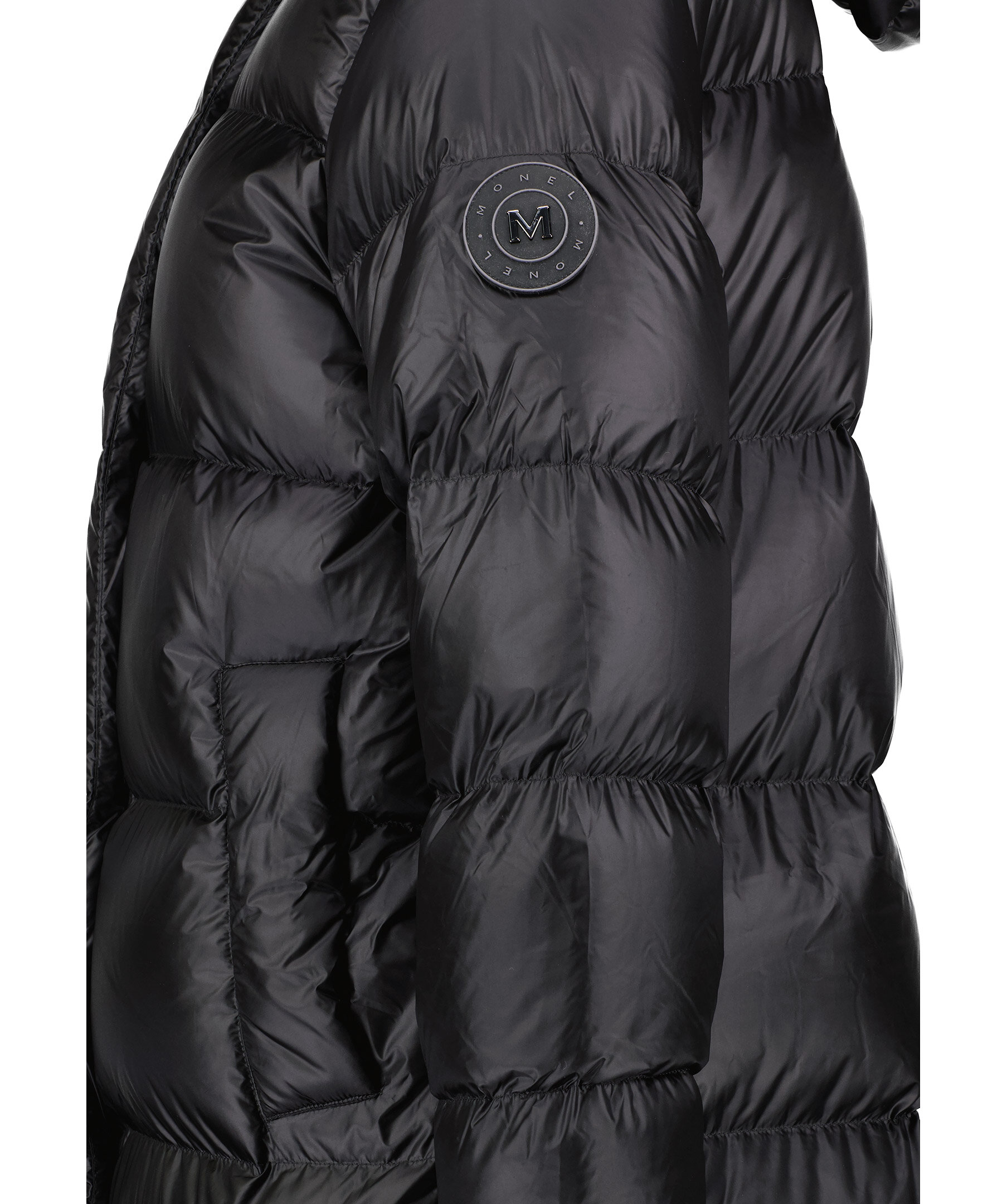 Svart lång, pufferjacka som slutar vid ankeln från Monel. Yttermaterial nylontyg med glansig finish samt rak och oversize passform. Stängs med tvåvägsdragkedja och magneter, har två fickor i sidorna som stängs med tryckknapp och två innerfickor med dragkedja. Hög krage och luva, muddar i ärmslut samt patch i gummi med logotyp i metall på vänster ärm. Vi upplever att denna produkt är stor i storlek och rekommenderar att gå ner en storlek.