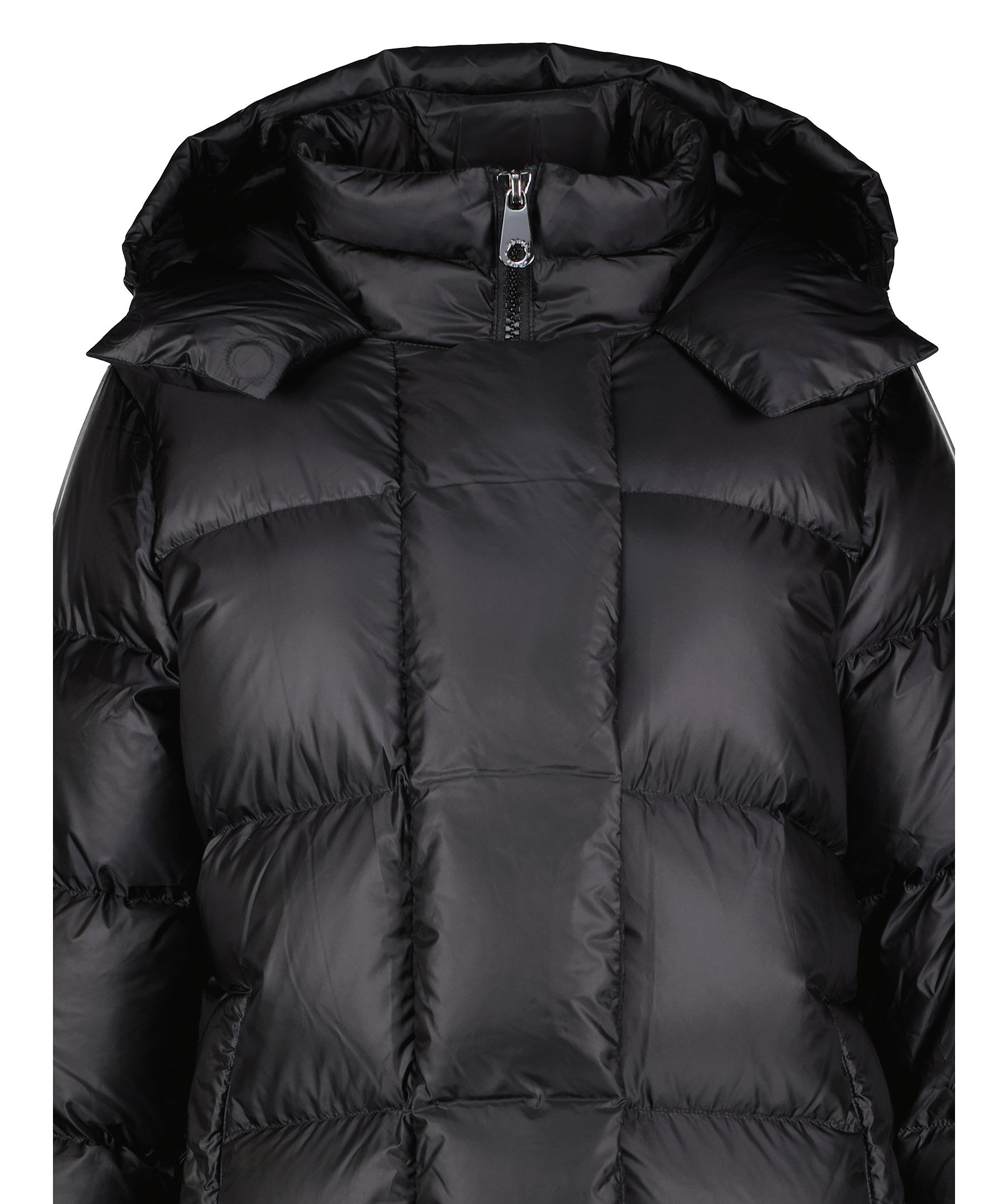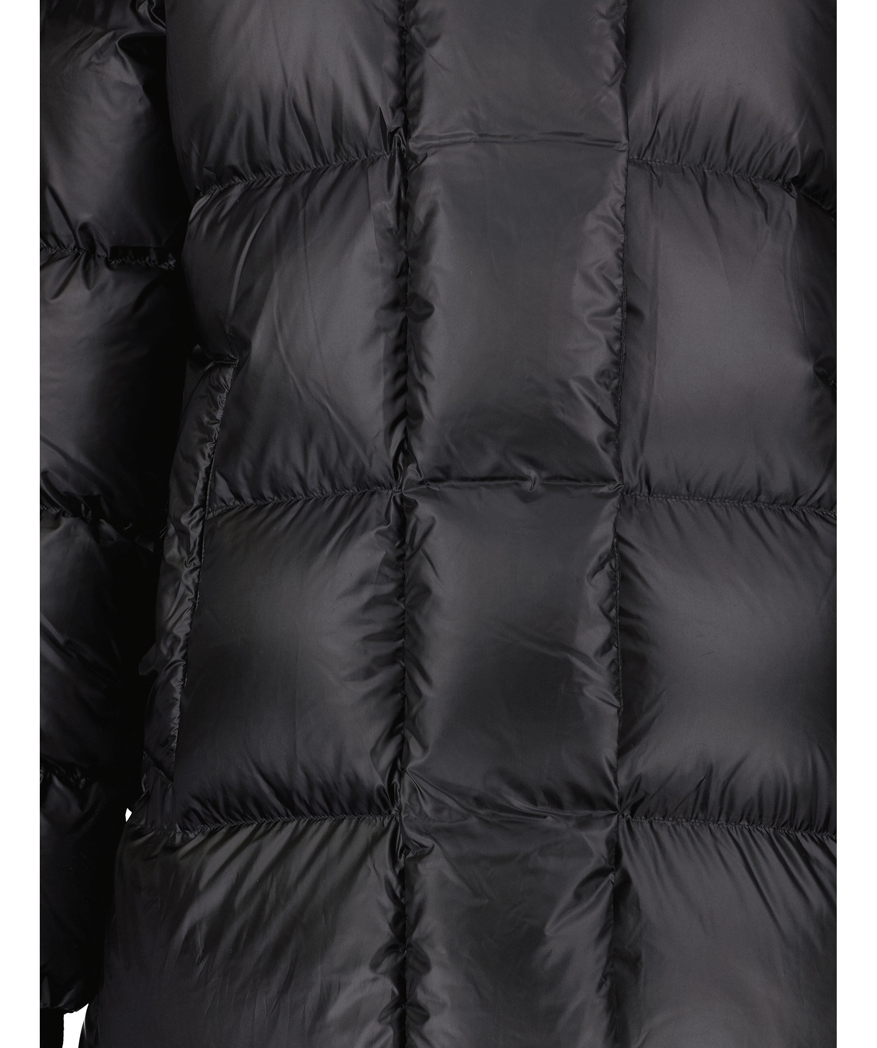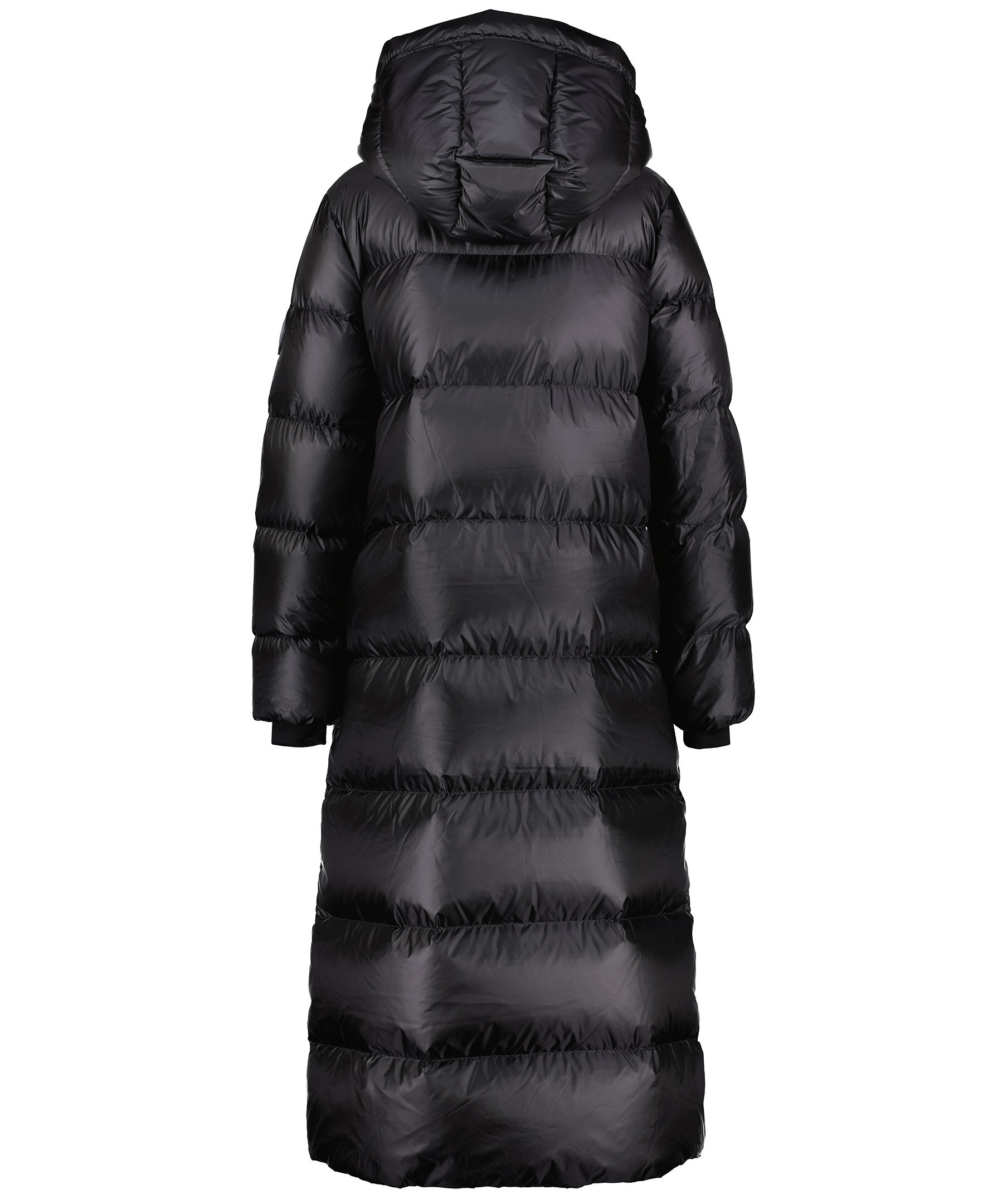 Svart lång, pufferjacka som slutar vid ankeln från Monel. Yttermaterial nylontyg med glansig finish samt rak och oversize passform. Stängs med tvåvägsdragkedja och magneter, har två fickor i sidorna som stängs med tryckknapp och två innerfickor med dragkedja. Hög krage och luva, muddar i ärmslut samt patch i gummi med logotyp i metall på vänster ärm. Vi upplever att denna produkt är stor i storlek och rekommenderar att gå ner en storlek.
