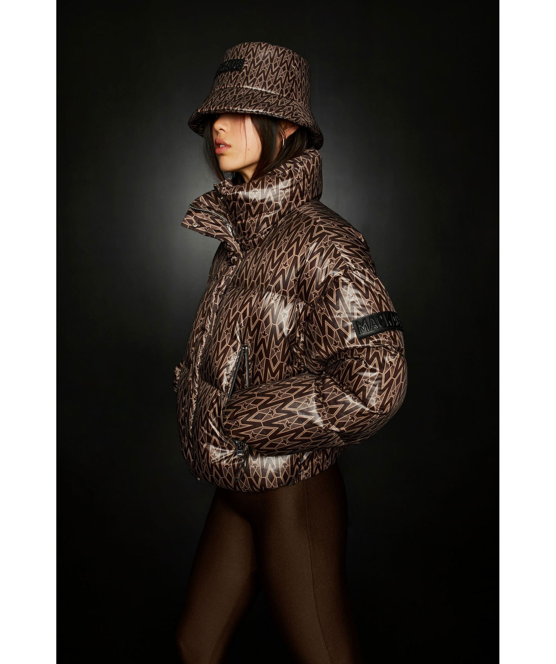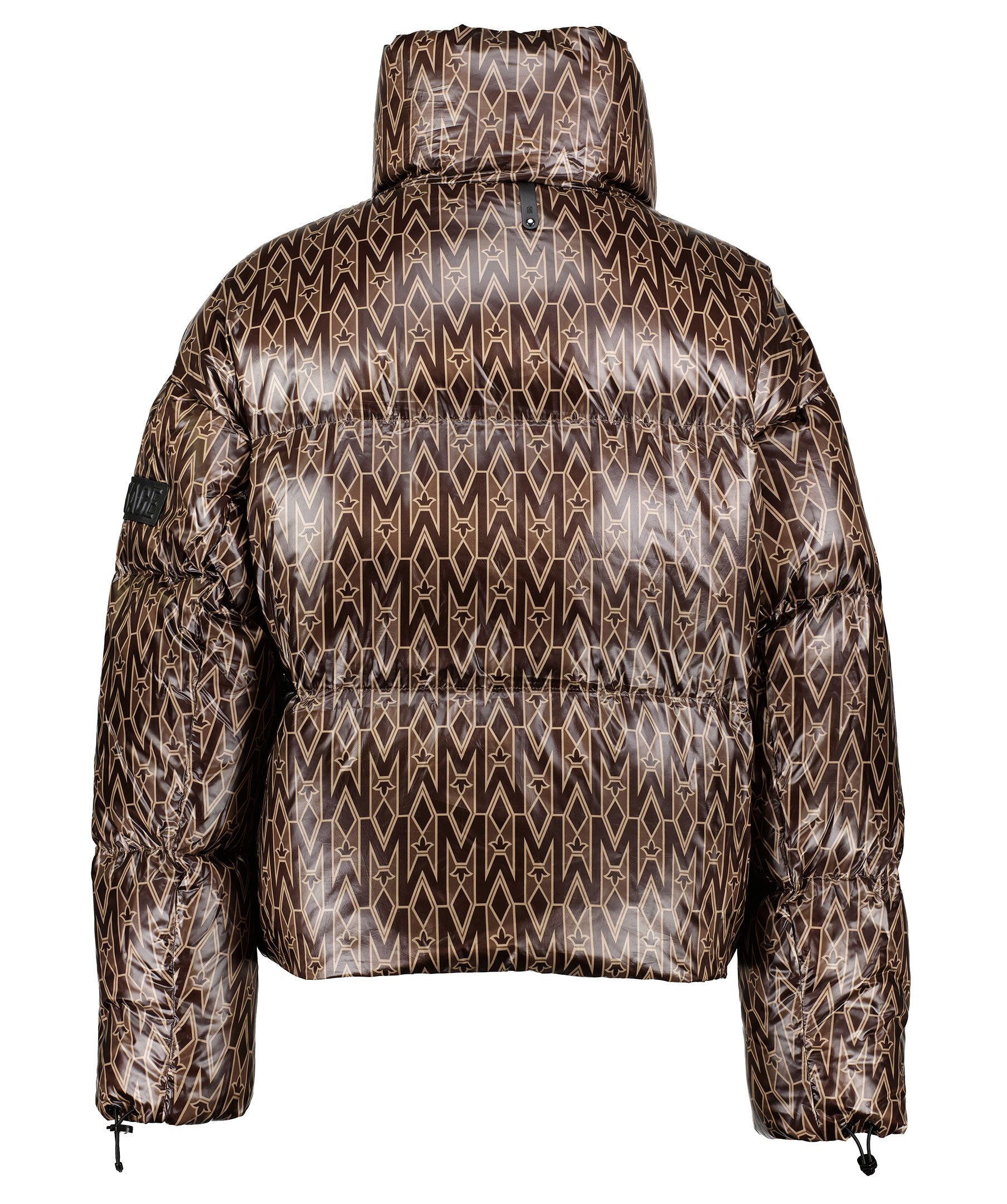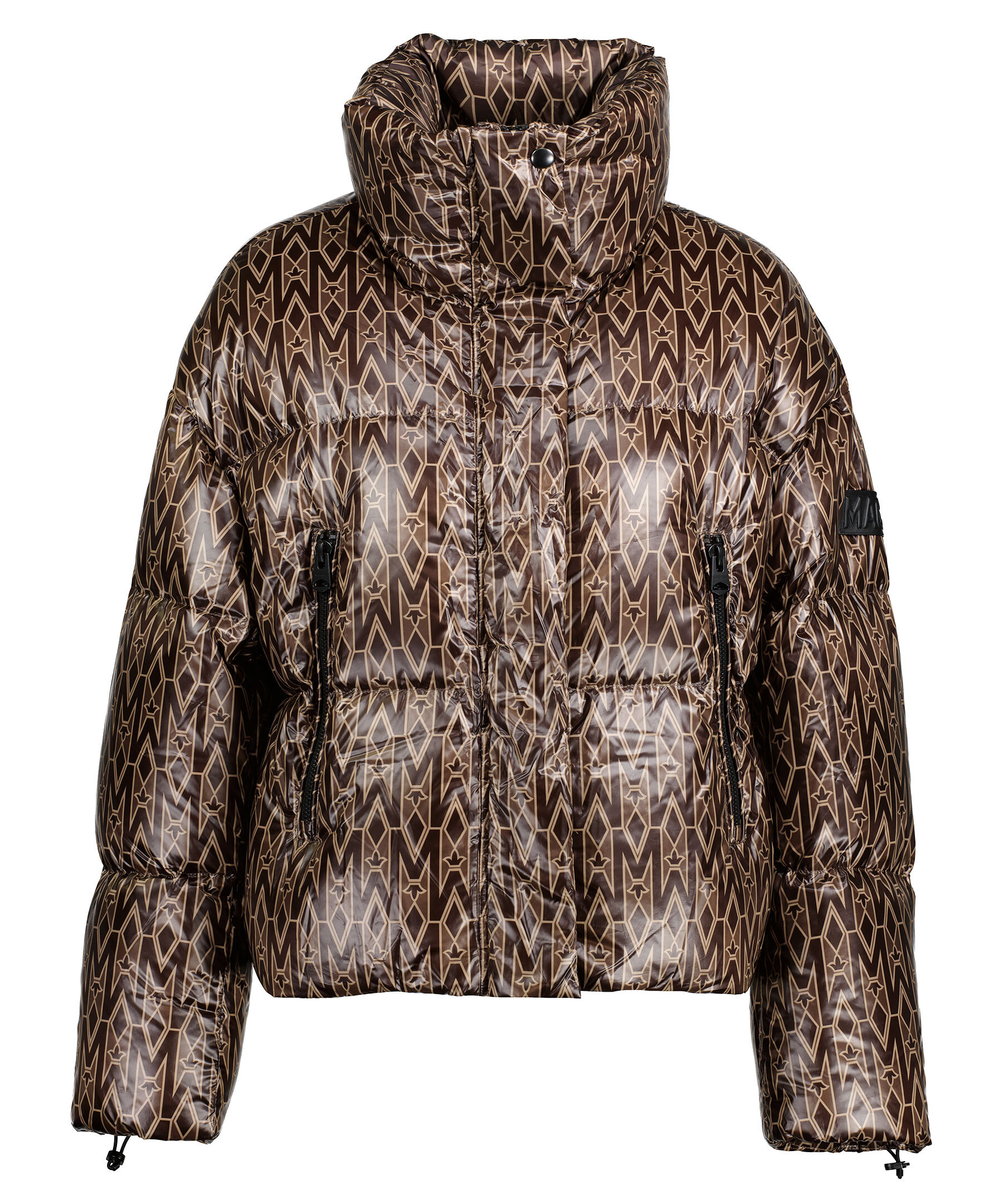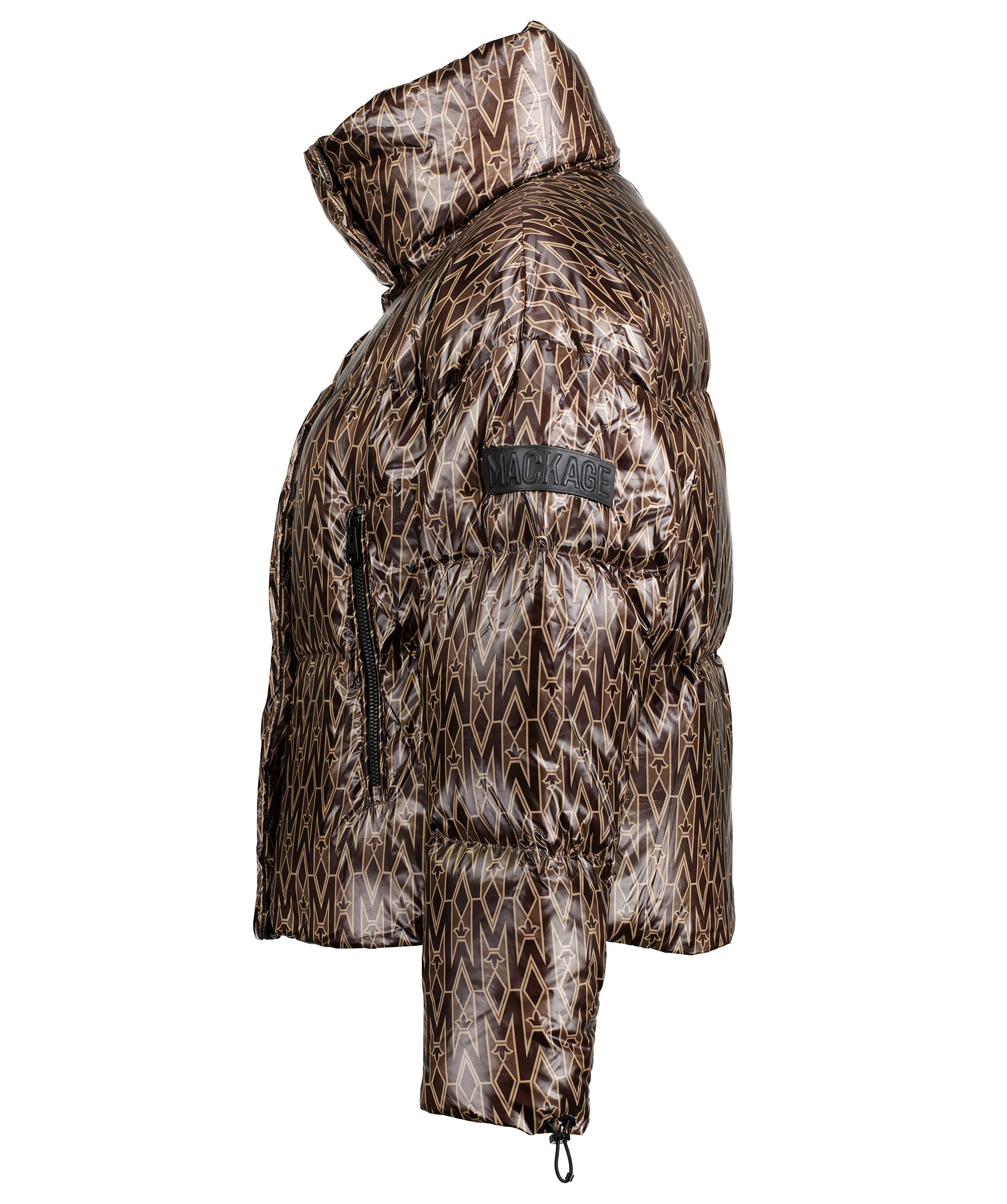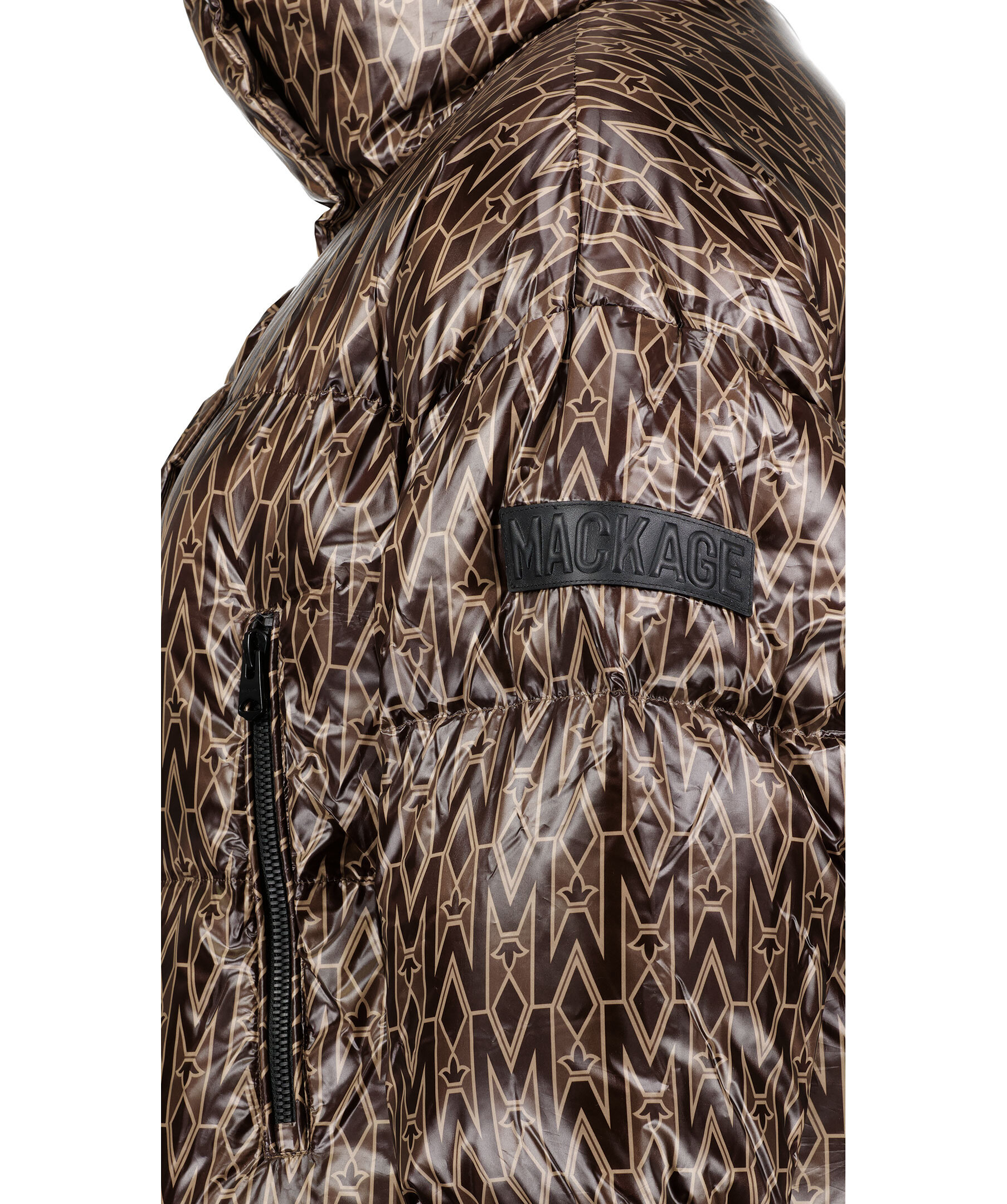 Brun, mönstrad dunjacka i oversize passform och tillverkade i återvunna material från Mackage. 800 fyllningseffekt och klarar kyla ned till -10°C. Stor trattkrage och ikoniskt monogramtryck. Överdimensionerad drop shoulder-silhuett och viktlös fyllning. Justerbar dragsko i nederkant, fodrade fickor och dold dragkedja fram med tryckknappar. Elastiska muddar i ärmslut. Svart, avlång patch med logotyp på vänster ärm tillverkad i läder. För en mer anpassad look eller för små kunder rekommenderar vi att gå ner i storlek. Längd på storlek S från axel till nederkant: 55,88 cm.