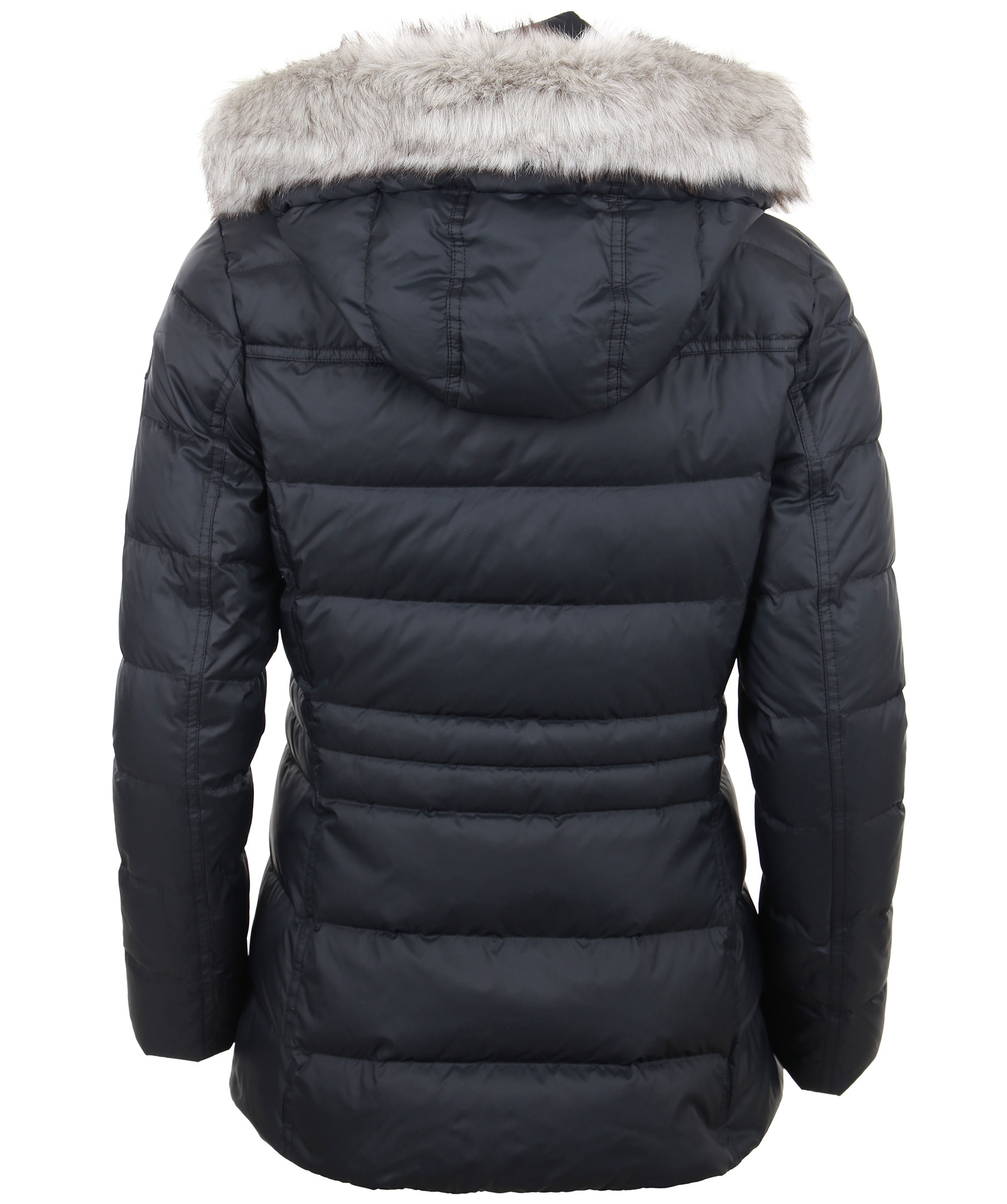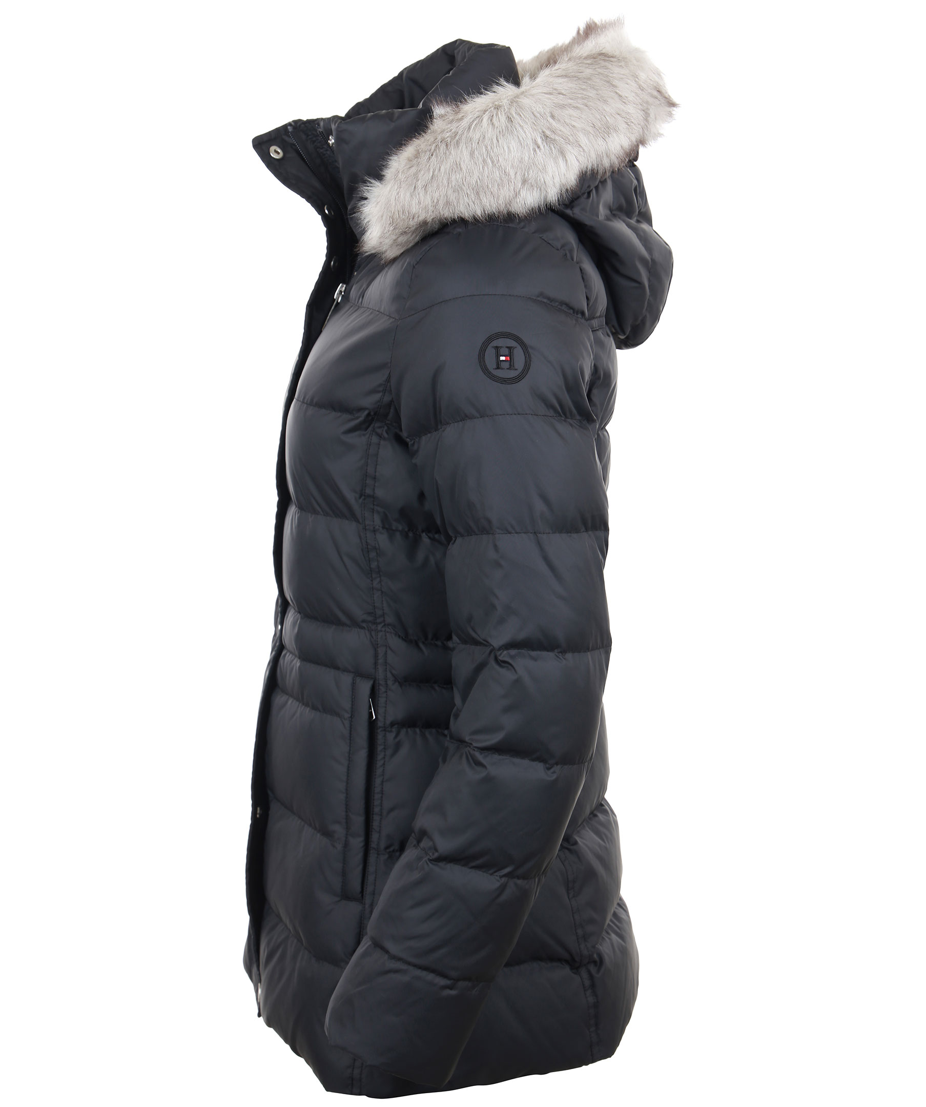 Svart dunjacka från Tommy Hilfiger. Löstagbar luva med konstpäls, fodrad krage, snedställda fickor med dragkedja samt muddar i ärmslut. Stängs med dragkedja och tryckknappar.