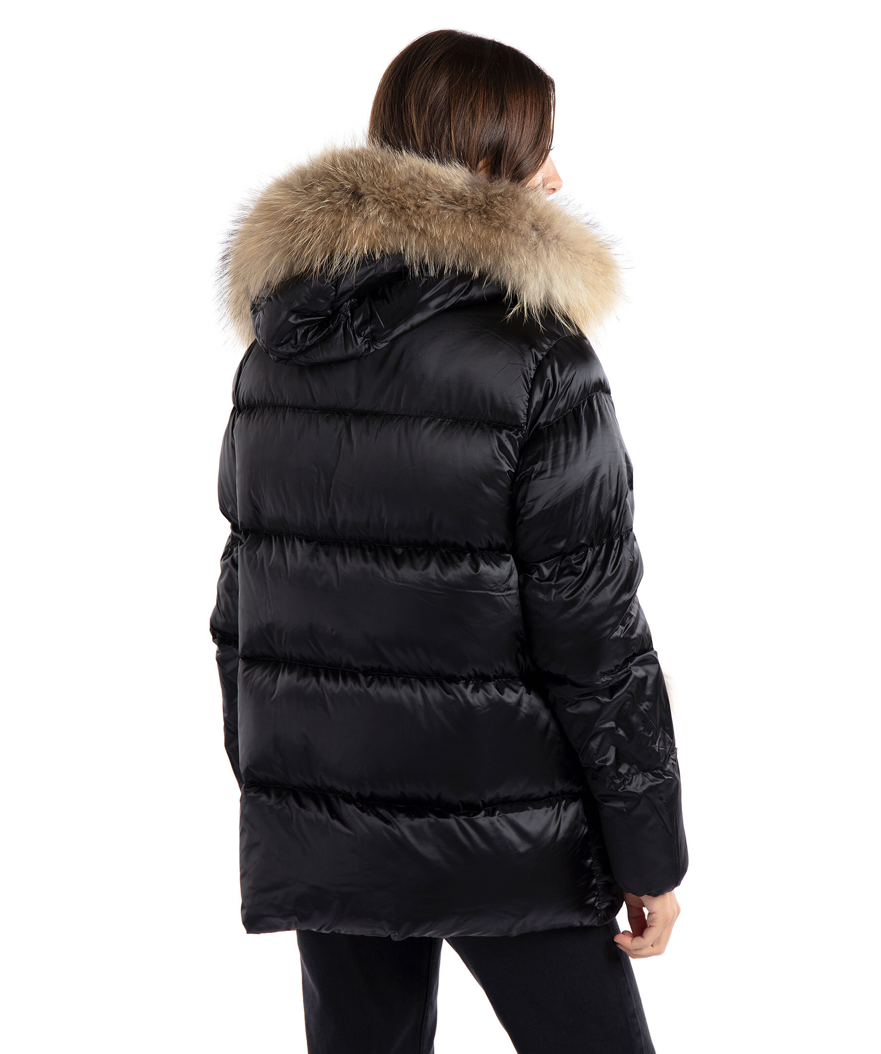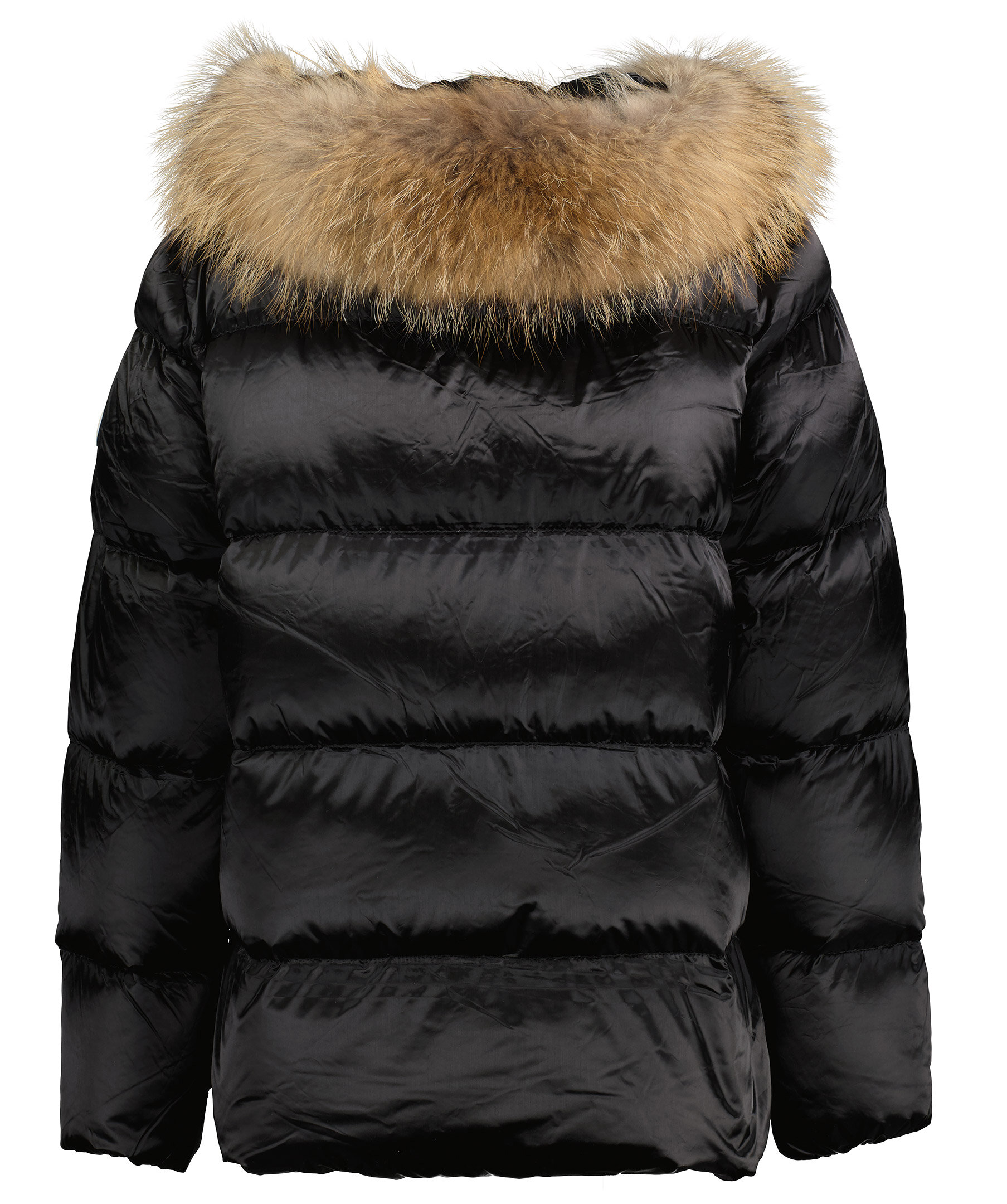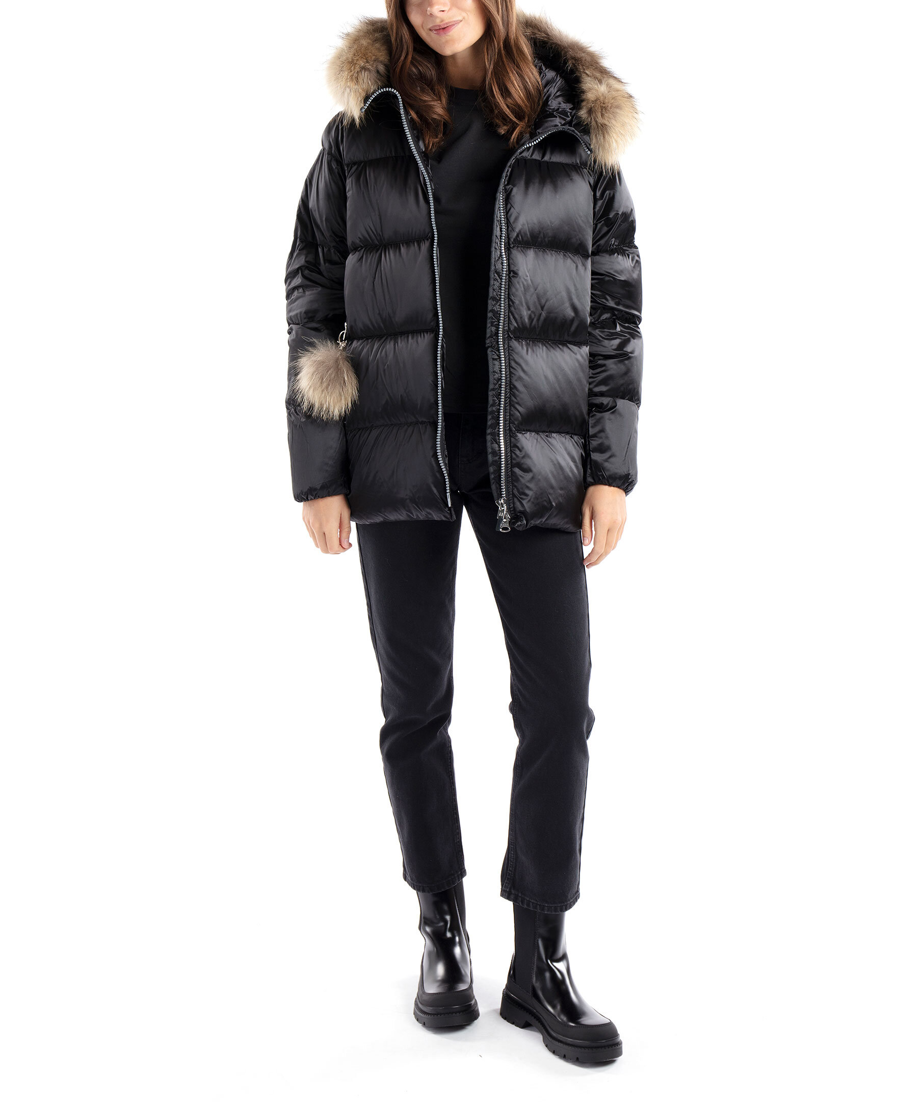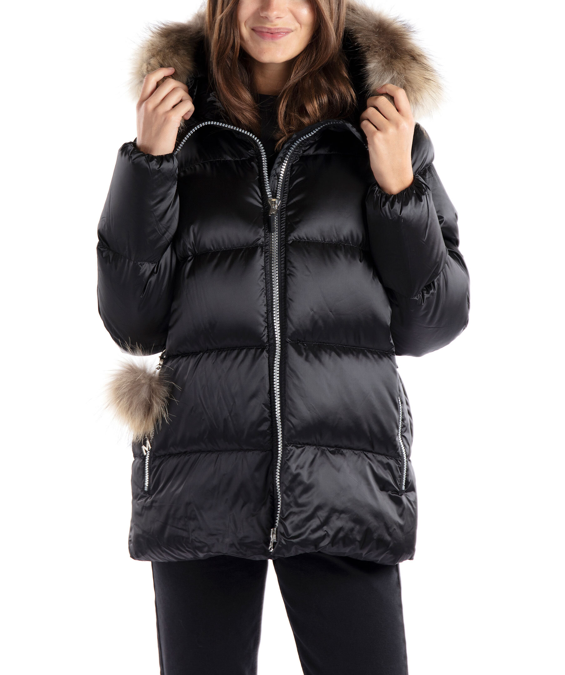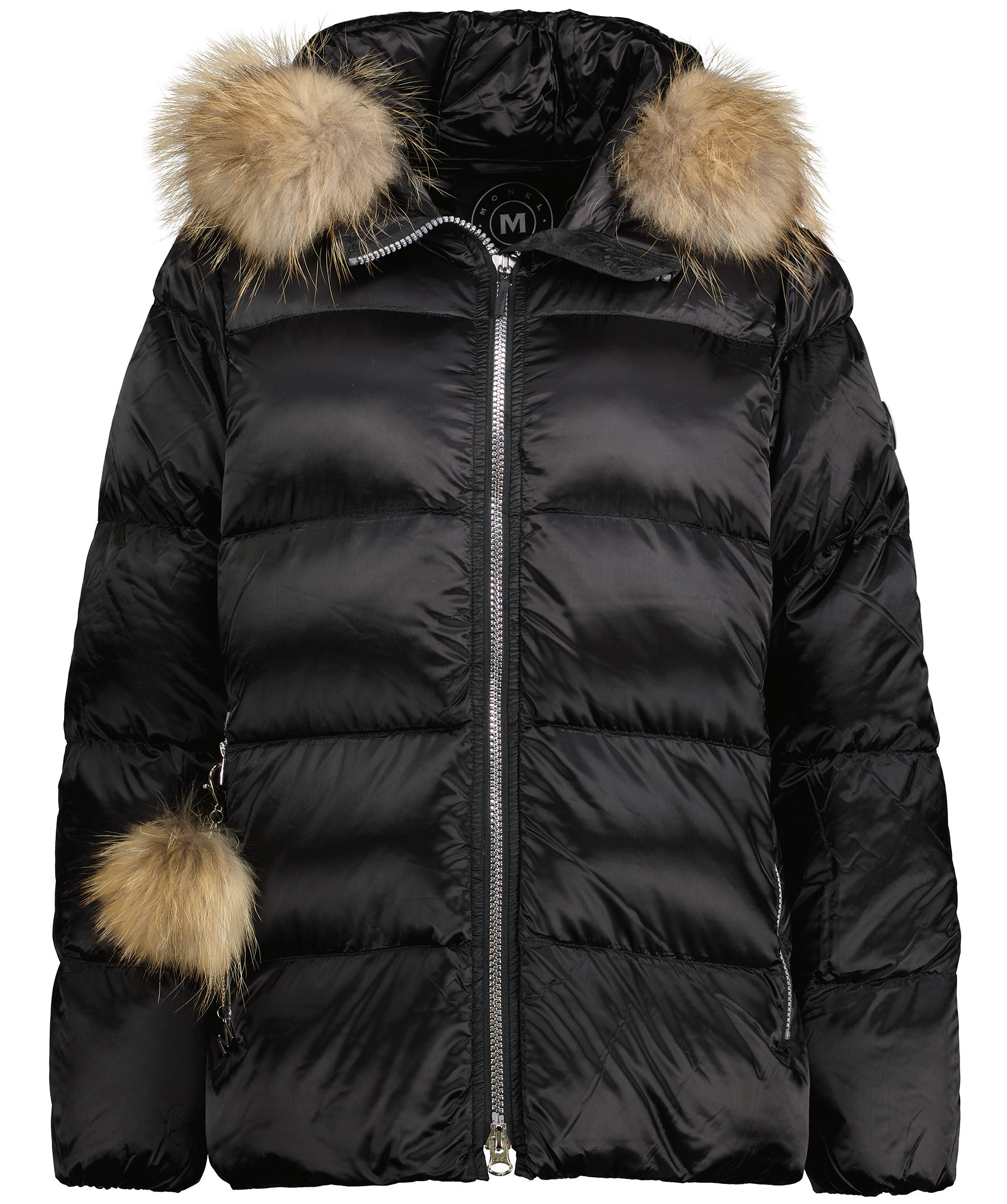 Svart quiltad dunjacka i oversizemodell från Monel i glansigt tyg. Stängs med tvåvägsdragkedja. Två fickor framtill som stängs med dragkedja och en innerficka med dragkedja. Luva med avtagbar naturpäls. Hög krage samt patch i gummi med logotyp i metall på vänster ärm. Avtagbar detalj i naturpäls vid höger ficka. Modellen är 178cm lång och har på sig storlek S. Vi upplever att denna produkt är stor i storlek och rekommenderar att gå ner en storlek.
