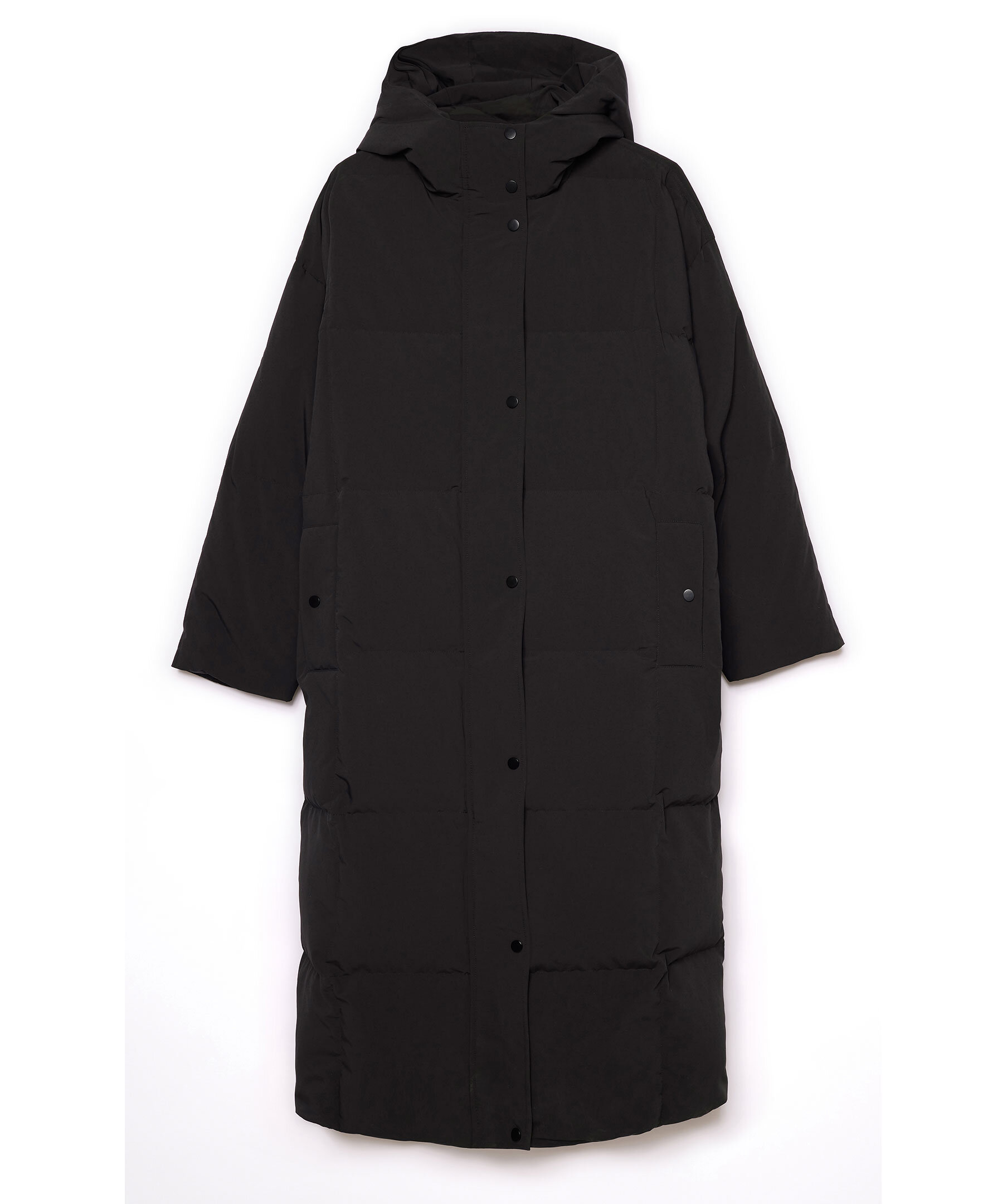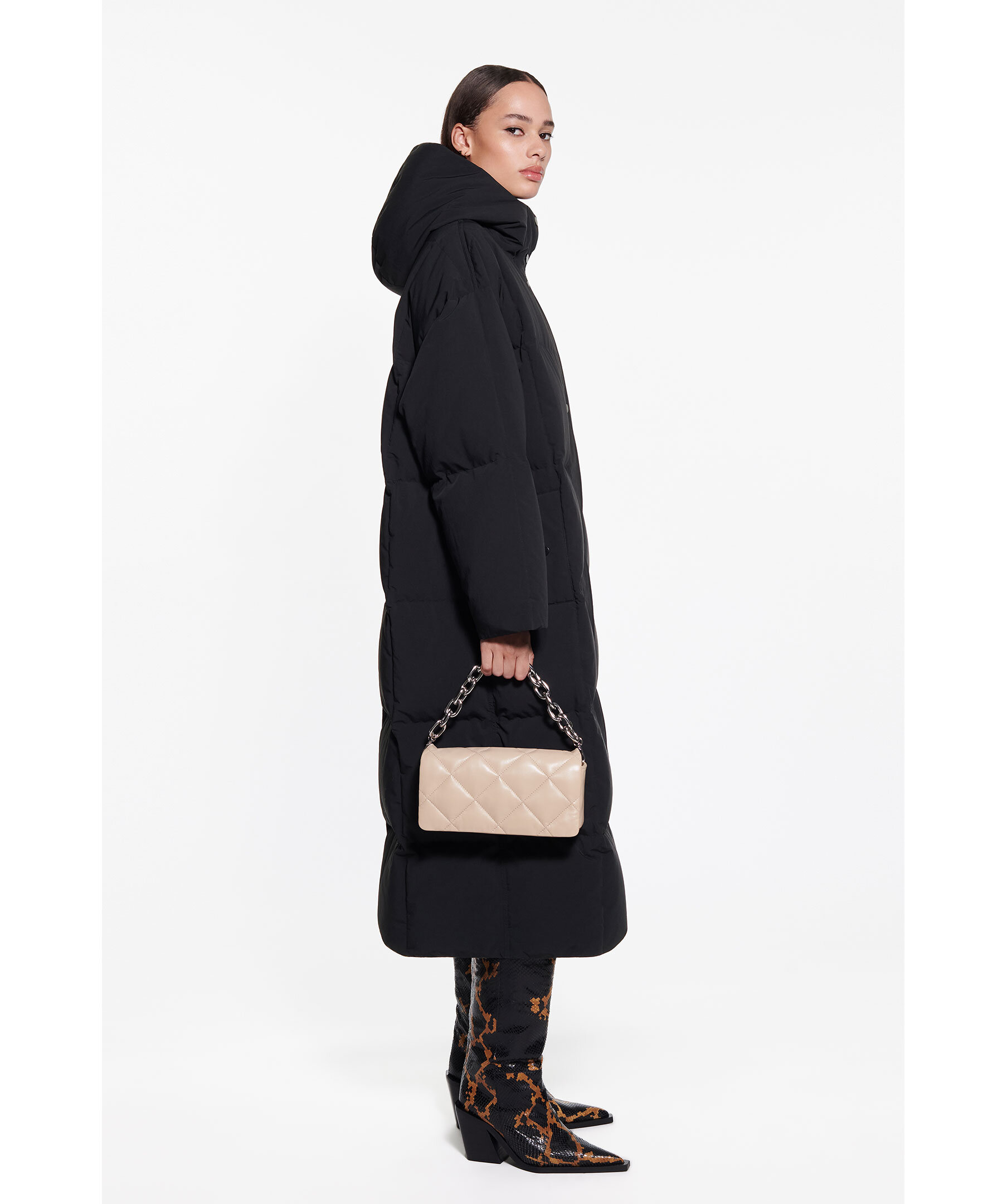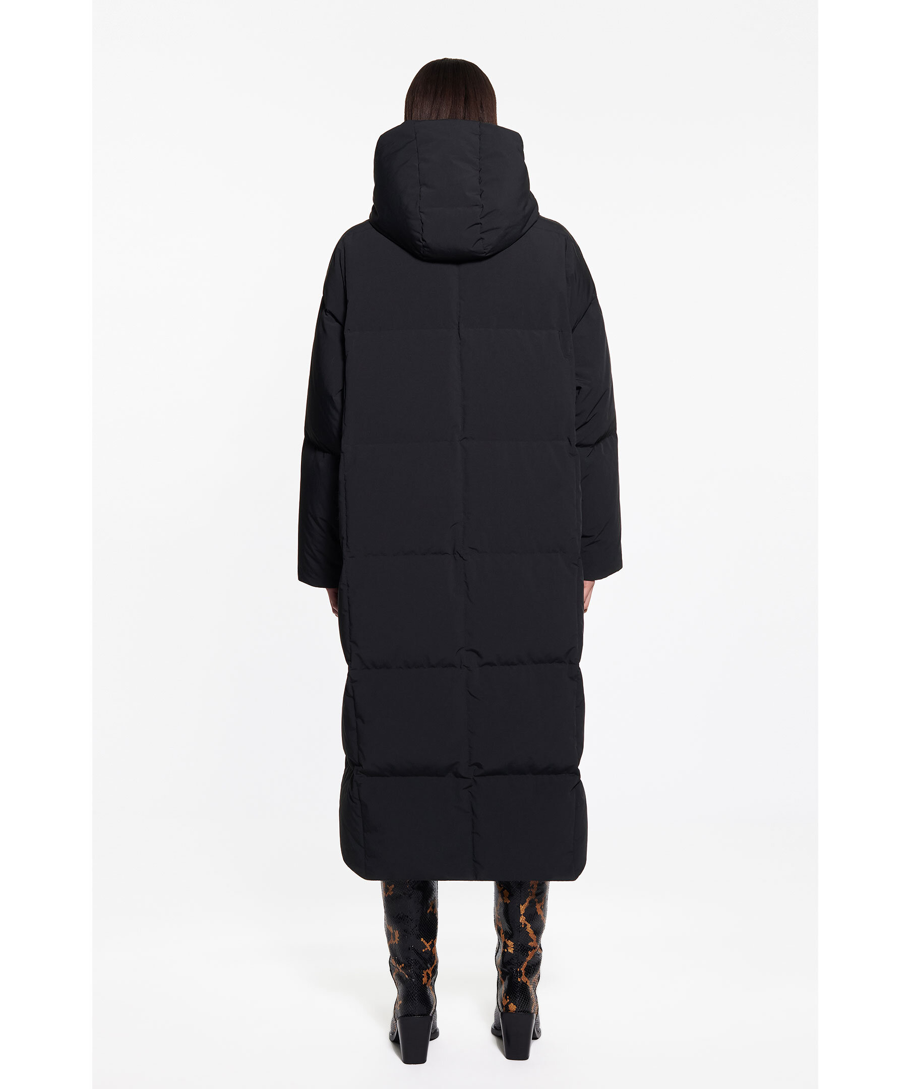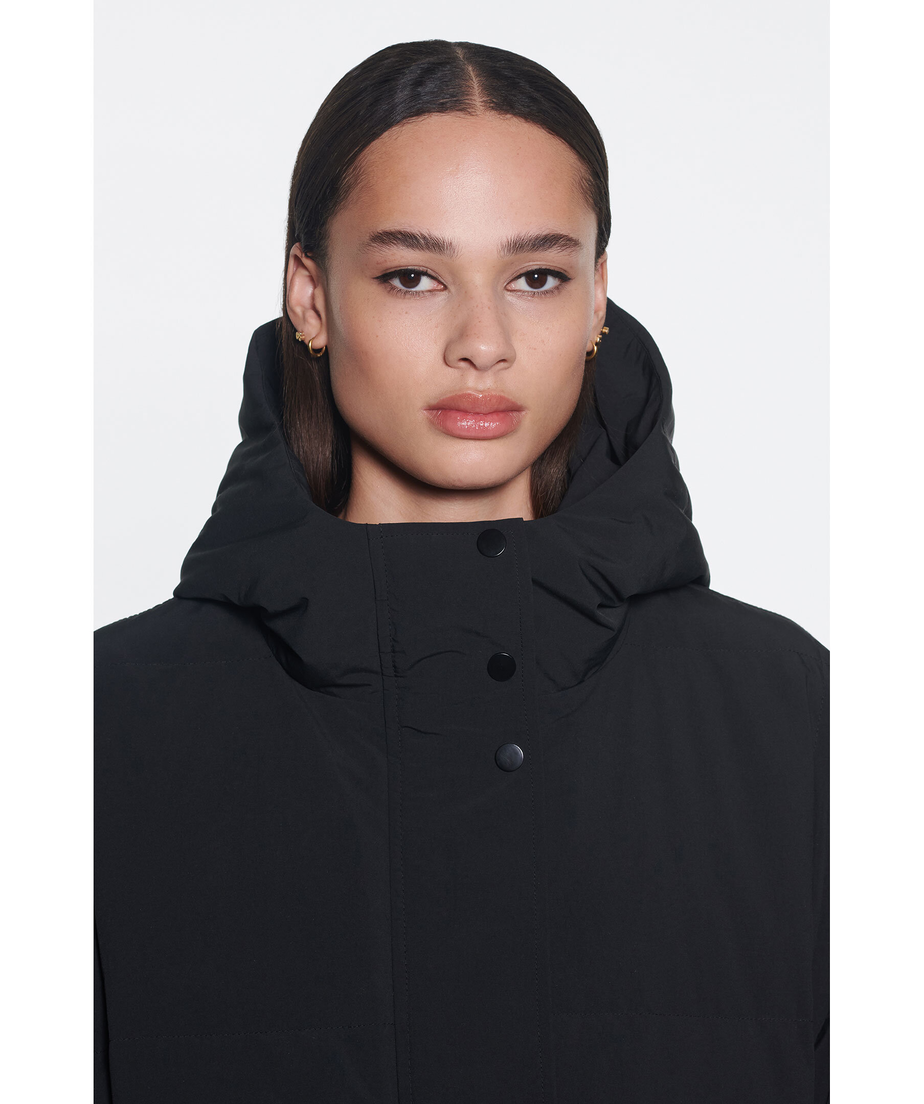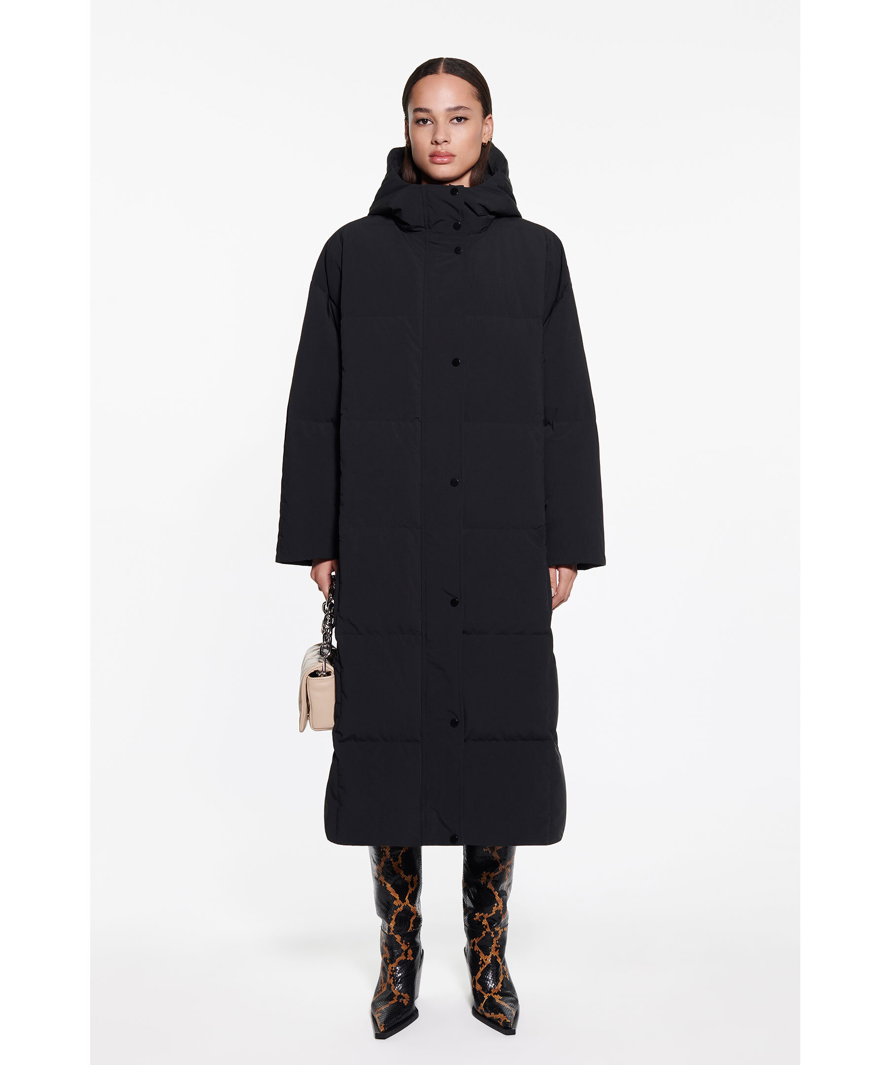 Svart dunkappa med luva från Stand Studio. Vadderad med återvunnet dun och skräddarsydd i ett matt polyestertyg. Synlig tryckknappsstängning, dragkedja fram, sidfickor och innerficka med dragkedja.