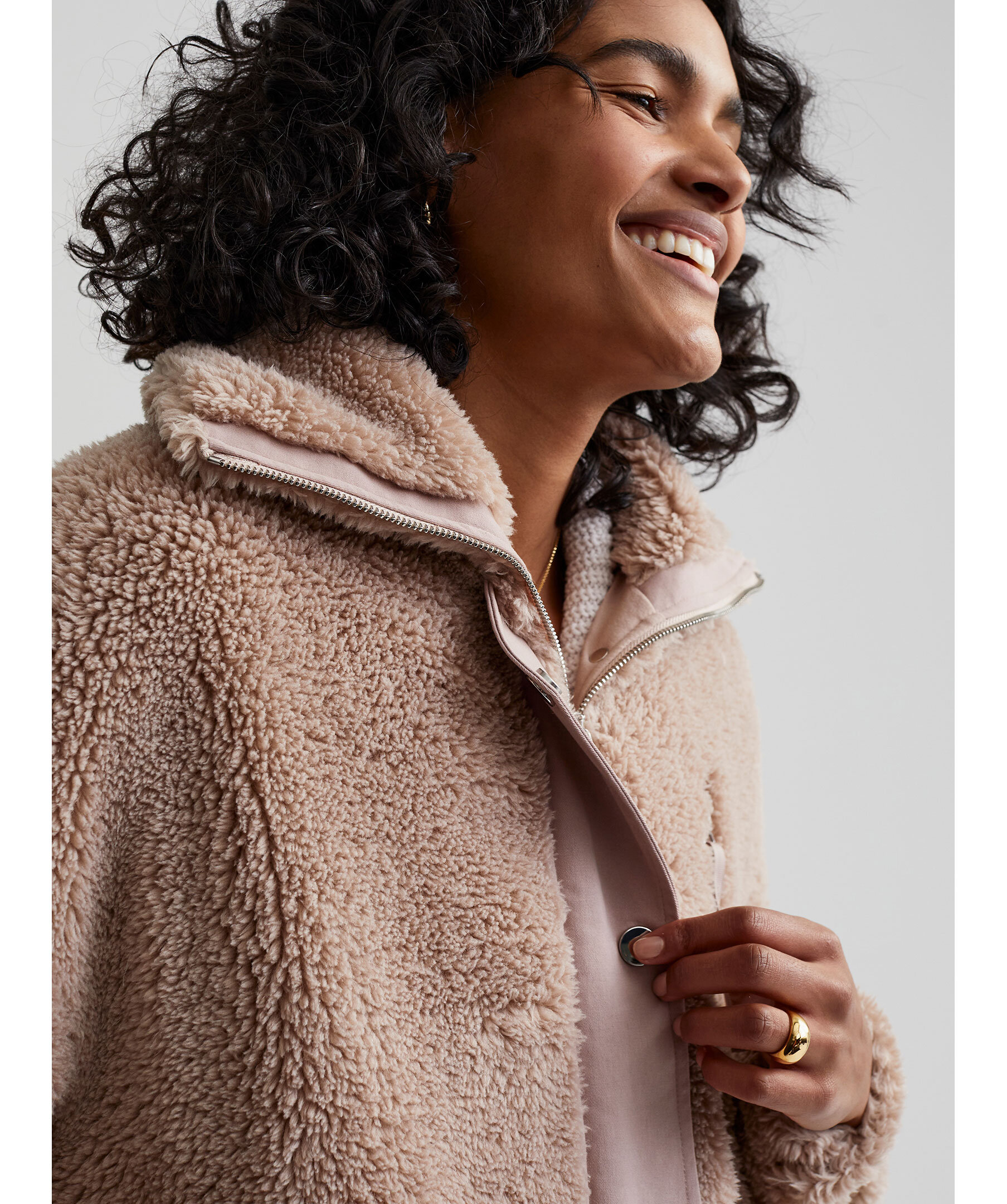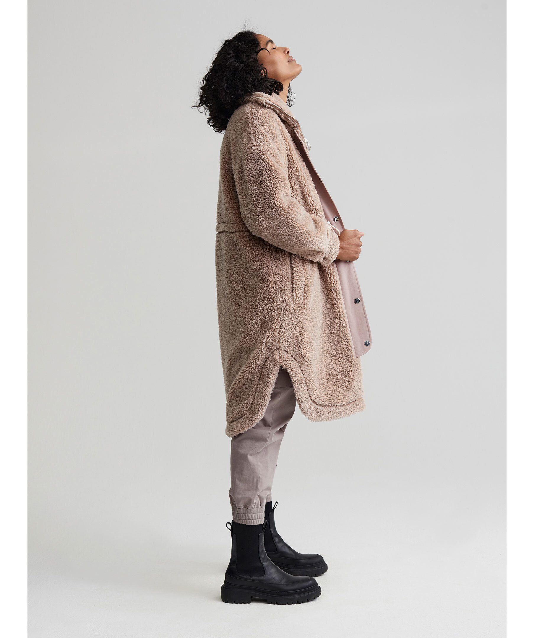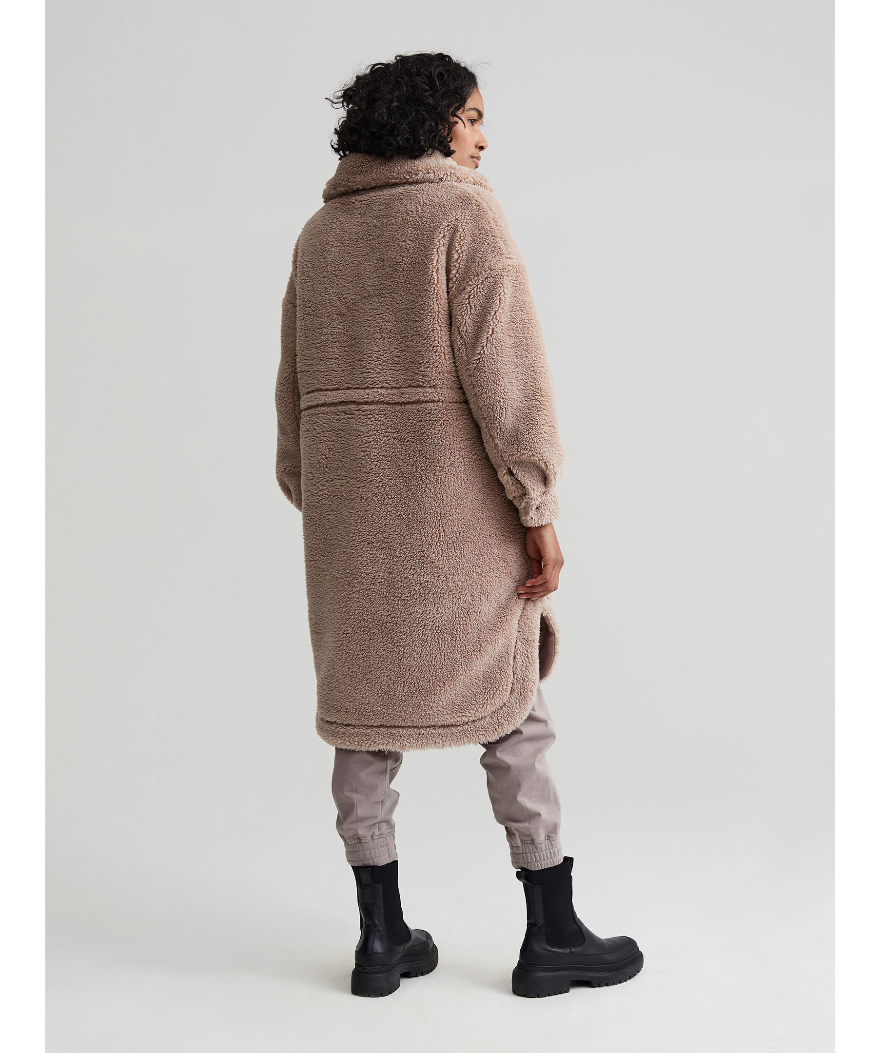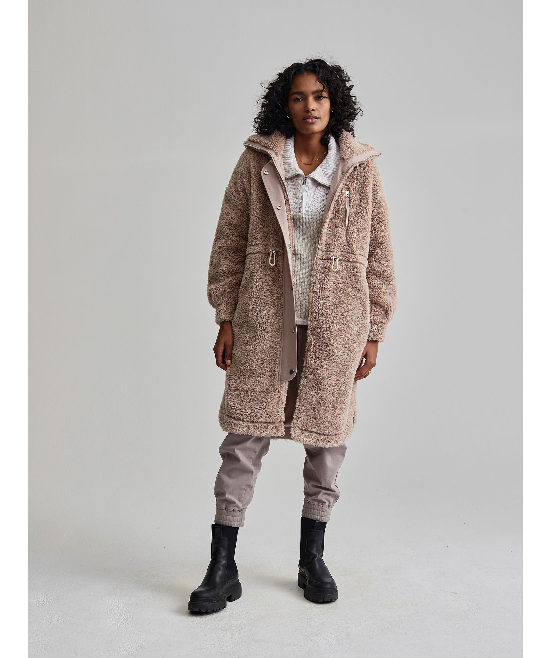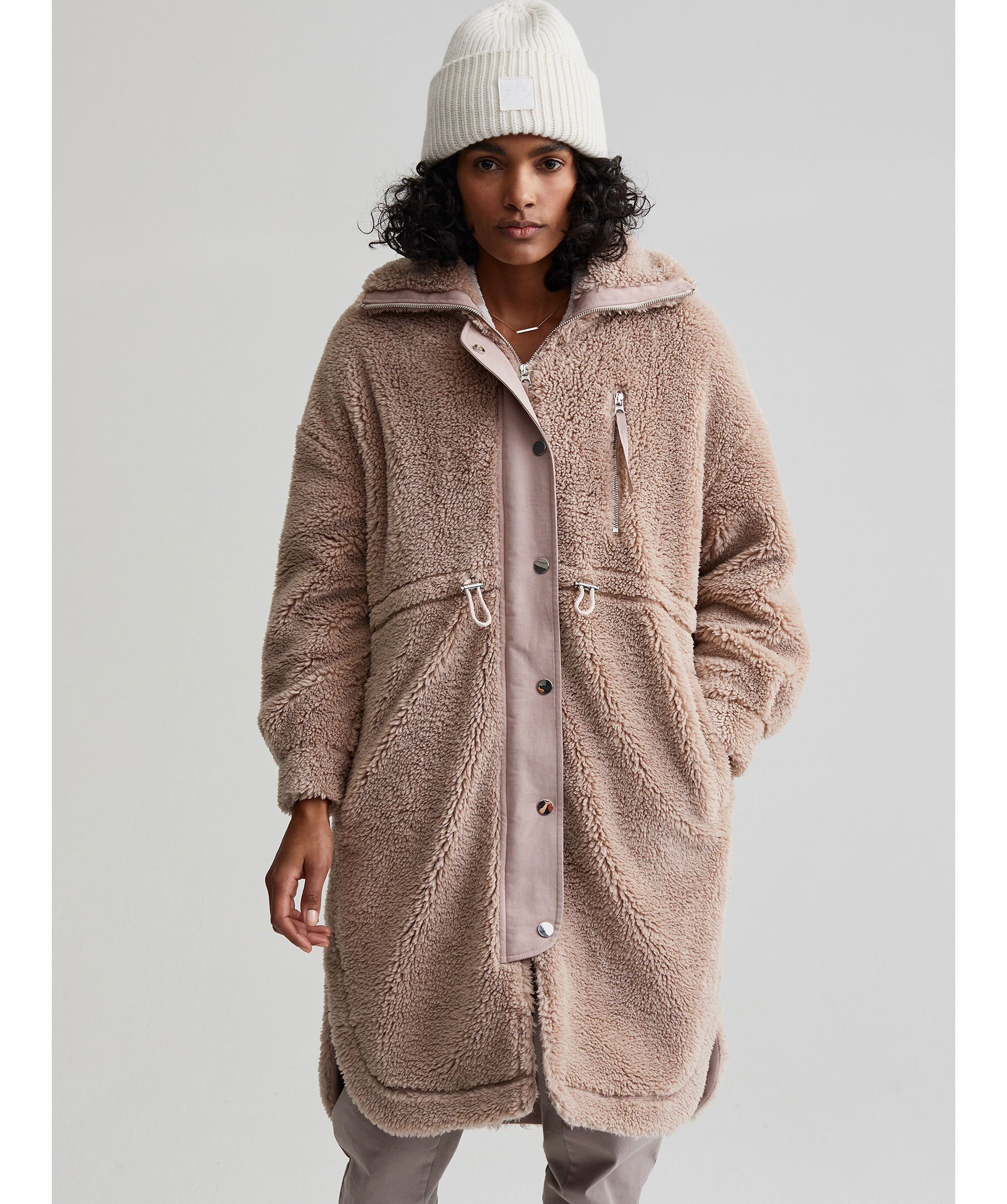 Beige, varm och fluffig jacka i lång modell från Varley. Tillverkad i sherpa i polyester. Hög krage och hellång dragkedja fram med kontrast-tyg och knäppning ovanpå med silverfärgade tryckknappar. Justerbar midja med dragsko, bröstficka med dragkedja och öppna fickor i sidorna. Rundad slits i sidorna.