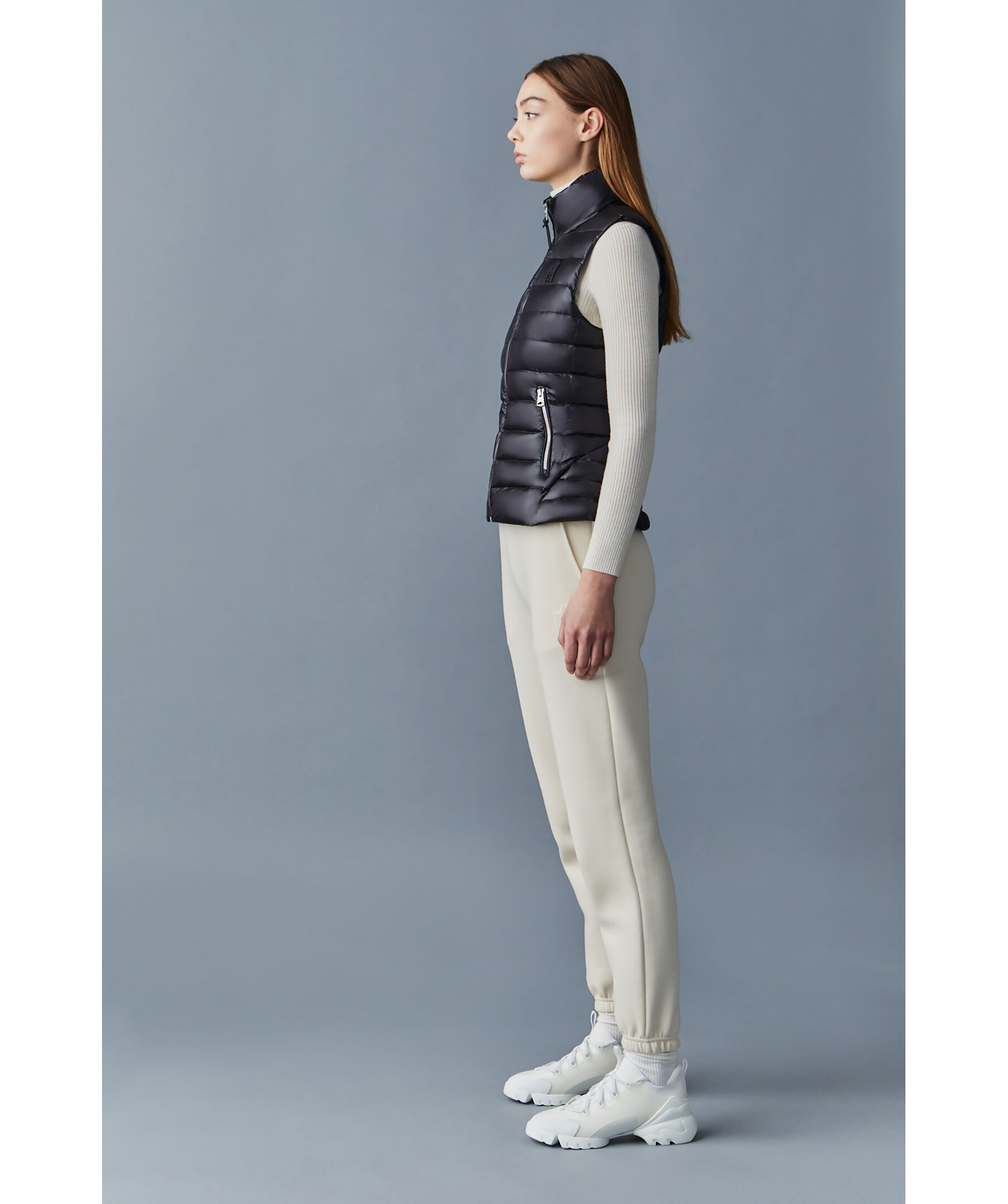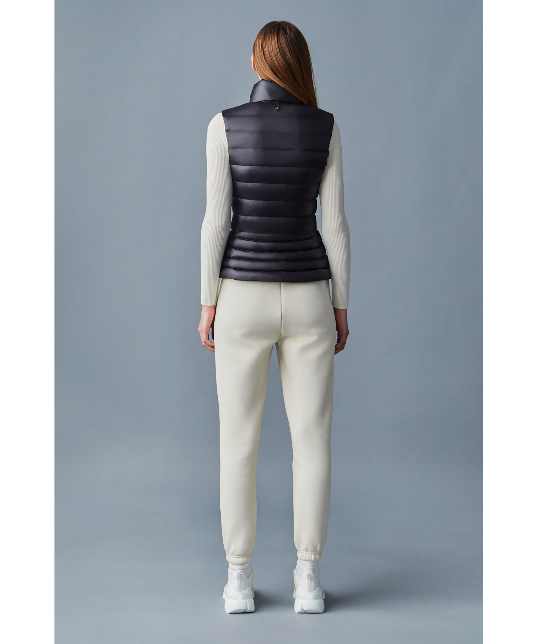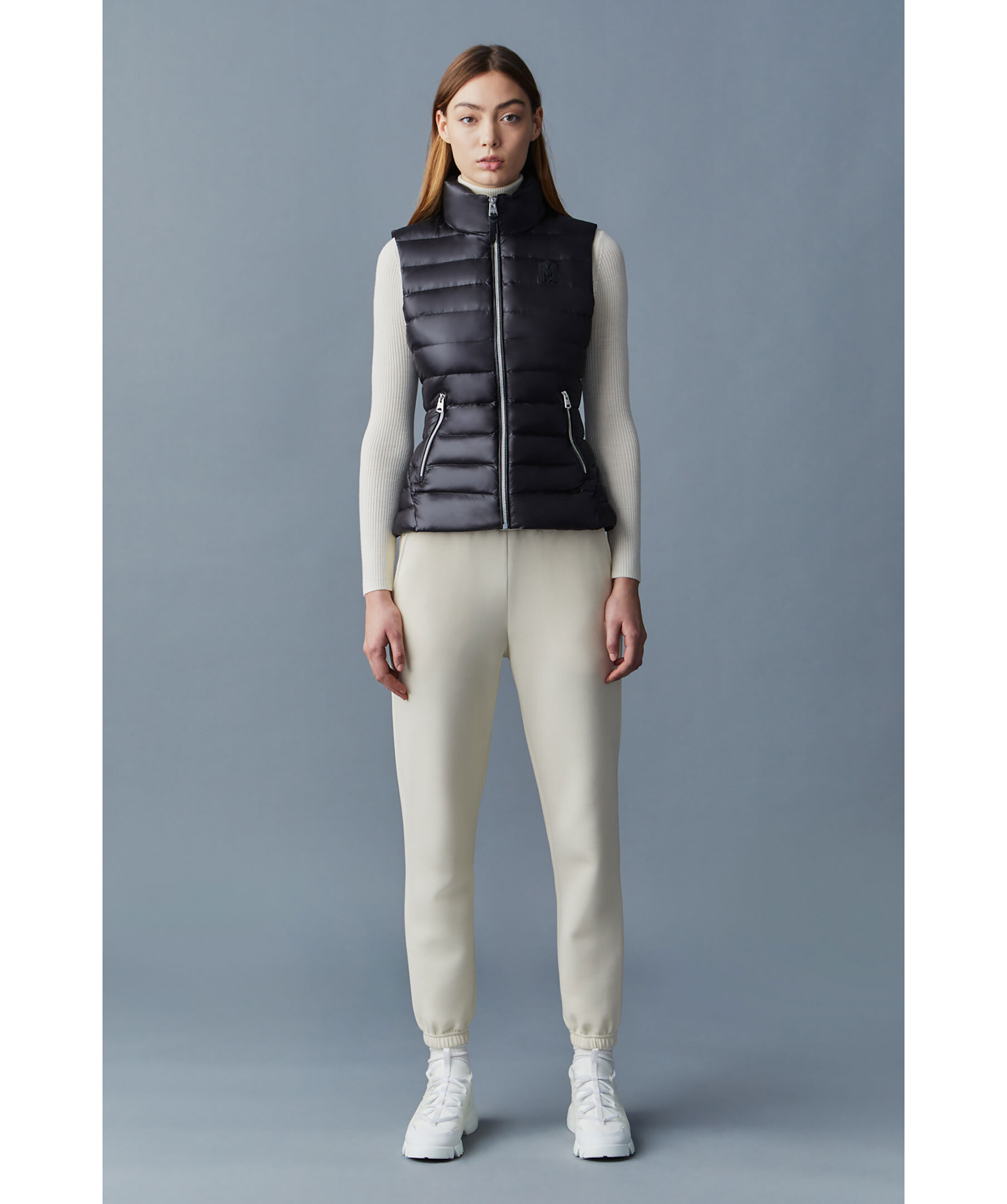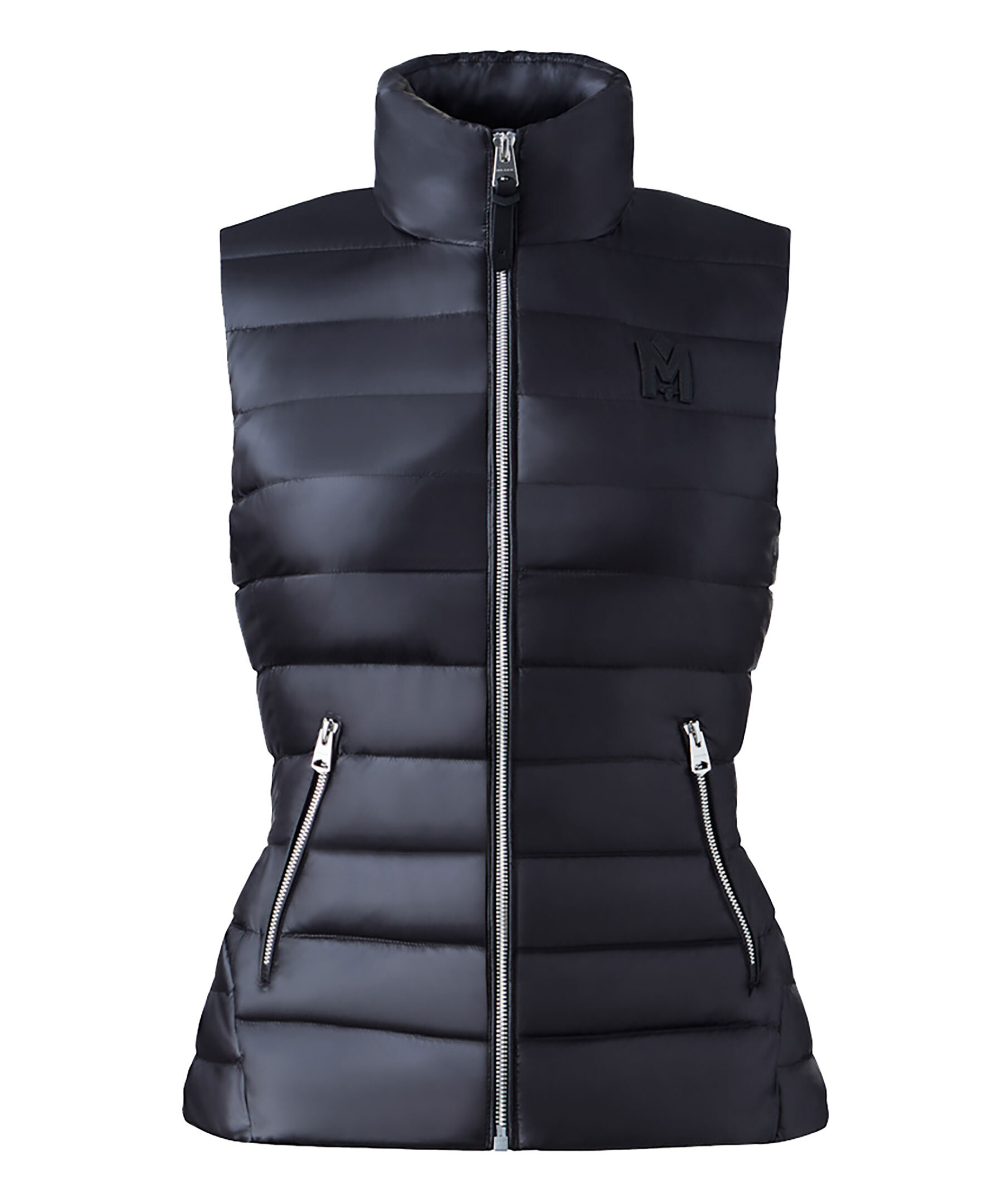 Svart, quiltad dunväst med smal passform och hög krage från Mackage. Från kragen kan man ta fram en tunn luva bakom tryckknappar. Stängs med dragkedja med läderslå fram och ett M i läder på bröstet. Framfickor med dragkedja och ficka på insidan med dragkedja.