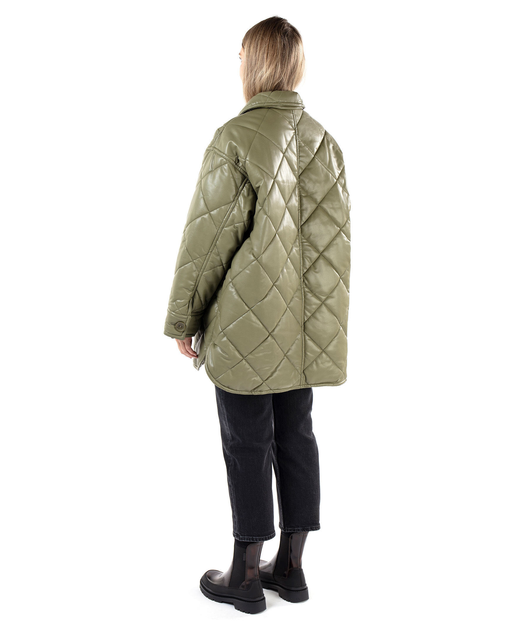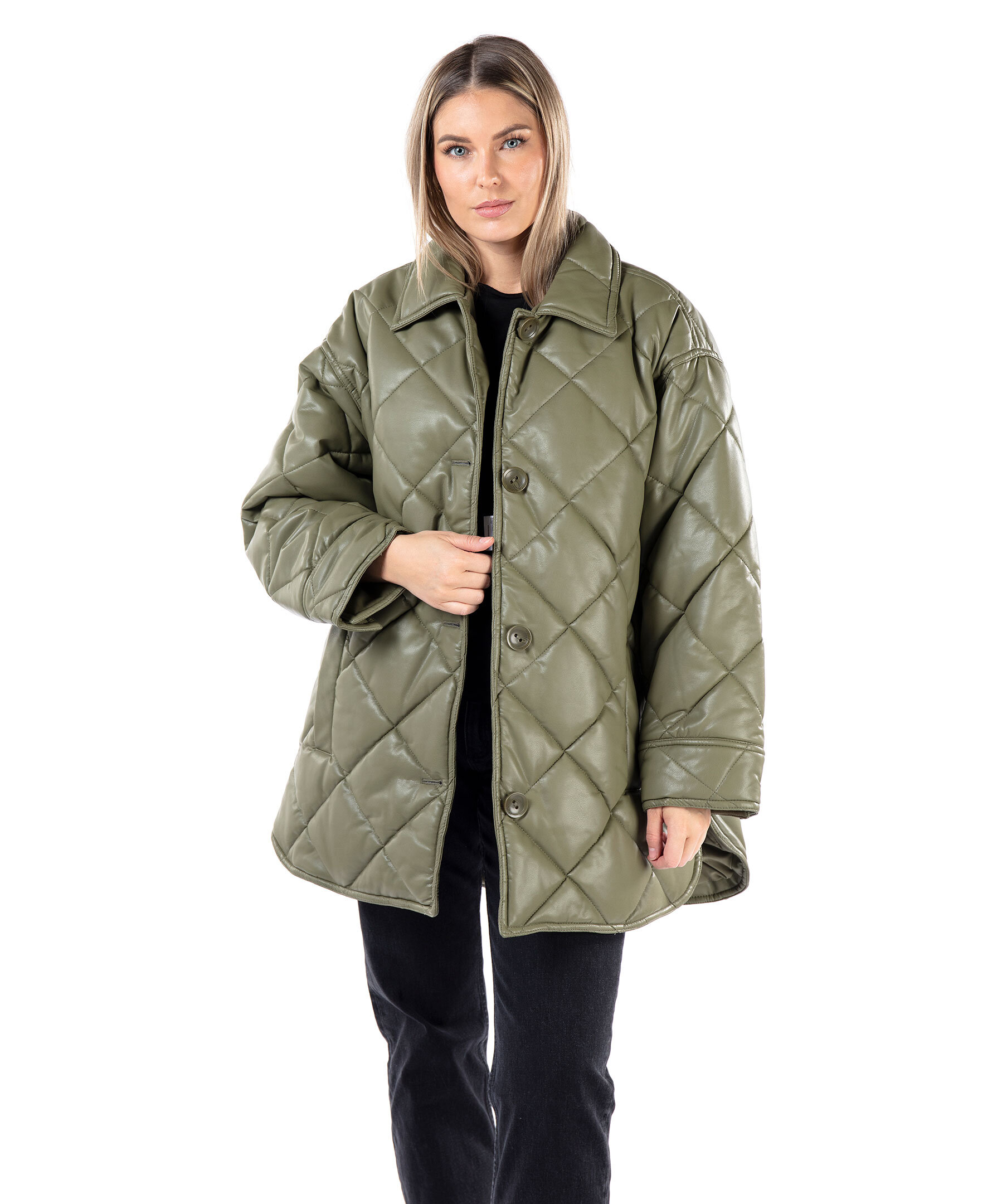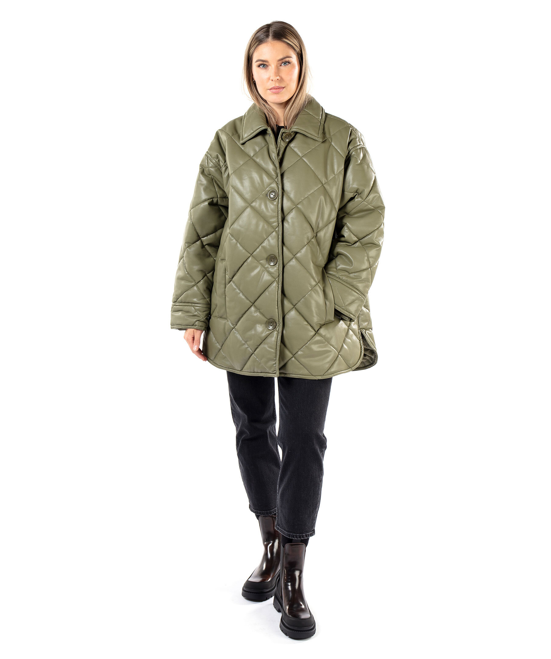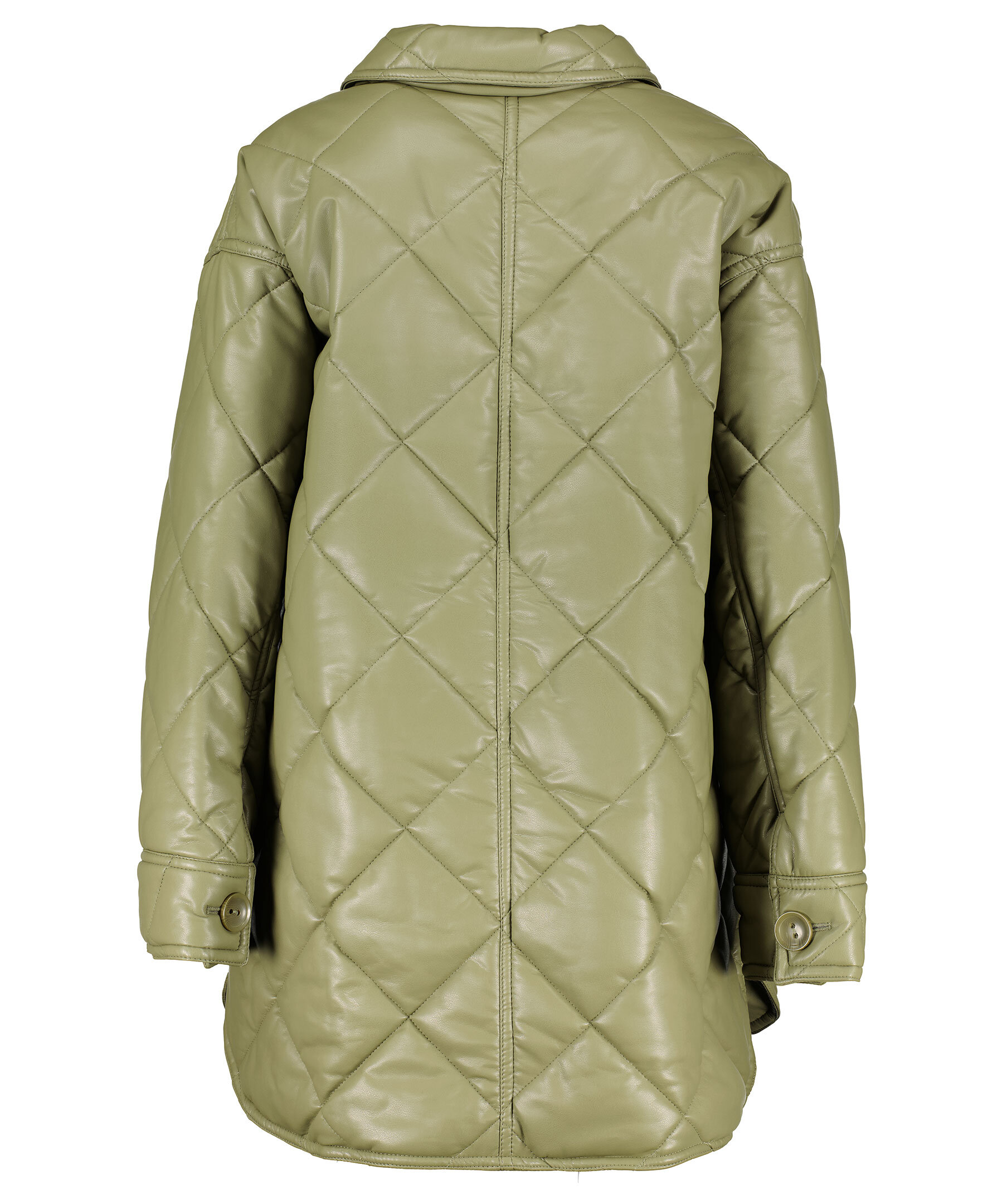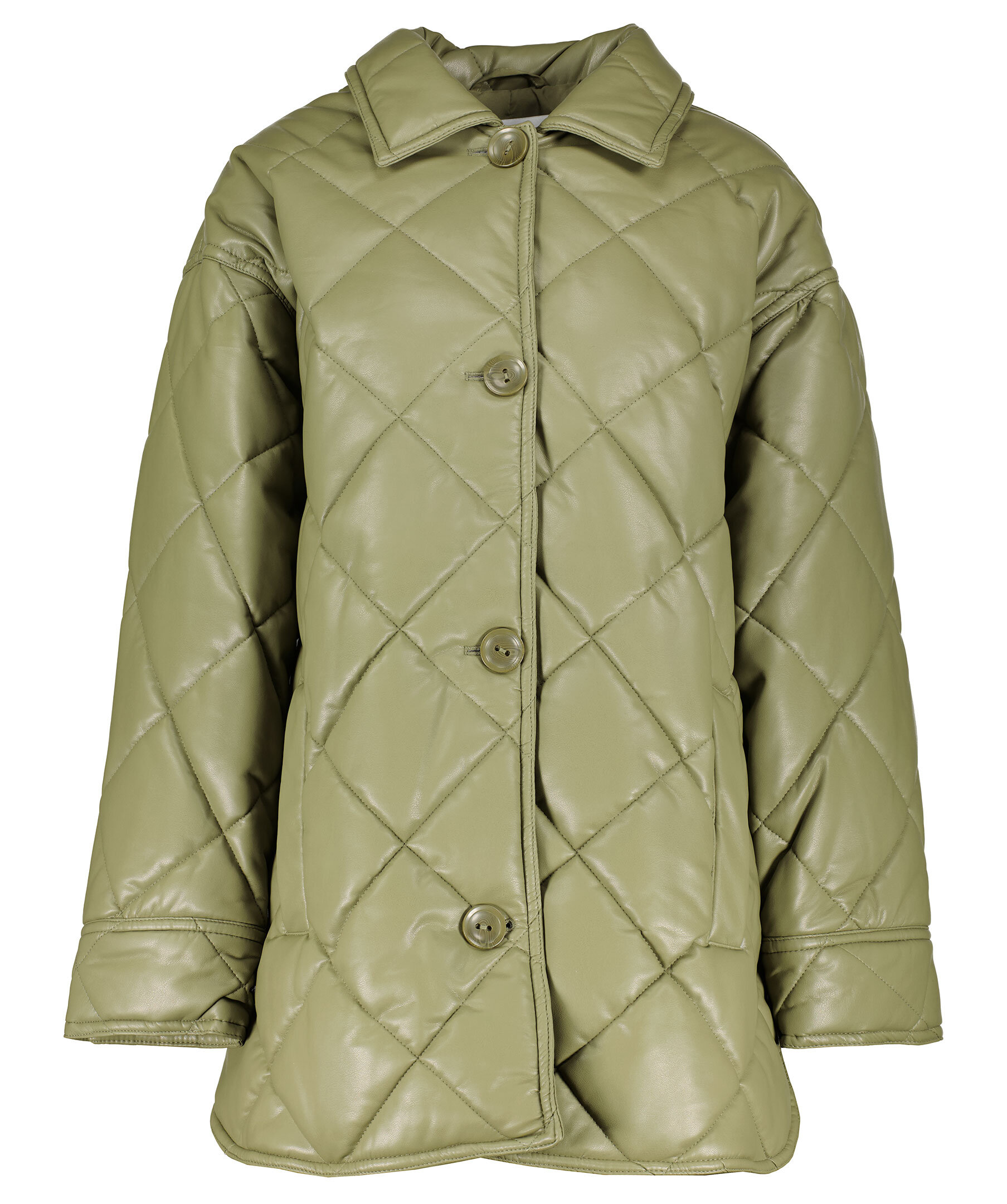 Grön quiltad jacka i konstläder från Stand Studio. Stängs framtill med knappar. Enkla manschetter. Två fickor i sidan som stängs med tryckknappar. Jackan har en oversized fit. Spetsig krage. Modellen är 175 cm lång och har på sig storlek S.