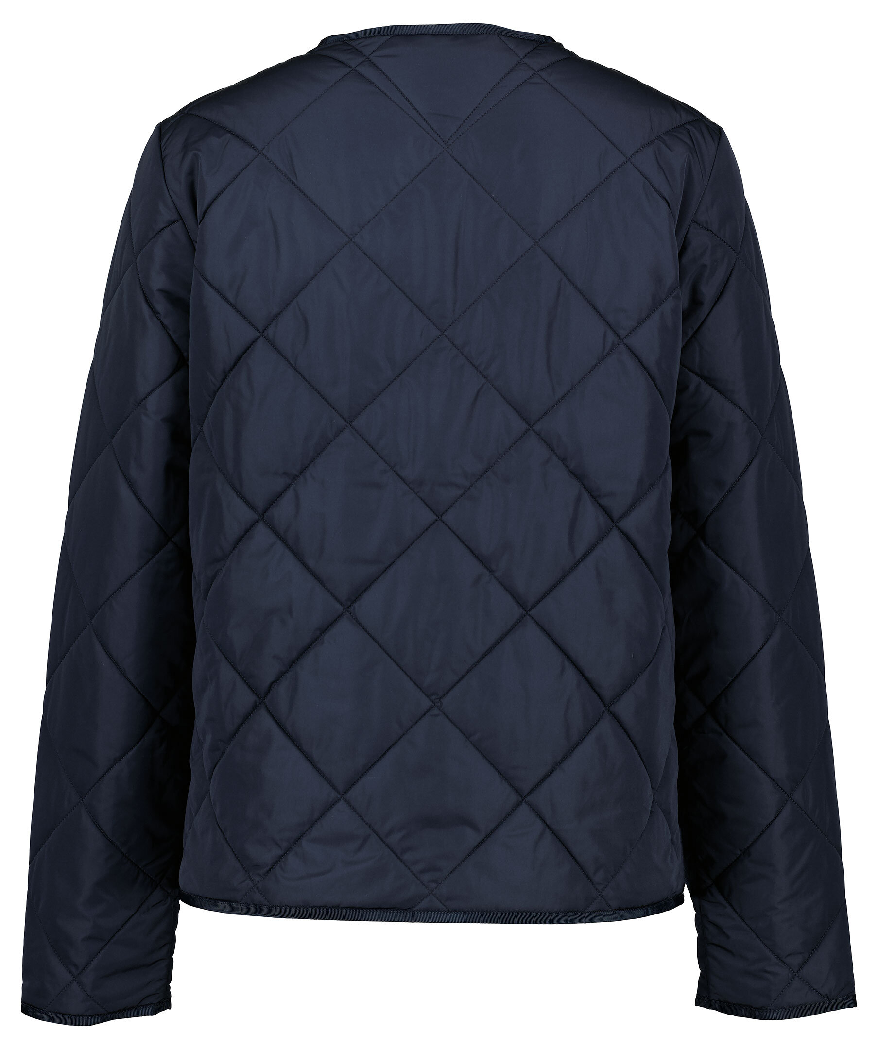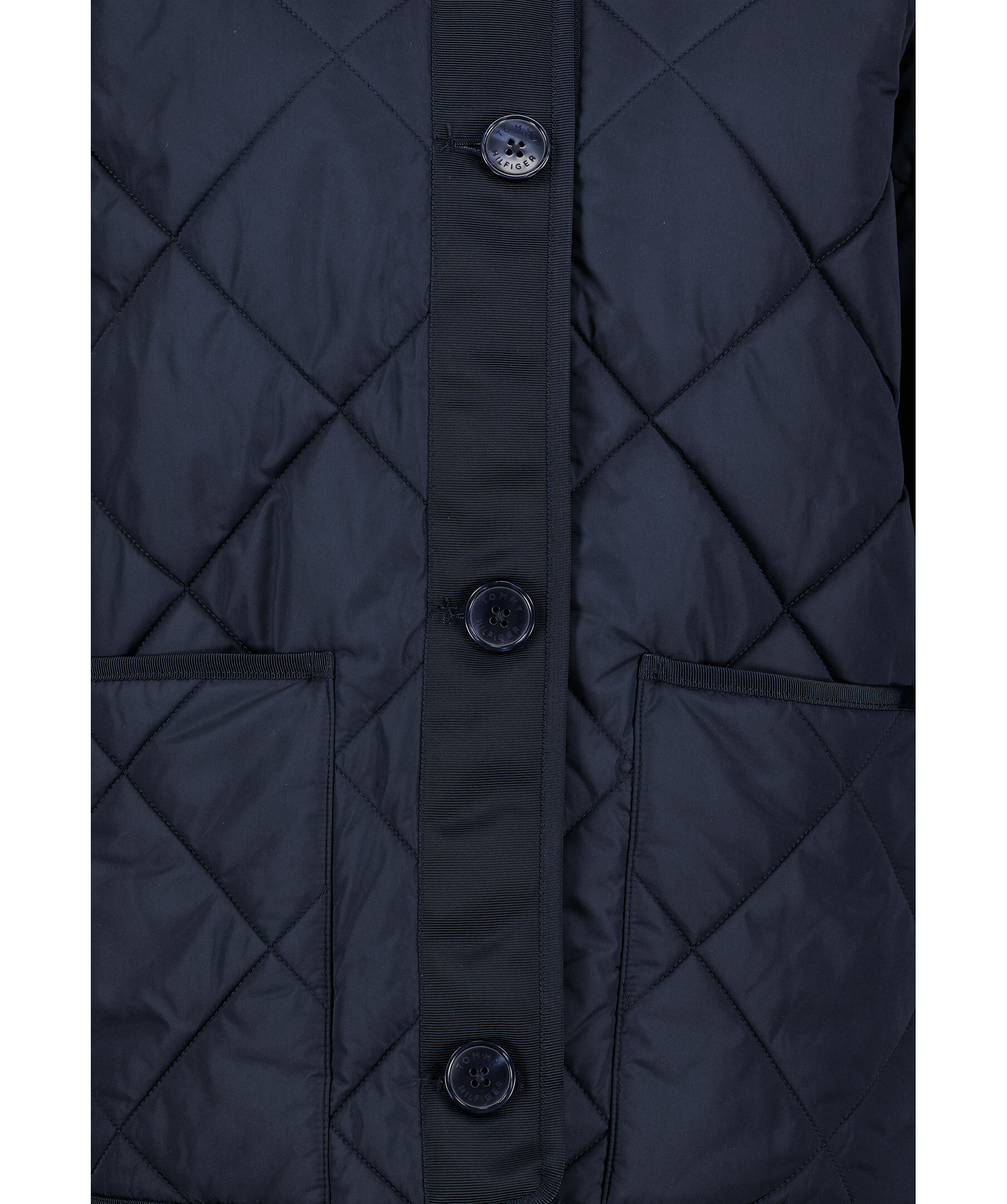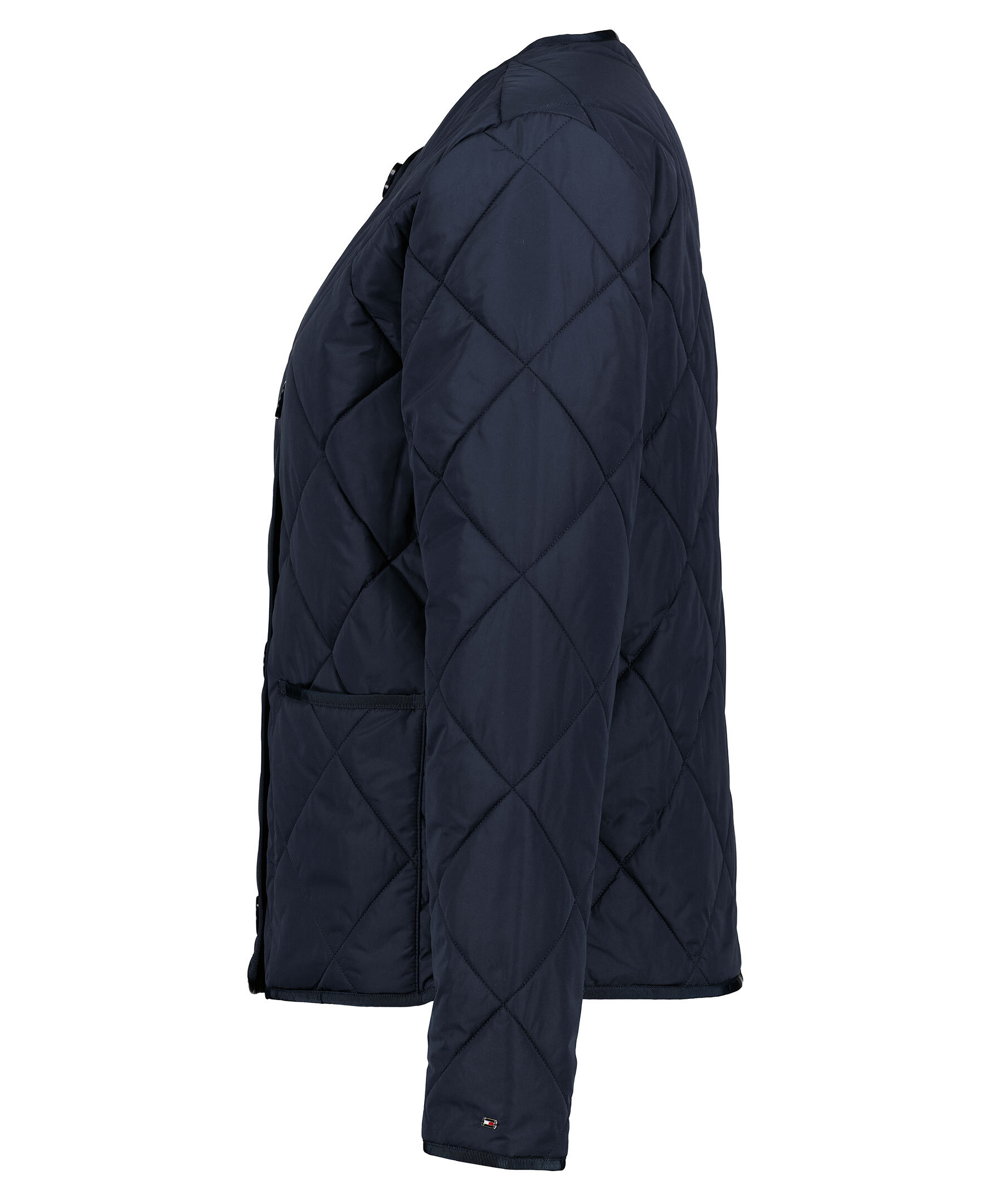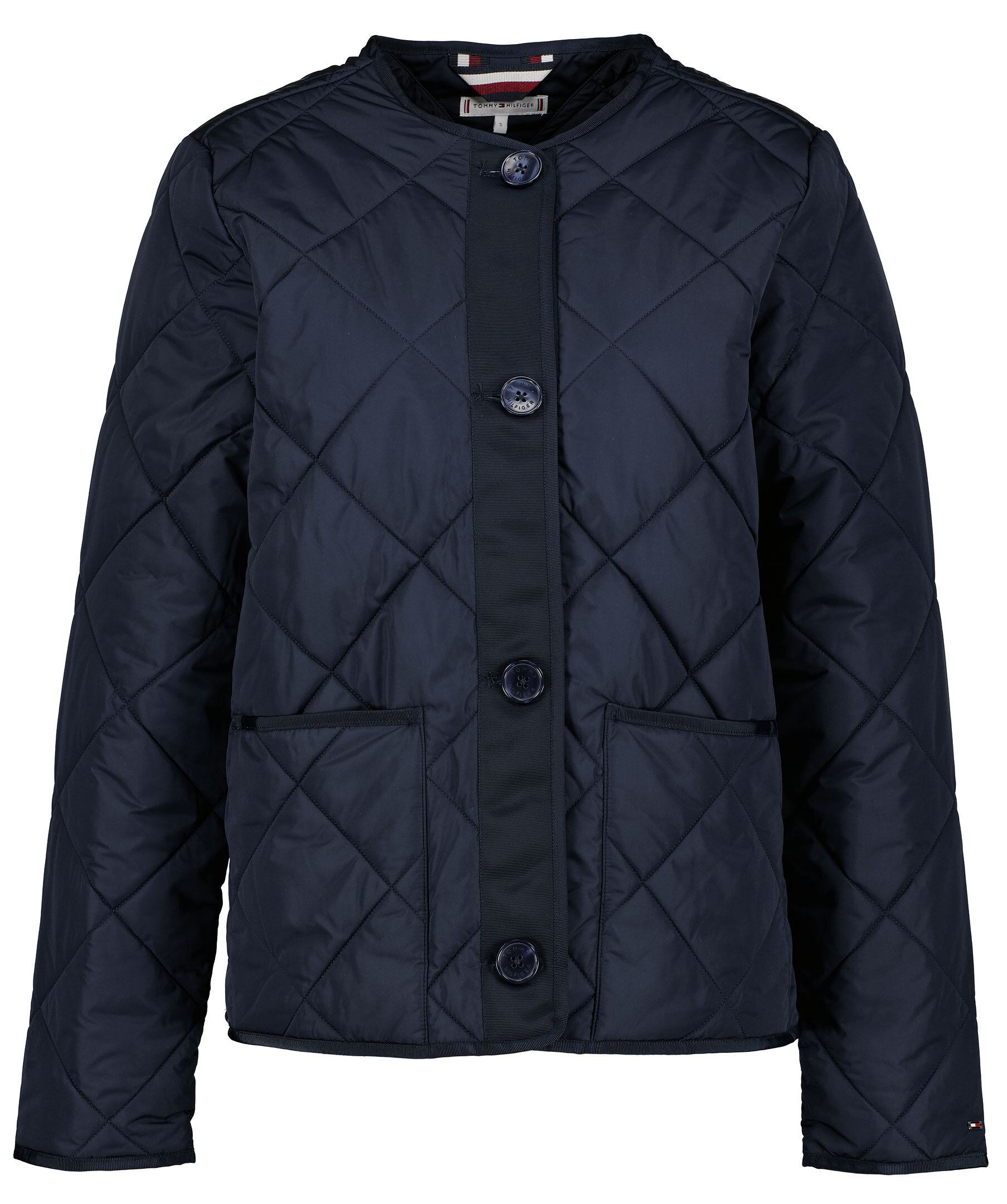 Marinblå, tunn quiltad jacka från Tommy Hilfiger. Jackan är kraglös och kan användas som en tunn innejacka eller som en sval jacka. Jackan stängs med knappar och har två framfickor. Liten Tommy-flagga i metall på vänster ärm. Quiltat mönster. Lätt fodrad med polyester.