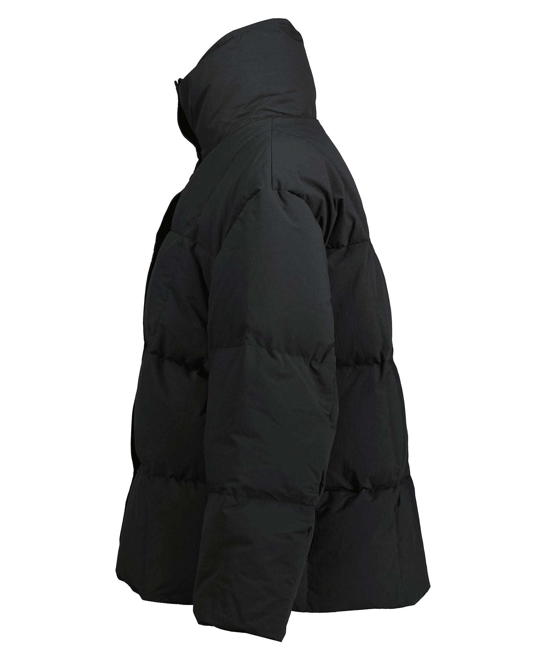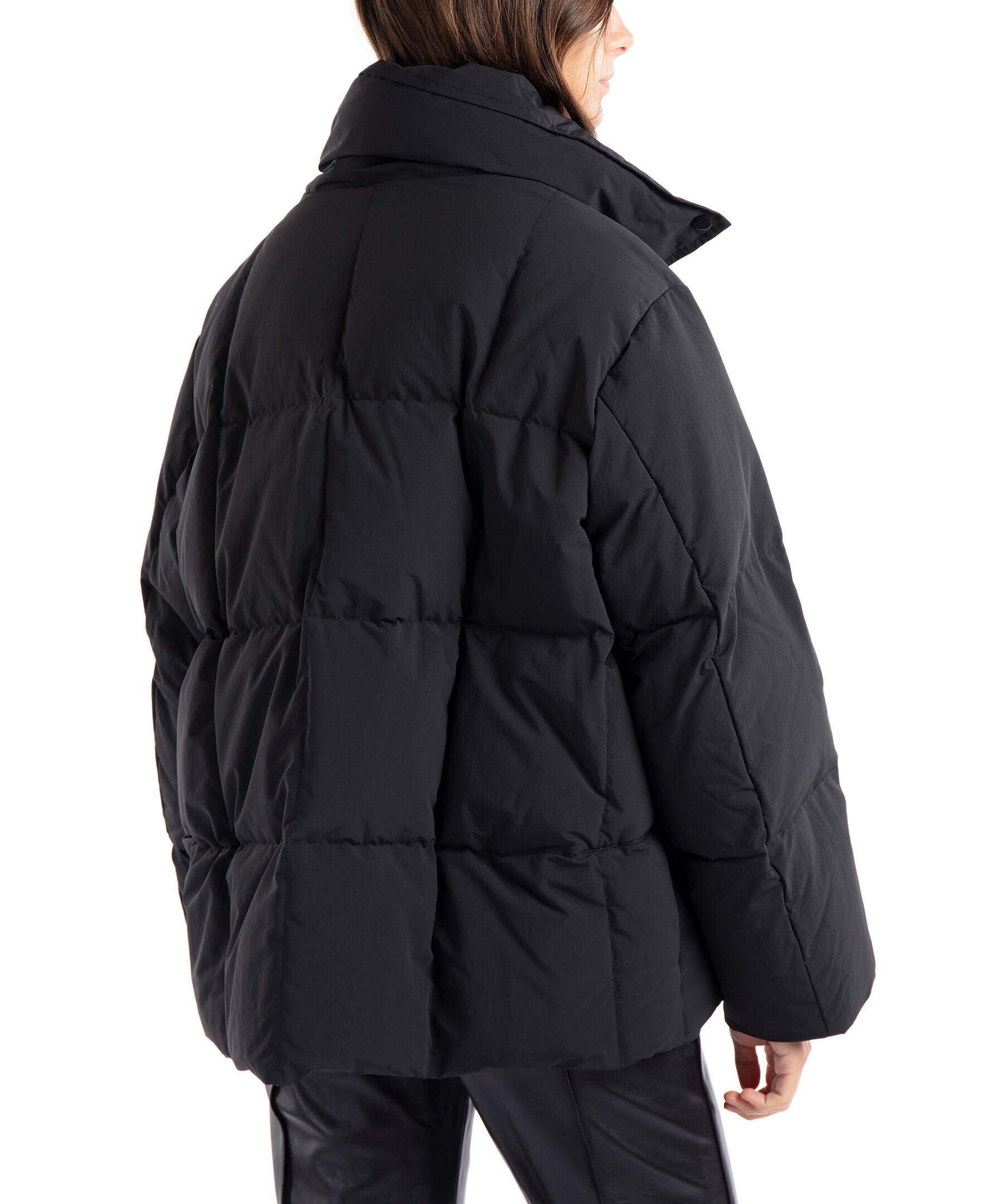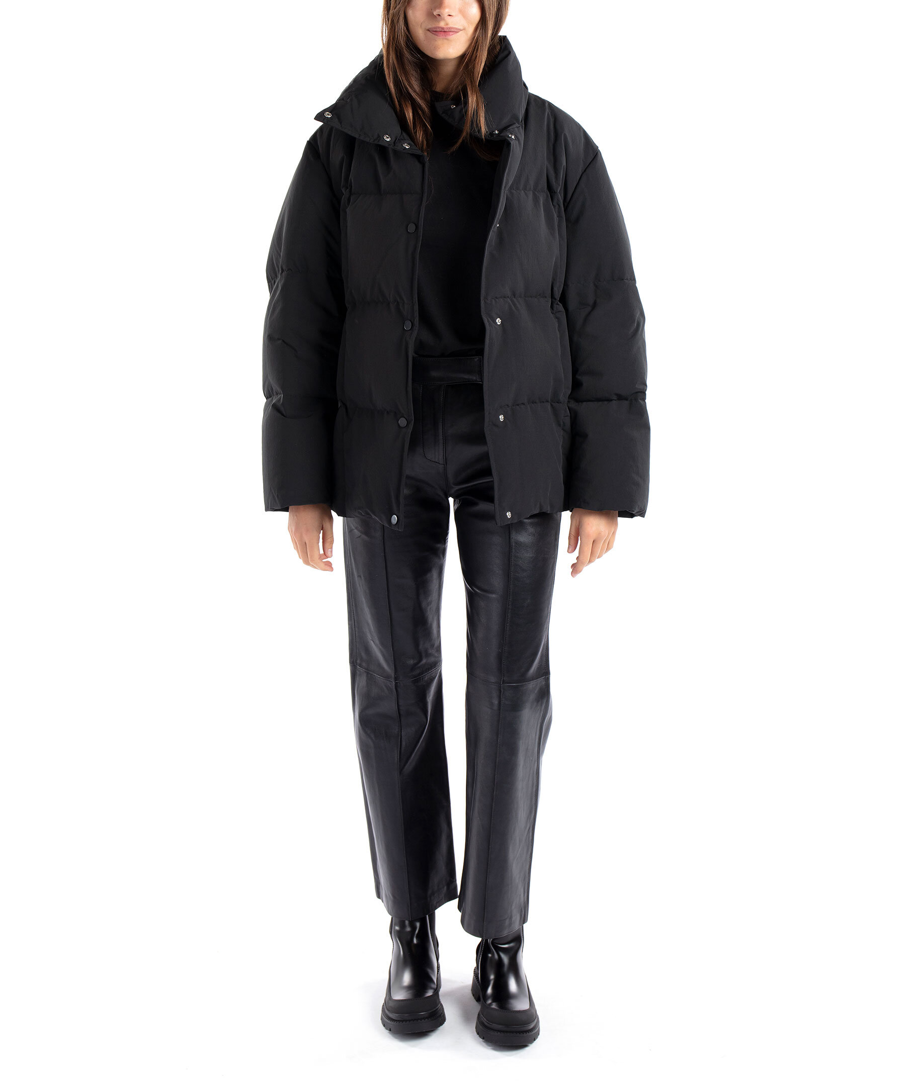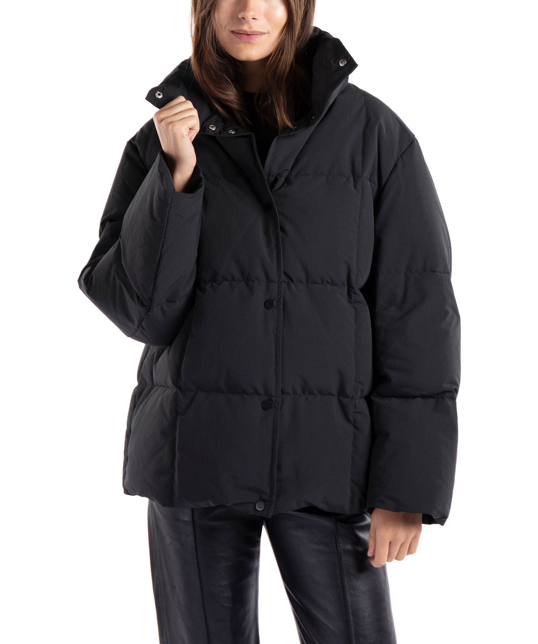 Svart Pufferjacka från Stand Studio. Tillverakd i ett vattenavstötande tyg. Jackan har en oversized fit och hög krage. Två fickor i sidorna som stängs med tryckknappar. Modellen är 178cm lång och har på sig storlek 36.