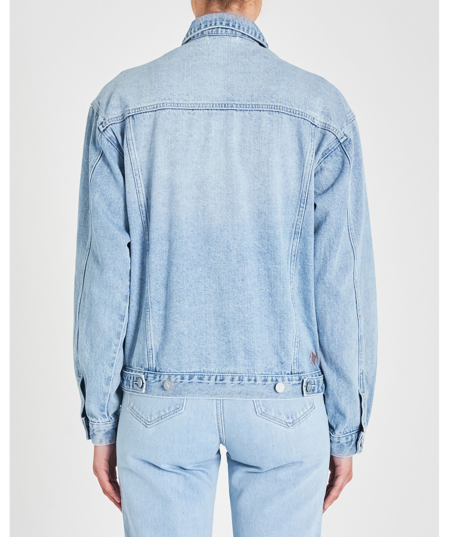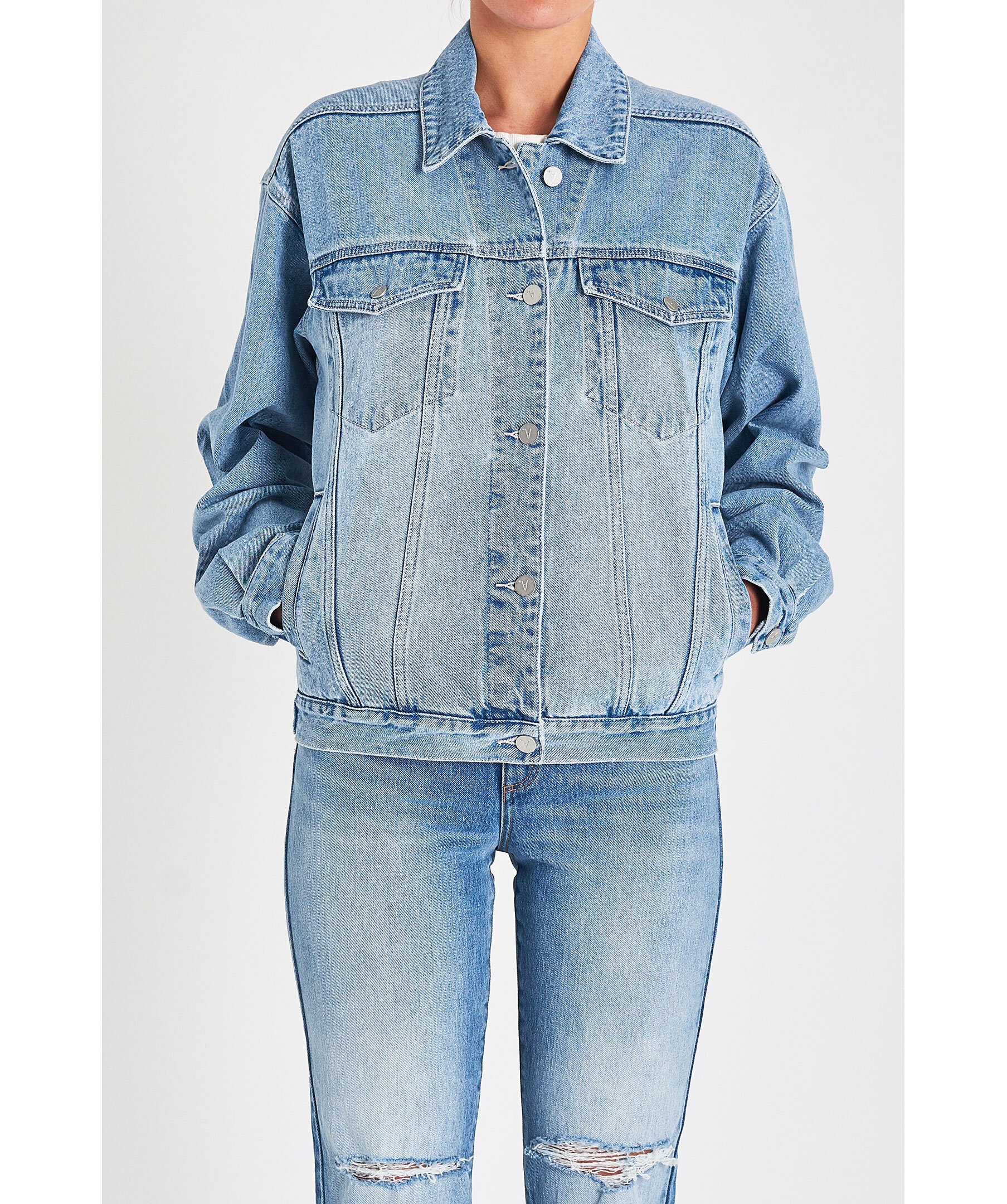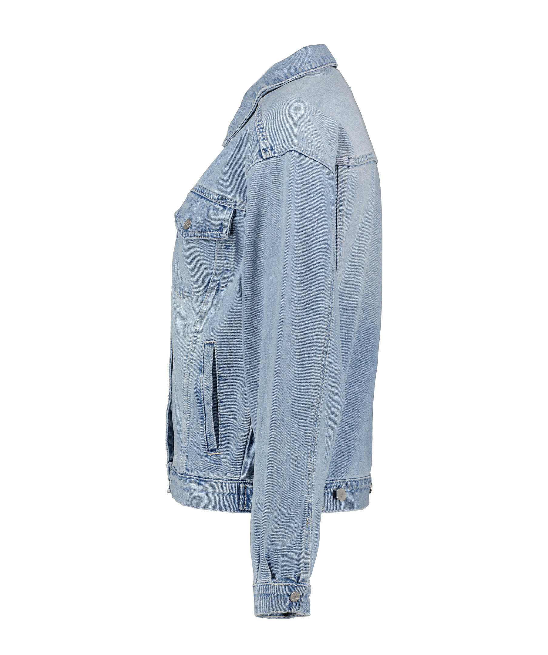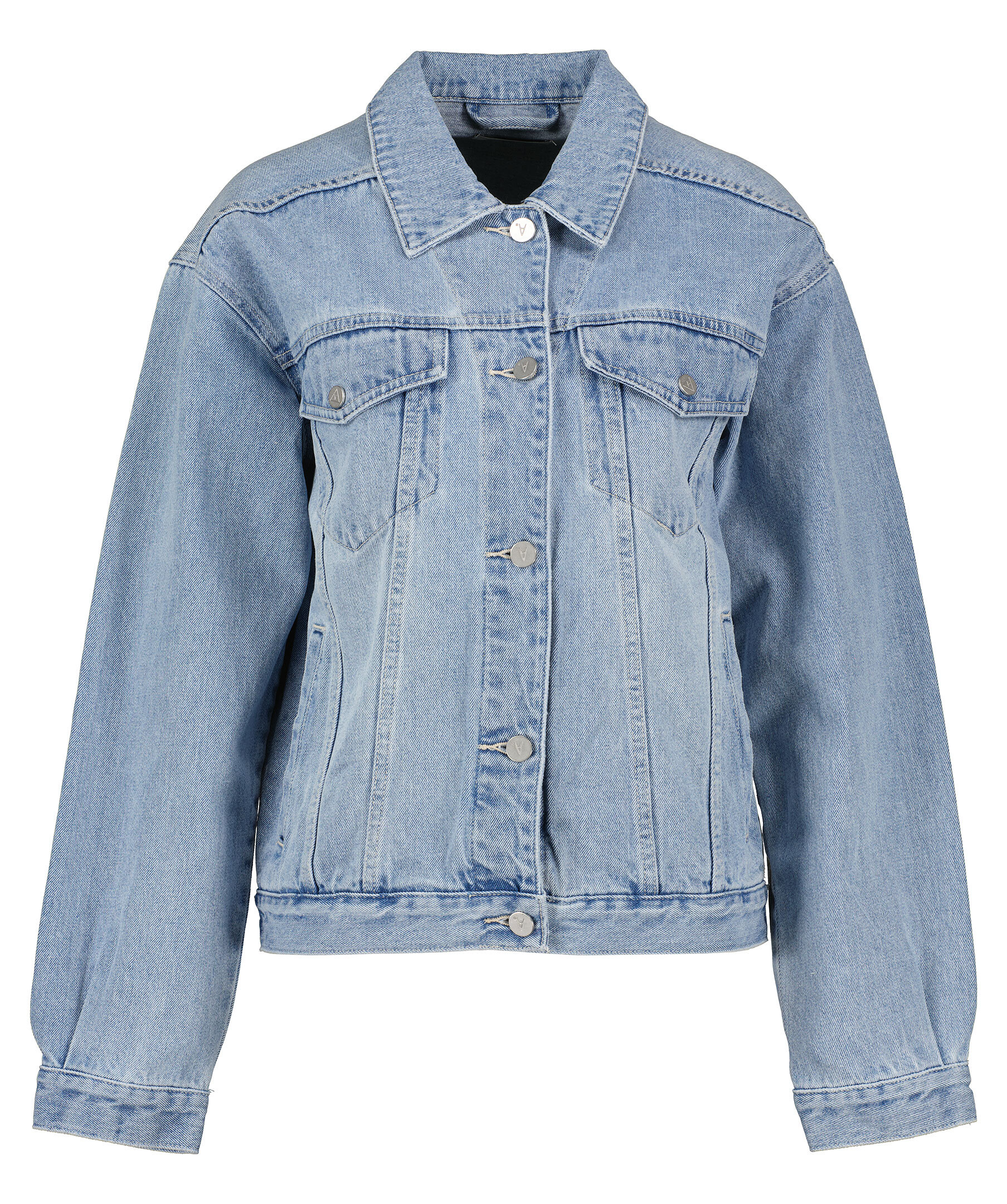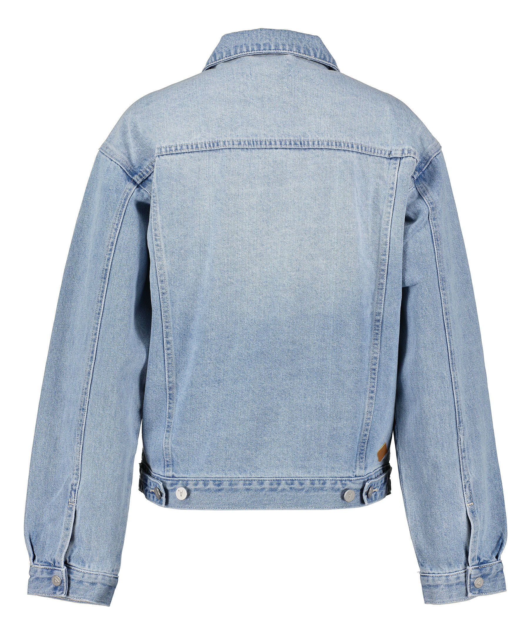 Blå oversized jeansjacka från Abrand. Stängs framtill med knappar. Två fickor framtill, två bröstfickor med lock som stängs med knapp. Justerbar vid jackslut. Liten patch i läder med logotyp på höger sida av jackan.