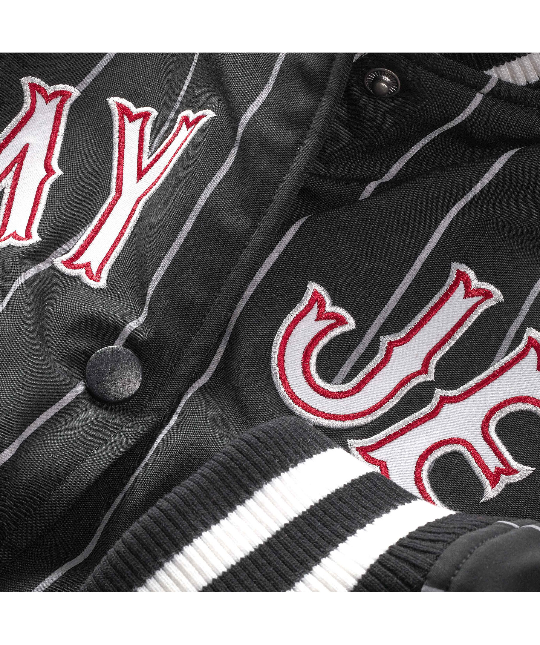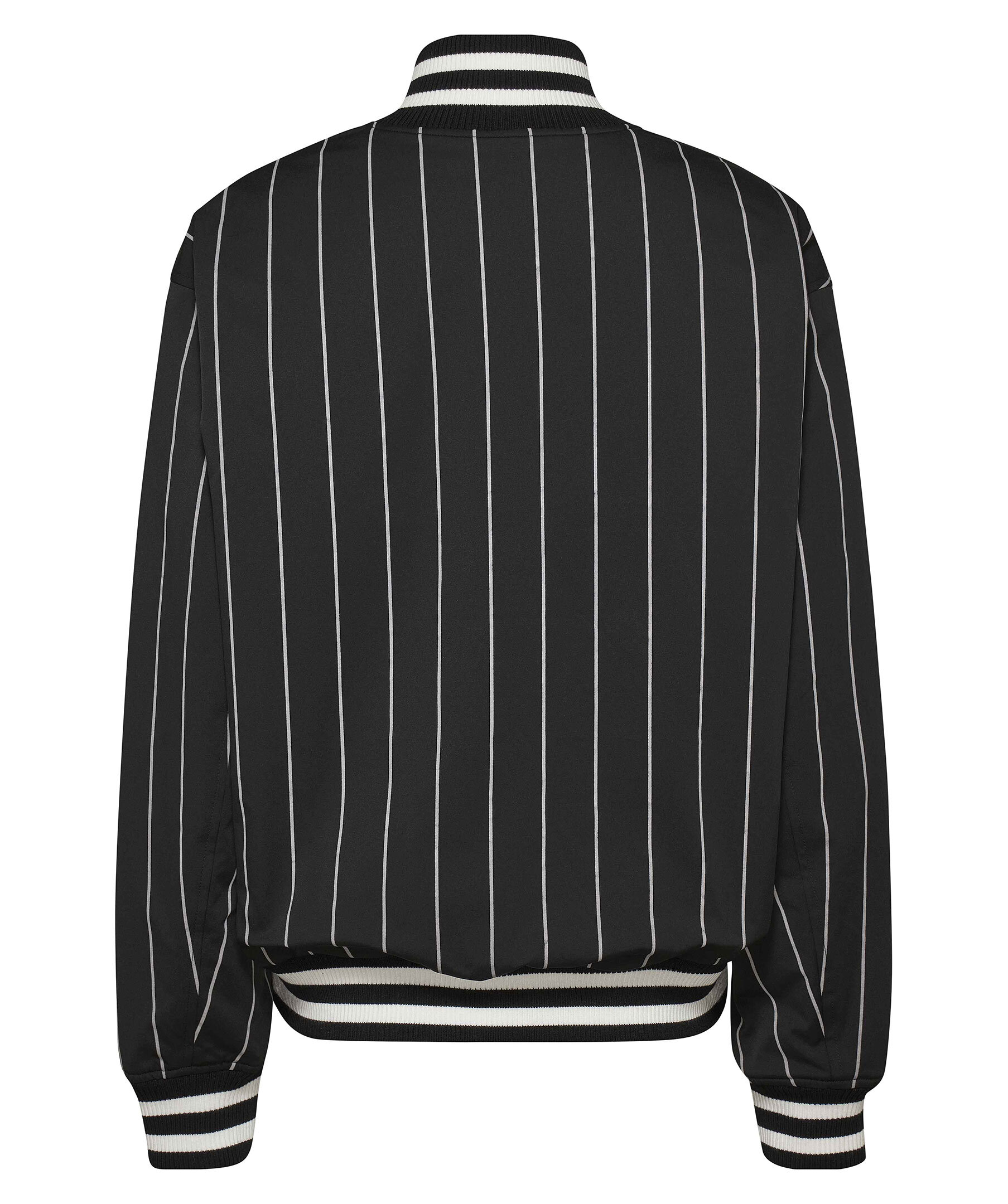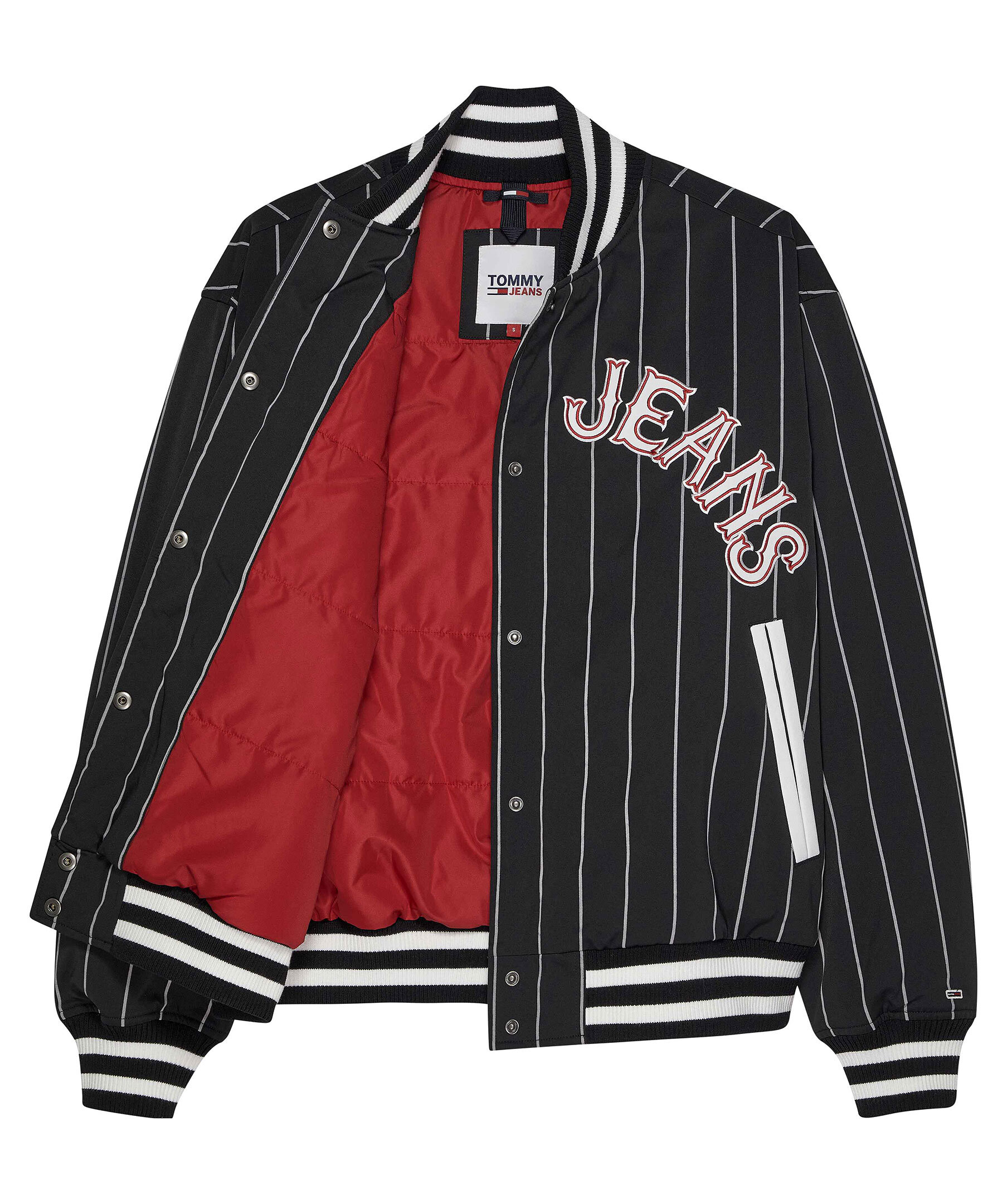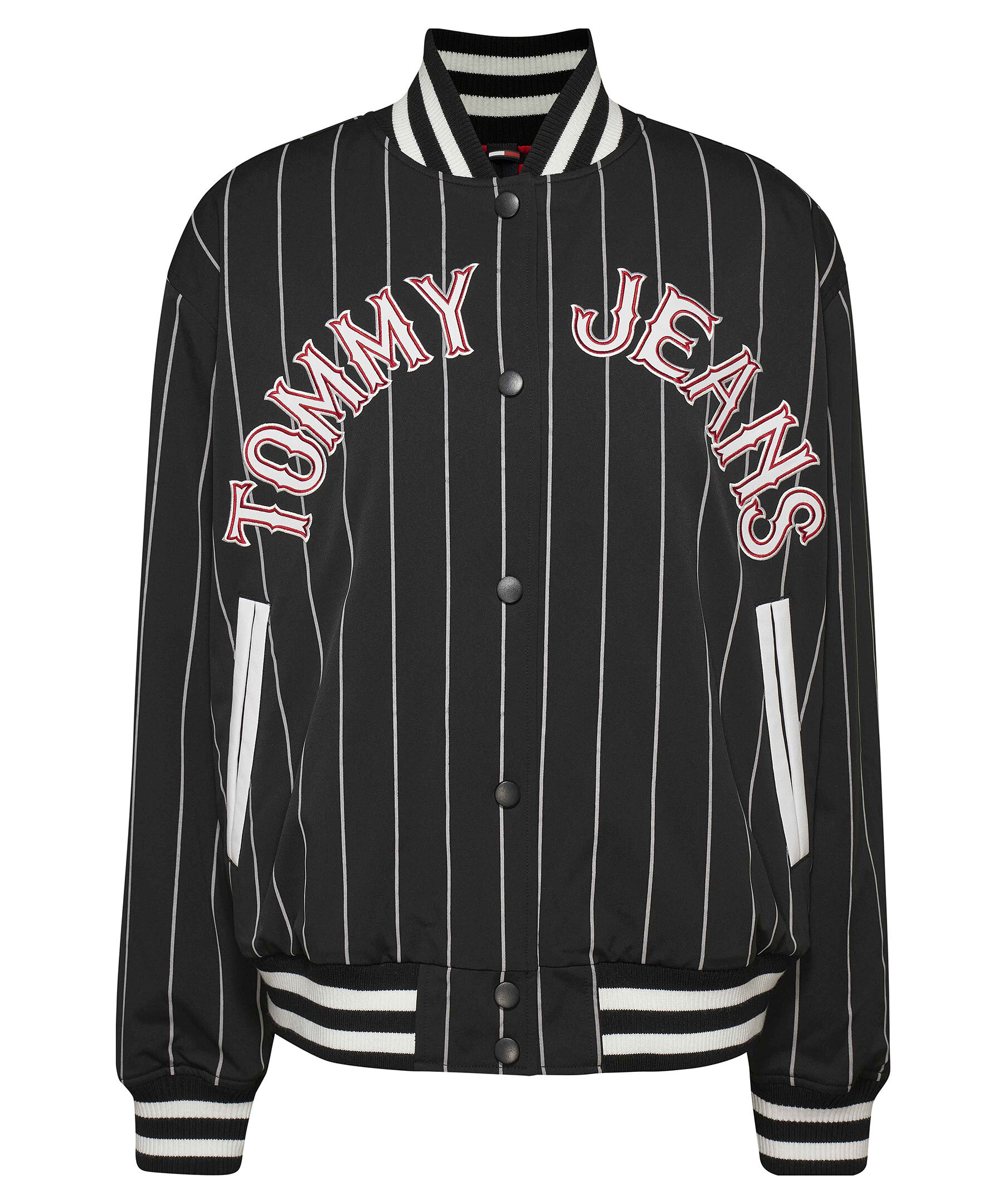 Svart varsity jacka med tunna vita ränder från Tommy Jeans. Stängs framtill med tryckknappar. Två snedställda fickor framtill. Svart och vit randiga ribbstickade muddar vid ärm- och plaggslut. Texten "Tommy Jeans" broderad över bröstet fram. Droppade axlar och oversized passform.