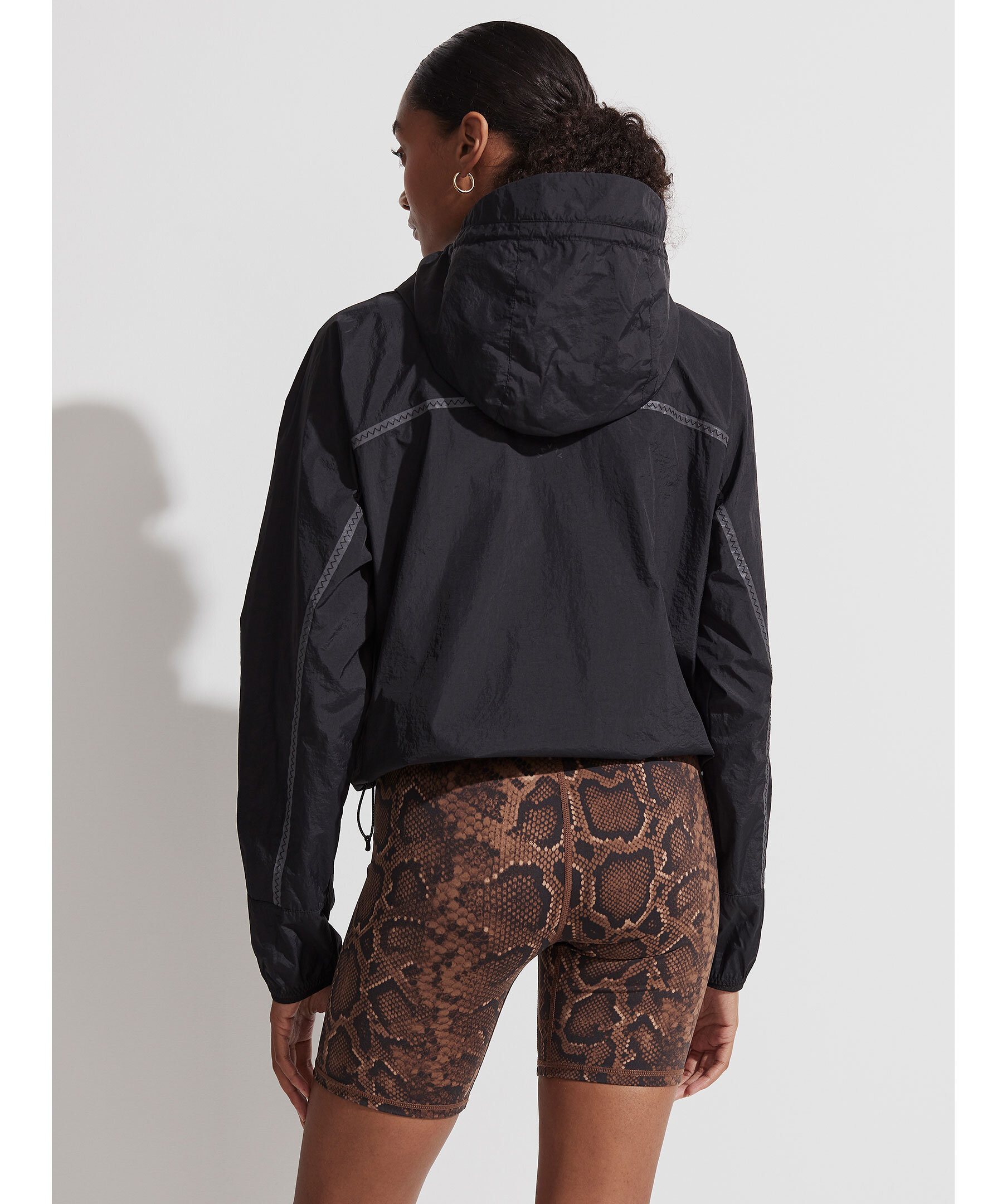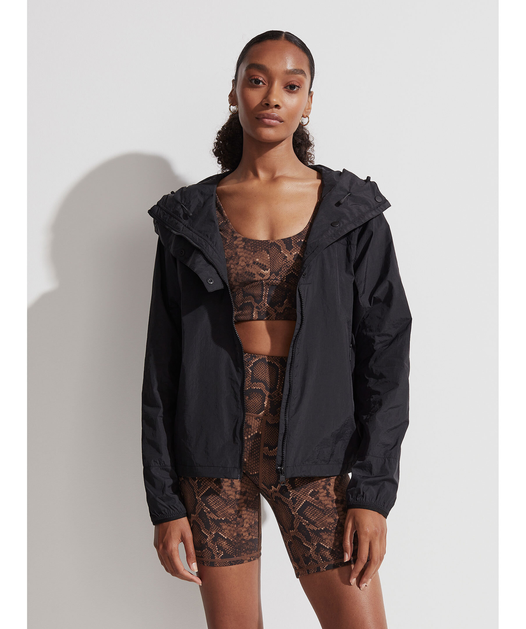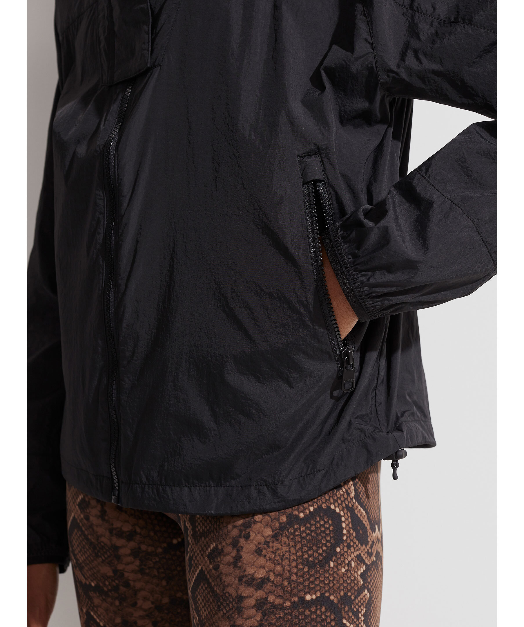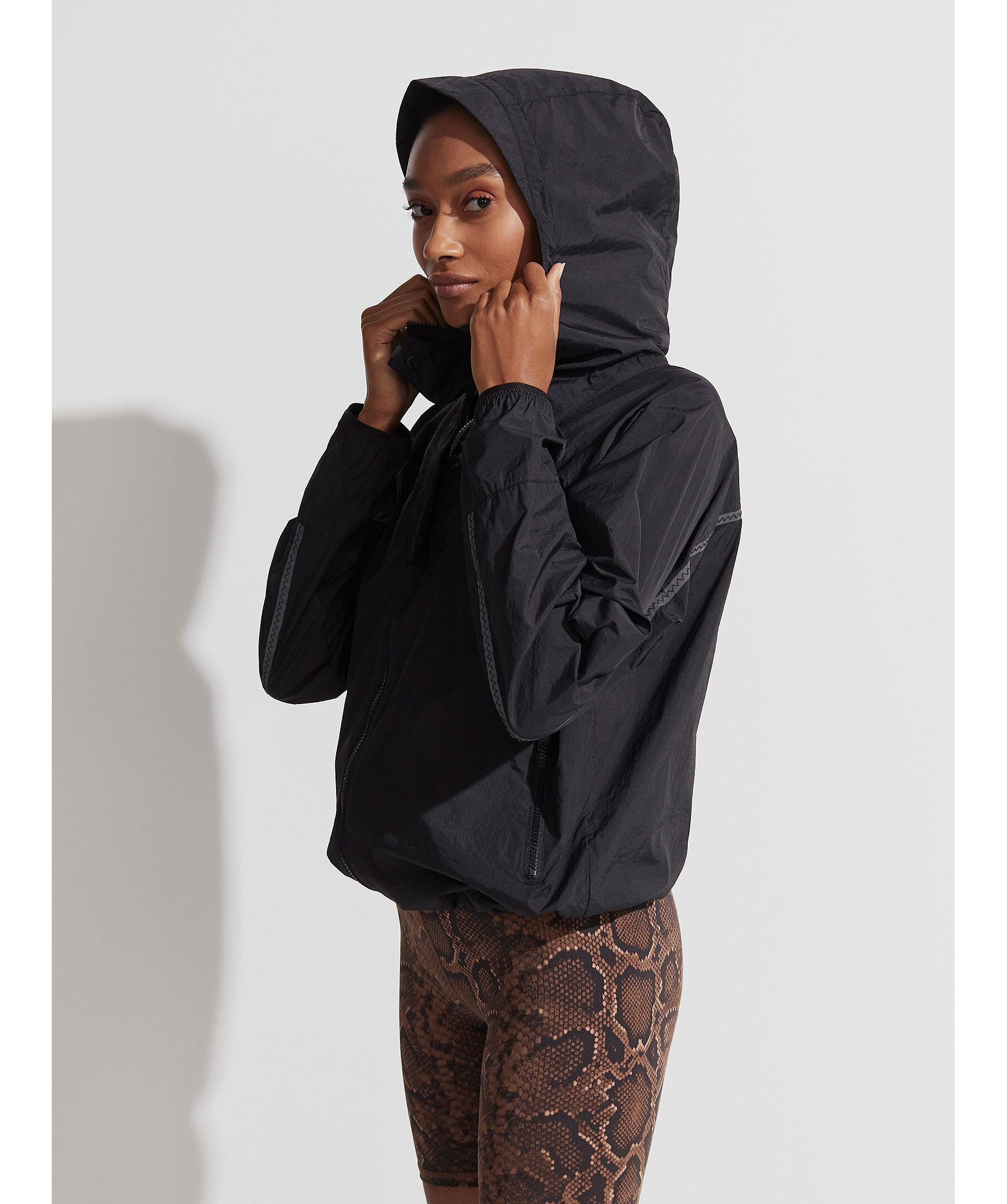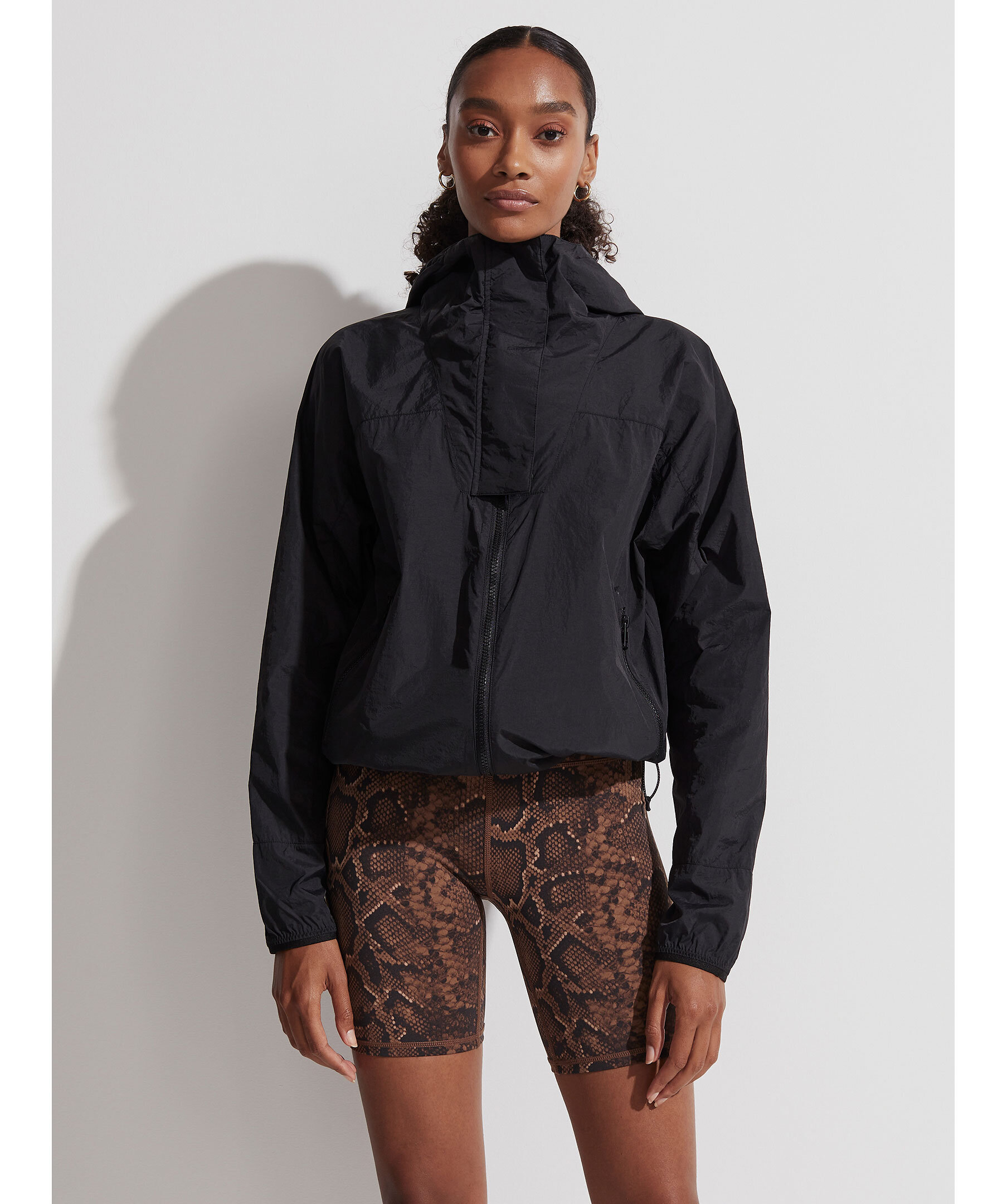 Svart vindjacka med en avslappnad och lätt siluett från Varley. Ger dig skydd mot väder och vind. Tillverkad i ett lager nylon som gör den väldigt lätt. Stängs med dragkejda fram, har två fickor med dragkedja i sidorna och en hög krage med luva. Dragsko i plaggslut och luva, tre tryckknappar längst upp över dragkedjan fram samt en lång söm med reflex bak på ryggen med en logotyp över.