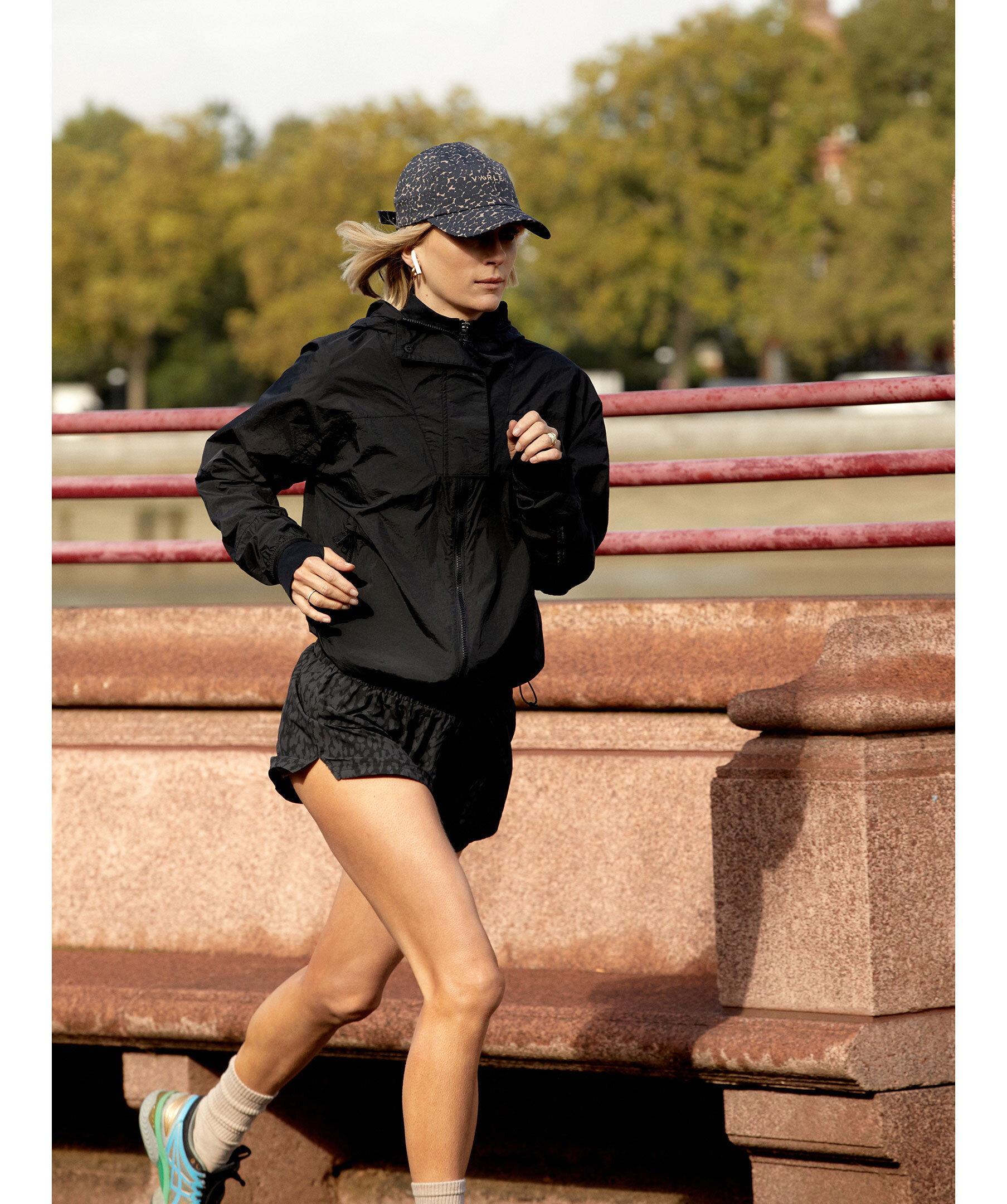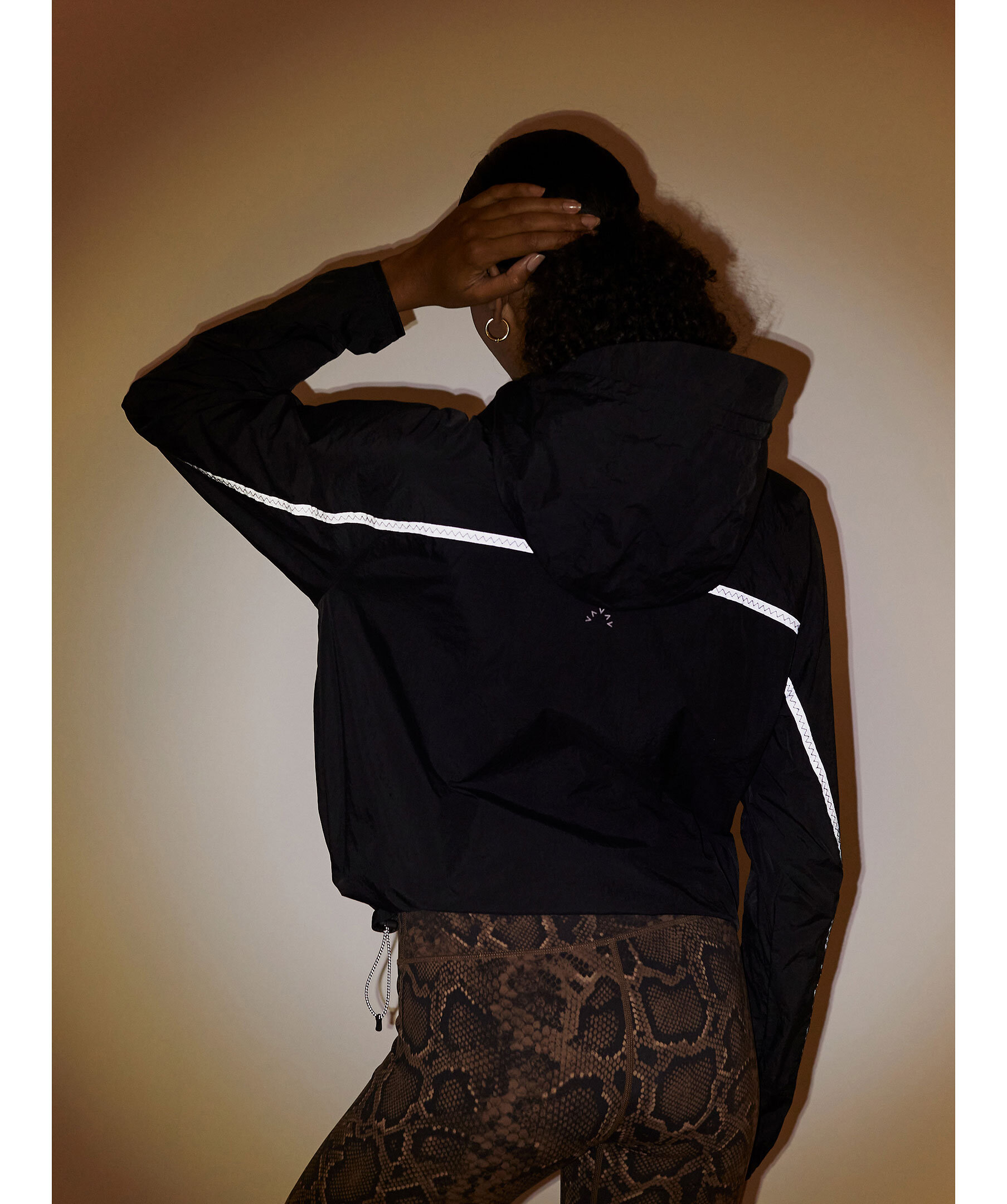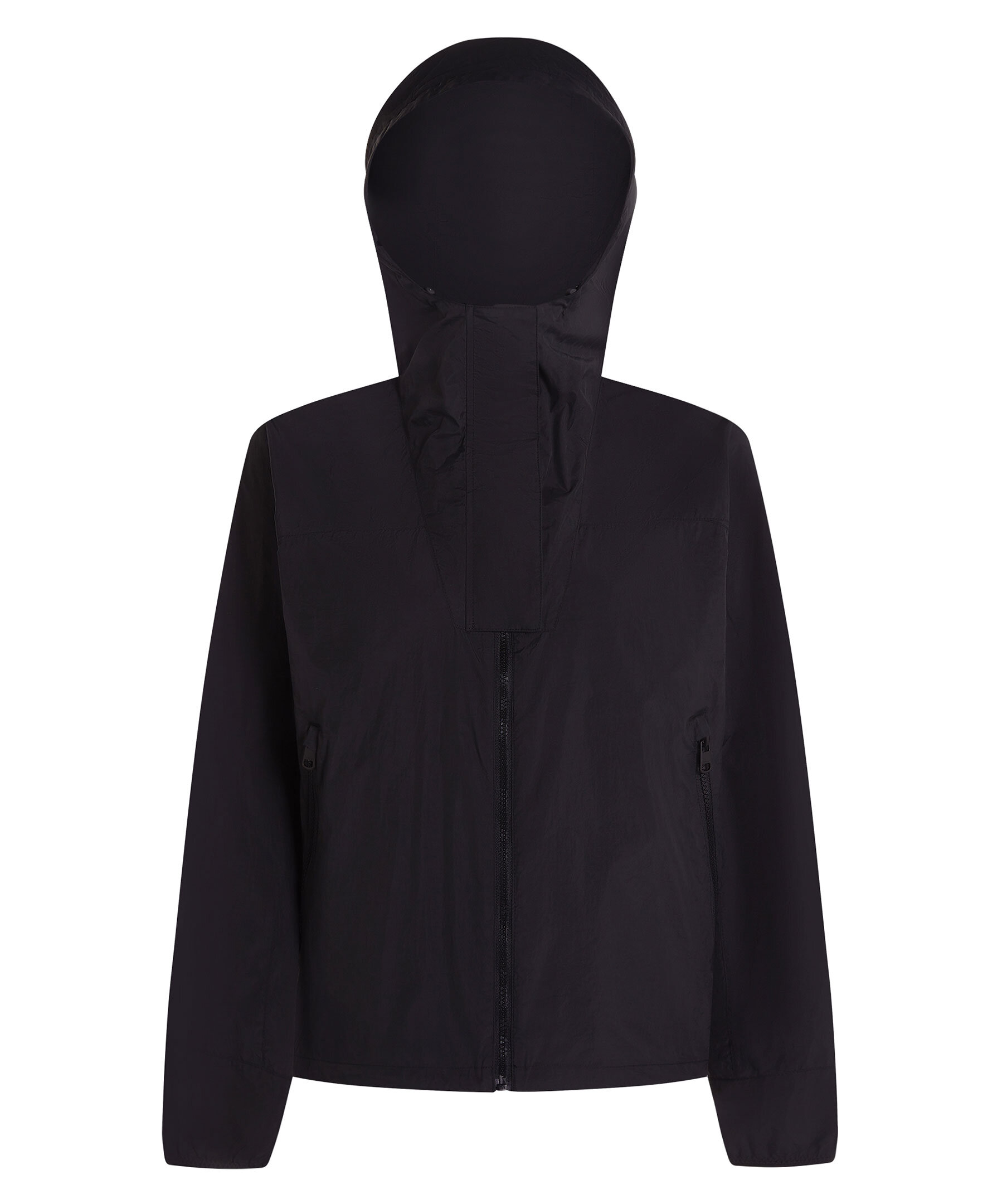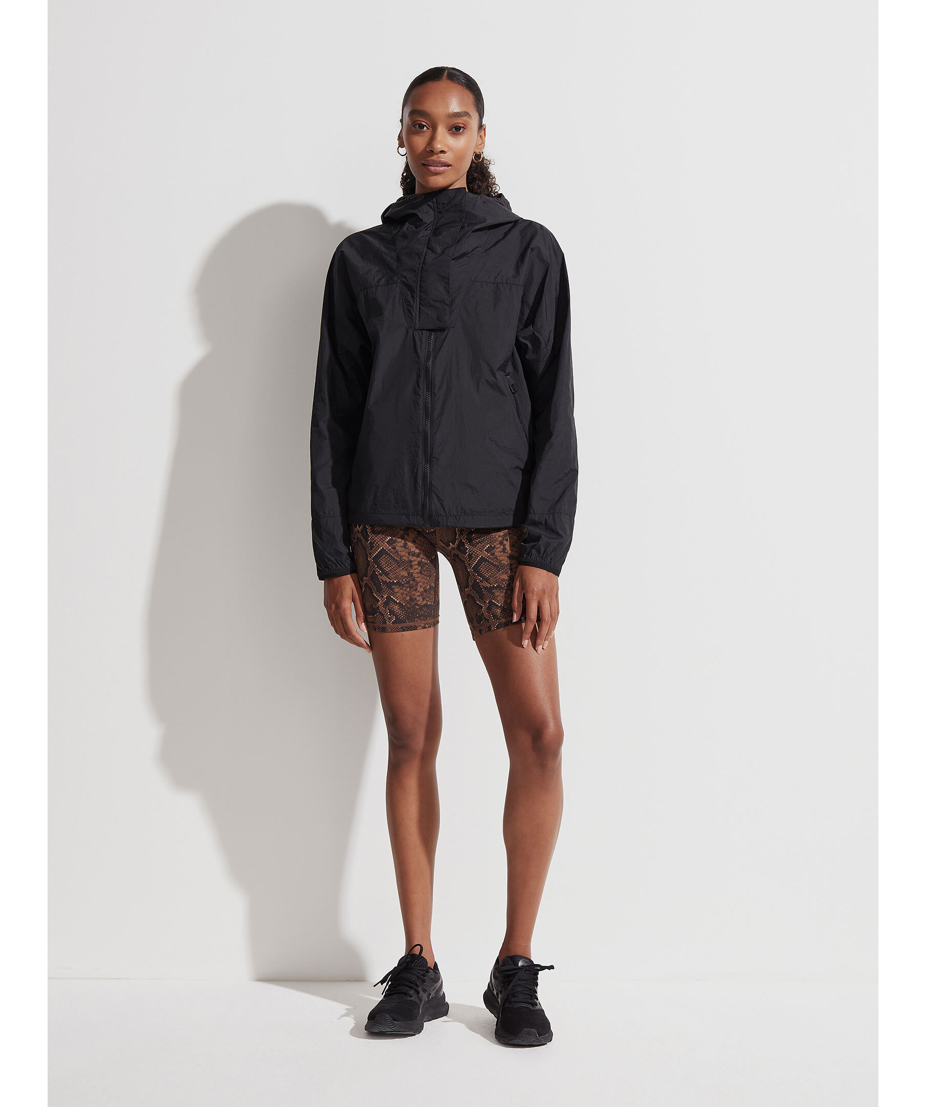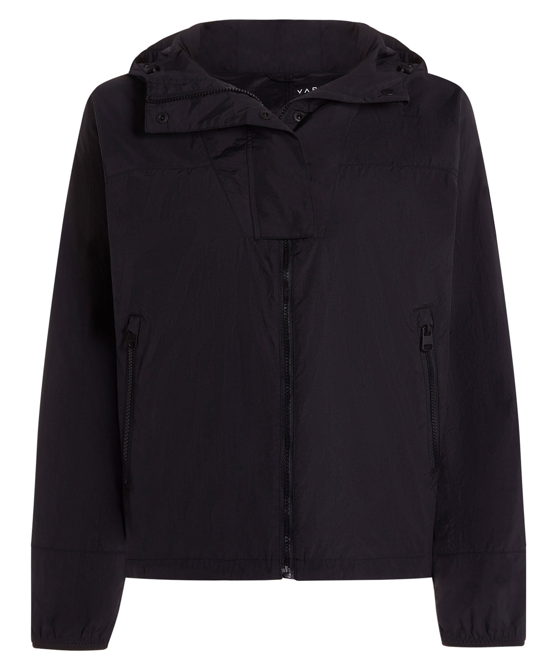 Svart vindjacka med en avslappnad och lätt siluett från Varley. Ger dig skydd mot väder och vind. Tillverkad i ett lager nylon som gör den väldigt lätt. Stängs med dragkejda fram, har två fickor med dragkedja i sidorna och en hög krage med luva. Dragsko i plaggslut och luva, tre tryckknappar längst upp över dragkedjan fram samt en lång söm med reflex bak på ryggen med en logotyp över.