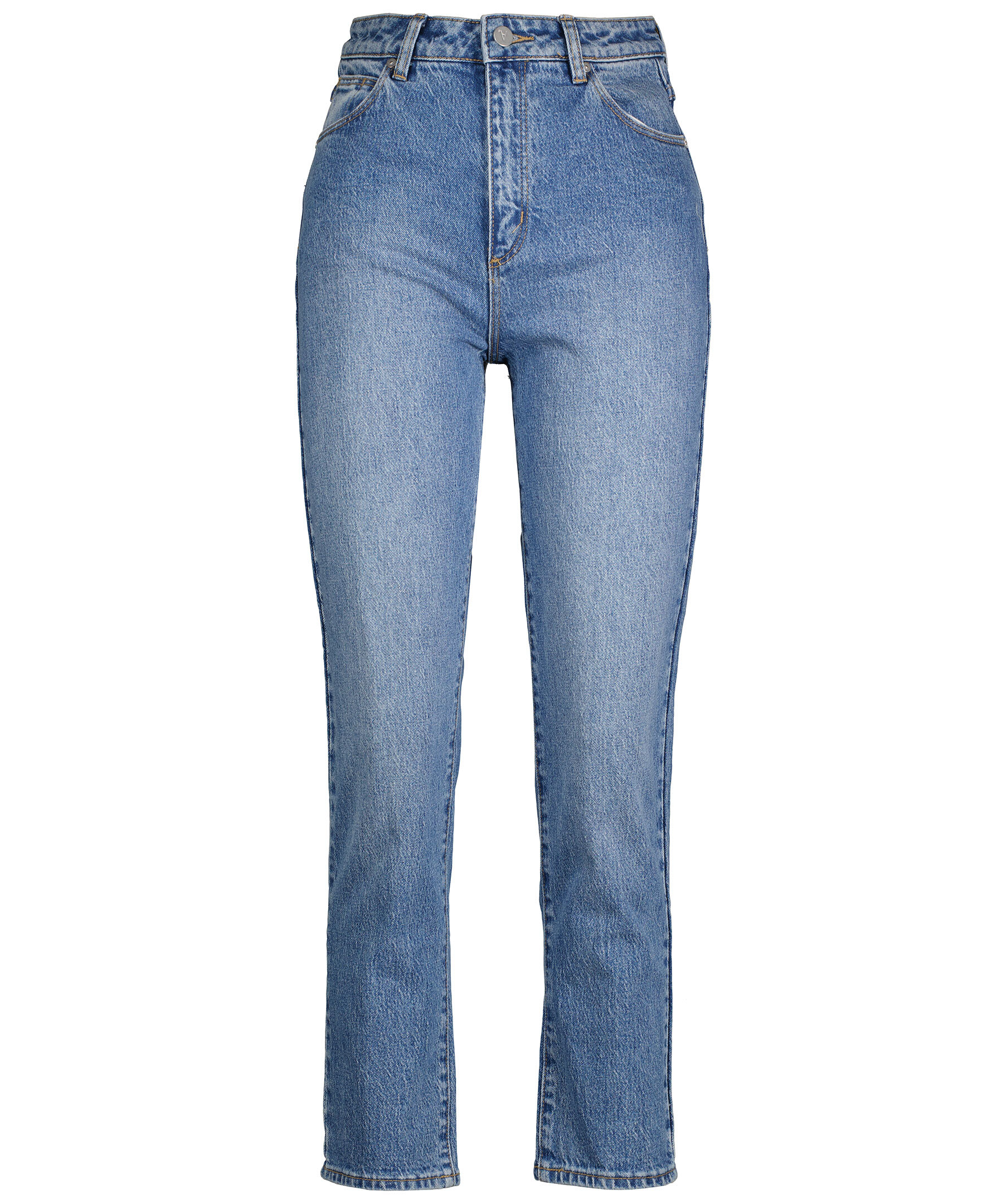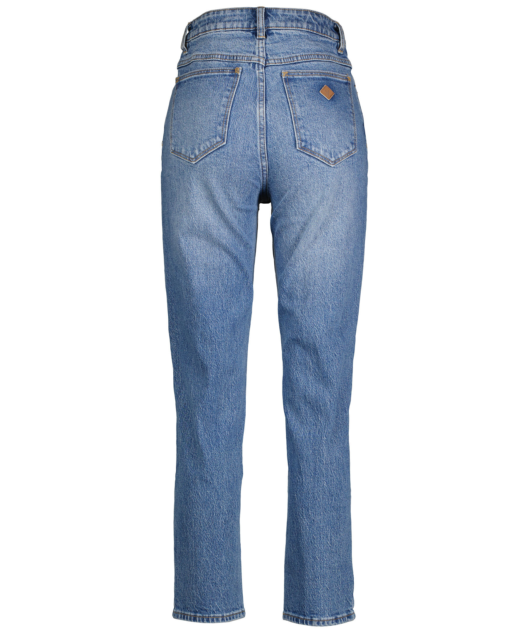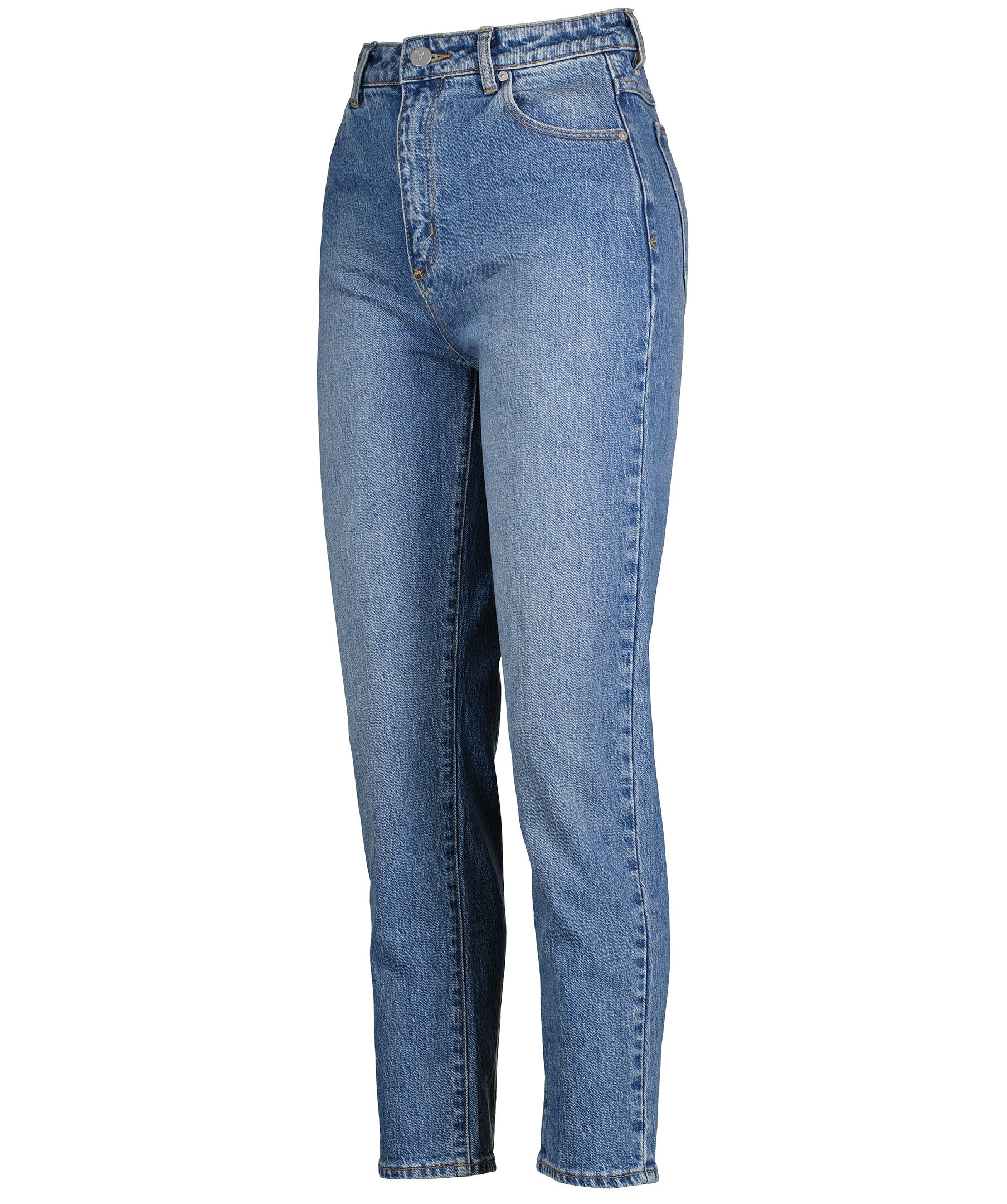 Blå Jeans i slim fit modell från A brand. Jeansen har en hög midja. Femficksmodell med hällor för bälte i midjan. Stängs med dold gylf med dragkedja och knapp. Broderad, liten patch i läder på ena bakfickan. Innerlängden på storlek 27 är 70 cm.