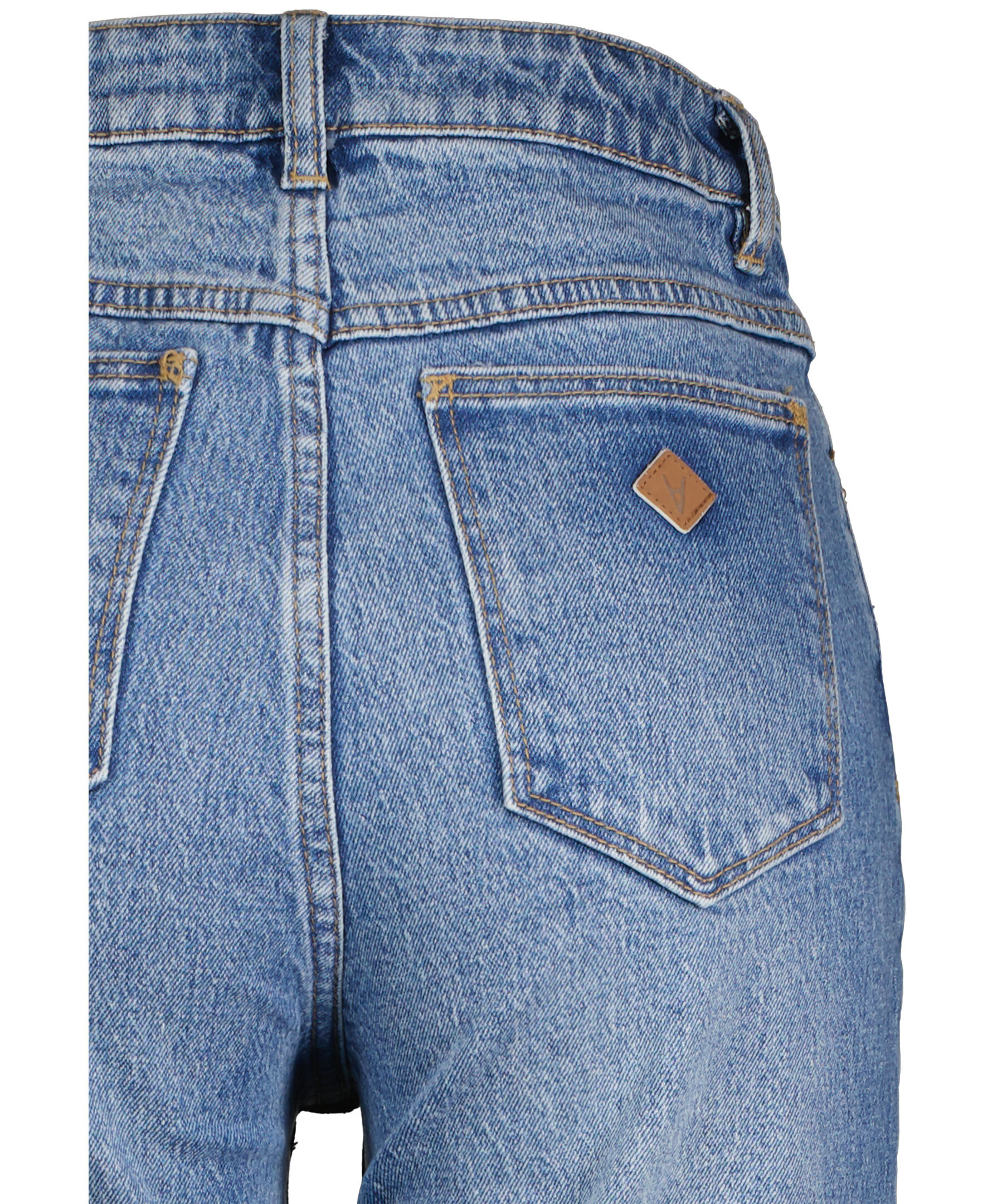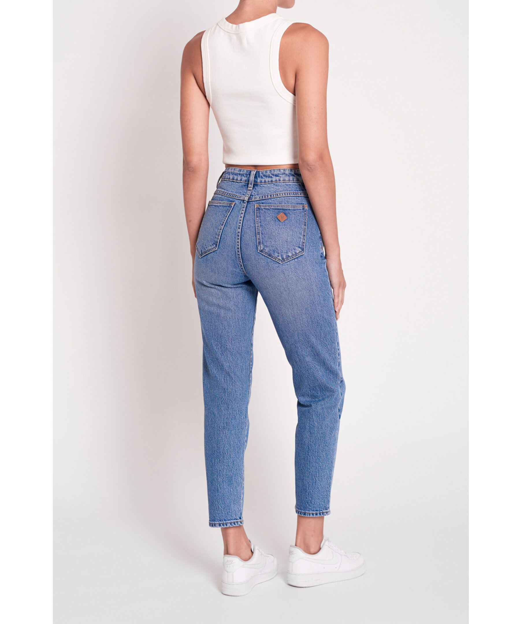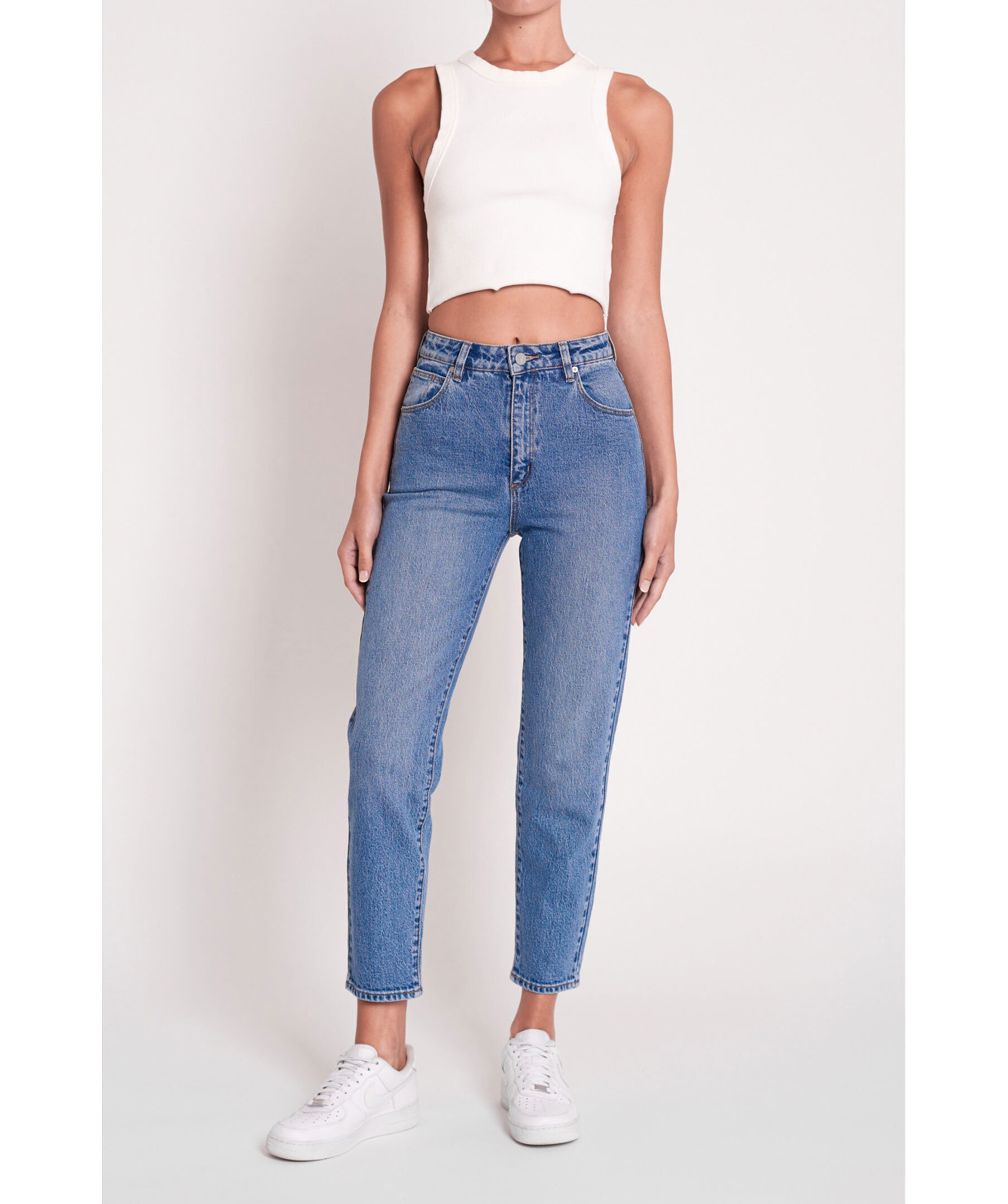 Blå Jeans i slim fit modell från A brand. Jeansen har en hög midja. Femficksmodell med hällor för bälte i midjan. Stängs med dold gylf med dragkedja och knapp. Broderad, liten patch i läder på ena bakfickan. Innerlängden på storlek 27 är 70 cm.