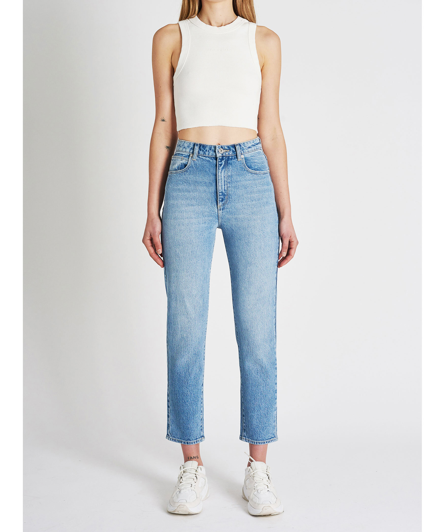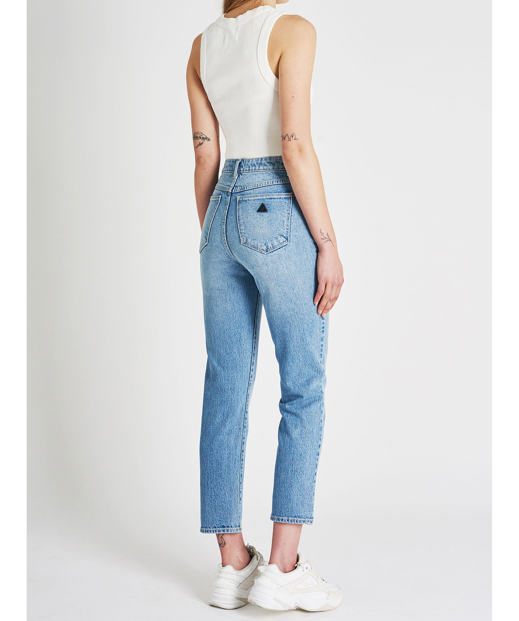 Ljusblå jeans från Abrand. byxorna har en slim passform och hög midja. Femficksmodell med hällor för bälte i midjan. Stängs med dold gylf med dragkedja och knapp. Broderad, liten patch i läder på ena bakfickan. Innerlängden på storlek 27 är 68 cm.