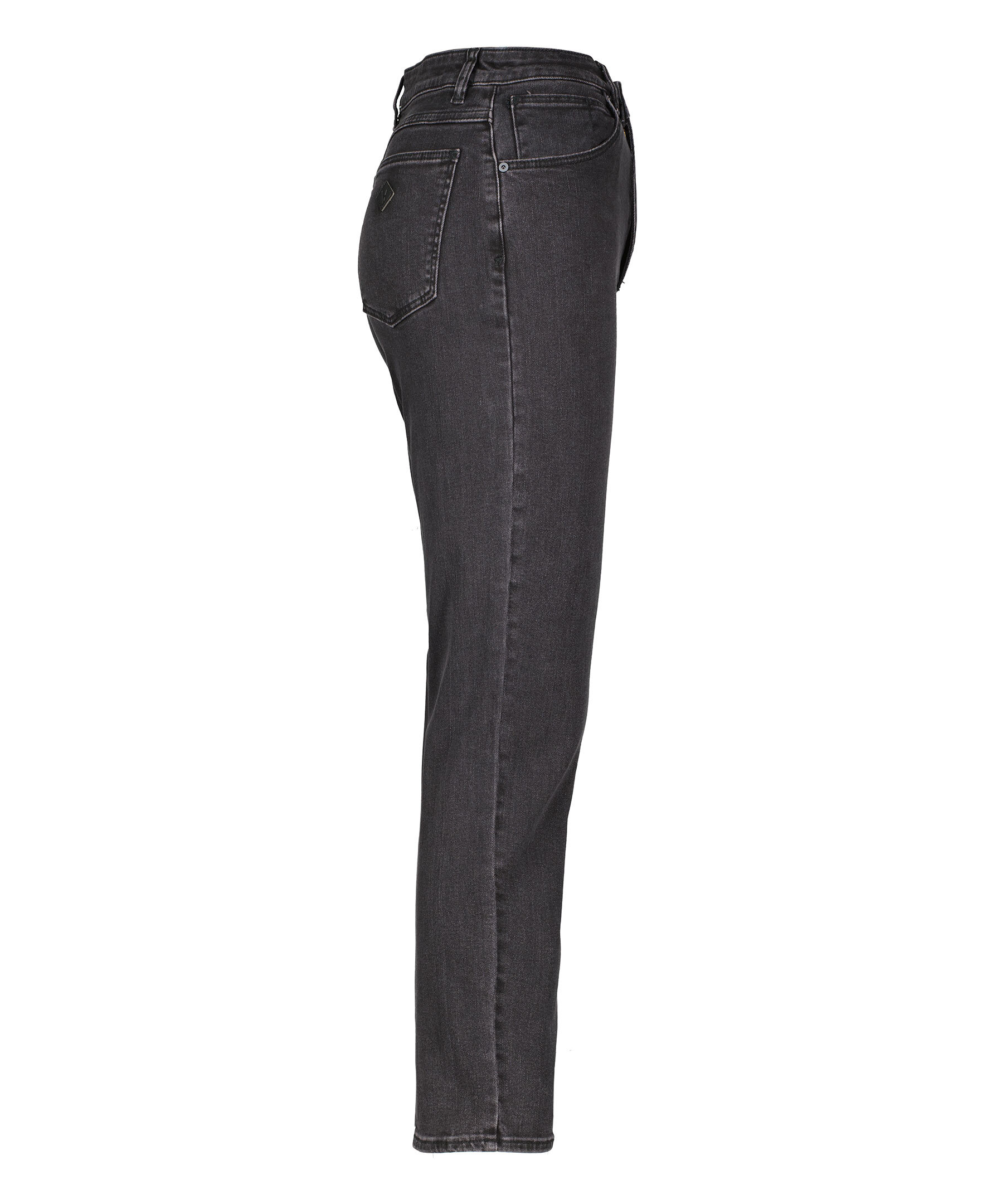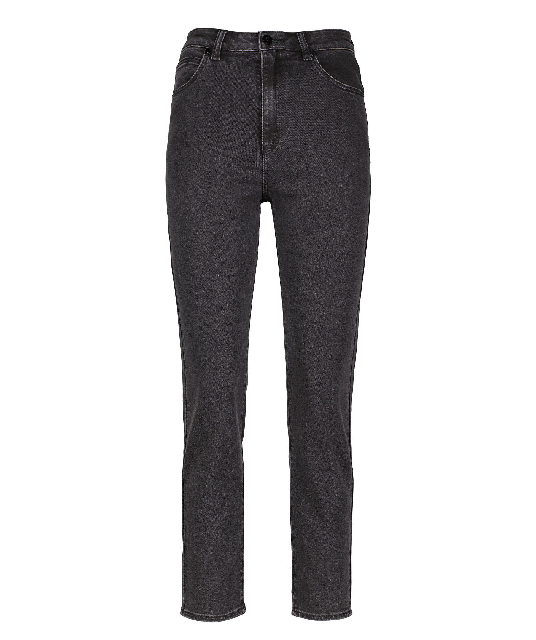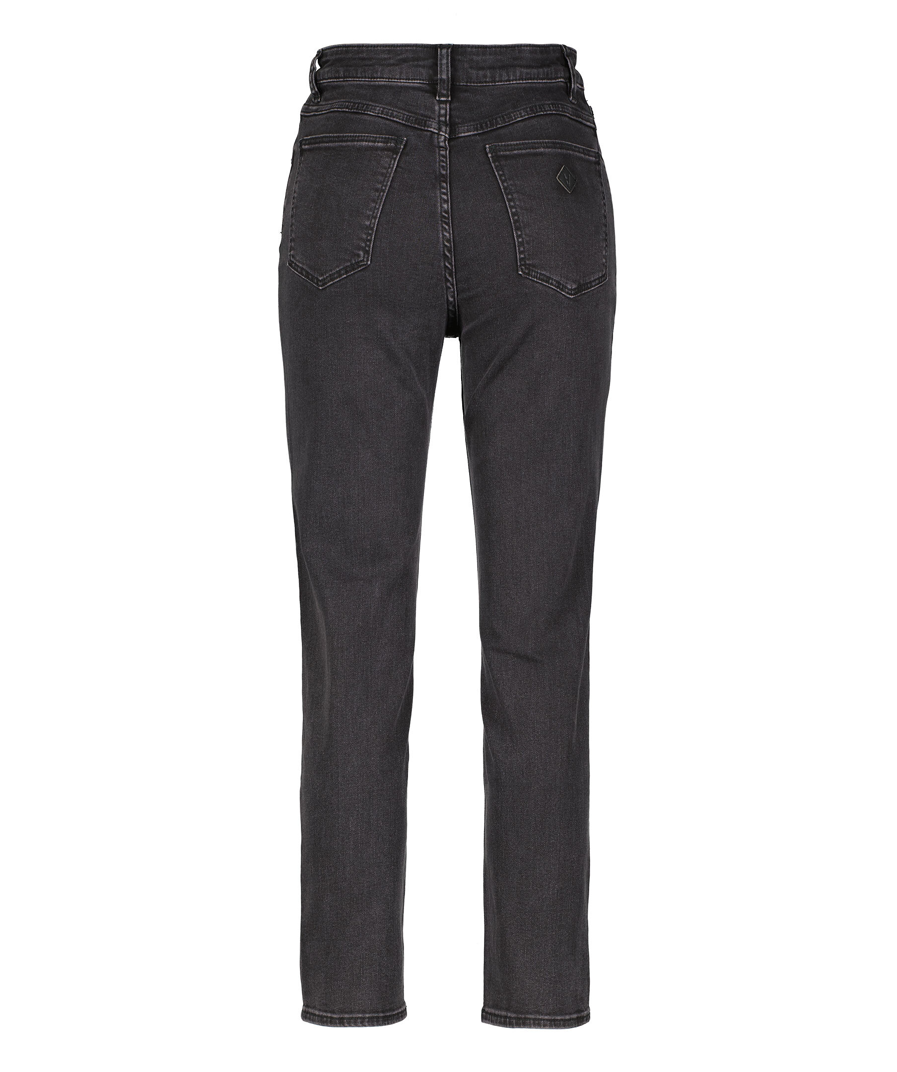 Svarta, tvättade jeans från Abrand. Byxorna har en slim passform med hög midja och croppade ben. Femficksmodell med hällor för bälte i midjan. Stängs med dold gylf med dragkedja och knapp. Broderad, liten patch i läder på ena bakfickan. Innerlängden på storlek 27 är 69 cm. Tillverkade i stretchig bomull.