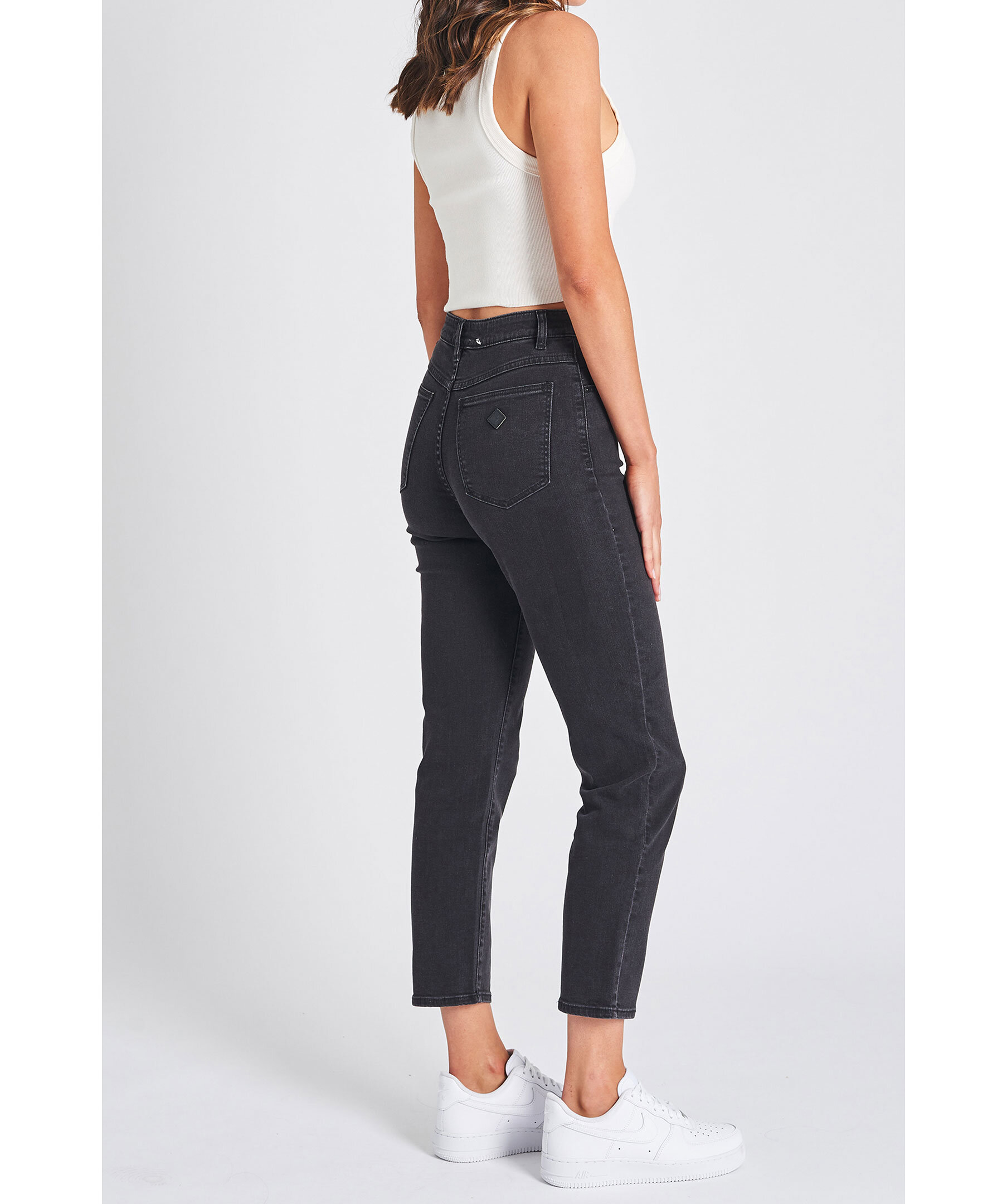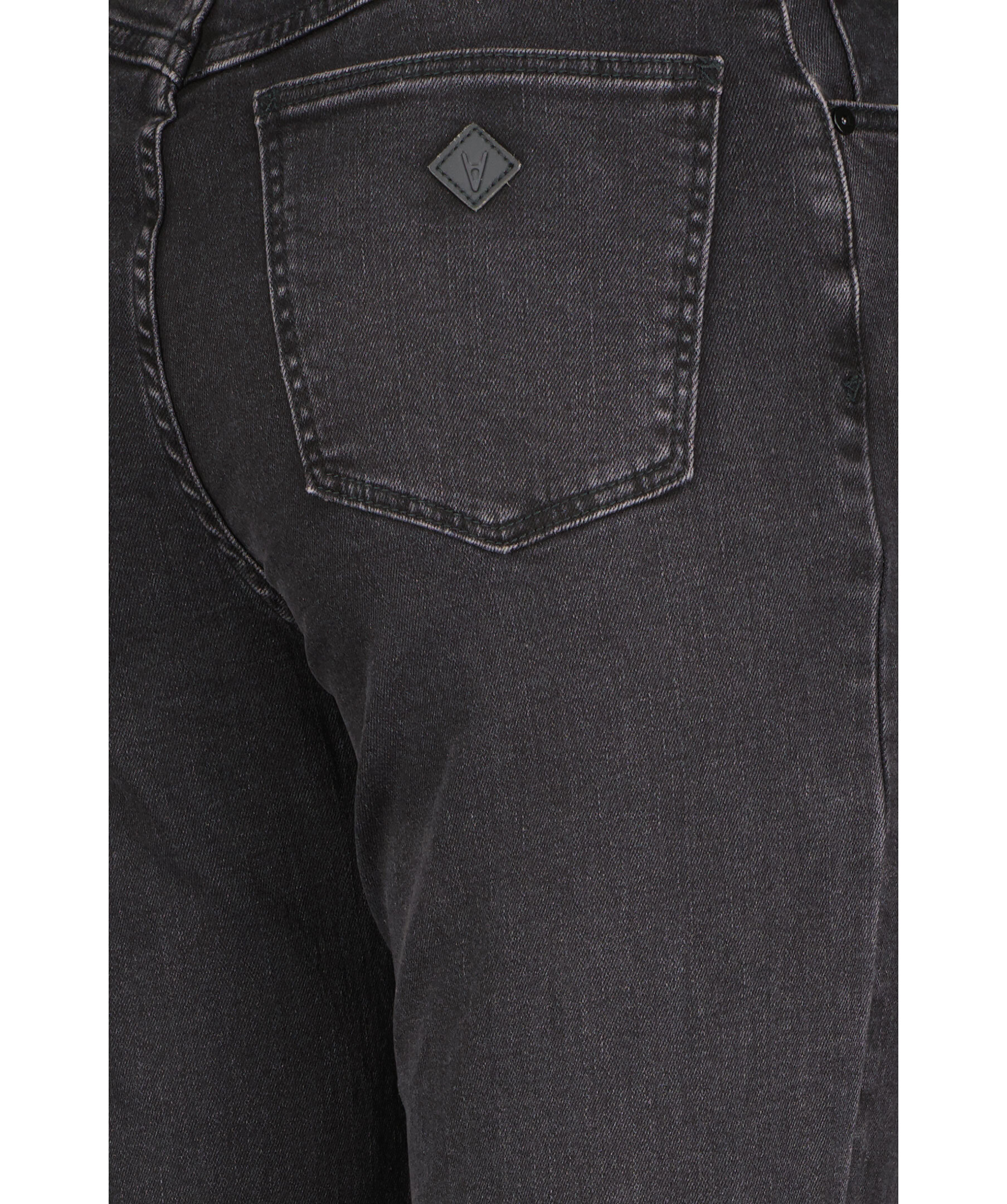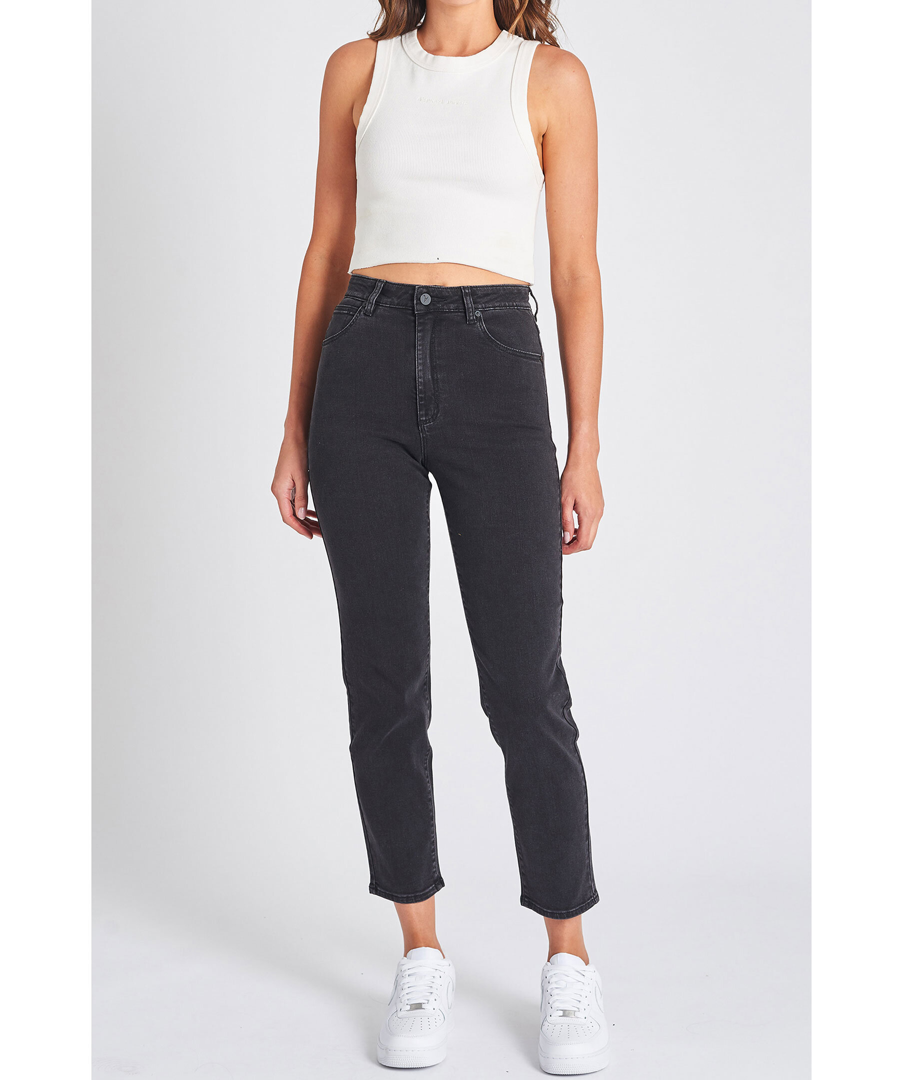 Svarta, tvättade jeans från Abrand. Byxorna har en slim passform med hög midja och croppade ben. Femficksmodell med hällor för bälte i midjan. Stängs med dold gylf med dragkedja och knapp. Broderad, liten patch i läder på ena bakfickan. Innerlängden på storlek 27 är 69 cm. Tillverkade i stretchig bomull.