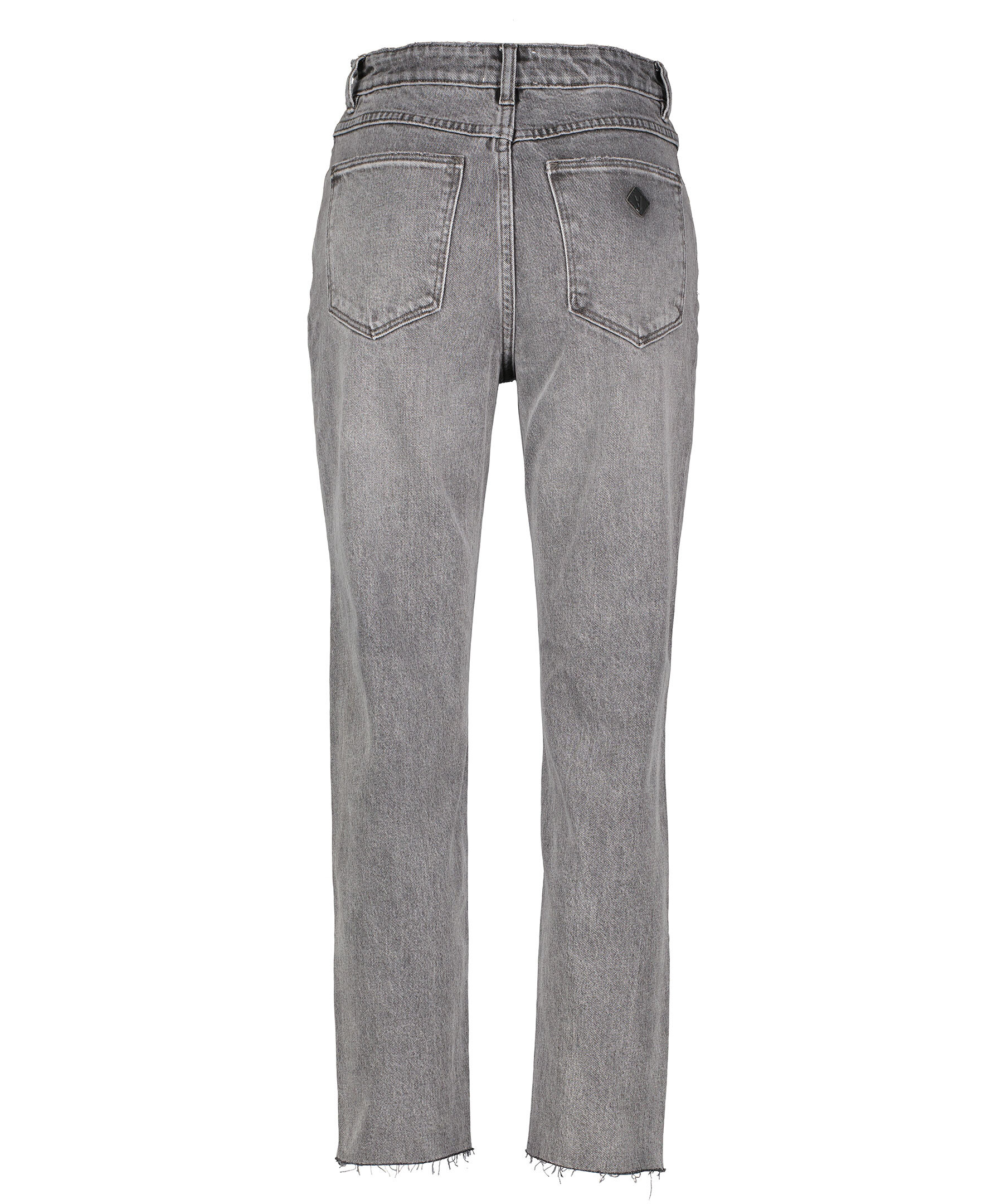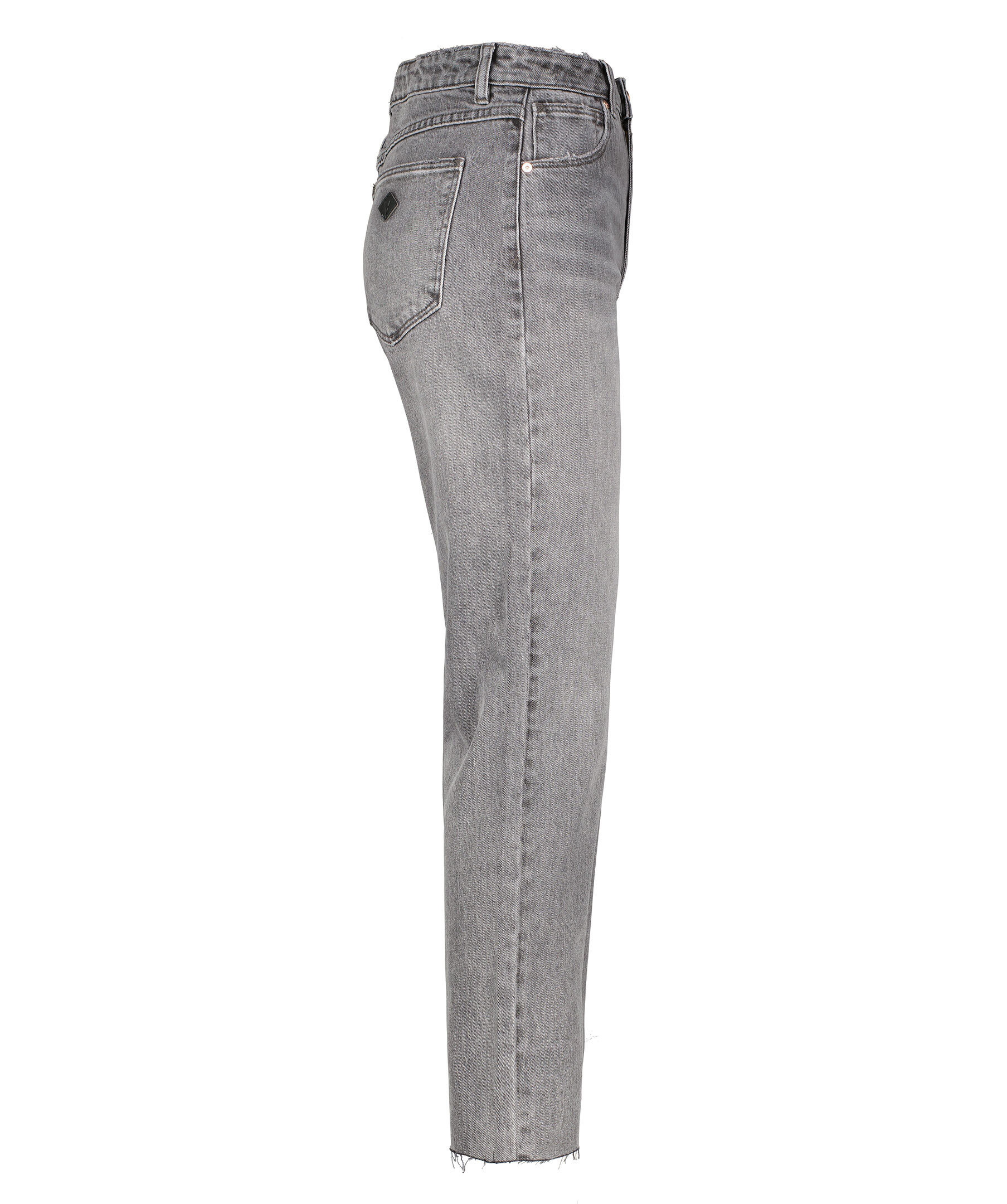 Gråsvarta, stentättade jeans i slim fit modell från A brand. Jeansen har en hög midja och croppade, avklippta ben med rå kant. Femficksmodell med hällor för bälte i midjan. Stängs med dold gylf med dragkedja och knapp. Broderad, liten patch i läder på ena bakfickan. Innerlängden på storlek 27 är 69 cm. Tillverkade i bomull med lite stretch.