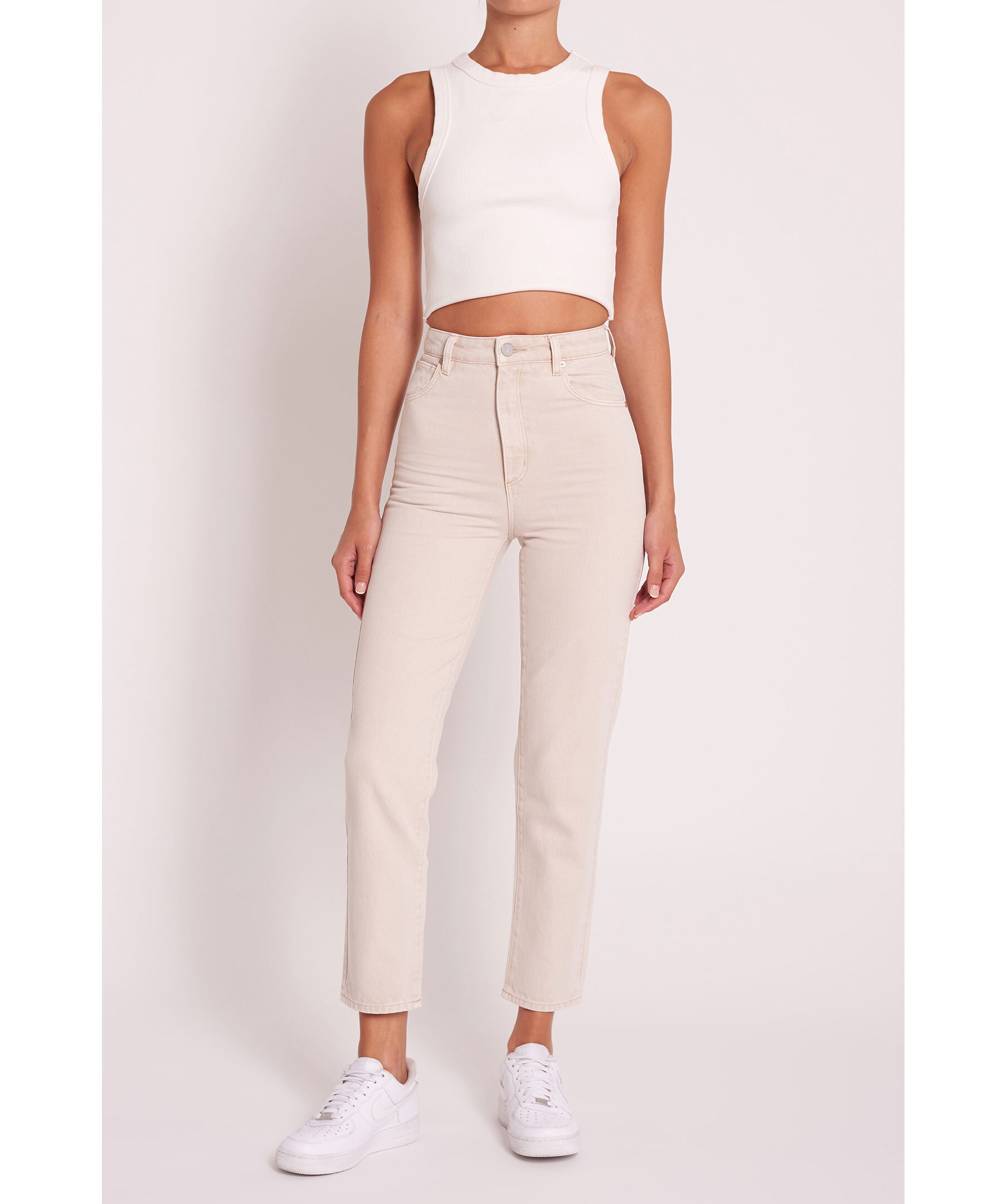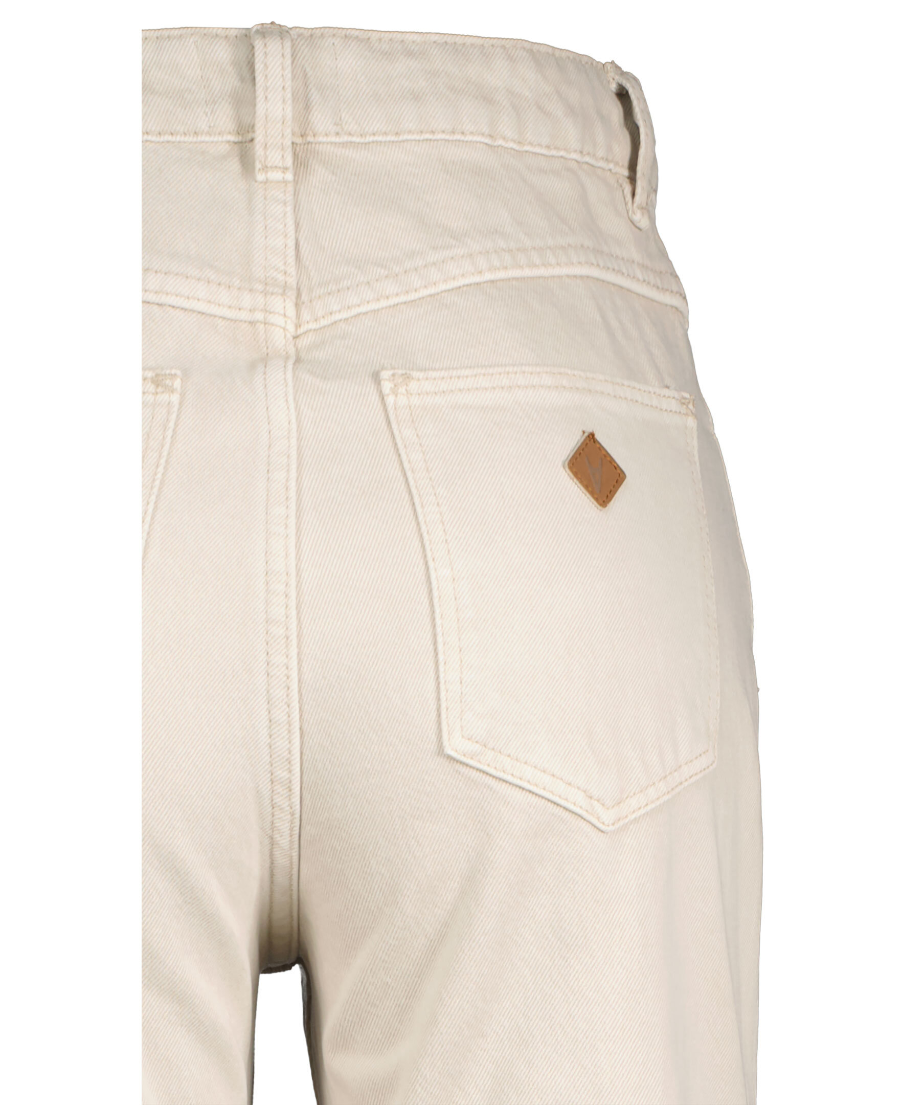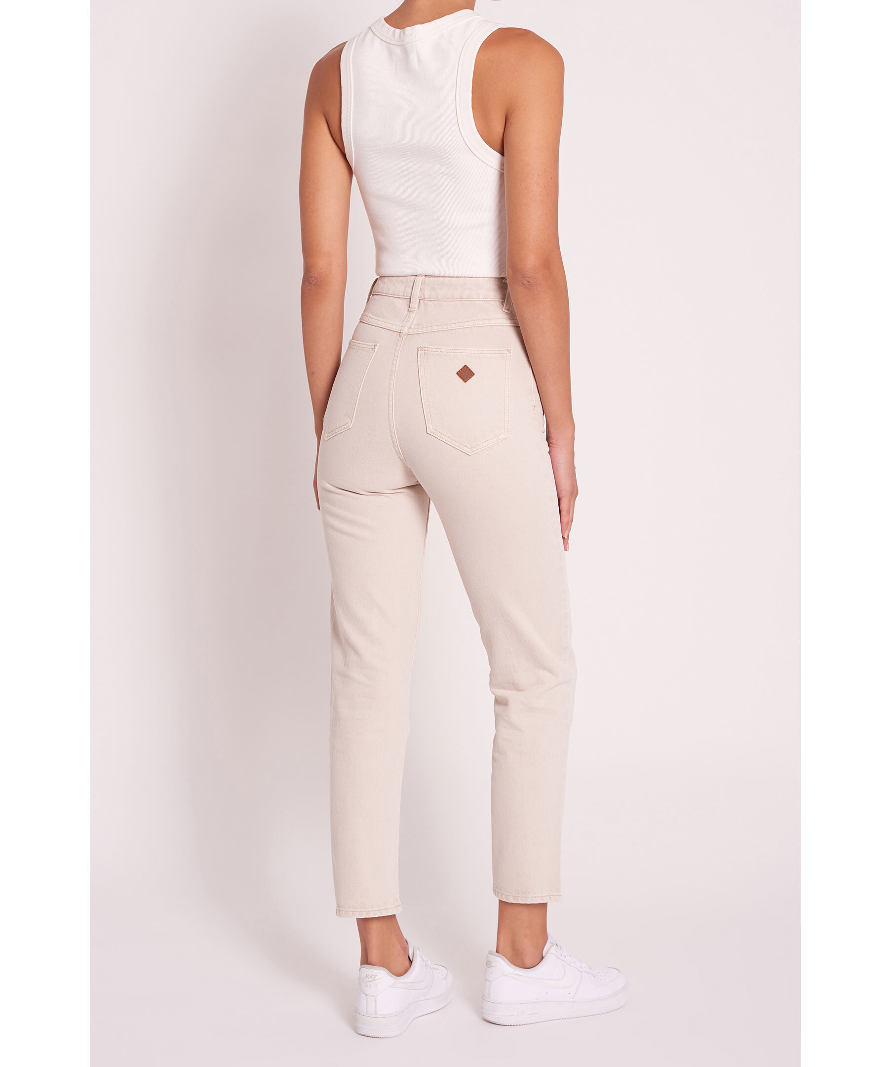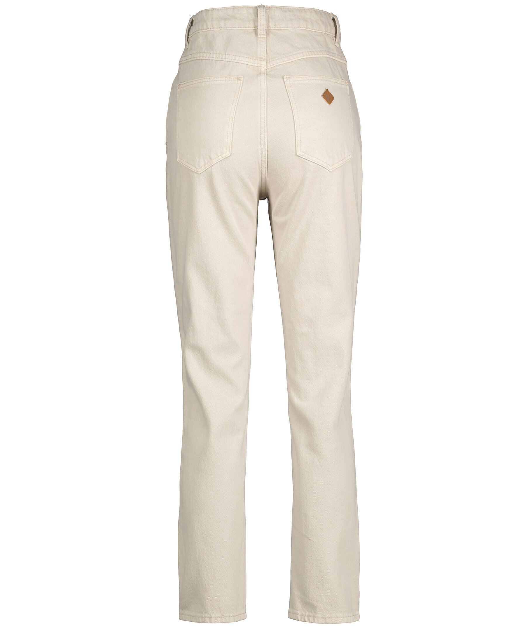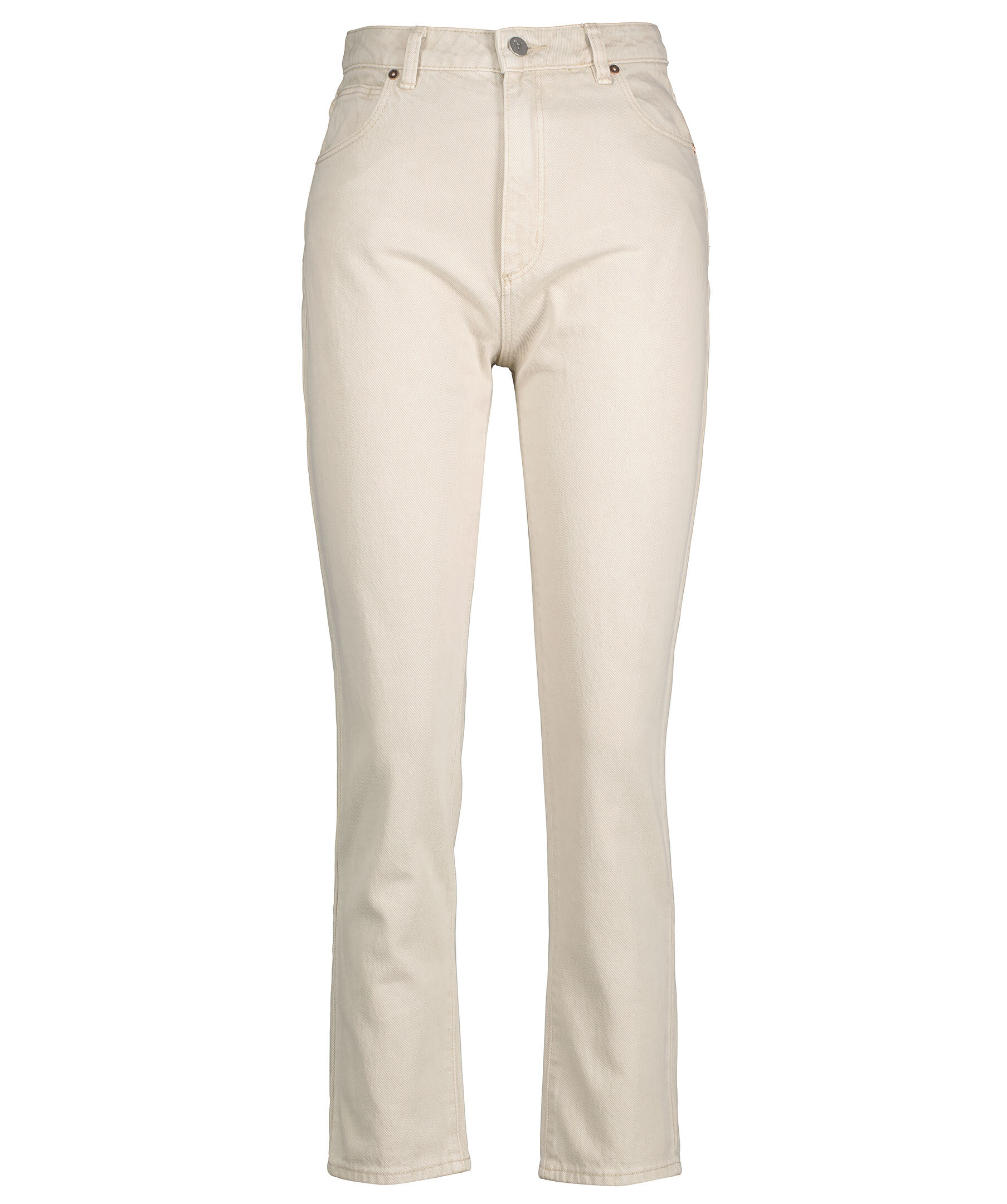 Beigea, grå tvättade jeans från Abrand. Byxorna har en slim passform med hög midja och croppade ben. Femficksmodell med hällor för bälte i midjan. Stängs med dold gylf med dragkedja och knapp. Broderad, liten patch i läder på ena bakfickan. Innerlängden på storlek 27 är 67 cm. Tillverkade i stretchig bomull.