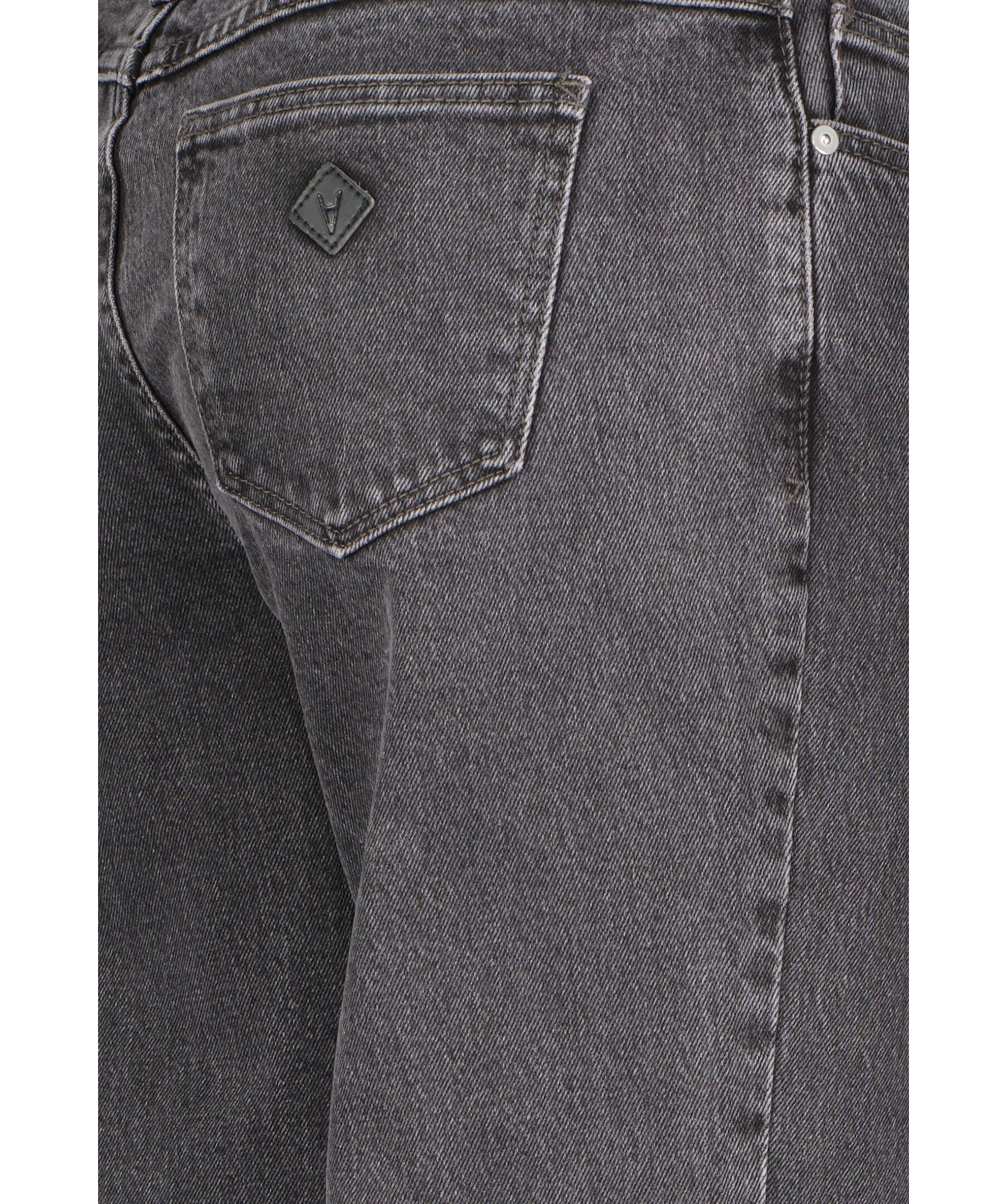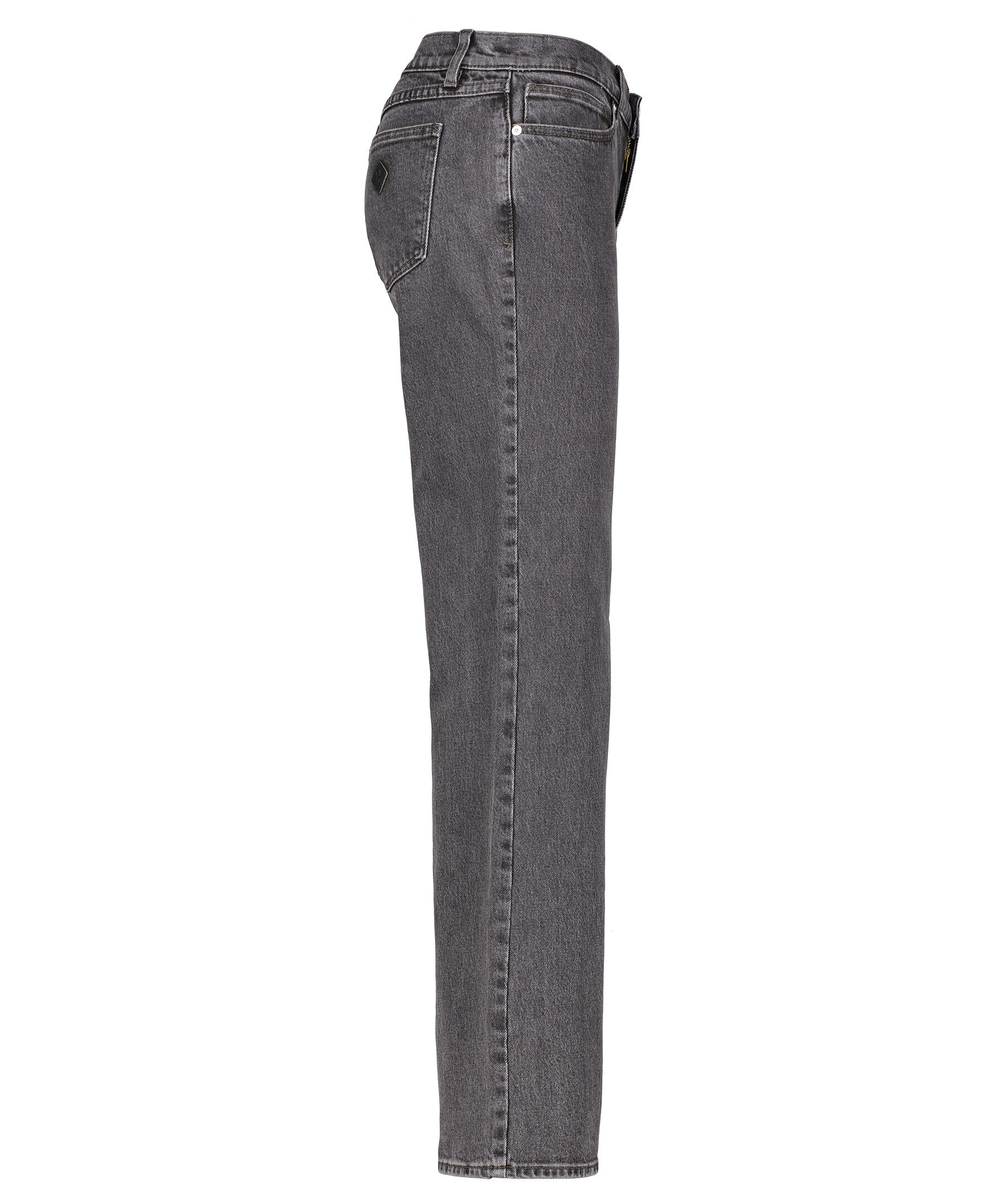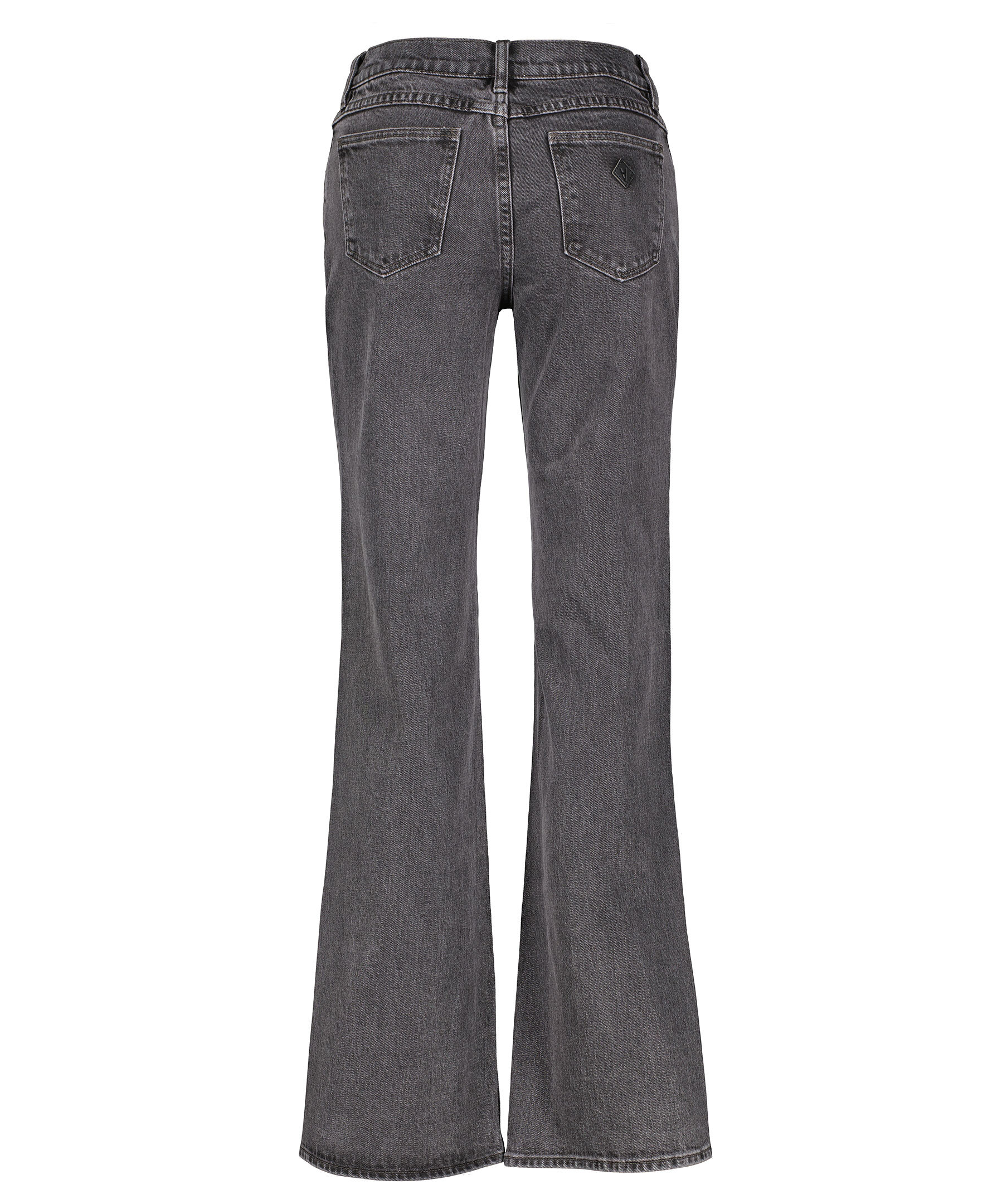 Boot cut jeans i gråsvart, tvättad look från Abrand. Jeansen har en låg midja och långa, utsvängda ben från knät och ner. Femficksmodell med hällor för bälte i midjan. Stängs med dold gylf med dragkedja och knapp. Broderad, liten patch i läder på ena bakfickan. Innerlängden på storlek 27 är 80 cm.