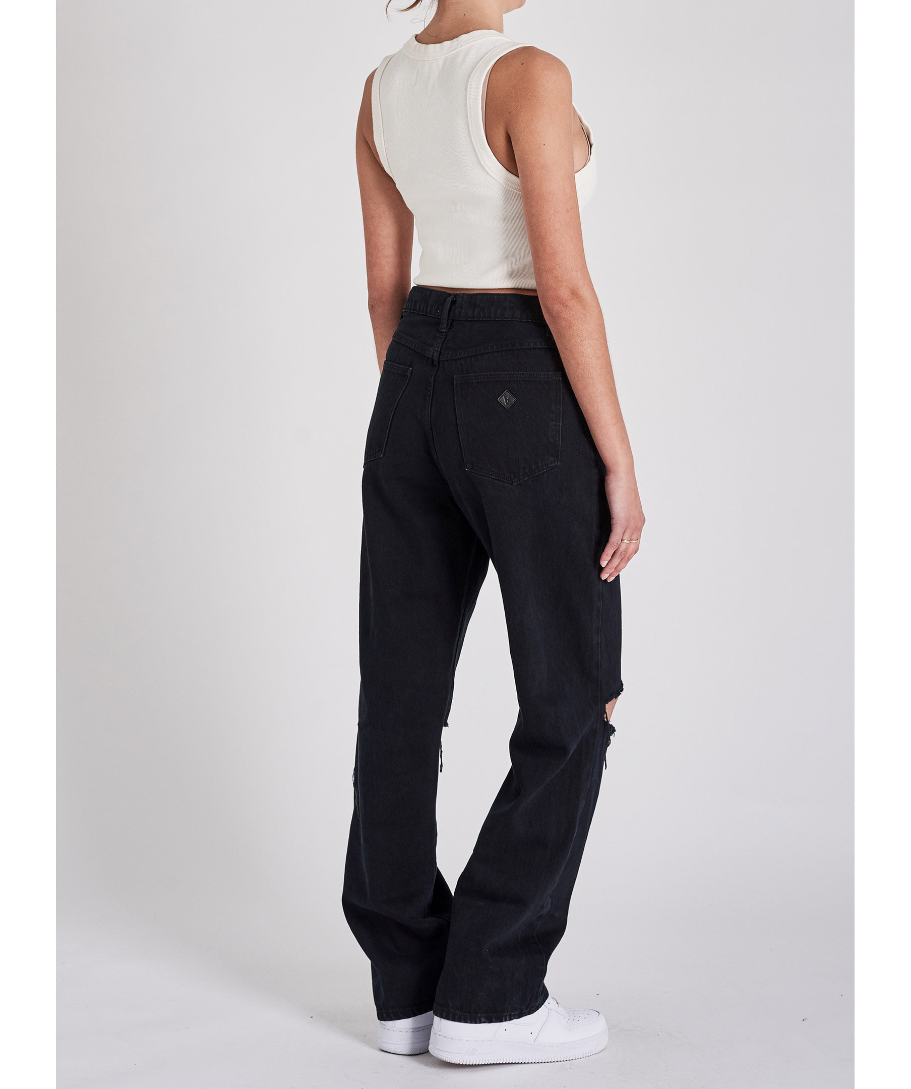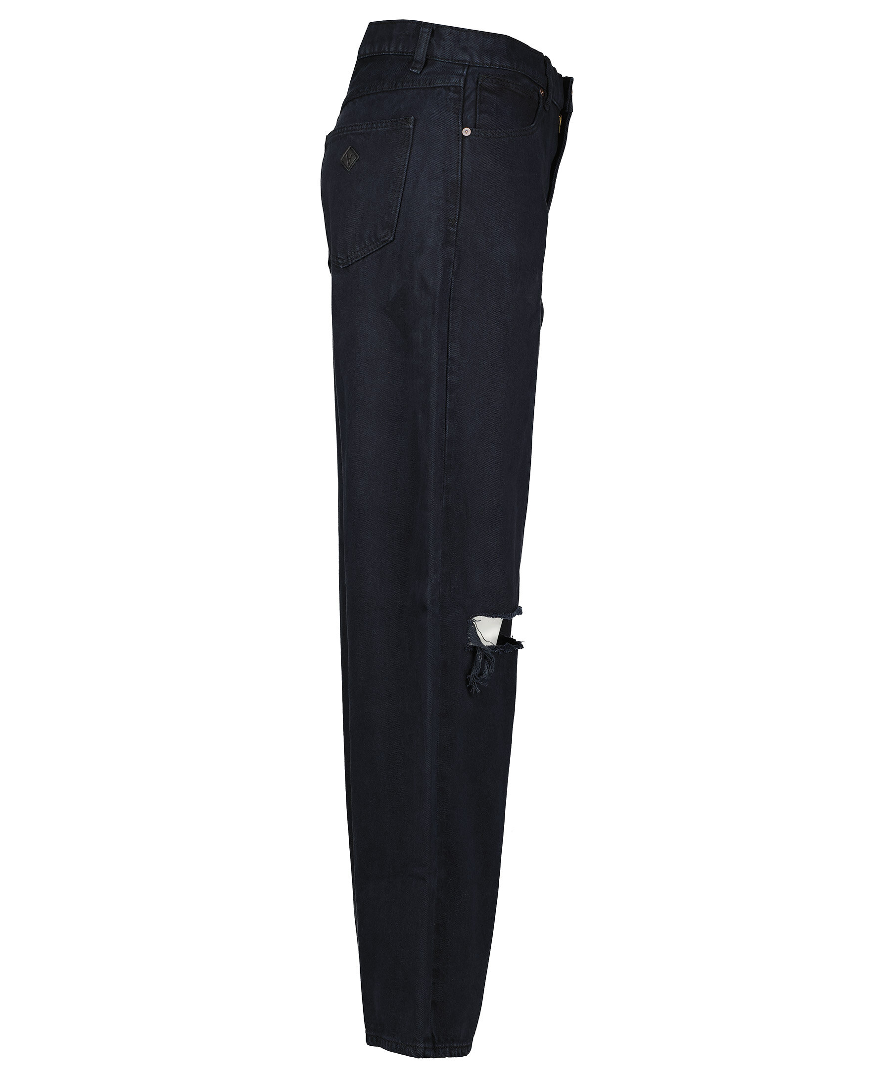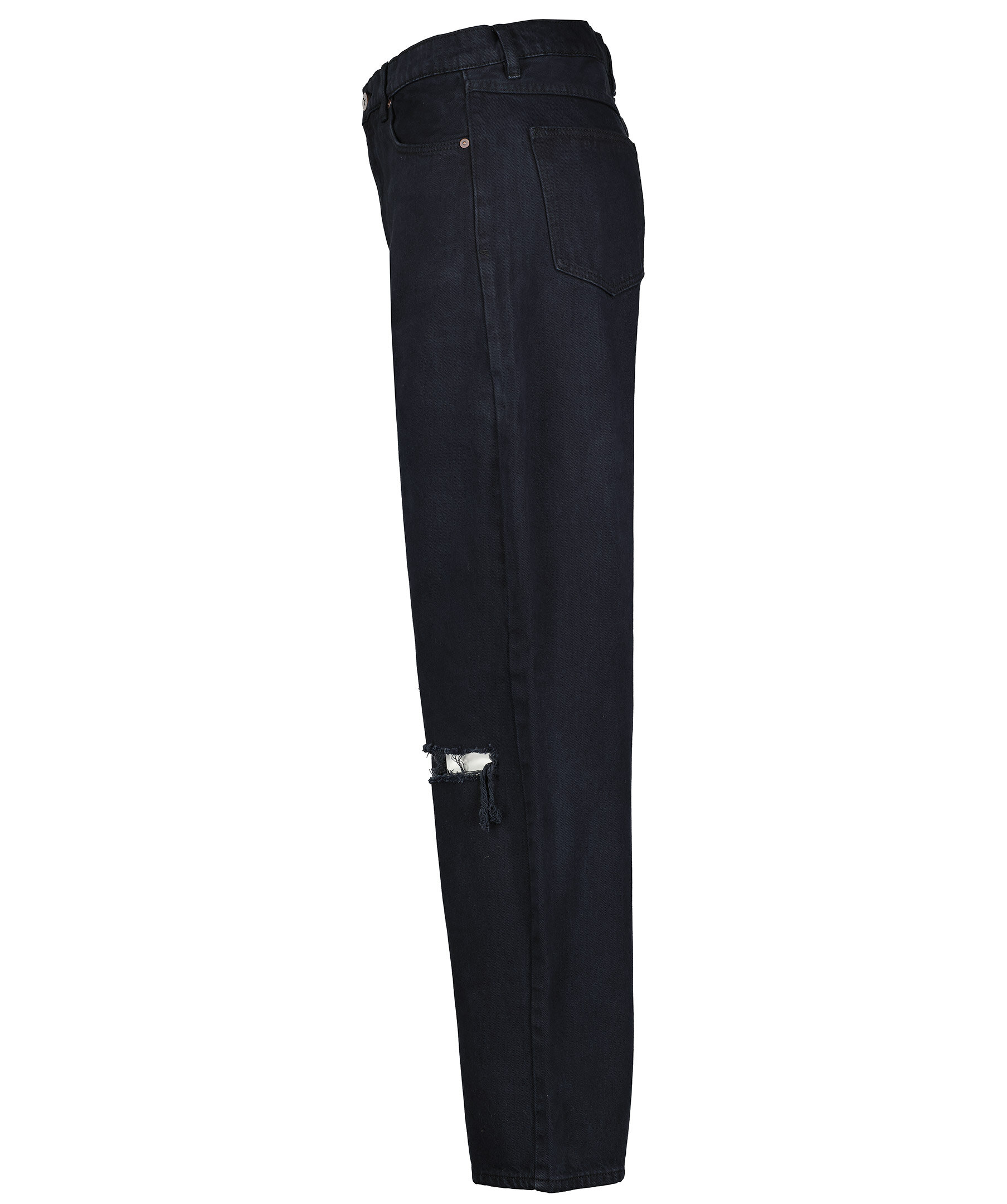Svarta jeans i en lösare passform i midjan för en mer baggy passform från Abrand. Femficksmodell med hällor för bälte i midjan. Stängs med dold gylf med dragkedja och knapp. Raka hål vid knäna. Broderad, liten patch i svart läder på ena bakfickan. Innerbenslängd: 69 cm, mått för storlek 26. Gå upp i storlek för en lösare fit som hänger mer på höften, eller välj din vanliga storlek för tight passform med högre midja.