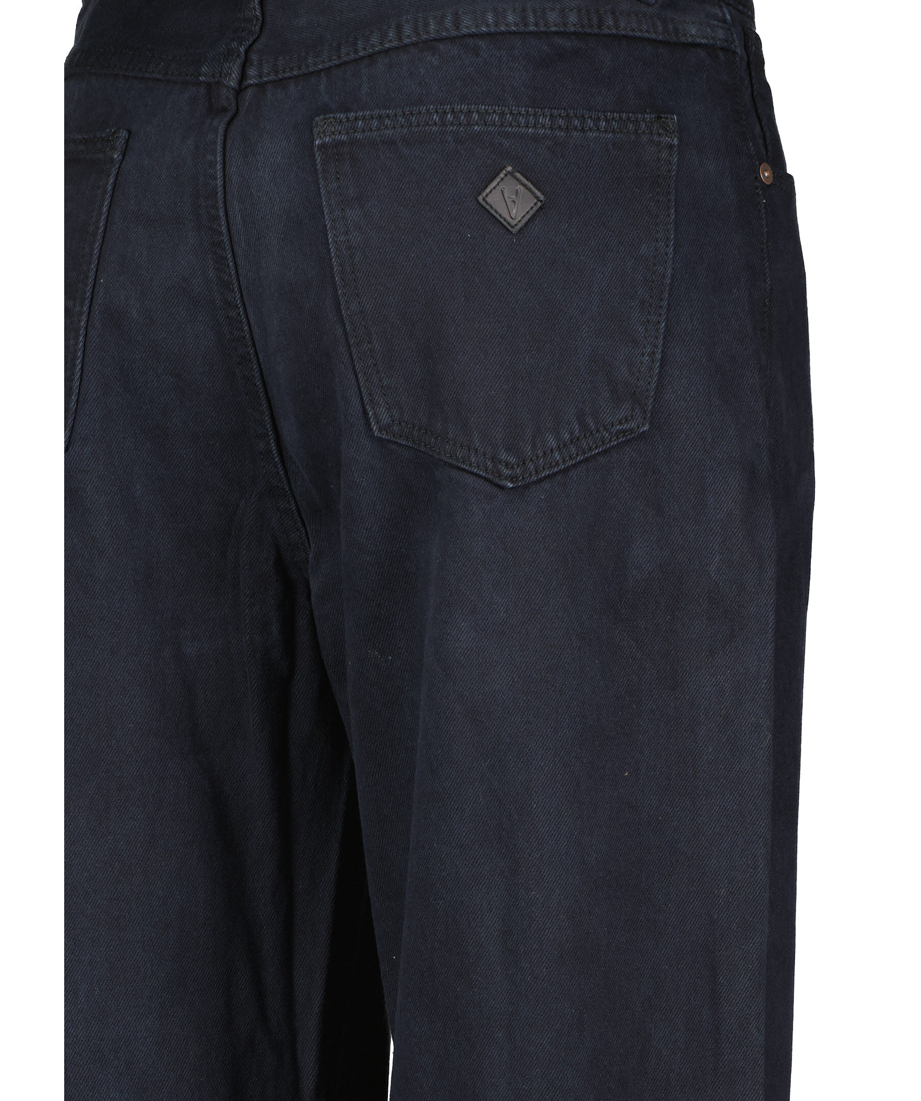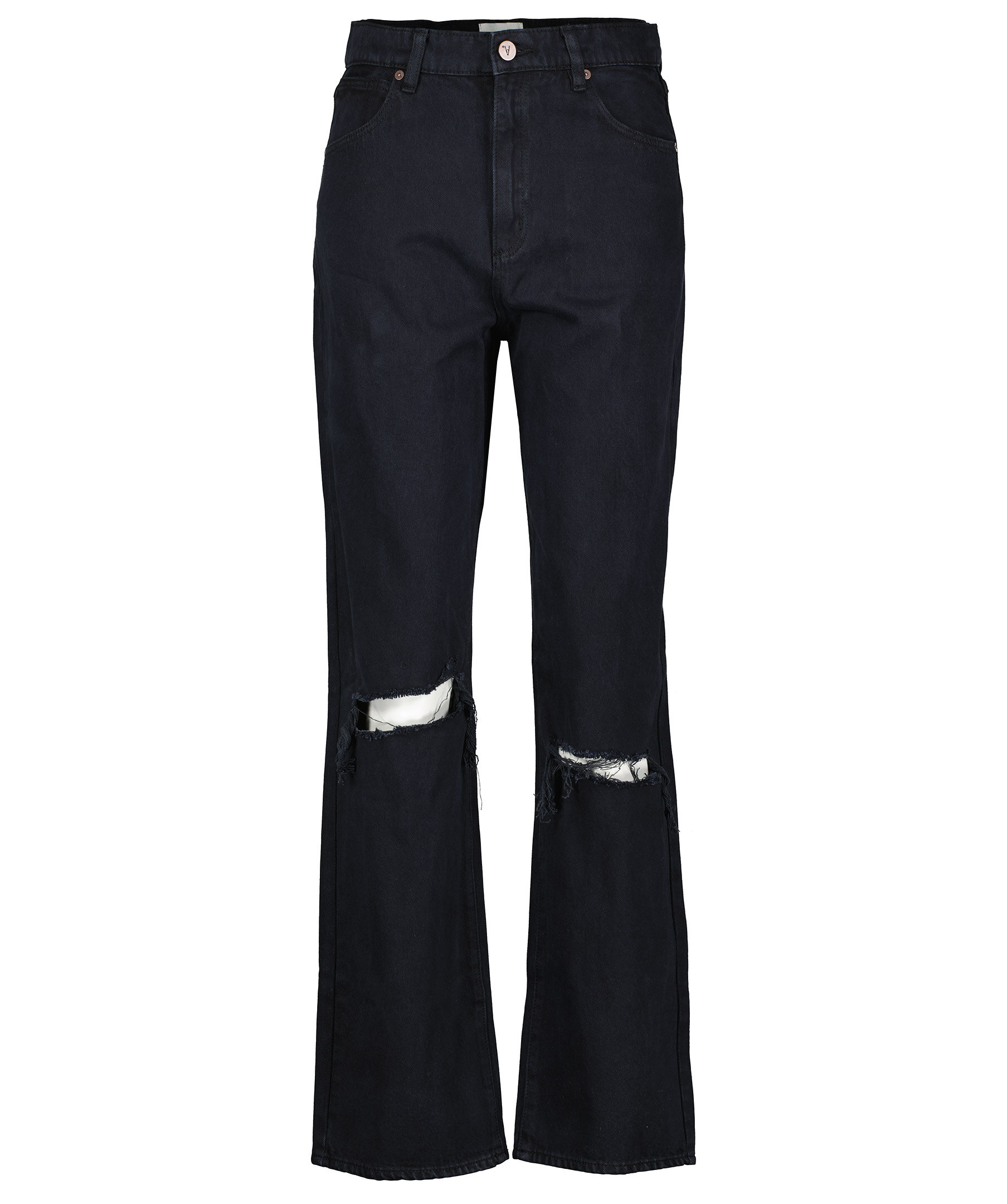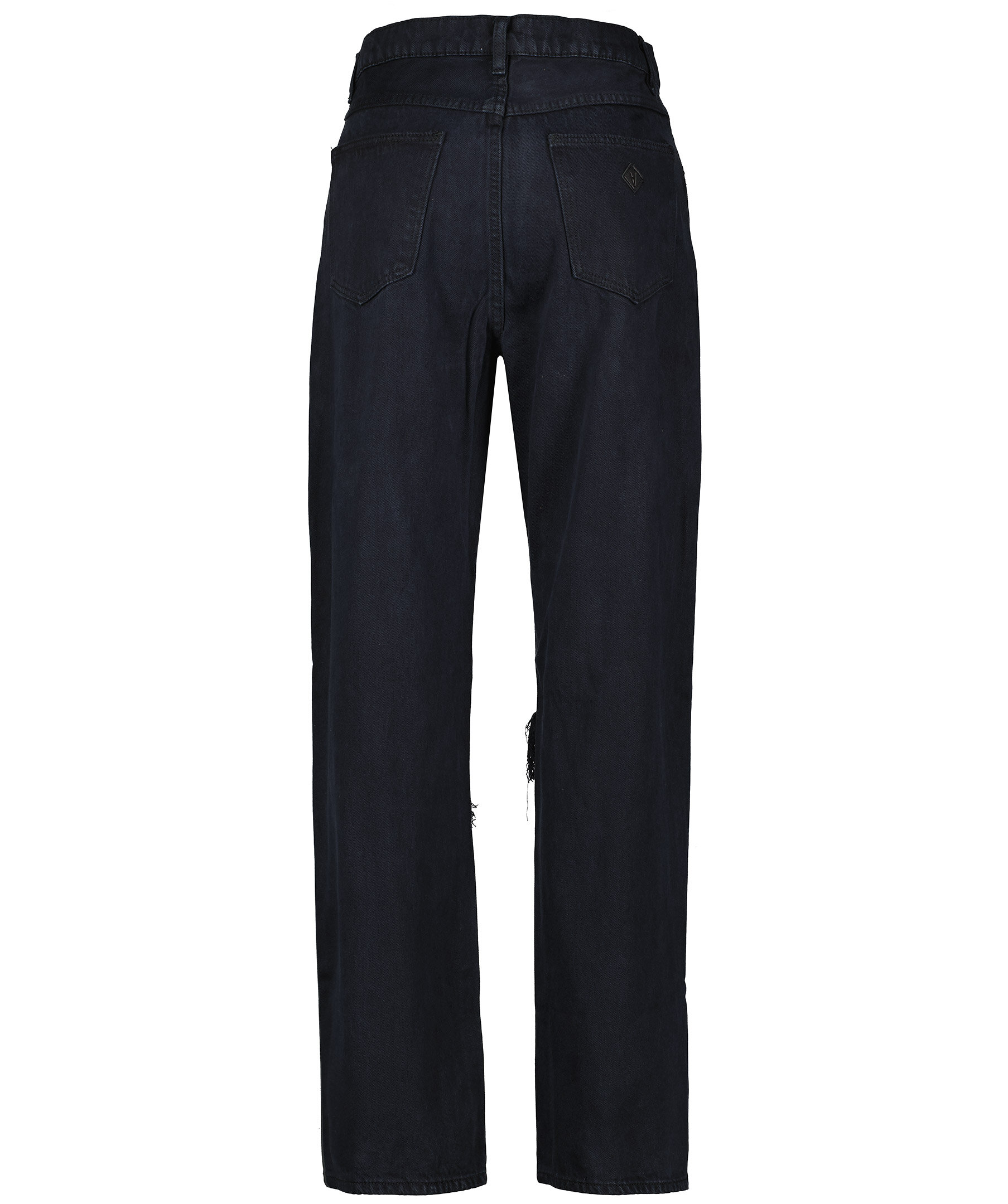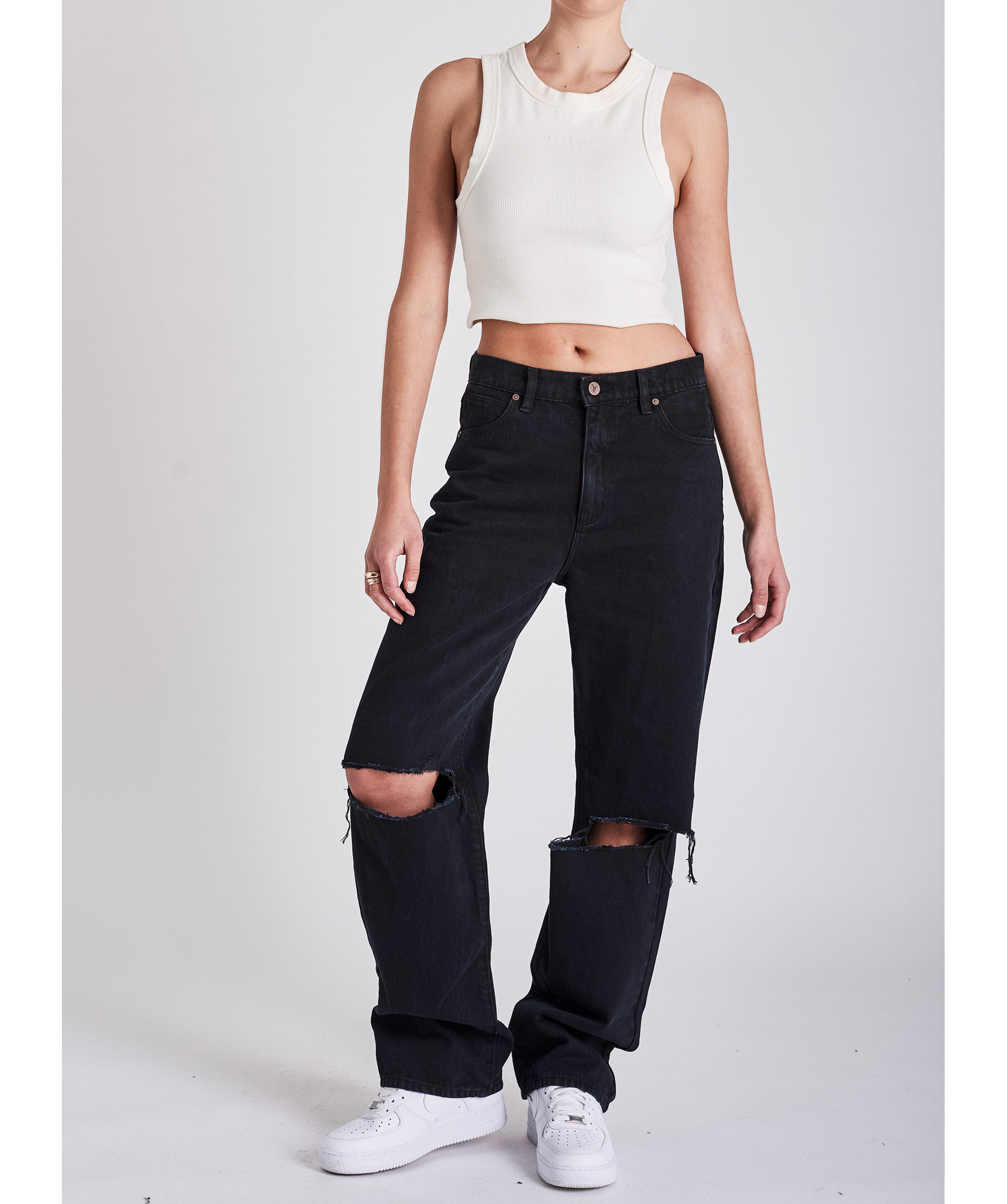 Svarta jeans i en lösare passform i midjan för en mer baggy passform från Abrand. Femficksmodell med hällor för bälte i midjan. Stängs med dold gylf med dragkedja och knapp. Raka hål vid knäna. Broderad, liten patch i svart läder på ena bakfickan. Innerbenslängd: 69 cm, mått för storlek 26. Gå upp i storlek för en lösare fit som hänger mer på höften, eller välj din vanliga storlek för tight passform med högre midja.