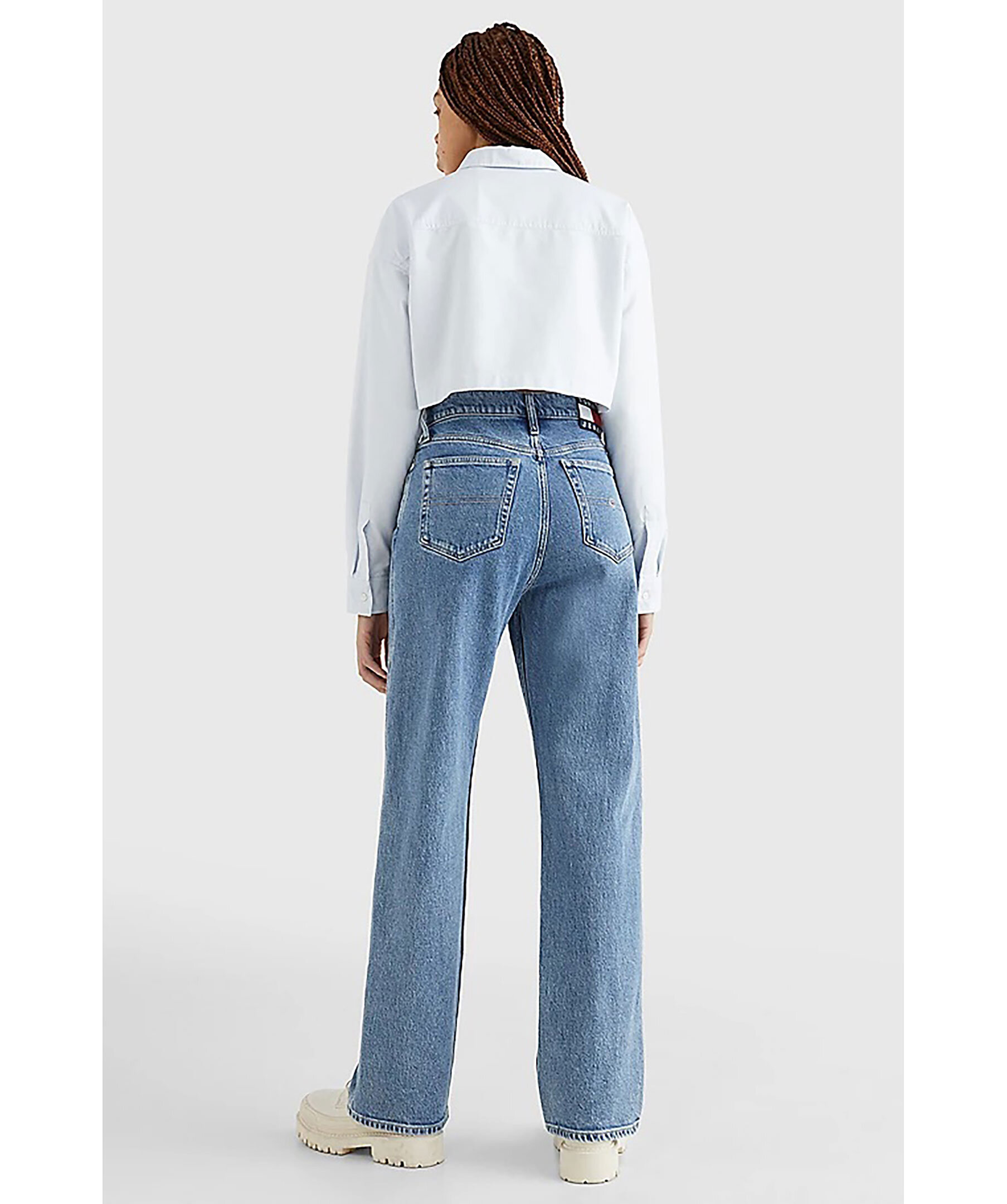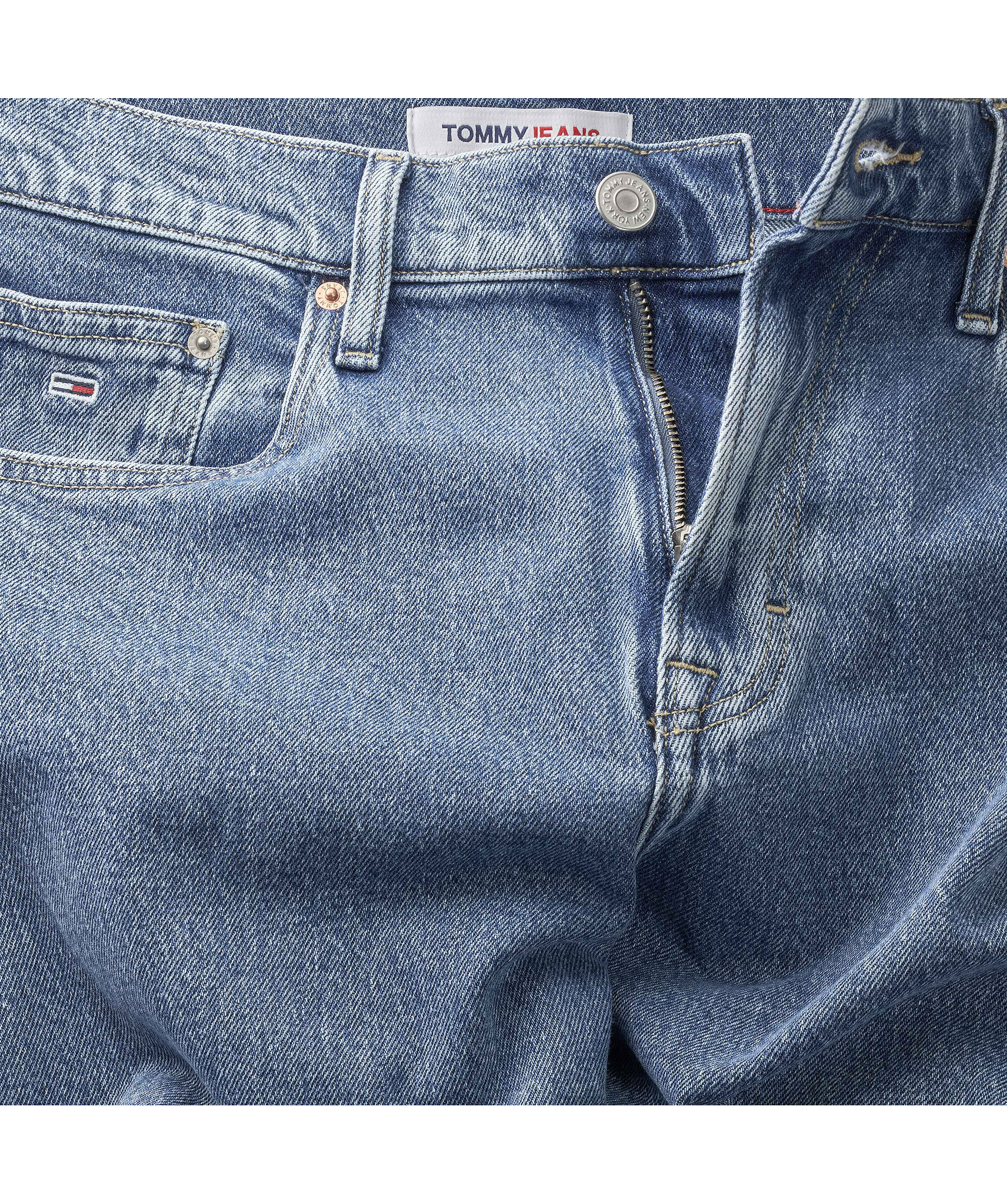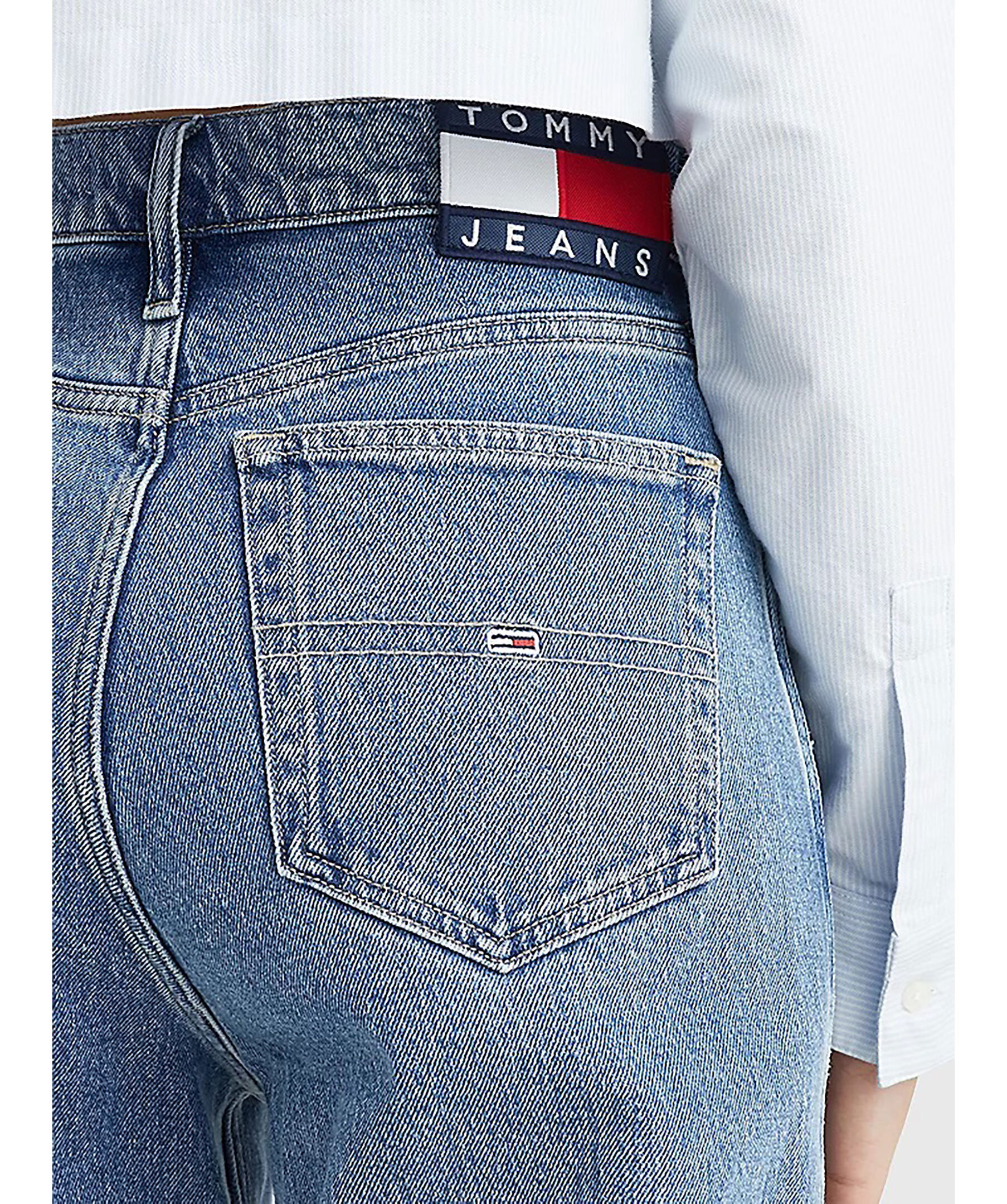 Mellanblåa jeans med en smickrande medelhög midja och vida ben från Tommy Jeans. Femficksmodell, stor patch med Tommy Jeans logga bak i linningen och liten logotyp framtill i den lilla fickan på vänster sida. stängs med dold gylf med dragkedja och knapp samt har hällor för bälte i midjan. Modellen är 176 cm och bär storlek 28/32.