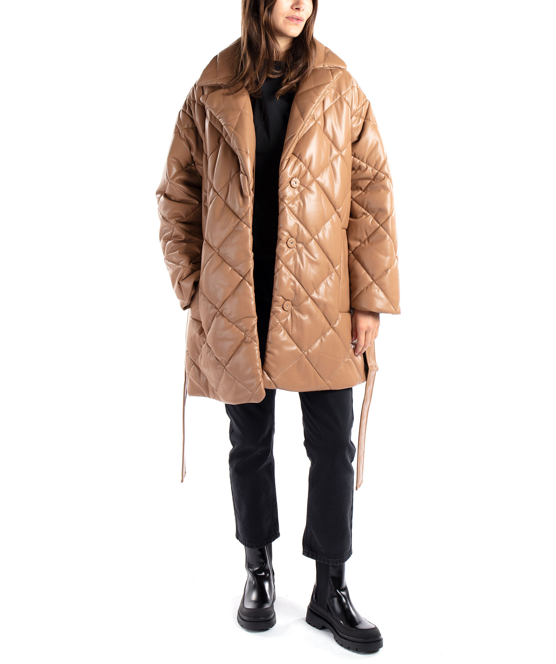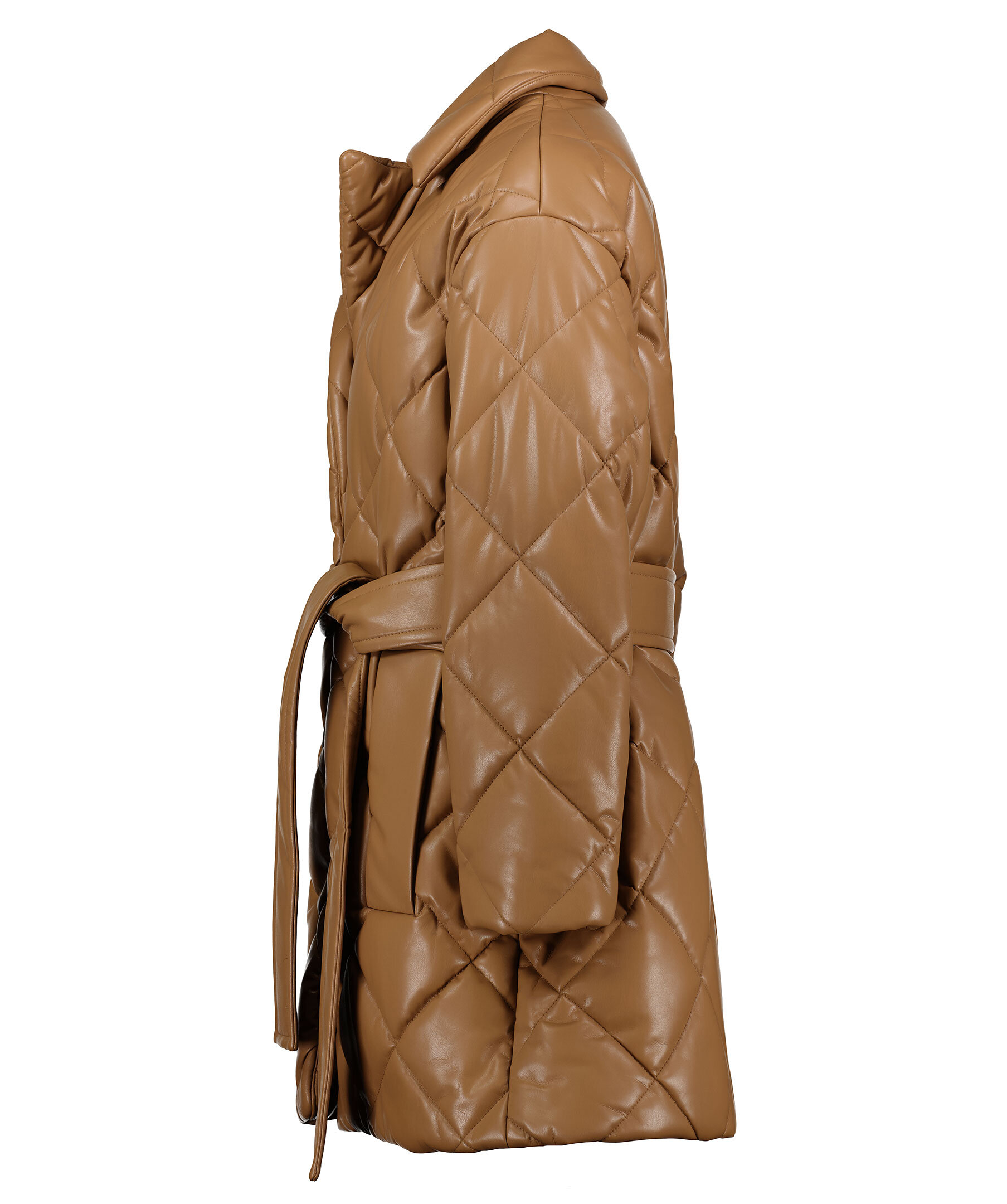 Beige quiltad jacka med oversized fit i konstläder från Stand Studio. Jackan stängs med dolda tryckknappar. Stora slag och avtagbart bälte i midjan. Två fickor framtill. Modellen är 178cm lång och har på sig storlek 36.