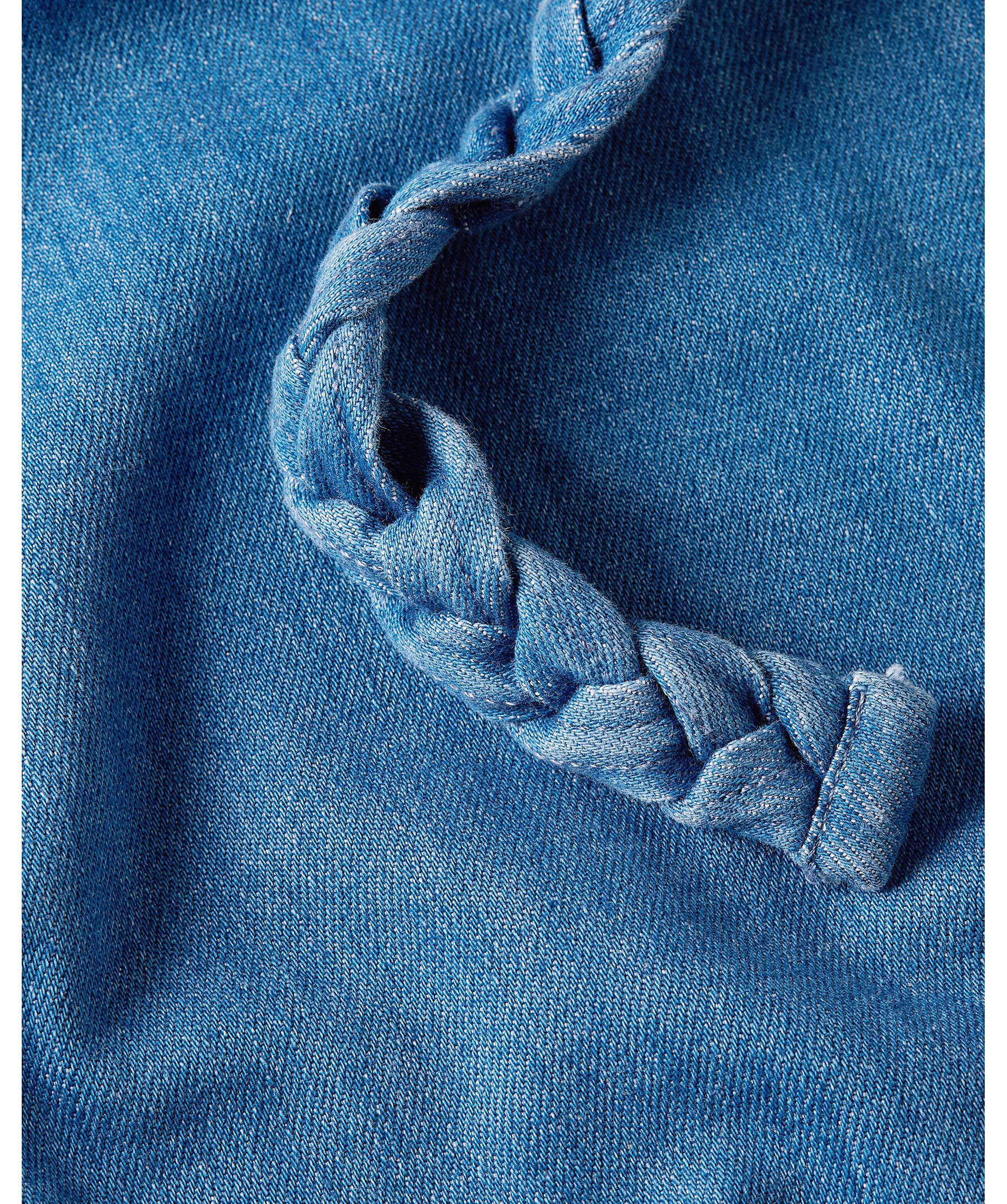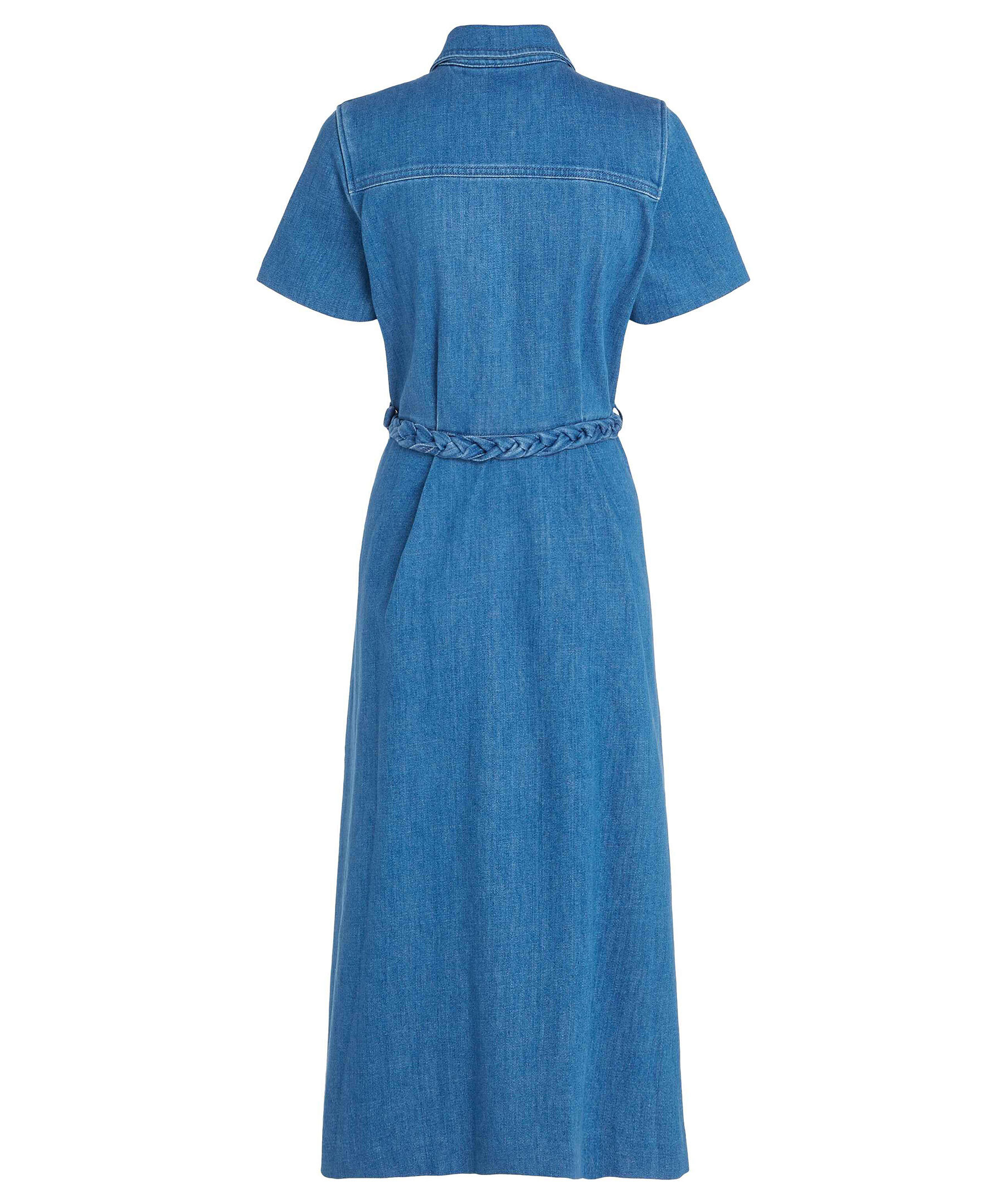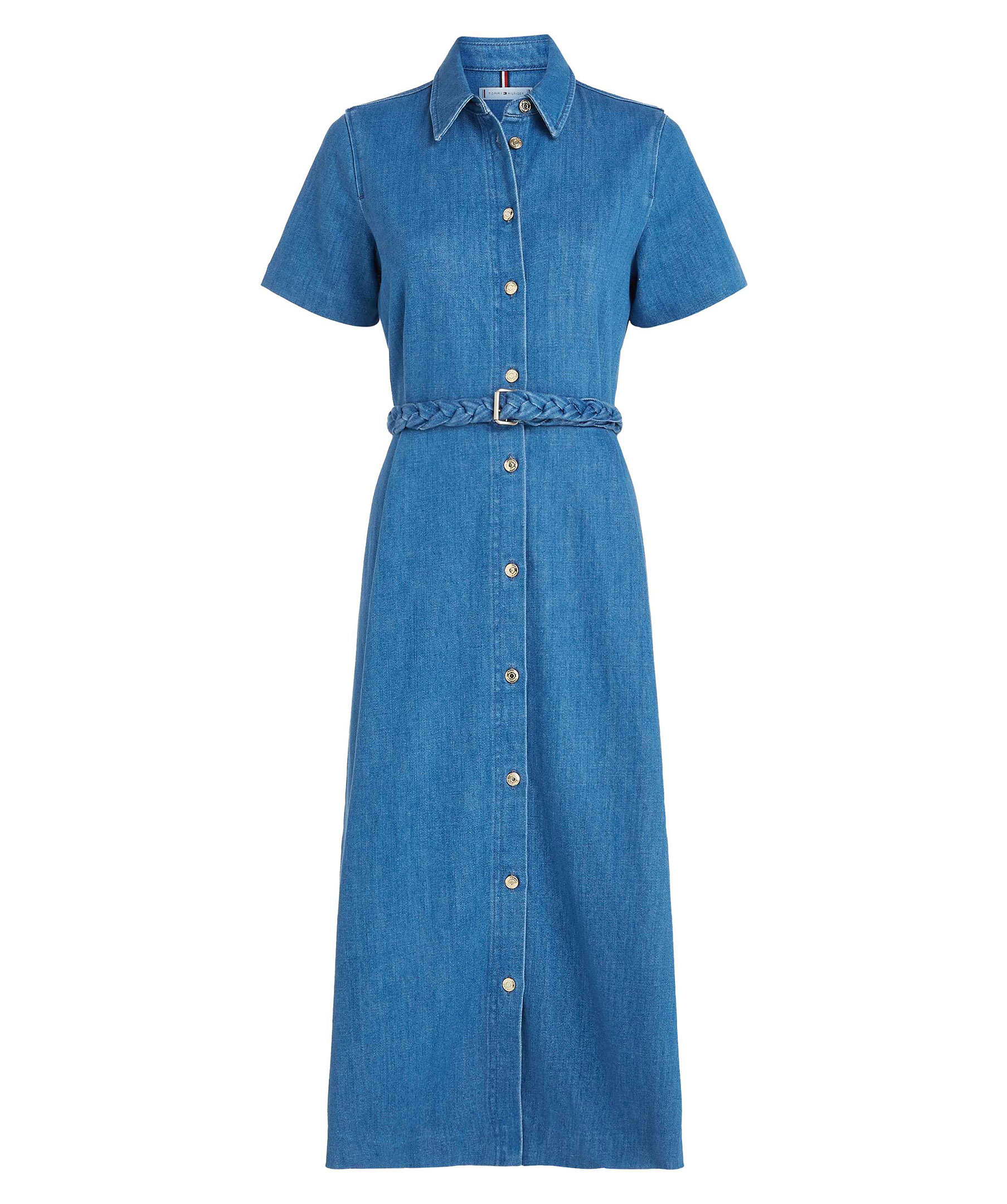 Blå, lång midiklänning i jeans från Tommy Hilfiger. Har en smickrande passform och utsvängd siluett och är detaljerad med ett flätat bälte i midjan. Halvspridd krage, knappstängning, korta ärmar och en liten metallbricka med klassisk Tommy Hilfiger flagga längs främre kanten.
