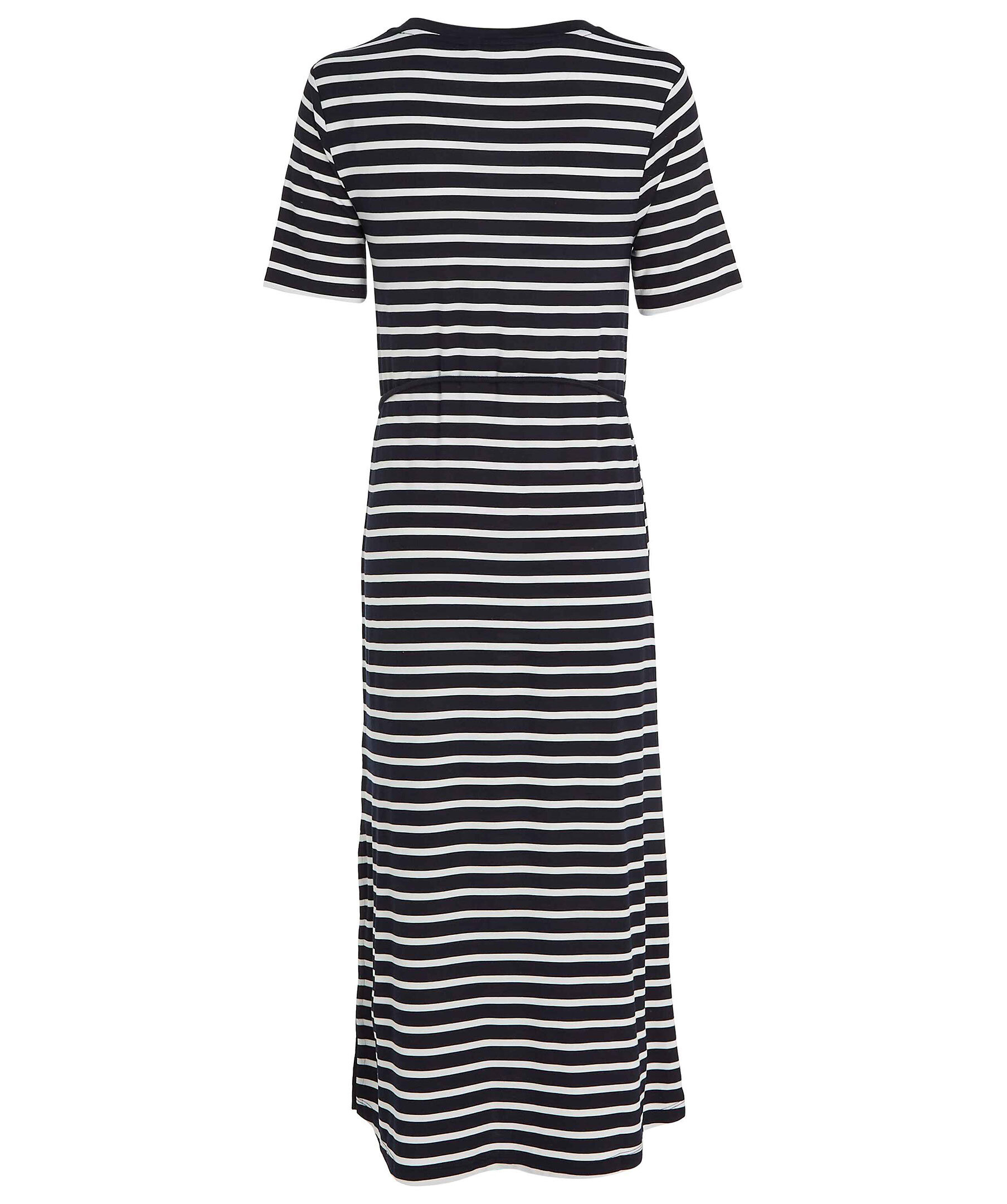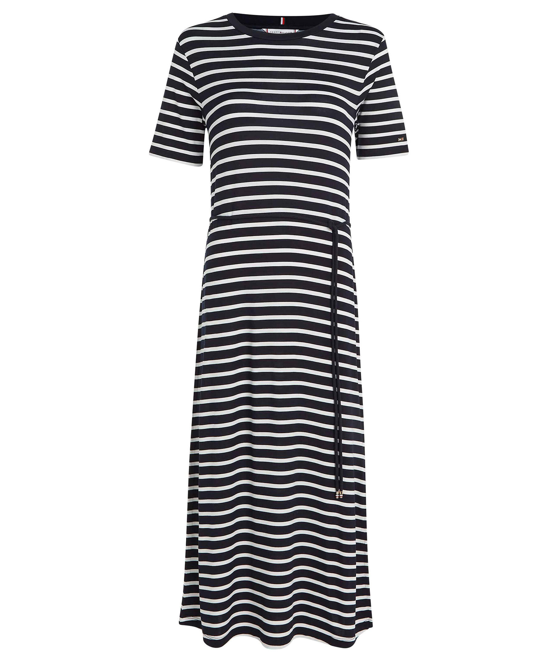 Randig långklänning i t-shirtmodell i vitt och marinblått från Tommy Hilfigfer. Knytskärp med repeffekt och rundad halsringning. Liten metallbricka med klassisk Tommy Hilfiger flagga på ärmen.