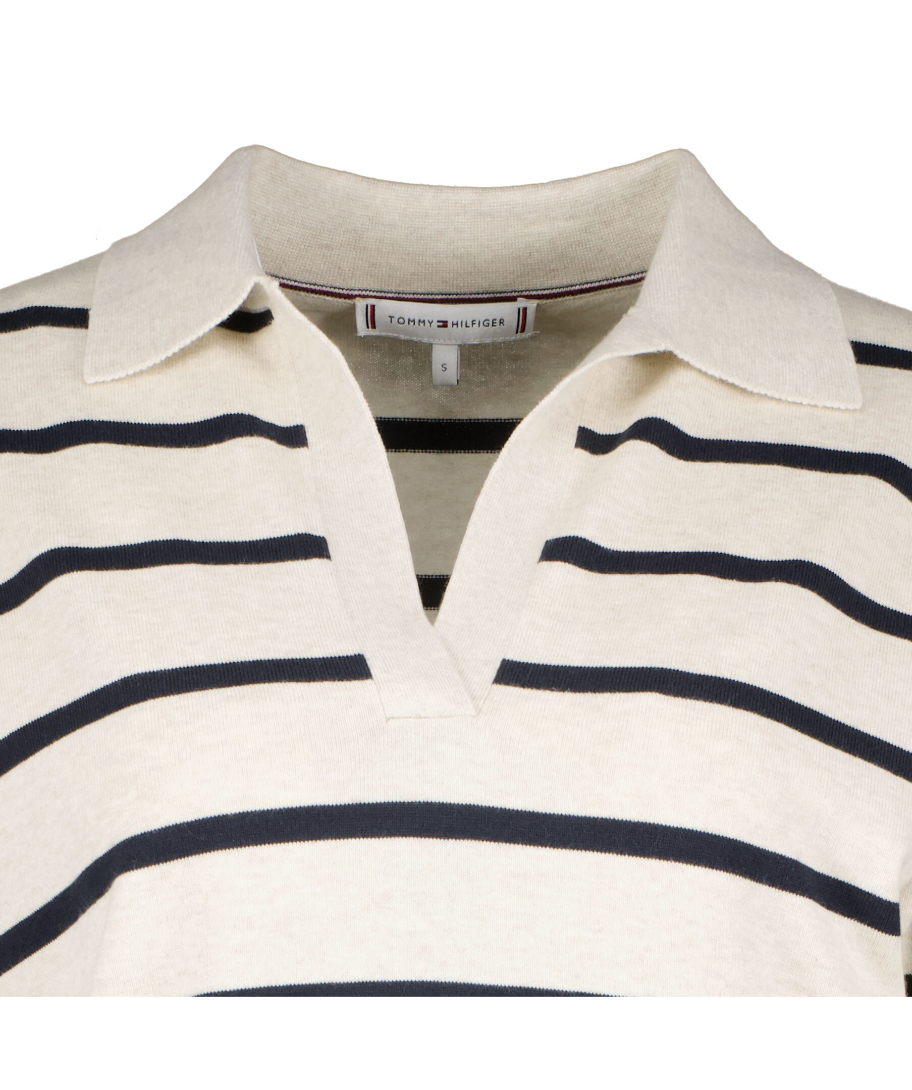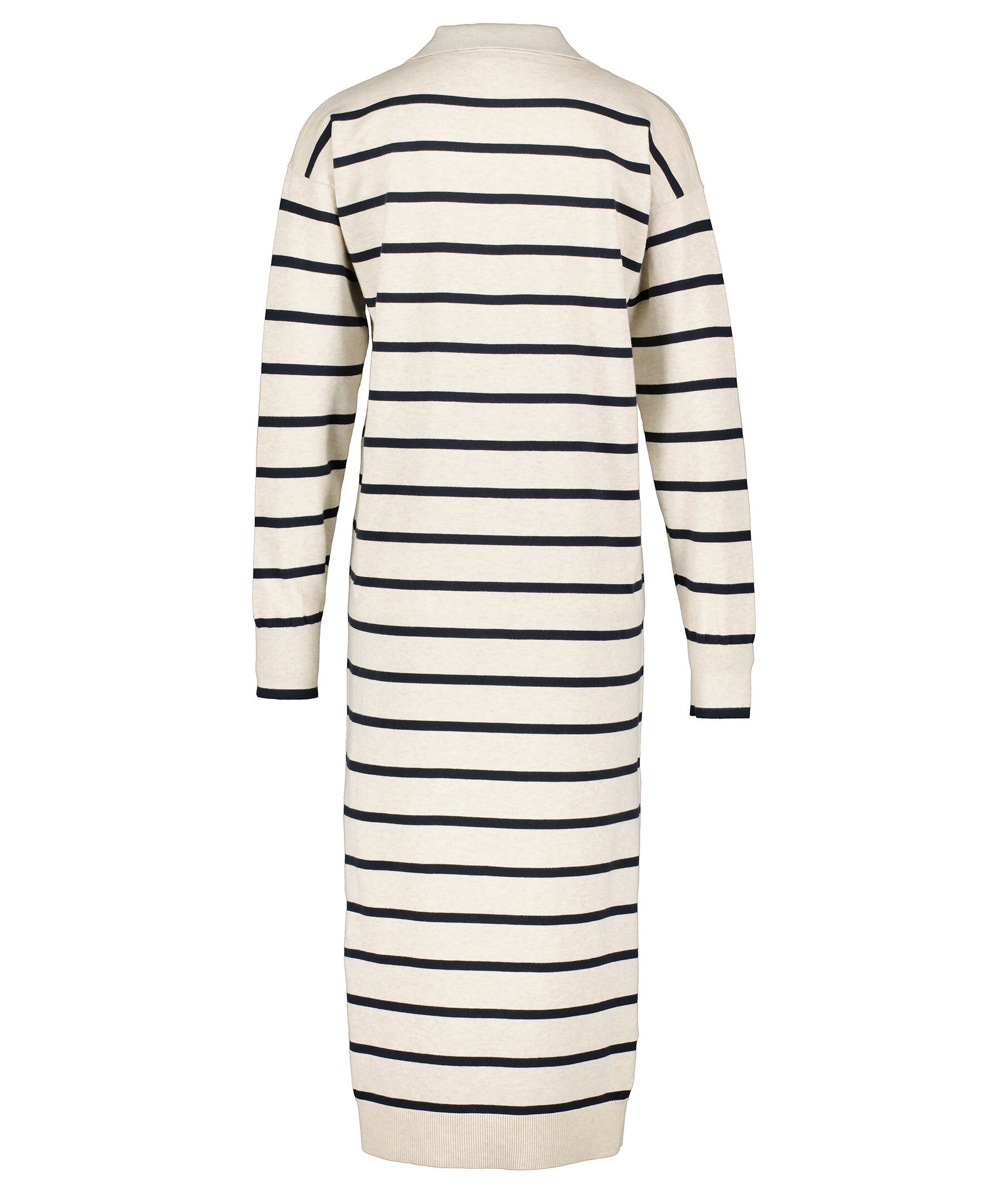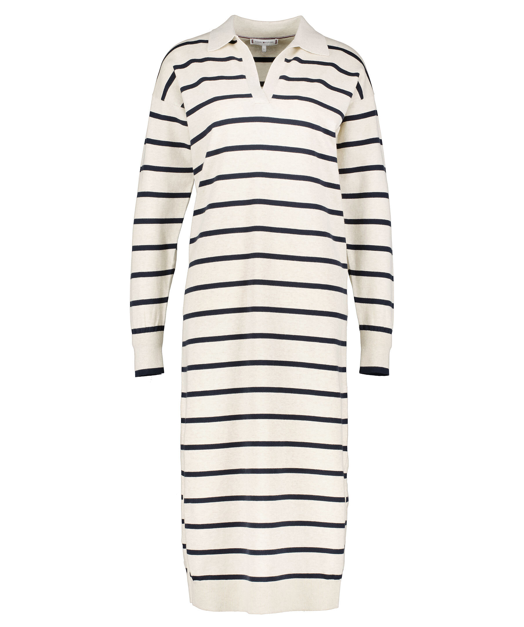 Långärmad pikéklänning i randigt mönster från Tommy Hilfiger. V-ringad hals. Klänningen slutar vid vaden och är gjord i en skön bomullsblandning. Slits på båda sidorna. Ribbade muddar vid ärm och plaggslut.