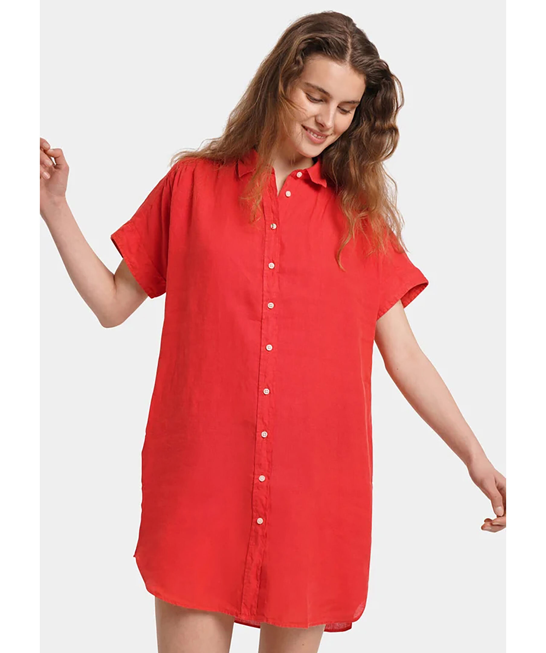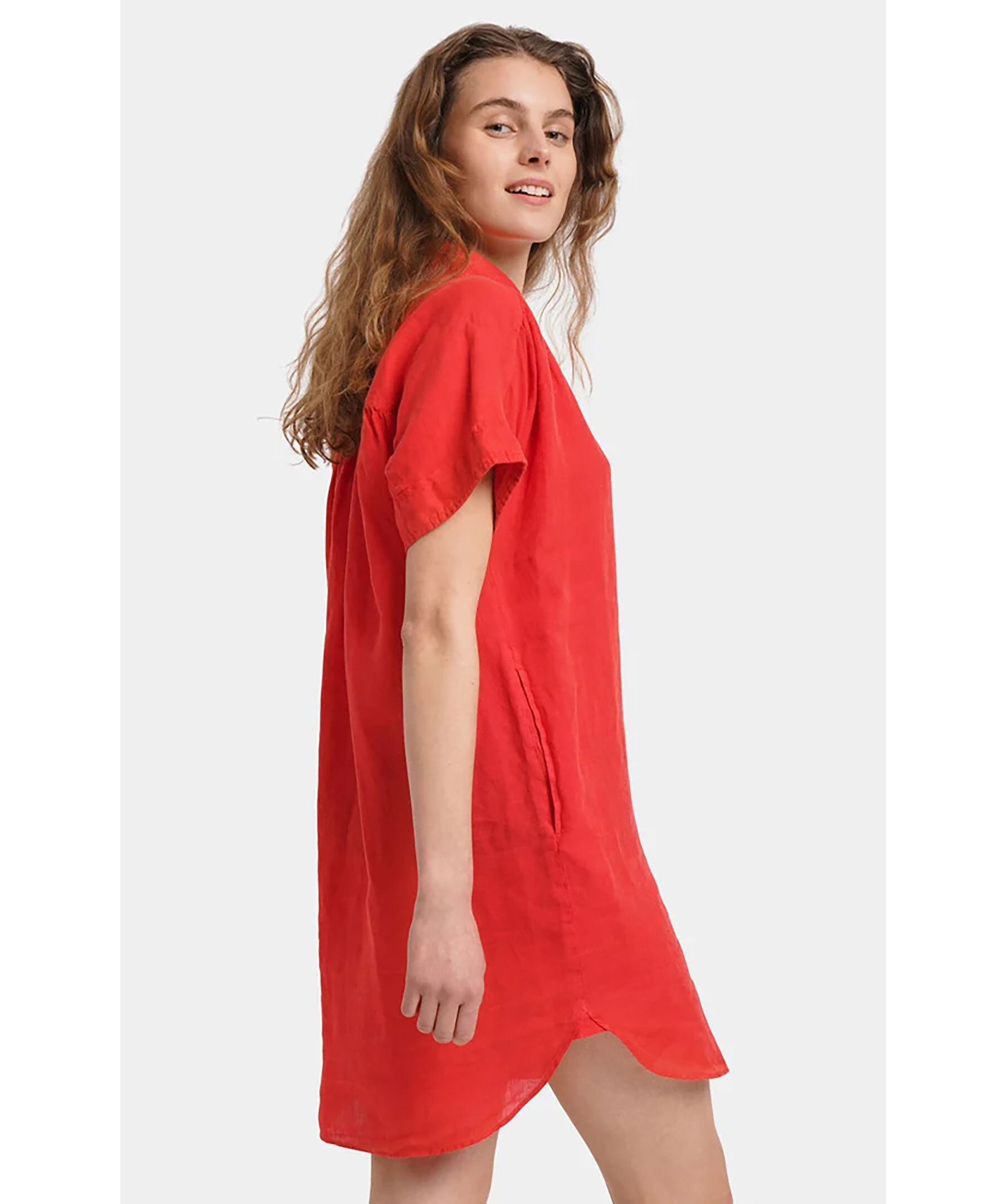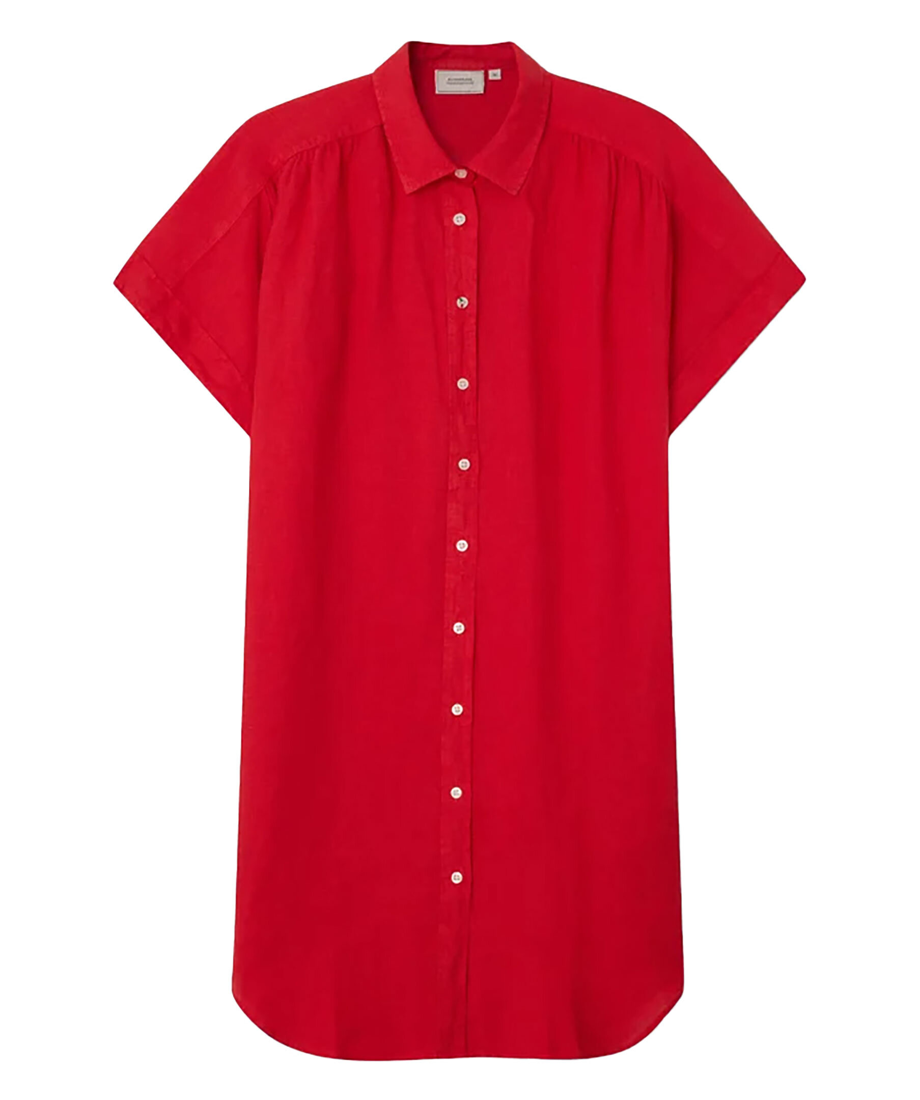 Röd linneklänning med kort ärm från Boomerang. Rak ledig passform med rynk på axeln och i ryggen. Handmålad Boomerang-knapp som tredje knapp. Tillverkad i 100% linne. Stor i storleken.