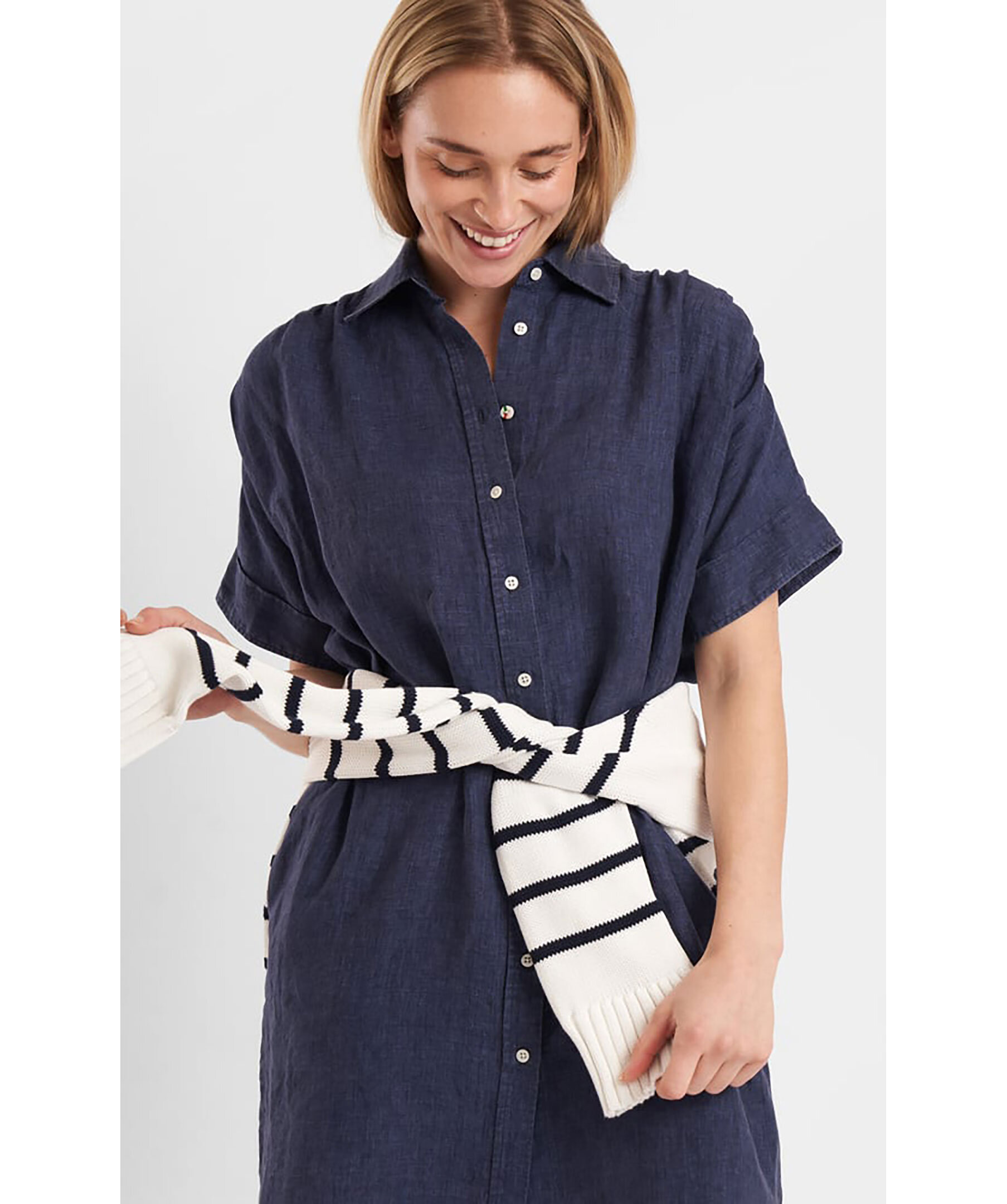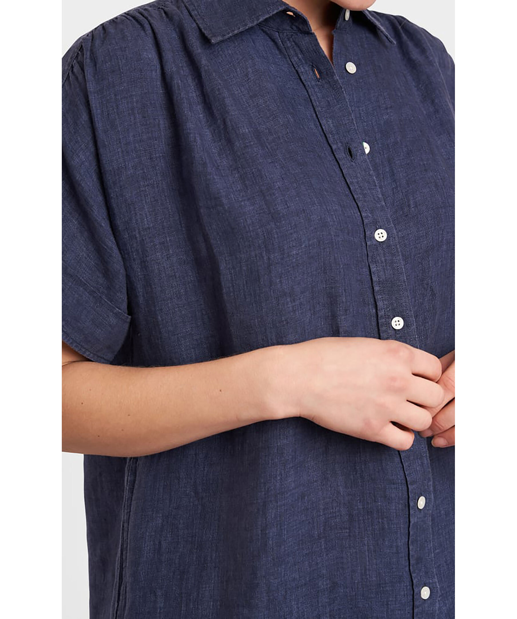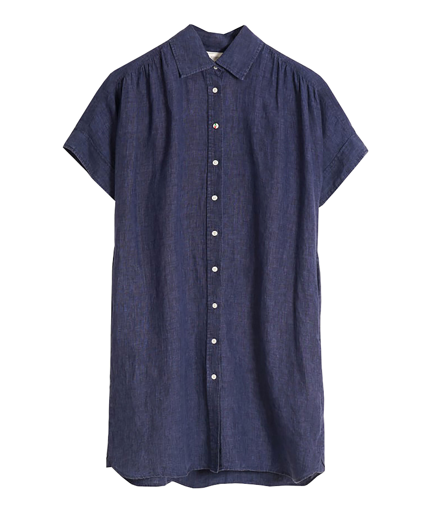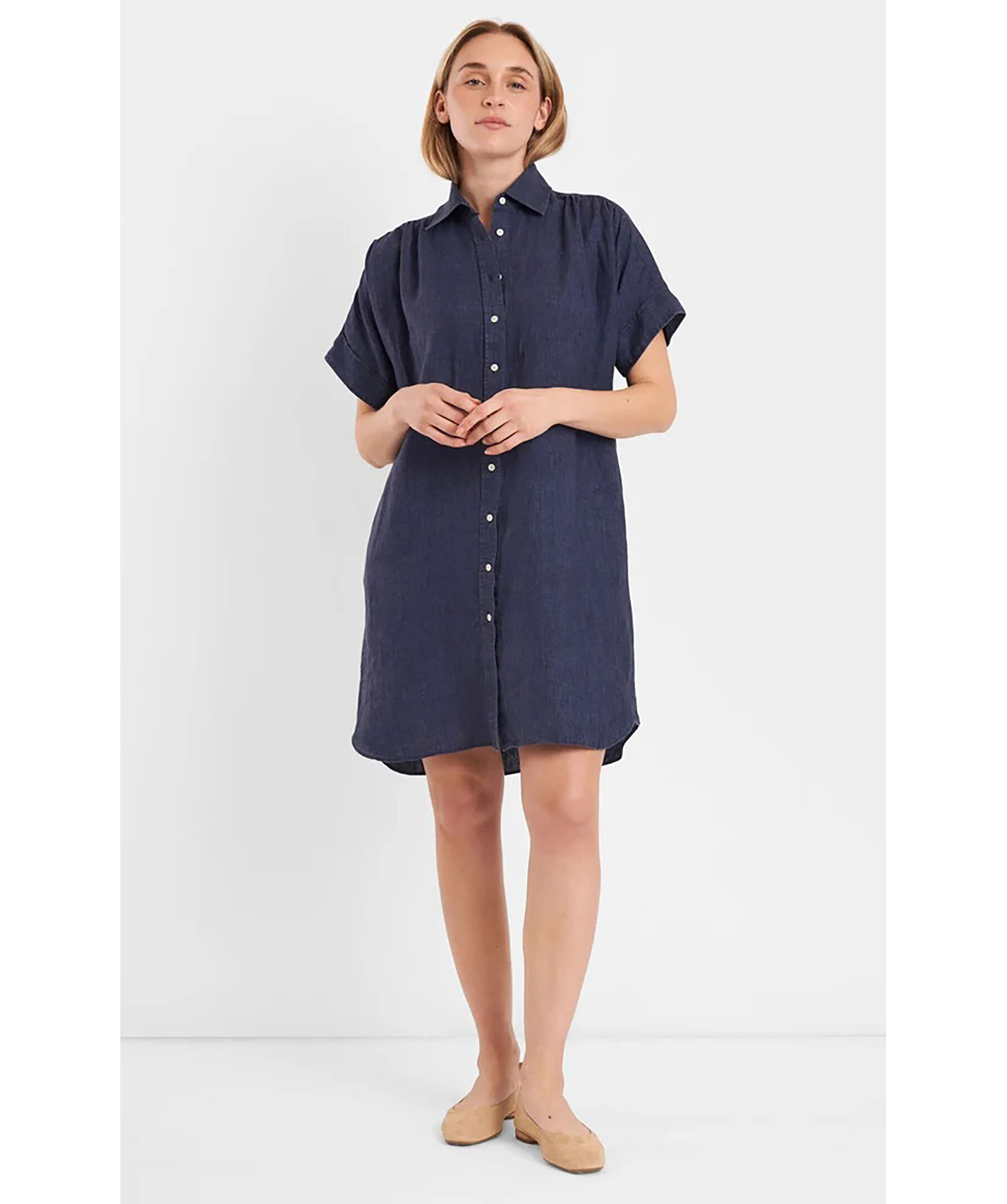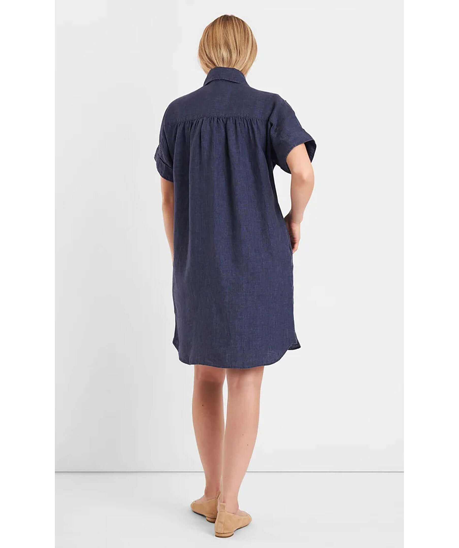 Mörkblå linneklänning med kort ärm från Boomerang. Rak ledig passform med rynk på axeln och i ryggen. Handmålad Boomerang-knapp som tredje knapp. Tillverkad i 100% linne. Stor i storleken.