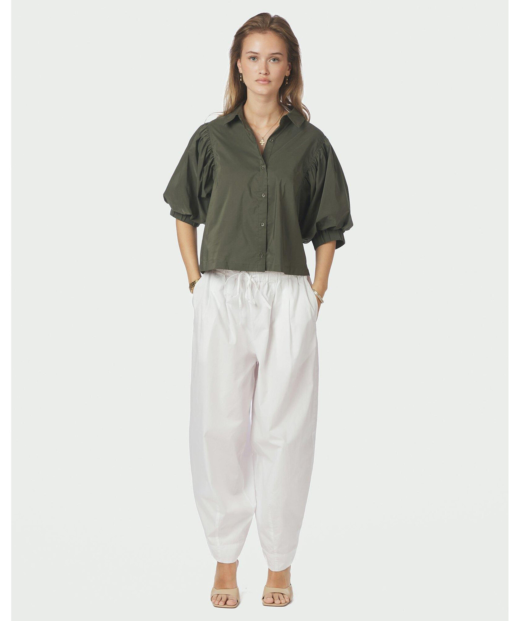 Mörkgrön skjorta med korta puffärmar och knappar fram. Modellen är 176 cm lång och bär storlek 36.