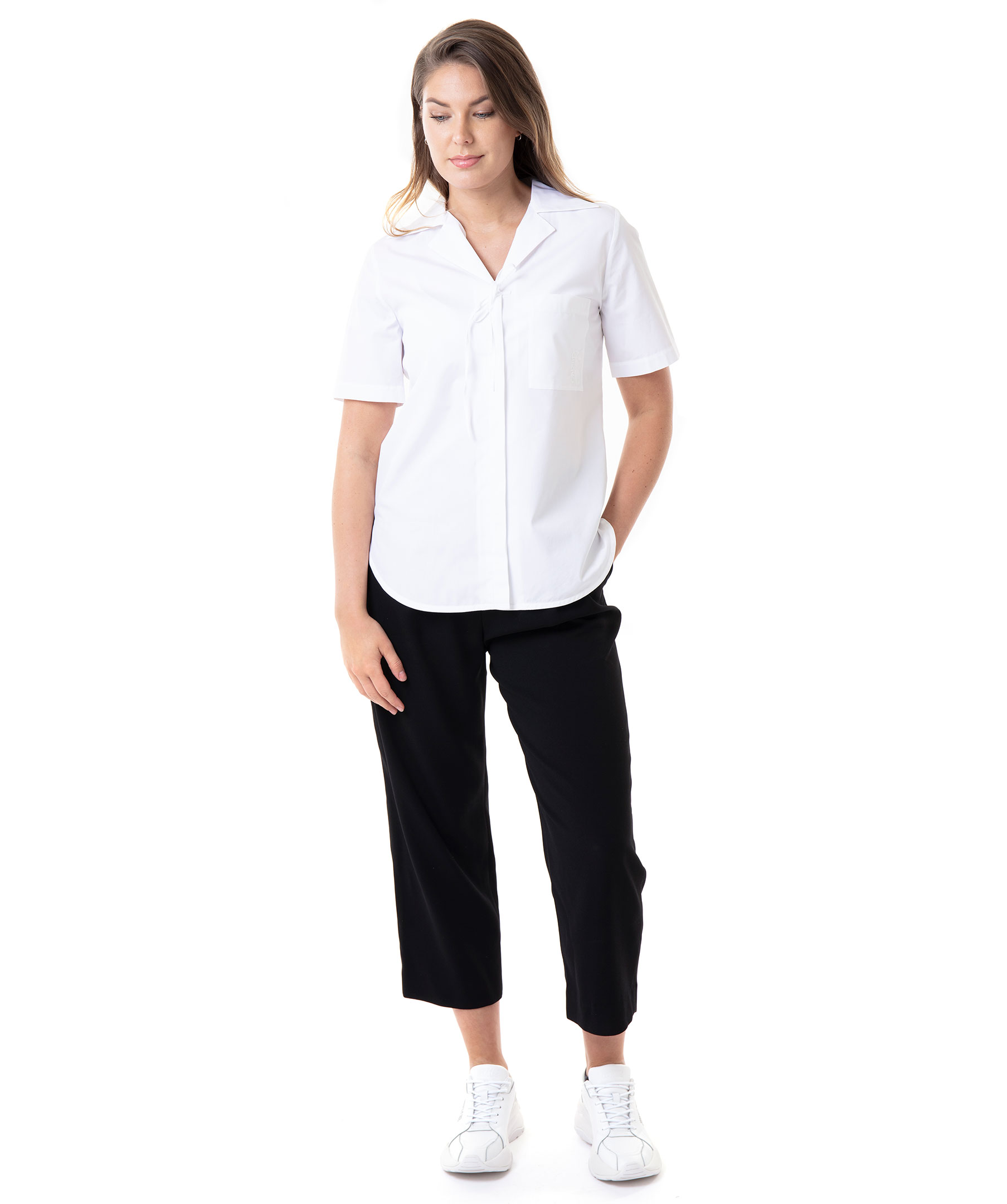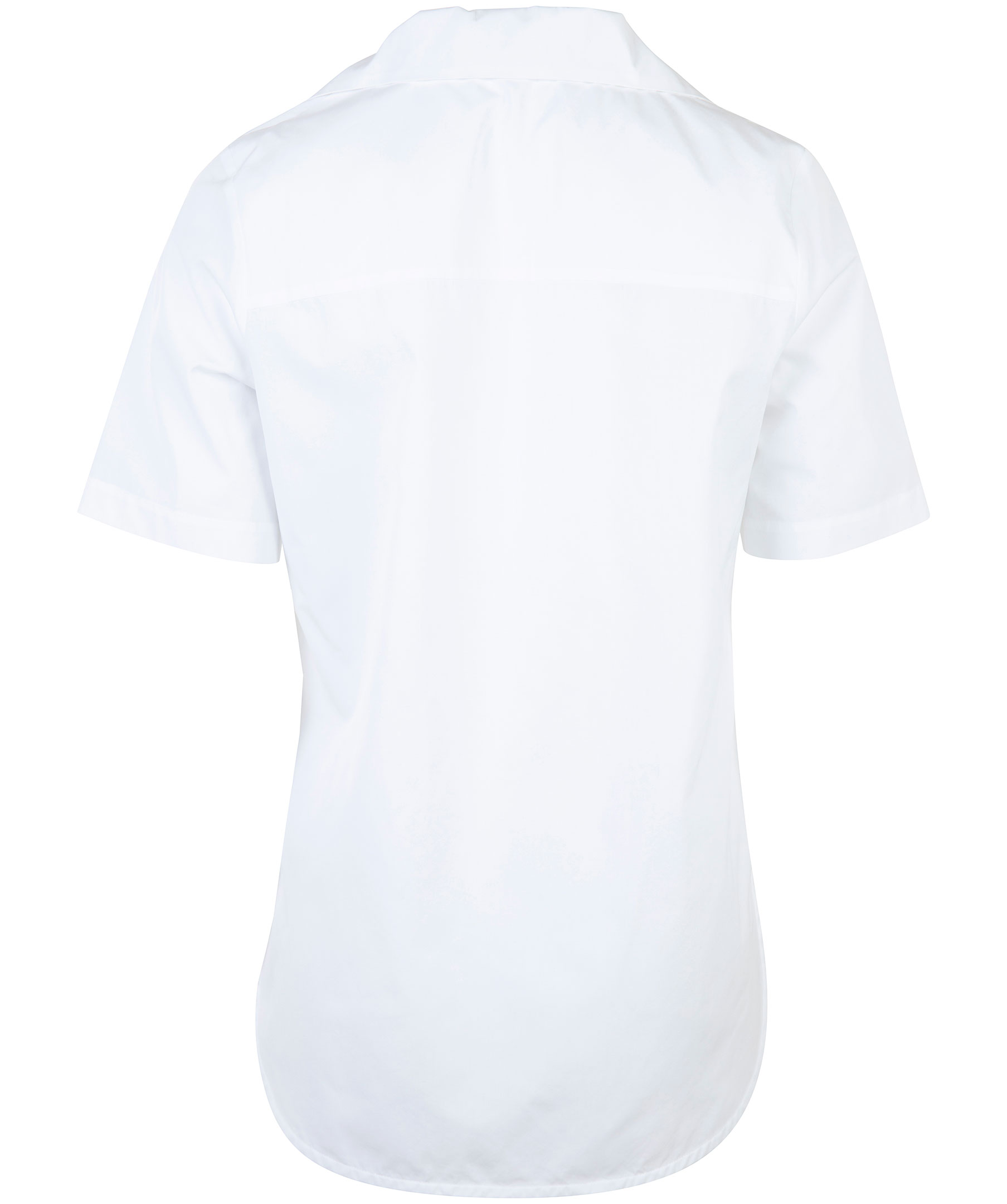 Vit, kortärmad skjorta från Kenzo. Vid modell med dold knäppning och tunn rosett upptill. Ficka på bröstet med broderad logotyp och sjöjungfru i samma färg som skjortan. Skjortan har en fin bred krage och det går upp på sidorna längst ner. Modellen är 175 cm lång och bär storlek C38.
