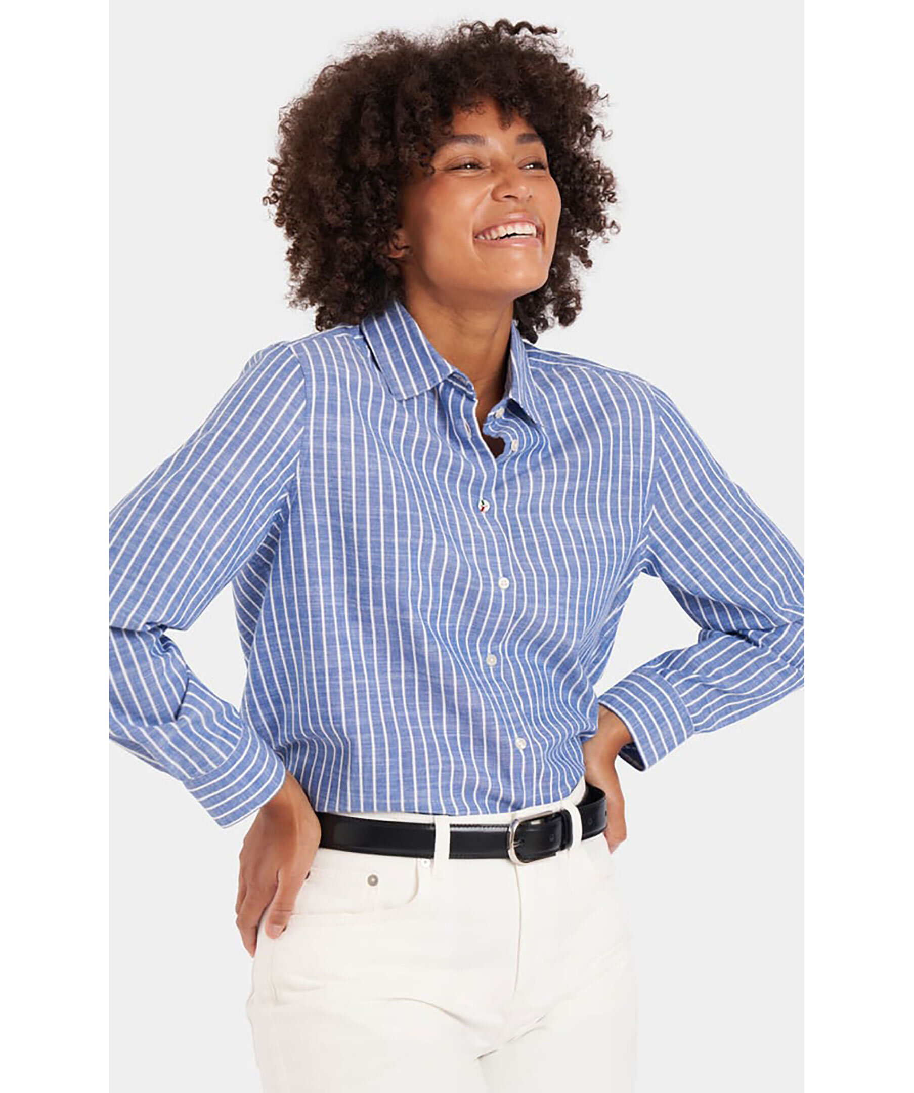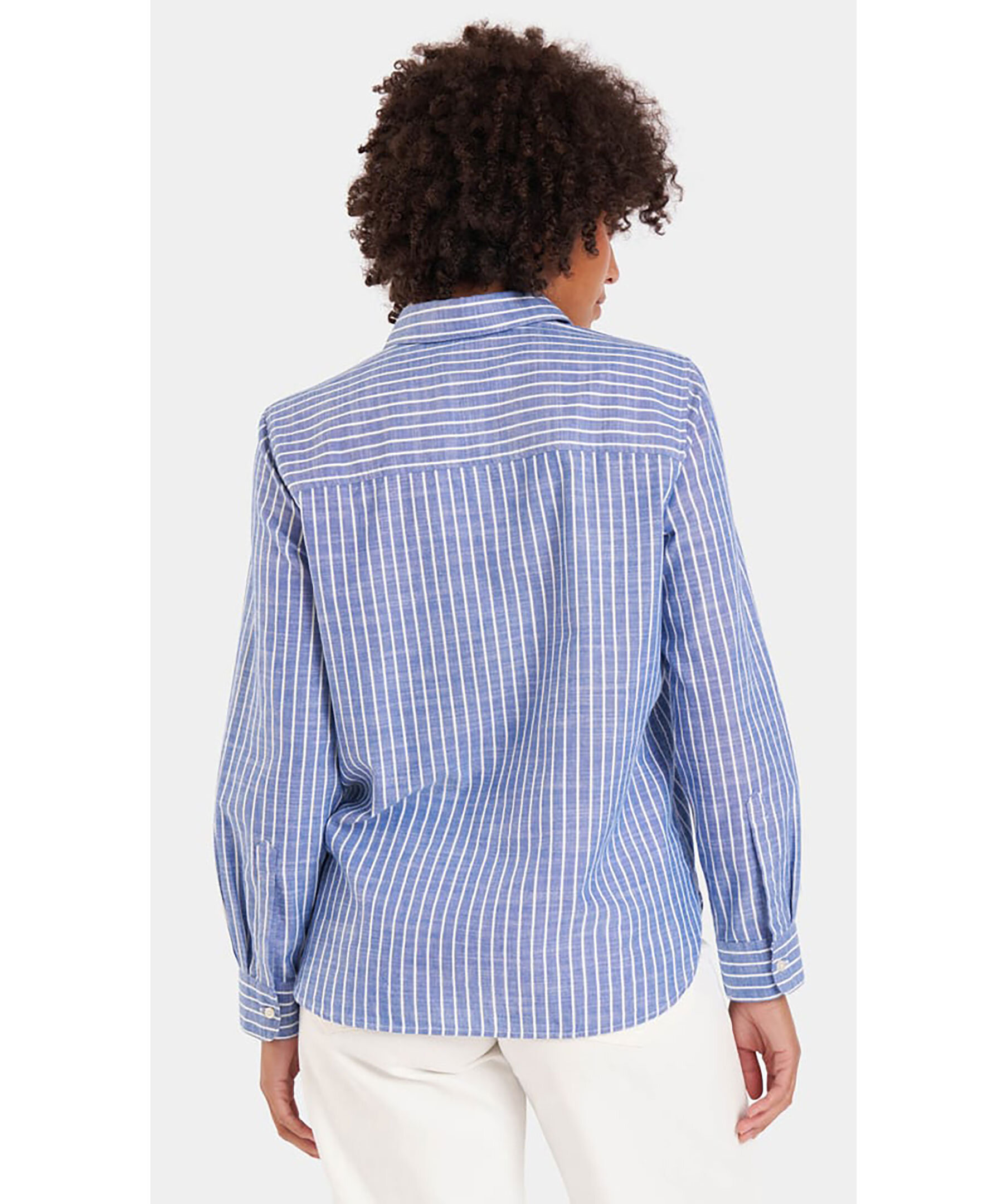 Blå och vit randig skjorta i en flaméväv från Boomerang. Tillverkad i 100% ekologisk bomull. Har linnekaraktär. Avslappnad passform och ok baktill samt den handmålade Boomerang-knappen som tredje knapp.