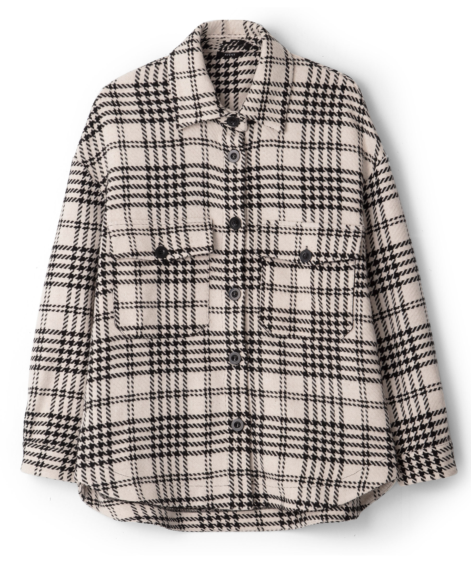 Svart och vit, hundtands mönstrad overshirt från Aveny. Två fickor framtill som stängs med knappar. Enkla manschetter. Tillverkad i bomullsblandning.