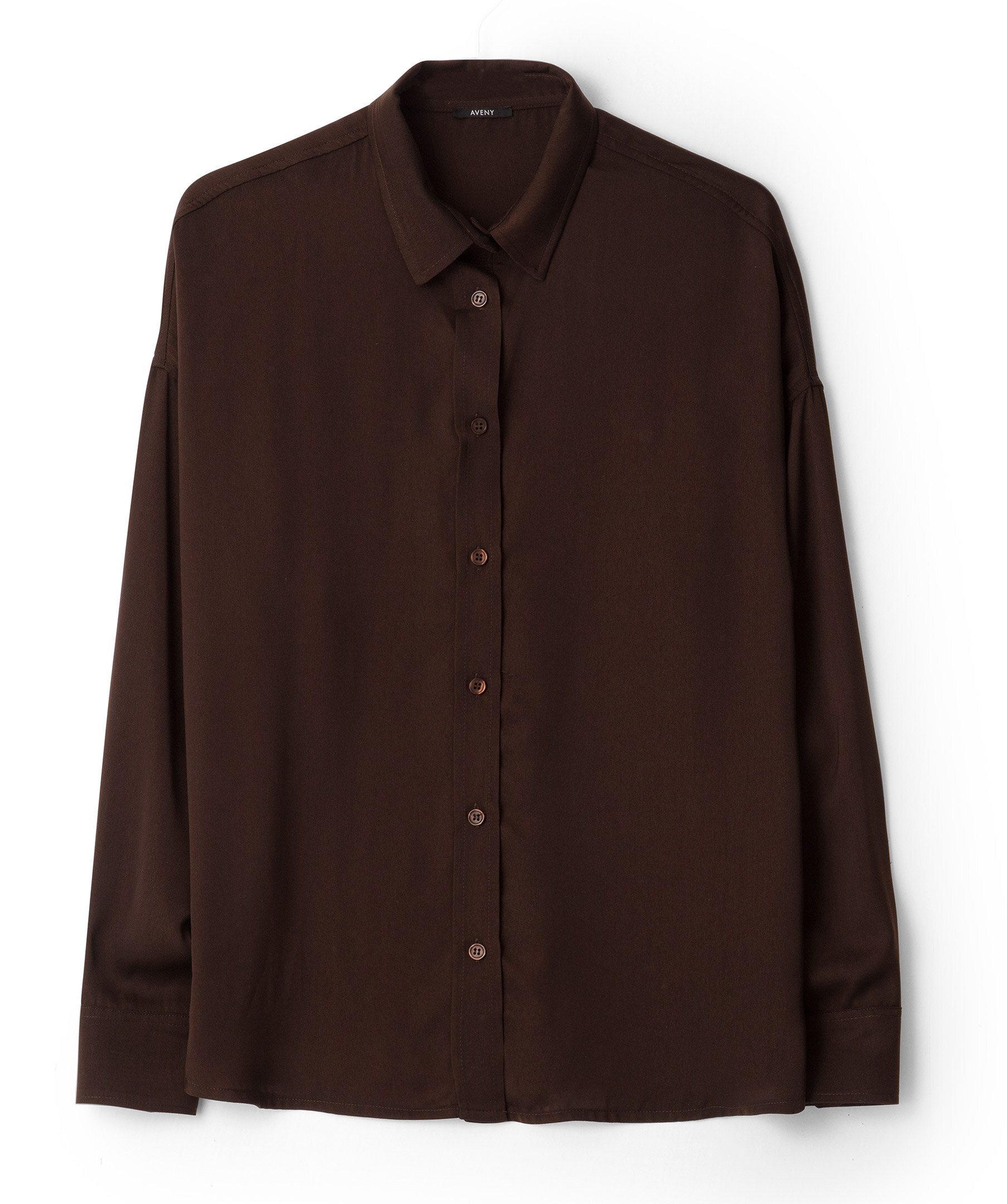 Mörkbrun skjorta från Aveny. Stängs framtill med knappar. enkla manschetter. Spetsig krage. Droppade axlar. Tillverkad i 100% återvunnet polyester. Avslappnad passform.